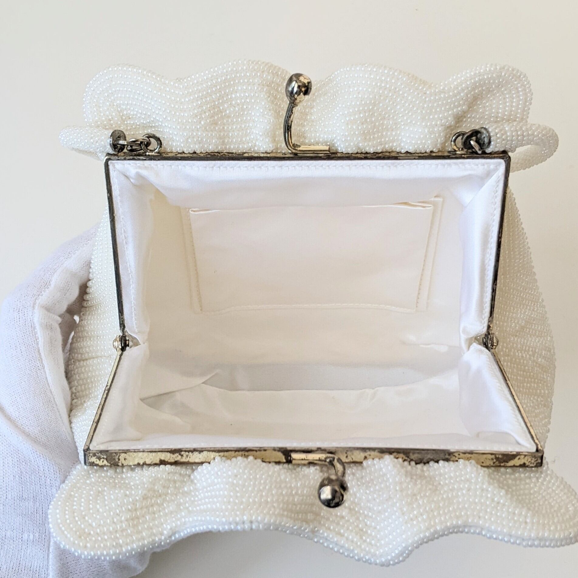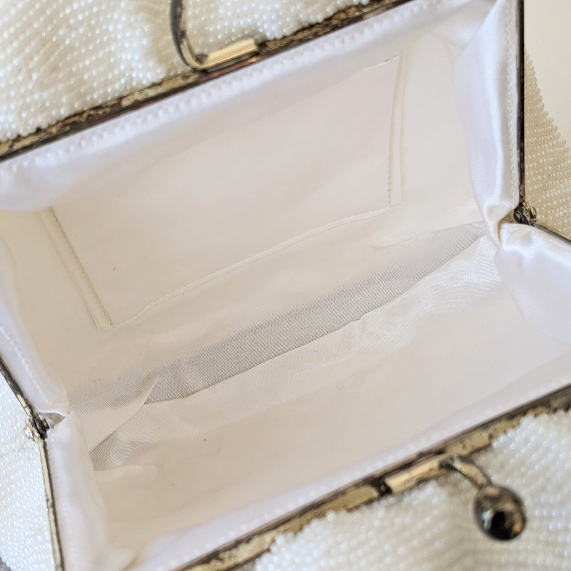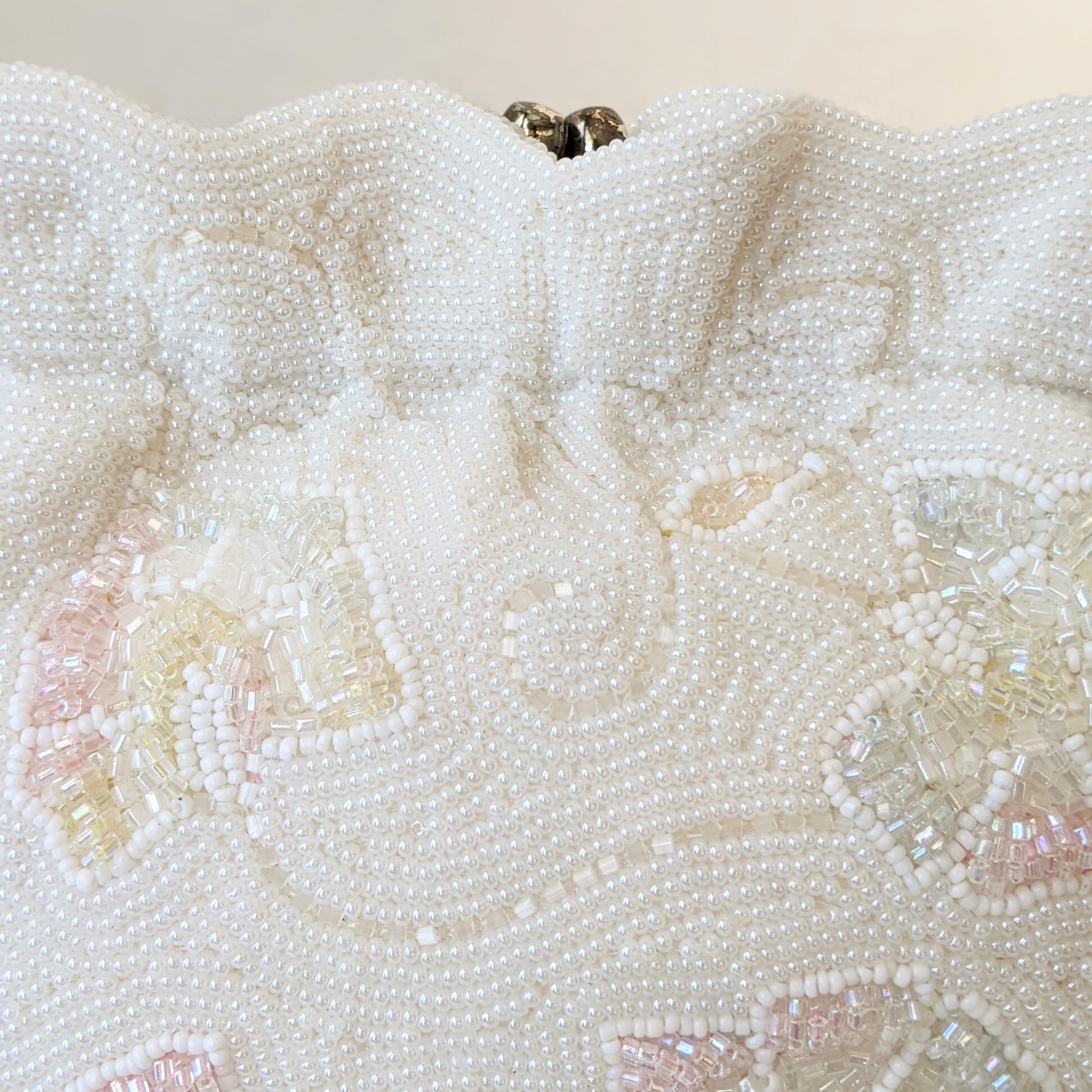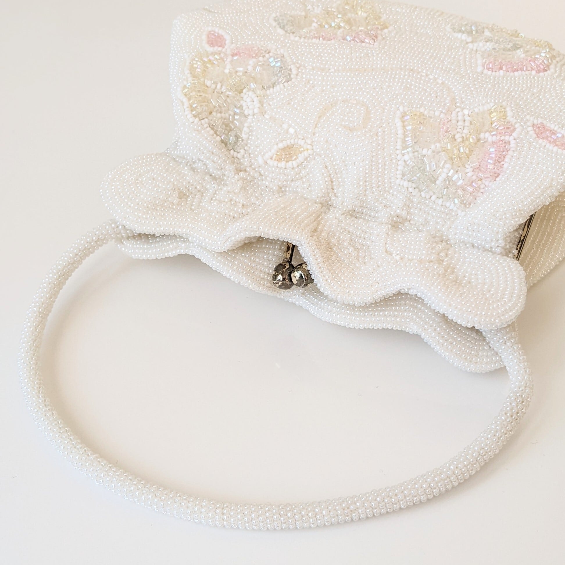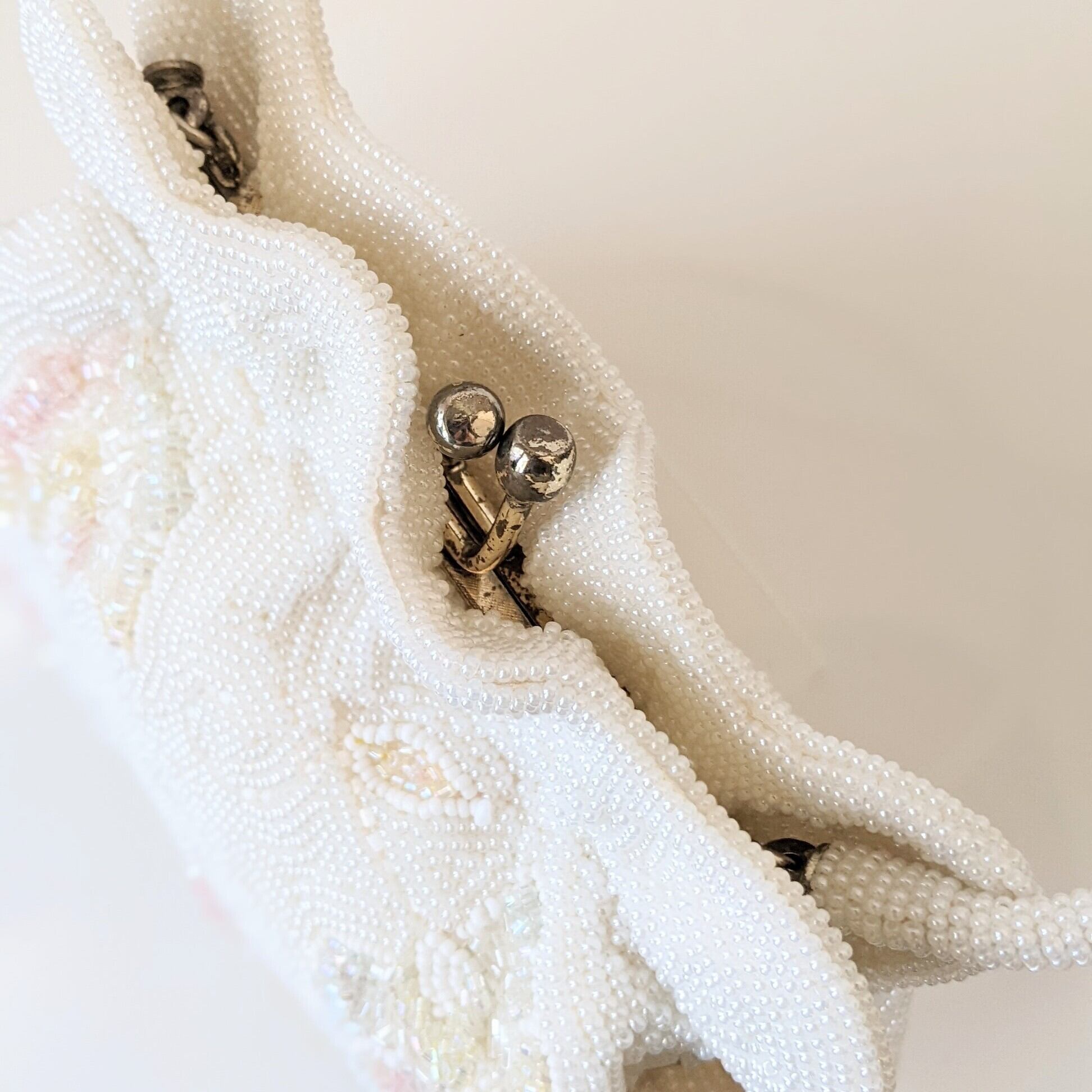 【vintage】 ビーズ刺繍バッグ パーティーバッグ 金魚鉢型 白×花柄 昭和レトロ 大正浪漫 フォーマルバッグ