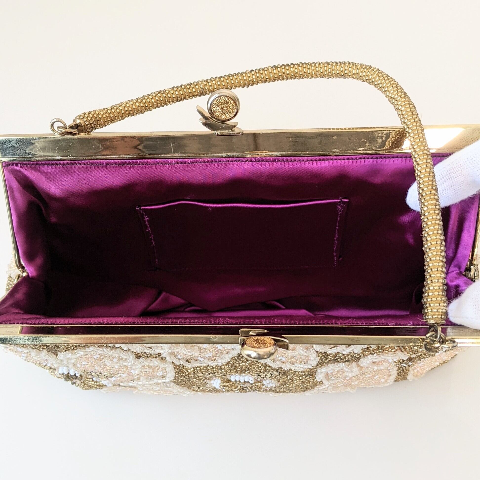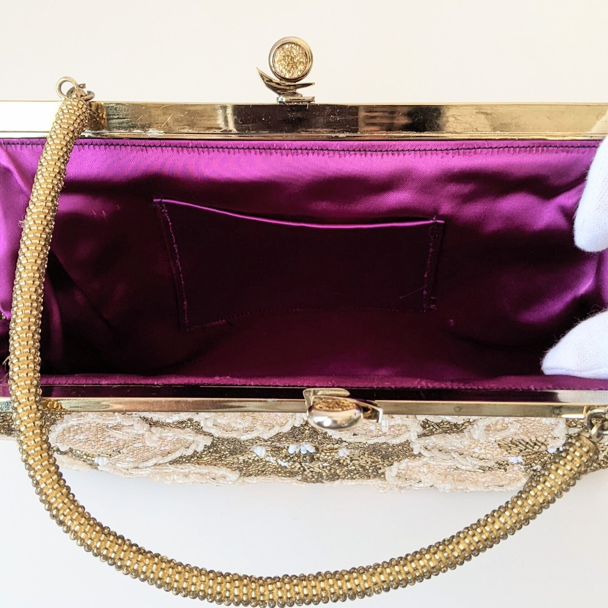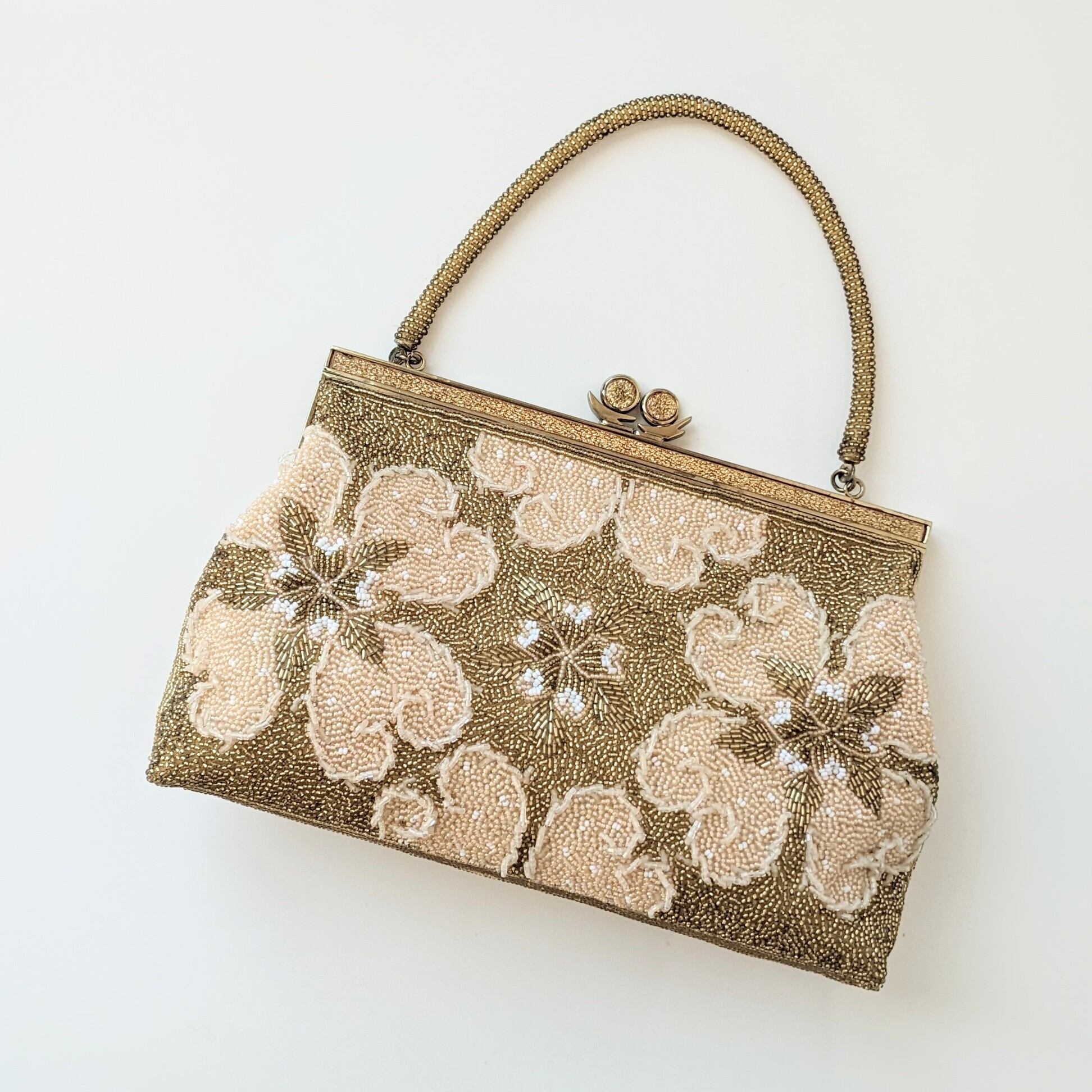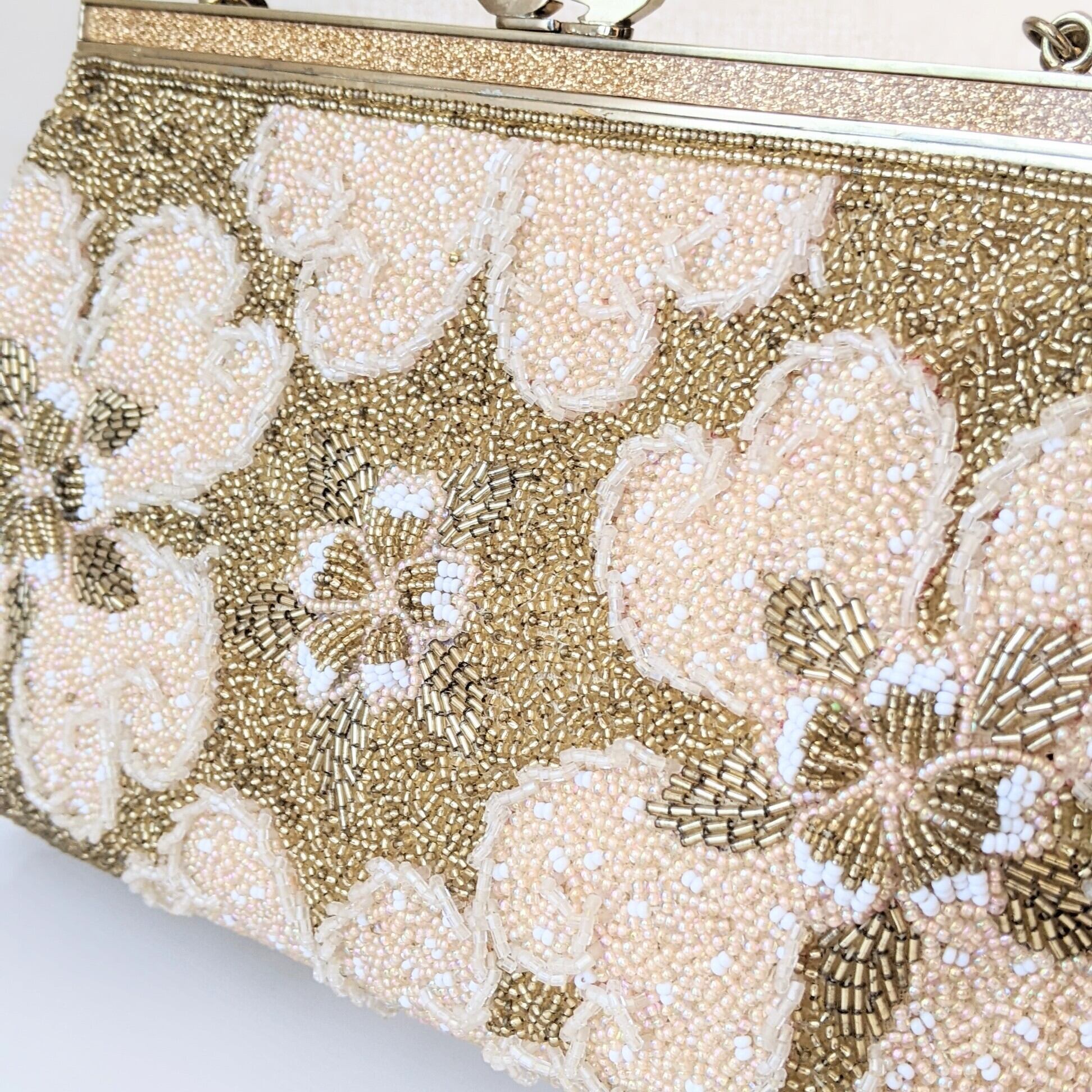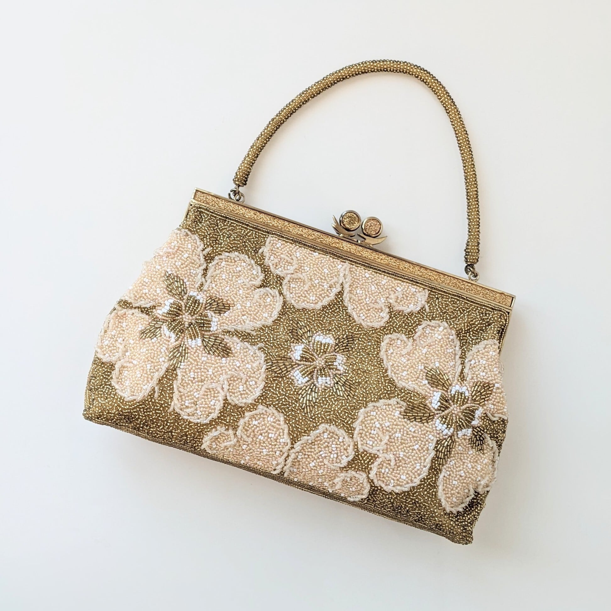 【vintage】 ビーズ刺繍バッグ パーティーバッグ ゴールドベージュ 桜 花びら お花見 昭和レトロ 大正浪漫 フォーマルバッグ