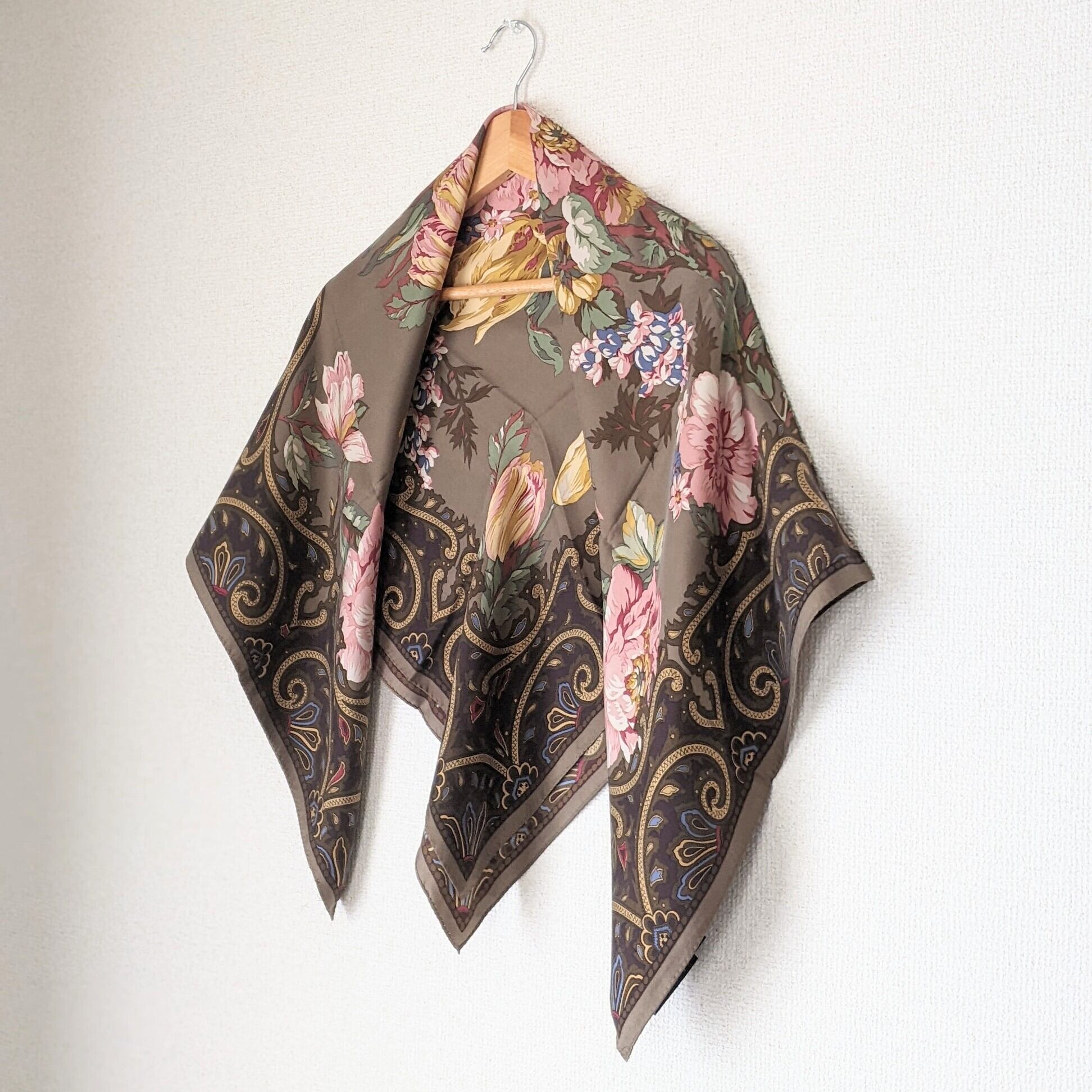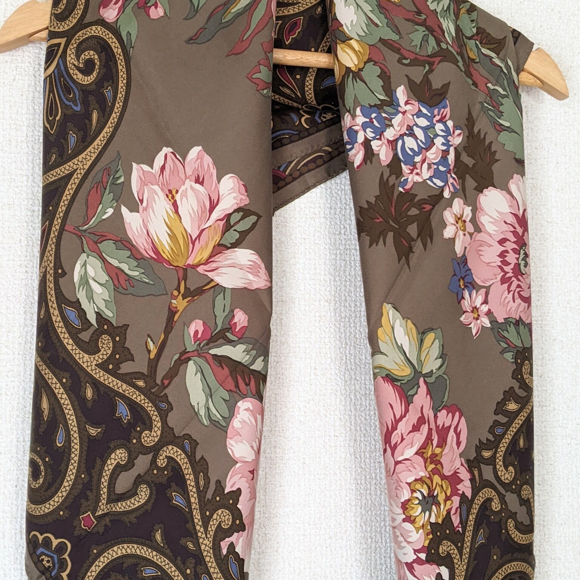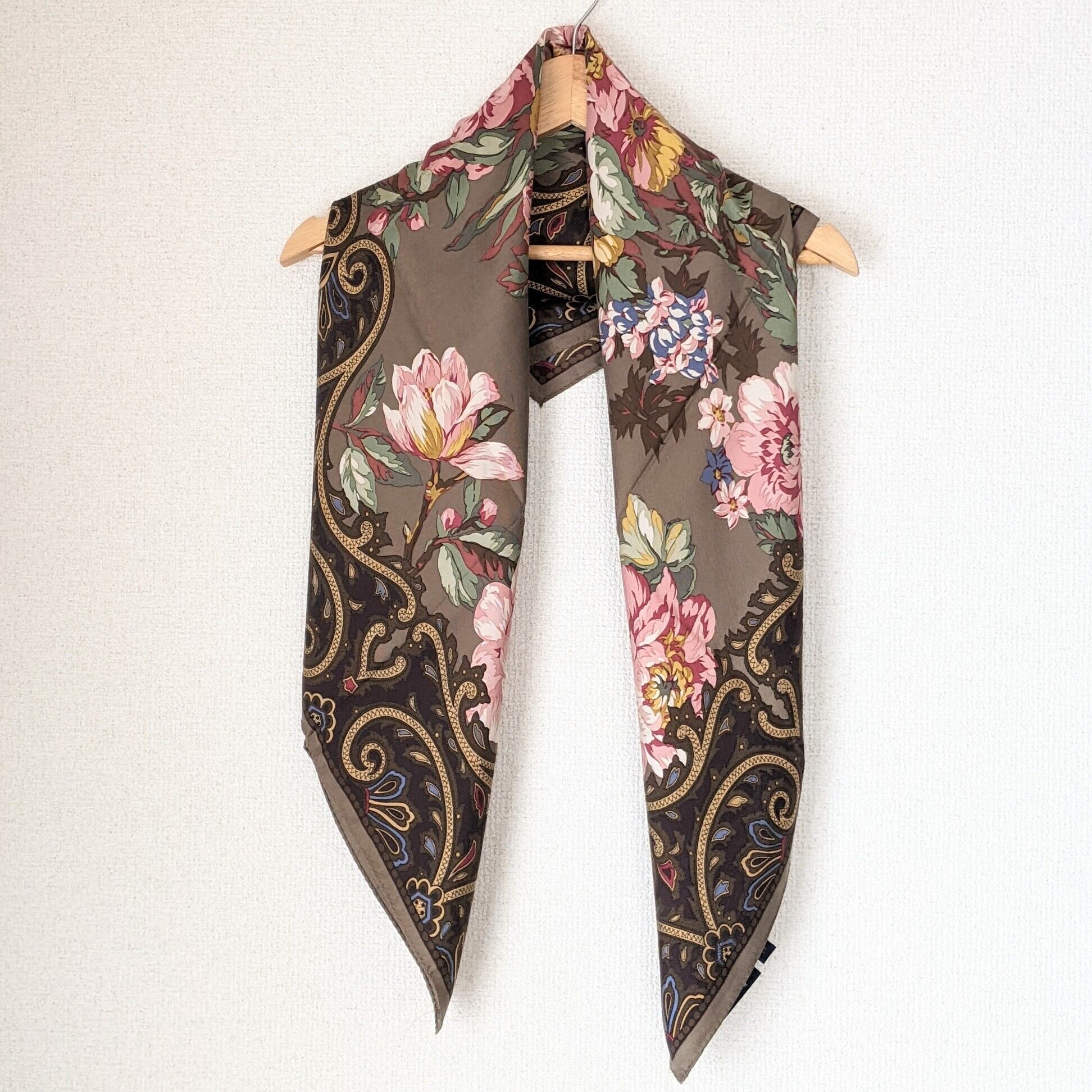 ラルフローレンの正方形大判スカーフ。落ち着いたブラウンベースにピンクのアンティークローズが優雅に咲いている姿はまるでイングリッシュガーデンのようです。