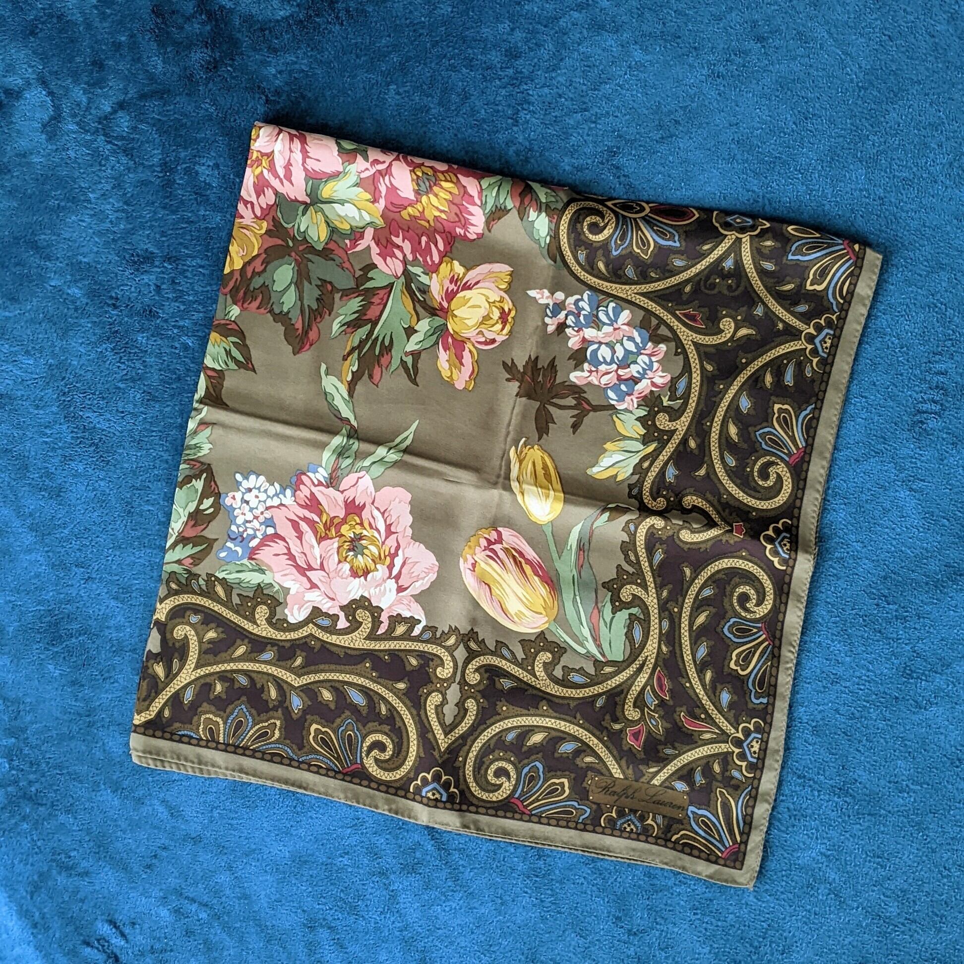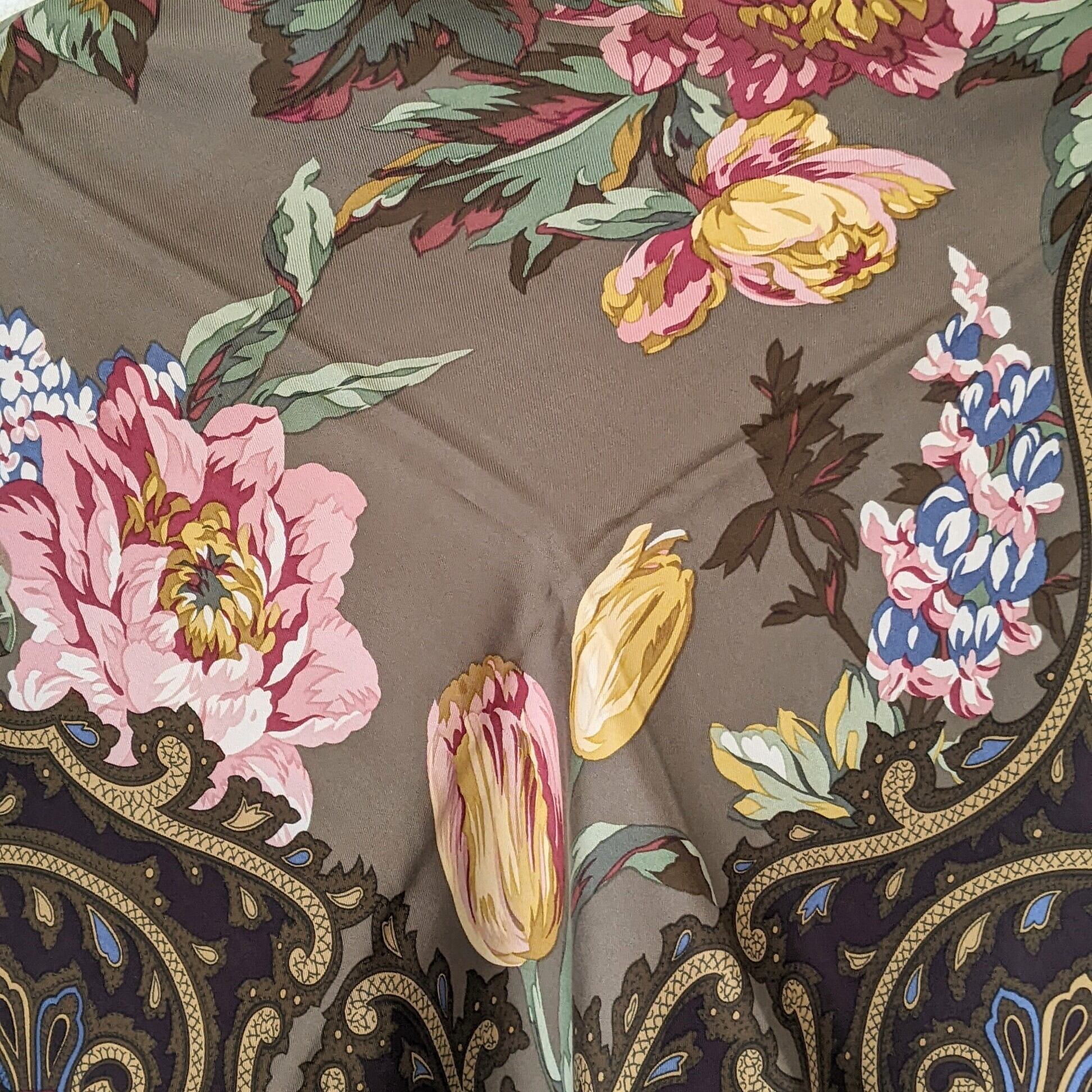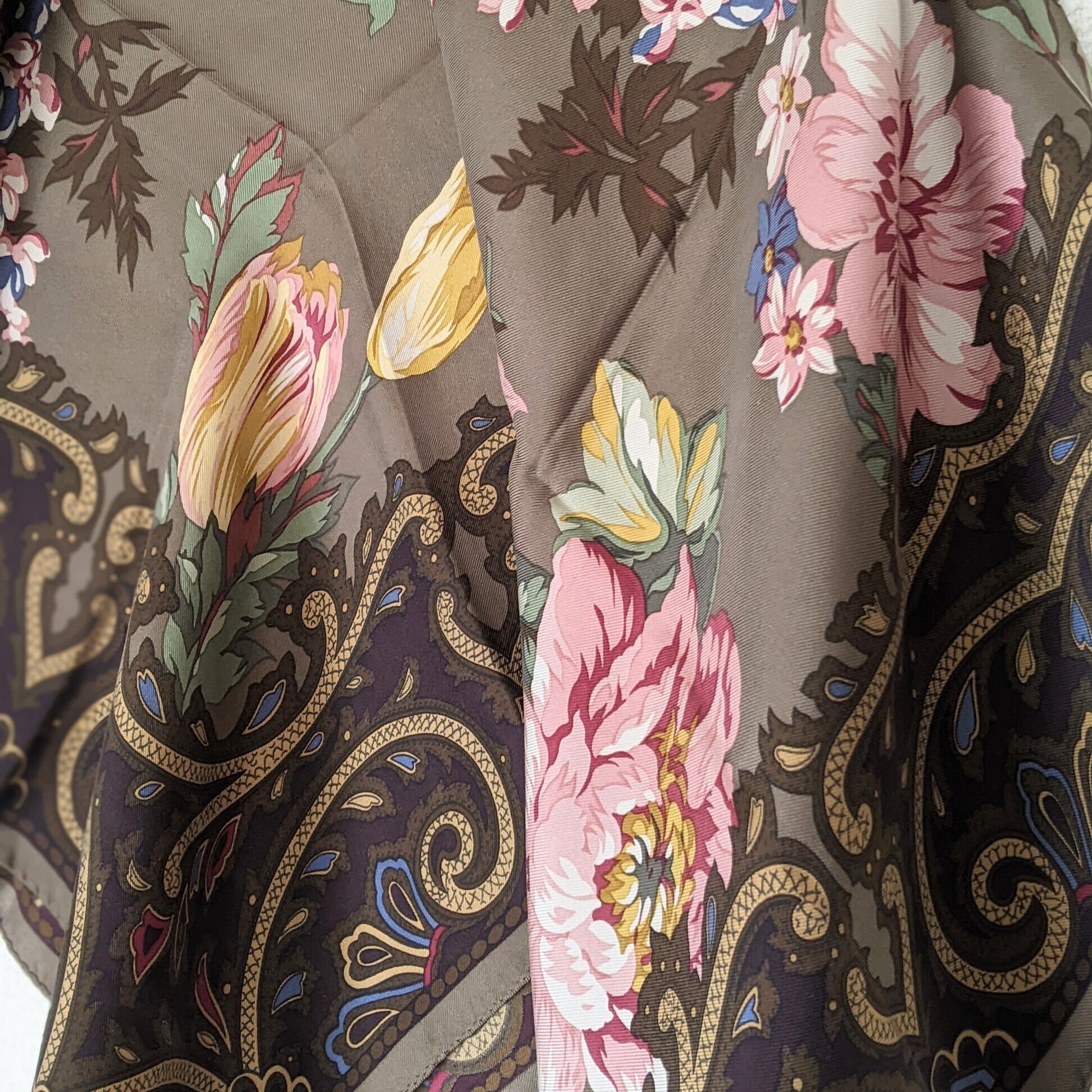 ラルフローレンの正方形大判スカーフ。落ち着いたブラウンベースにピンクのアンティークローズが優雅に咲いている姿はまるでイングリッシュガーデンのようです。