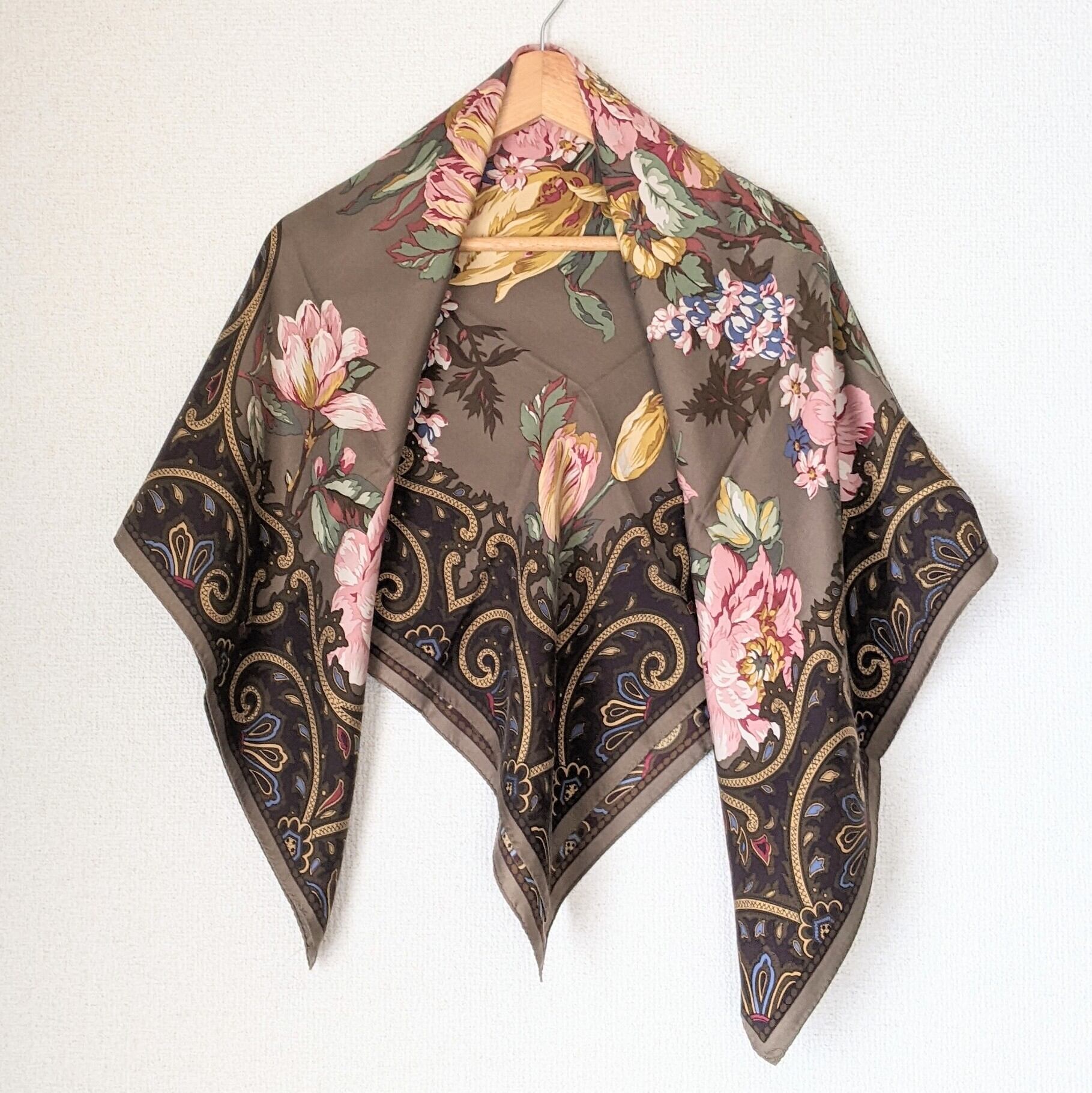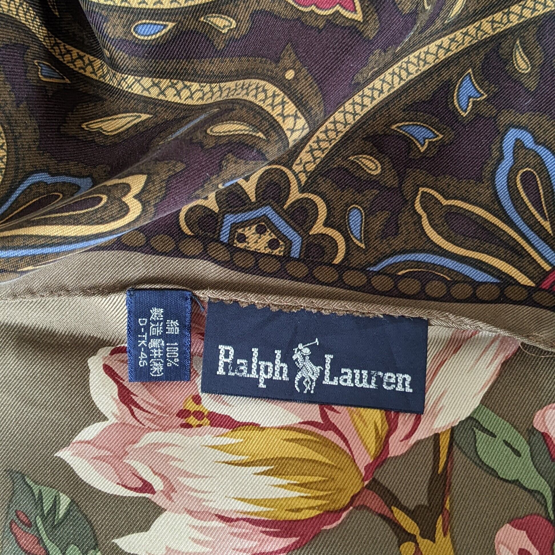【vintage】ラルフローレン 大判スカーフ 87×89 シルク100% 日本製 ブラウン×アンティークローズ ストール ショール