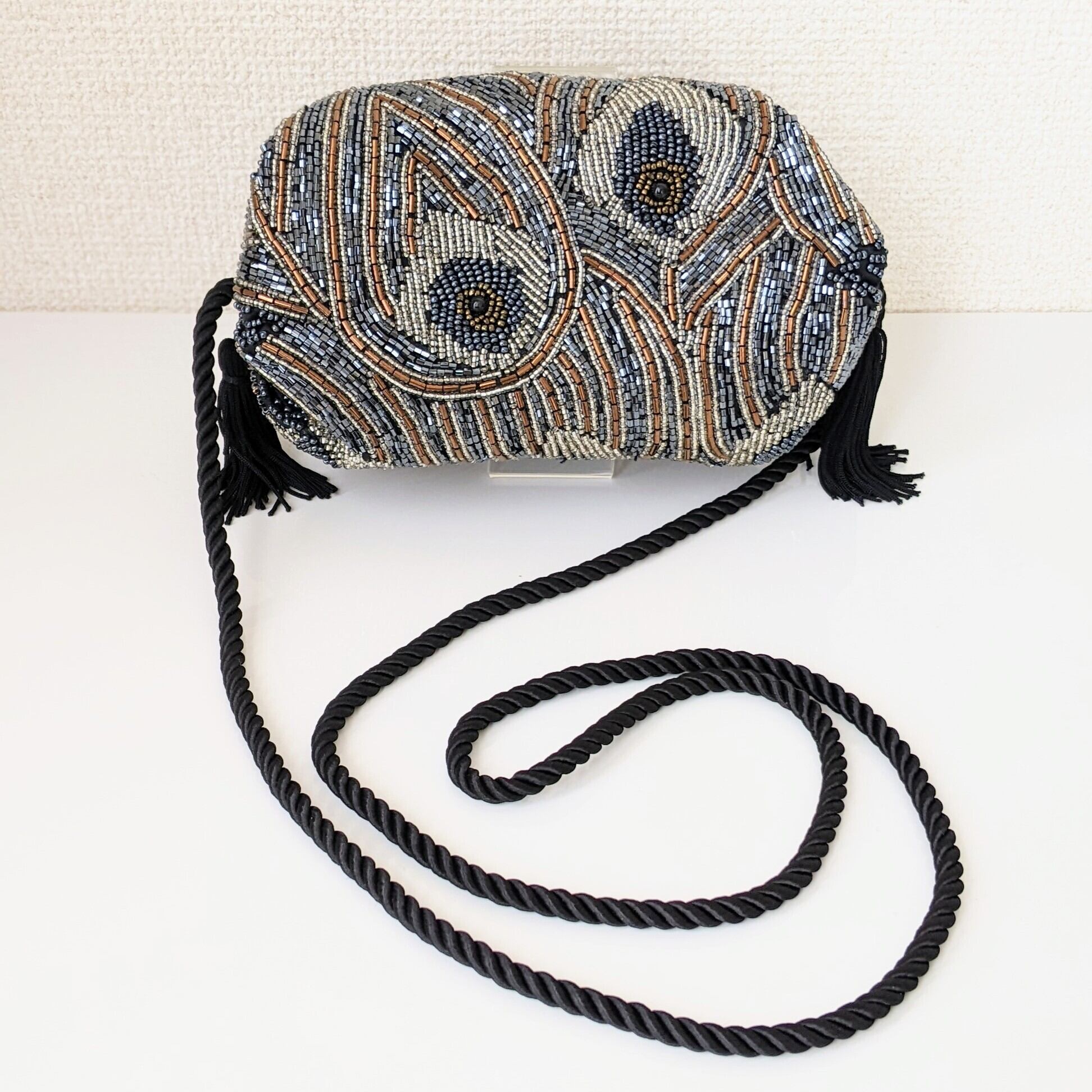 ピーコック(孔雀の羽)模様のショルダータイプのビーズバッグです。