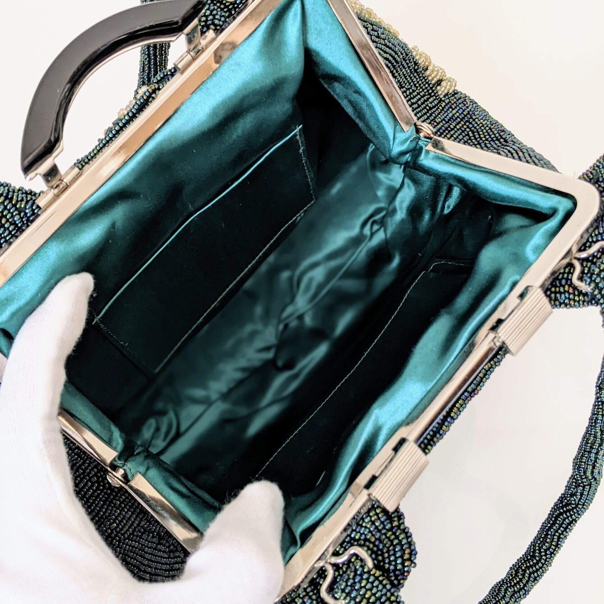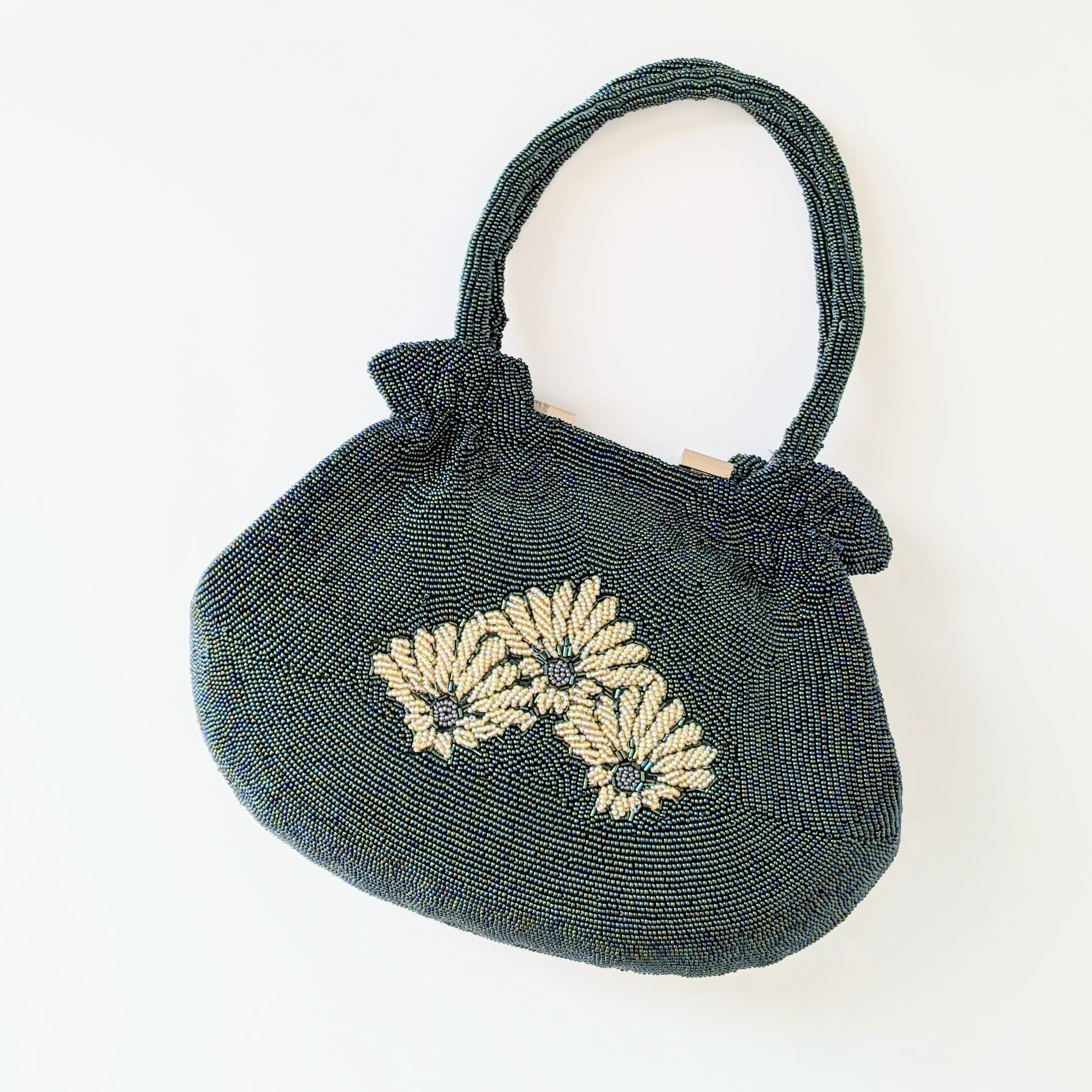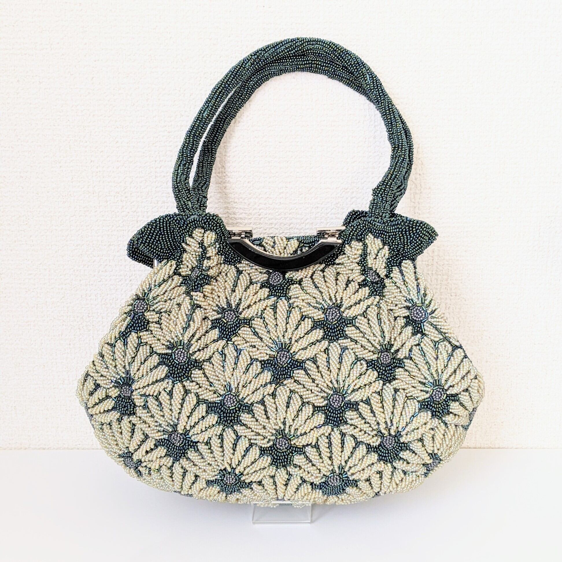 【vintage】ビーズ刺繍バッグ パーティーバッグ 深緑×白 菊 花柄 幾何学模様 北欧テイスト 昭和レトロ 大正浪漫 フォーマルバッグ 結婚式 パーティ