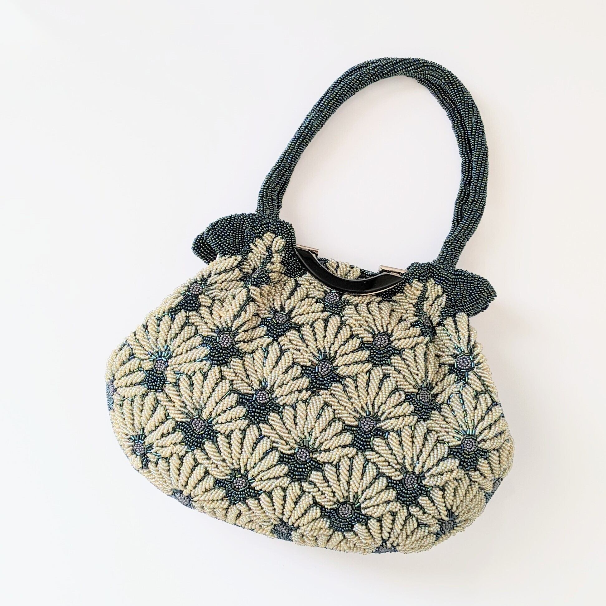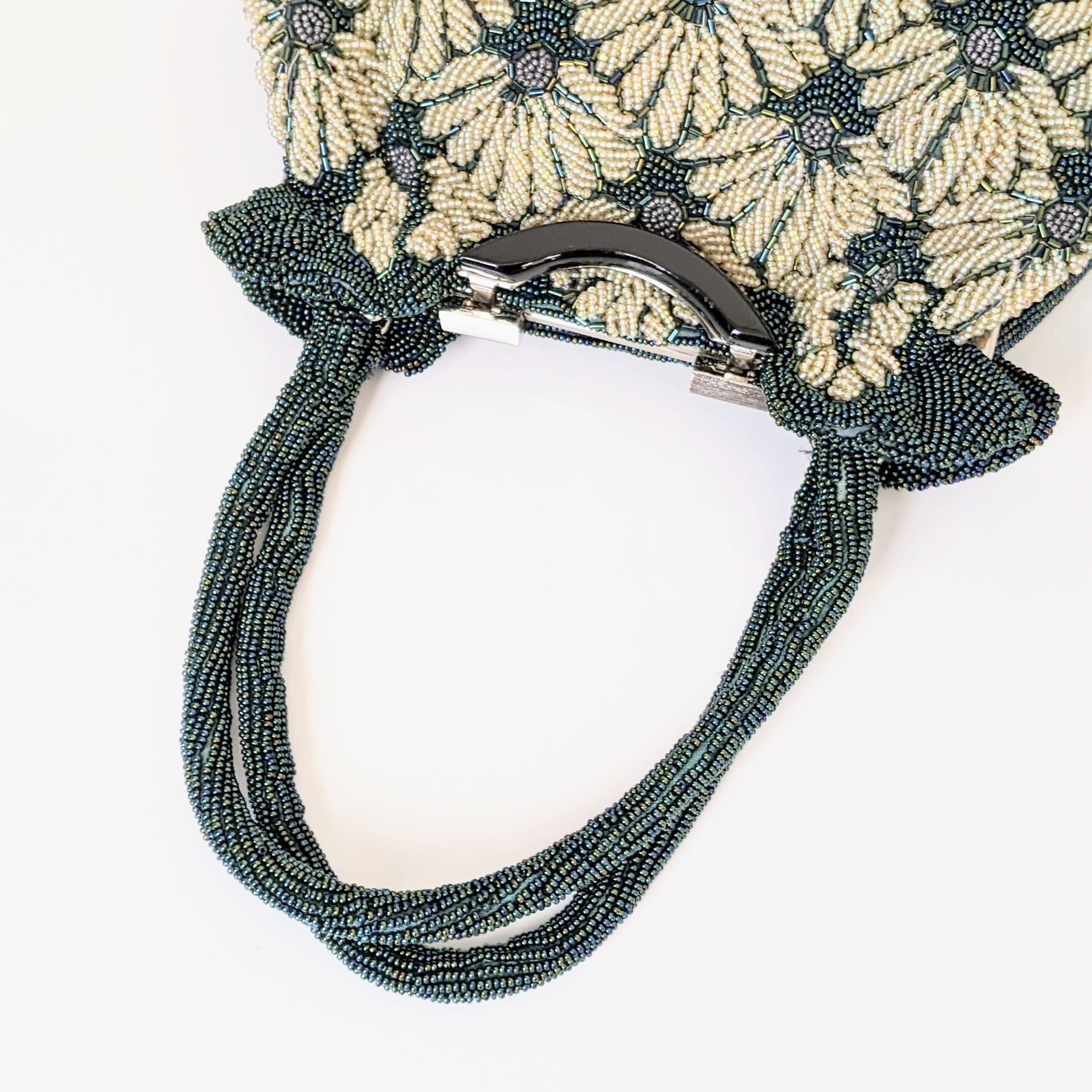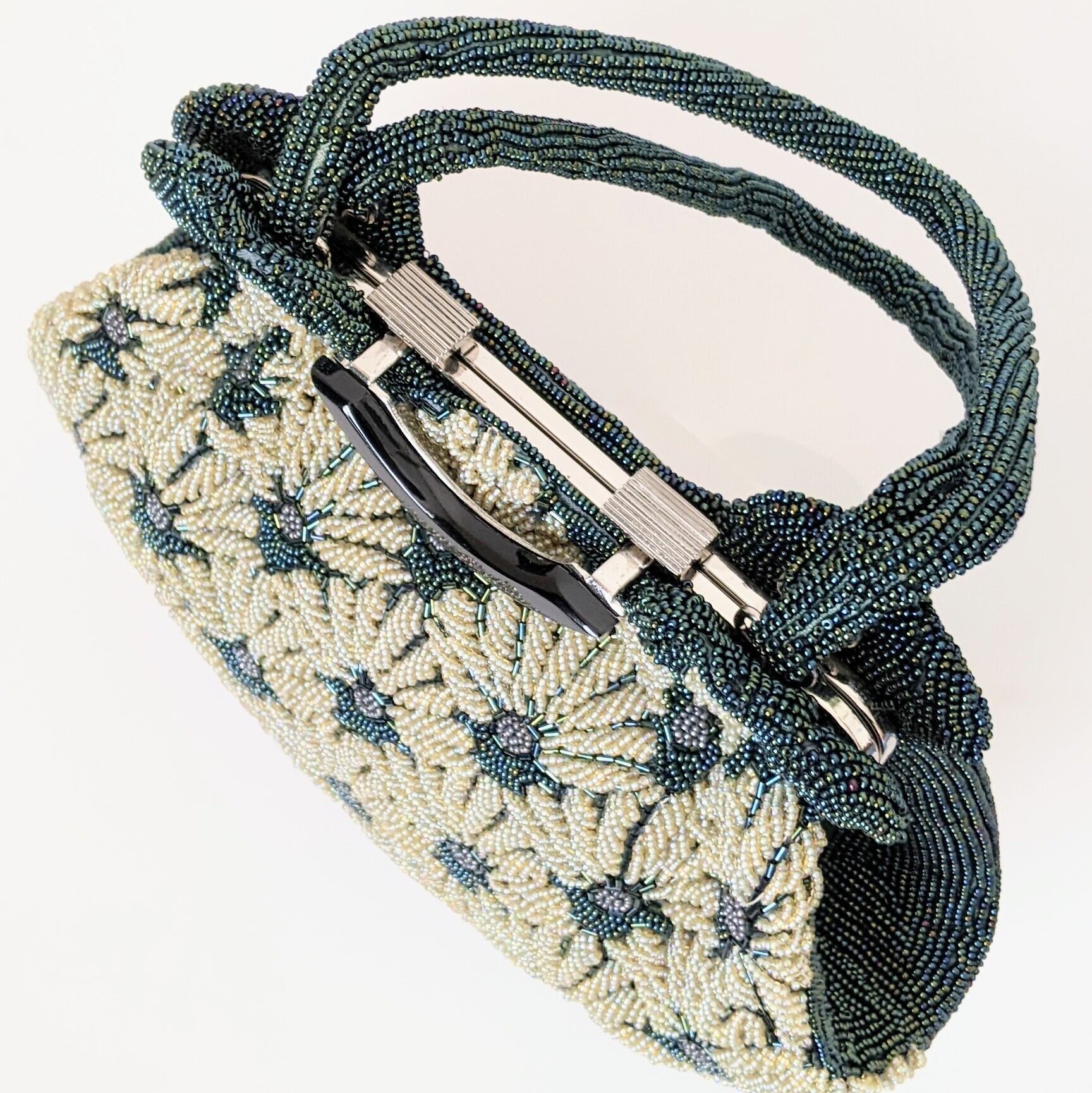 【vintage】ビーズ刺繍バッグ パーティーバッグ 深緑×白 菊 花柄 幾何学模様 北欧テイスト 昭和レトロ 大正浪漫 フォーマルバッグ 結婚式 パーティ