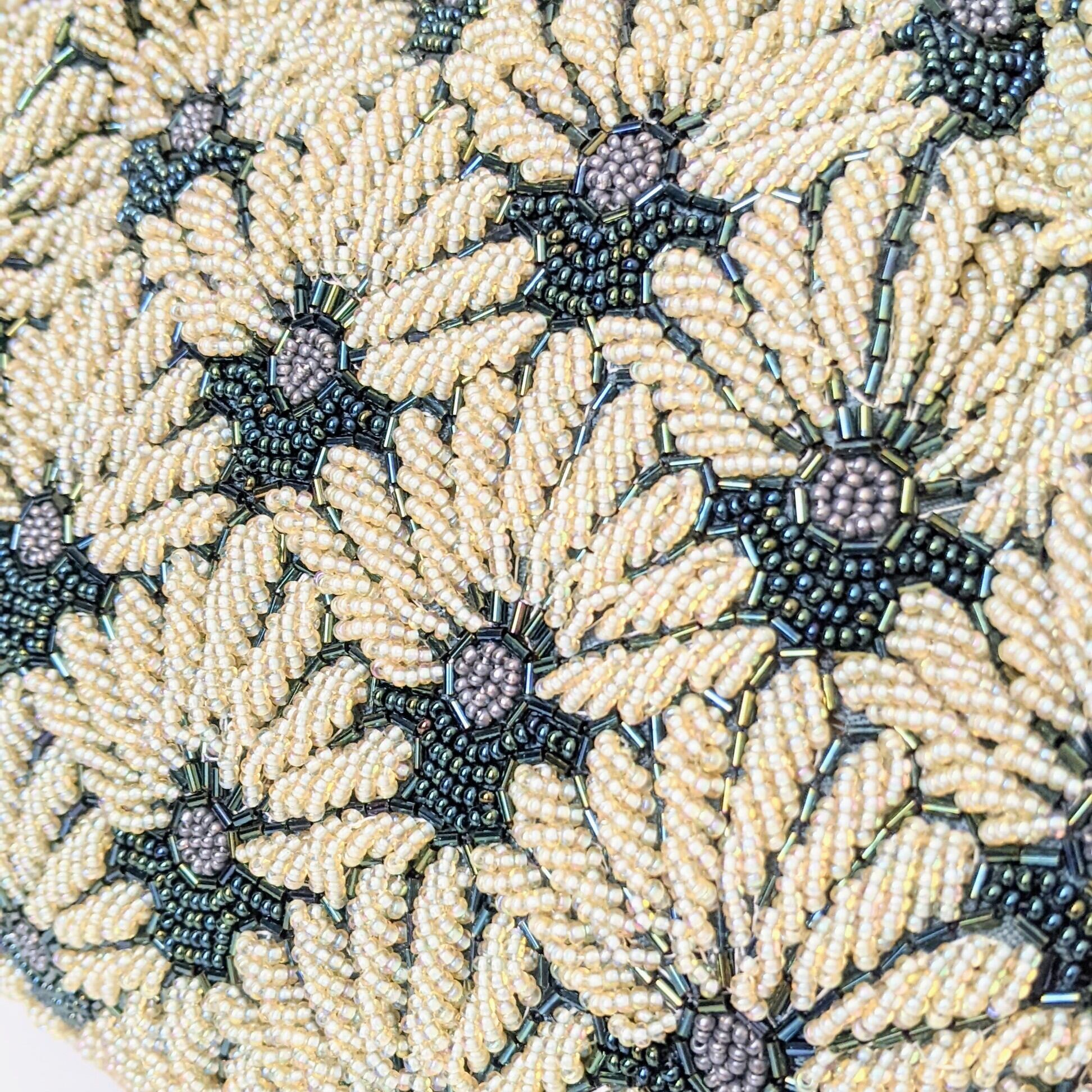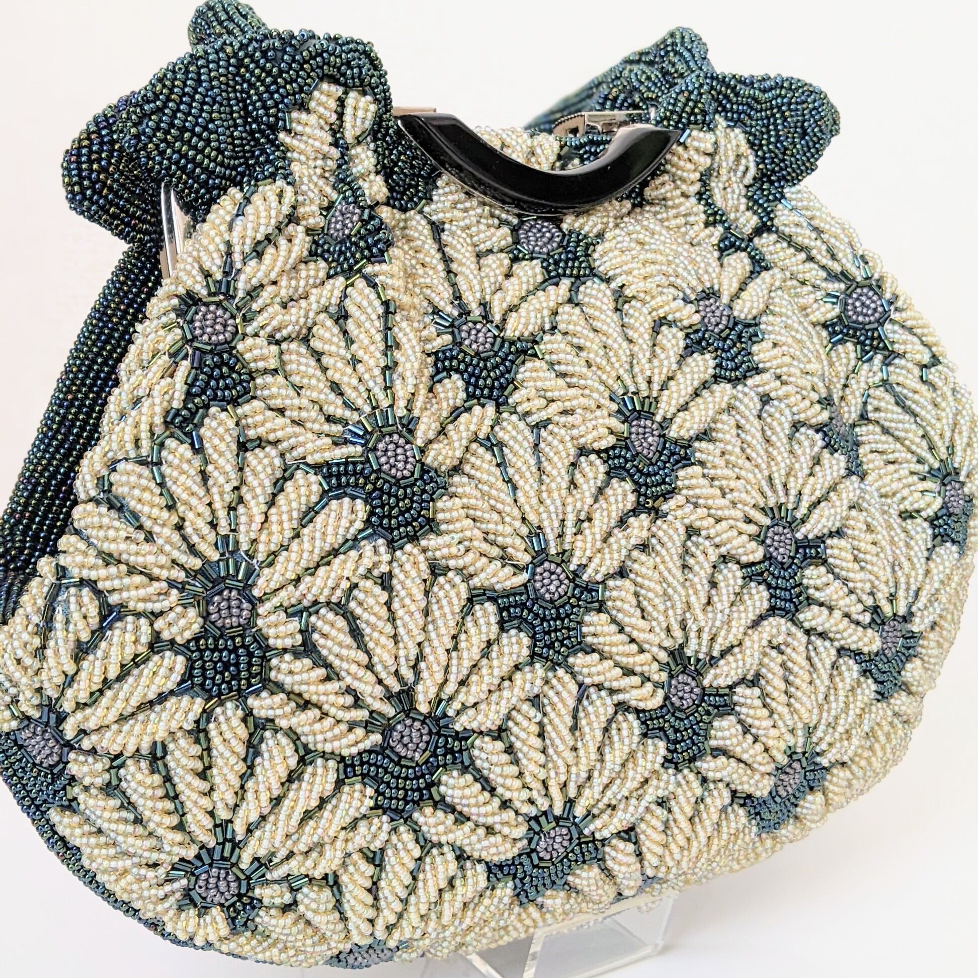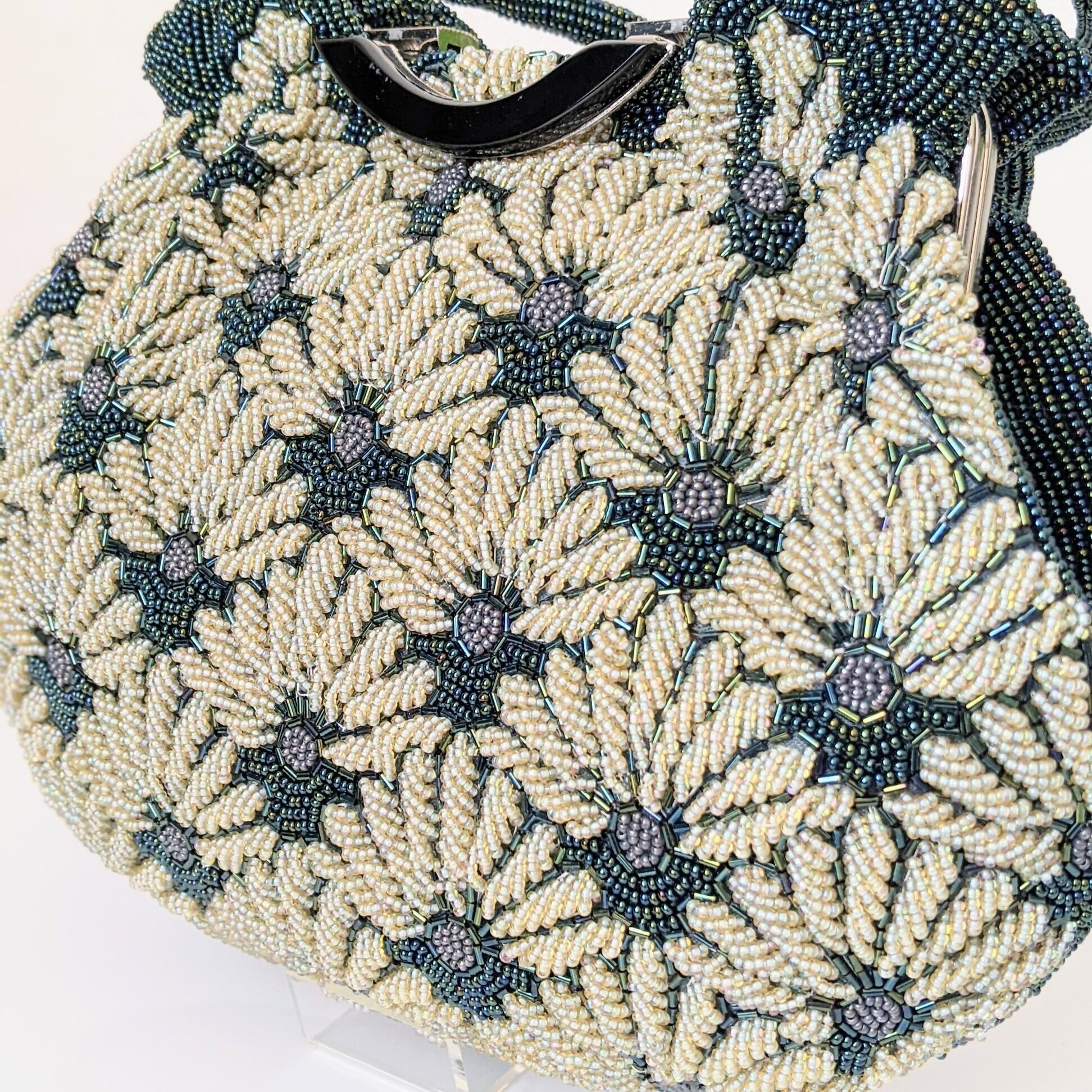 深緑色ベースに白い菊の花の文様が幾何学的にデザインされたビーズバッグです。