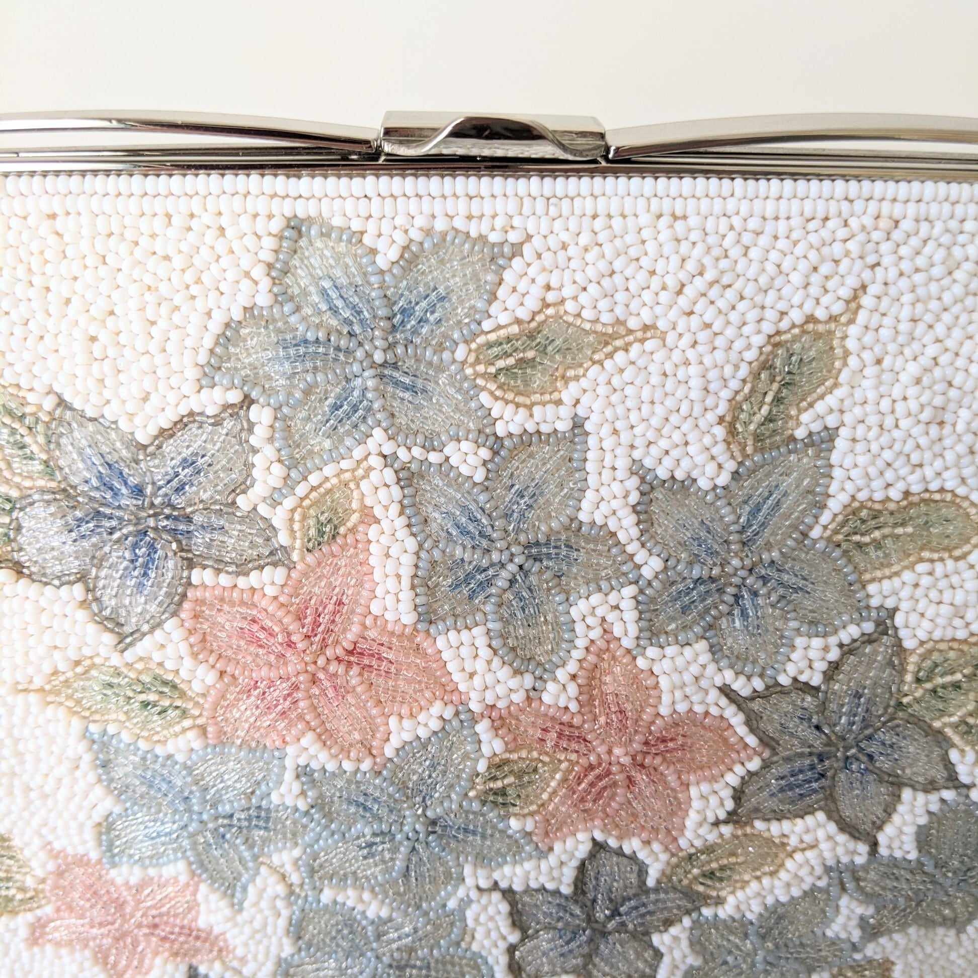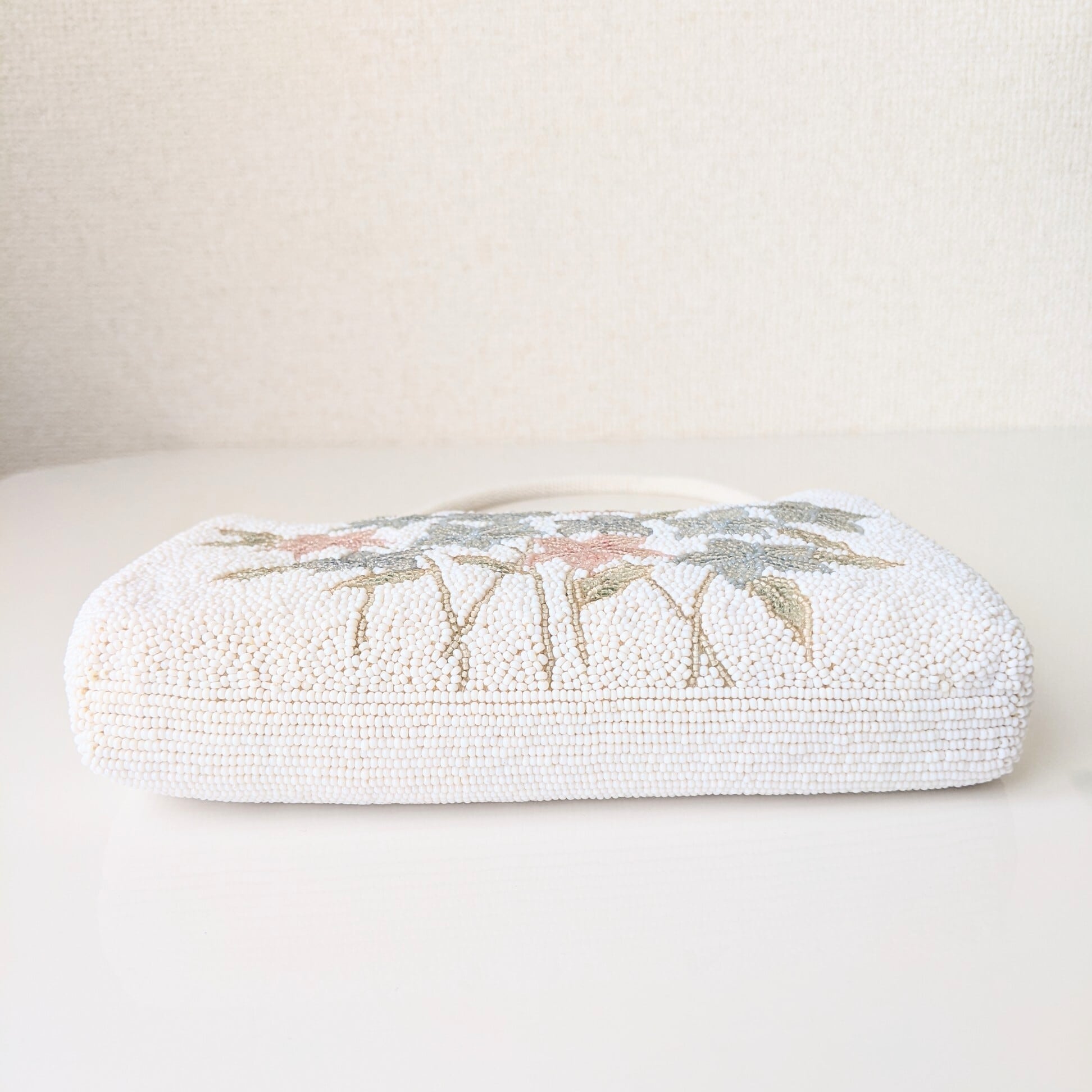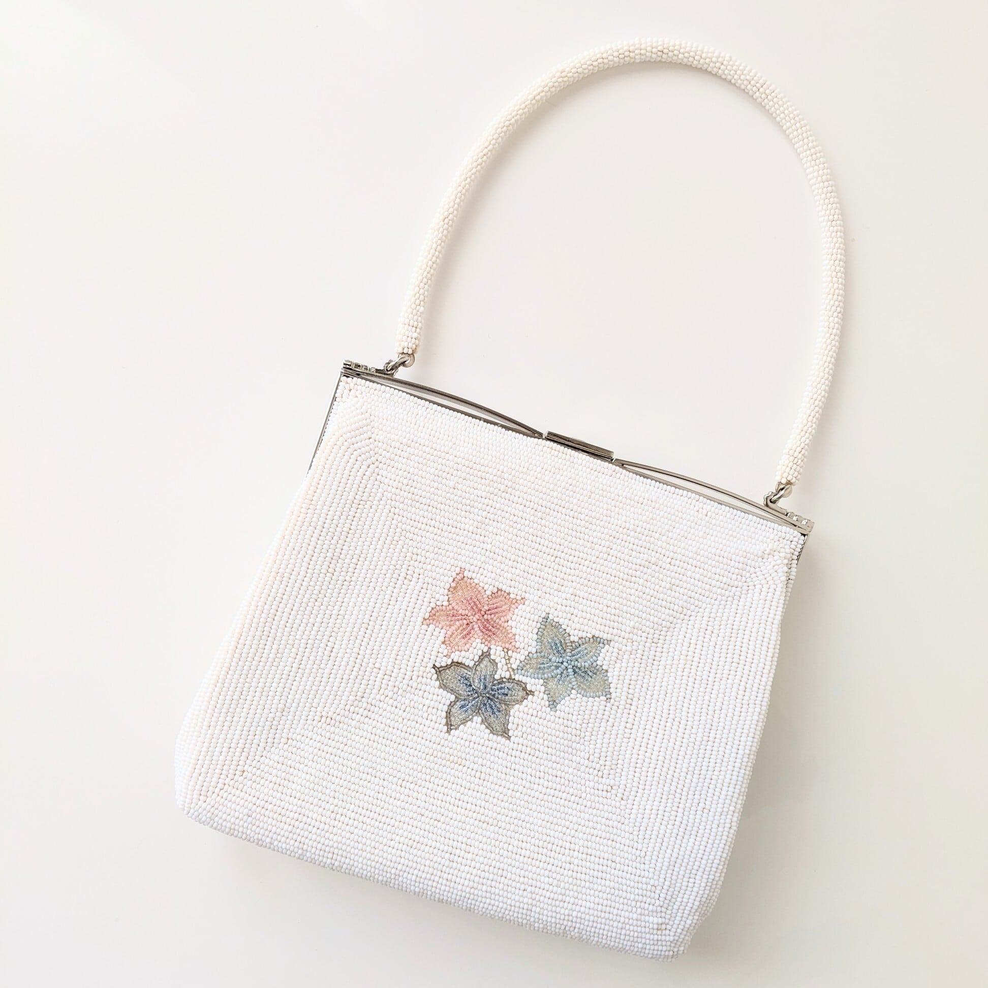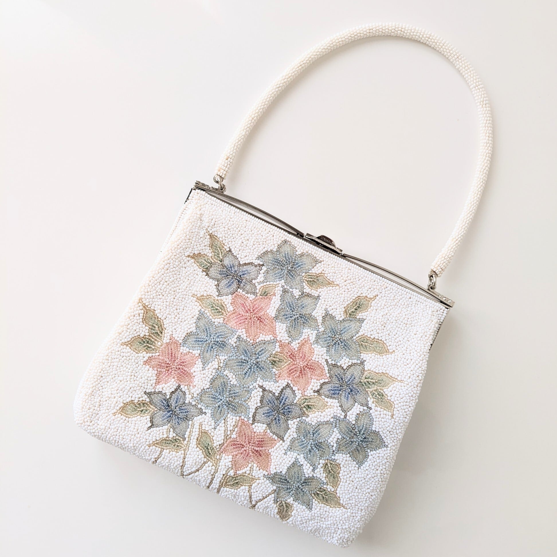 白地にピンクと水色の紫陽花の花のような、もしくは花束のような、優しい色合いのビーズバッグです。