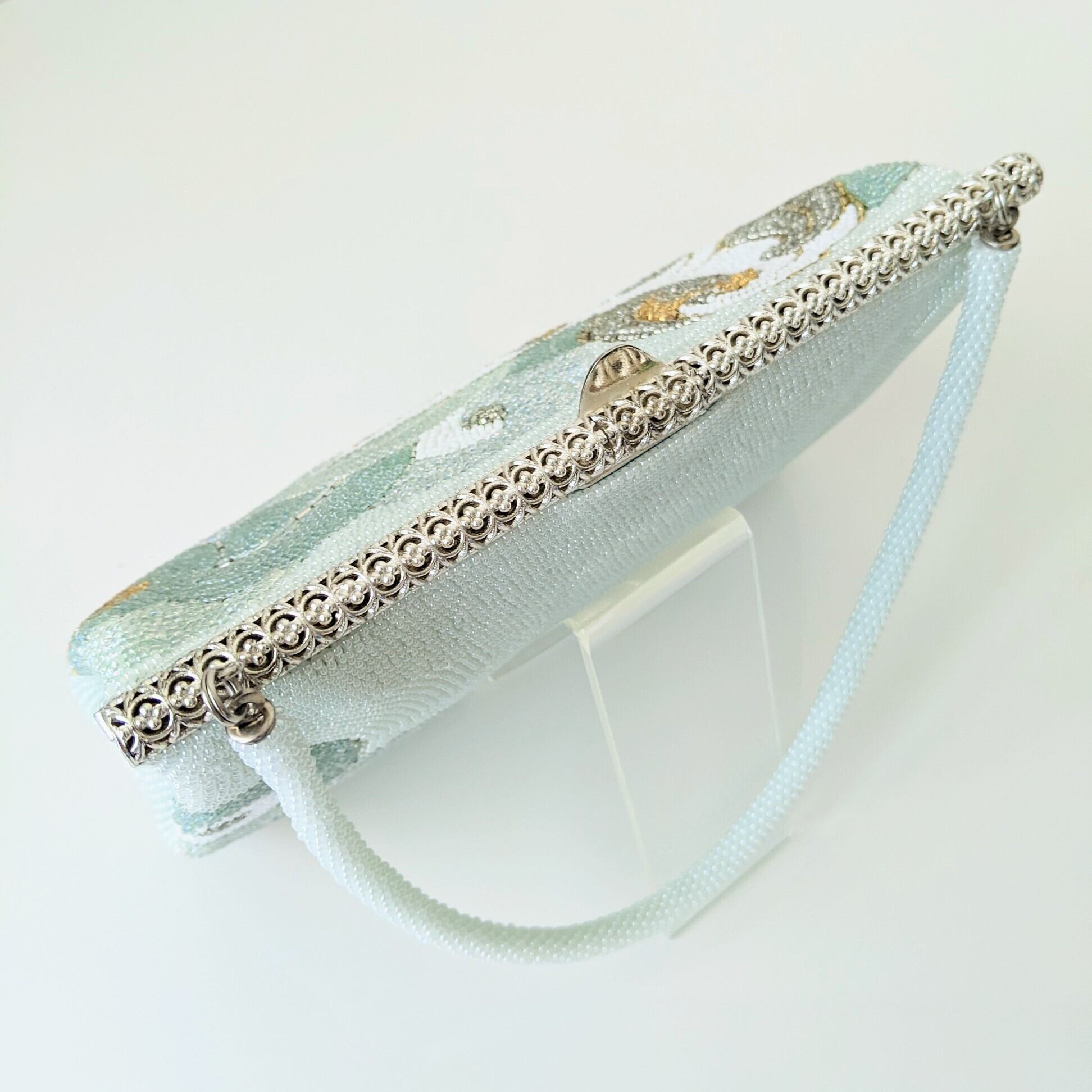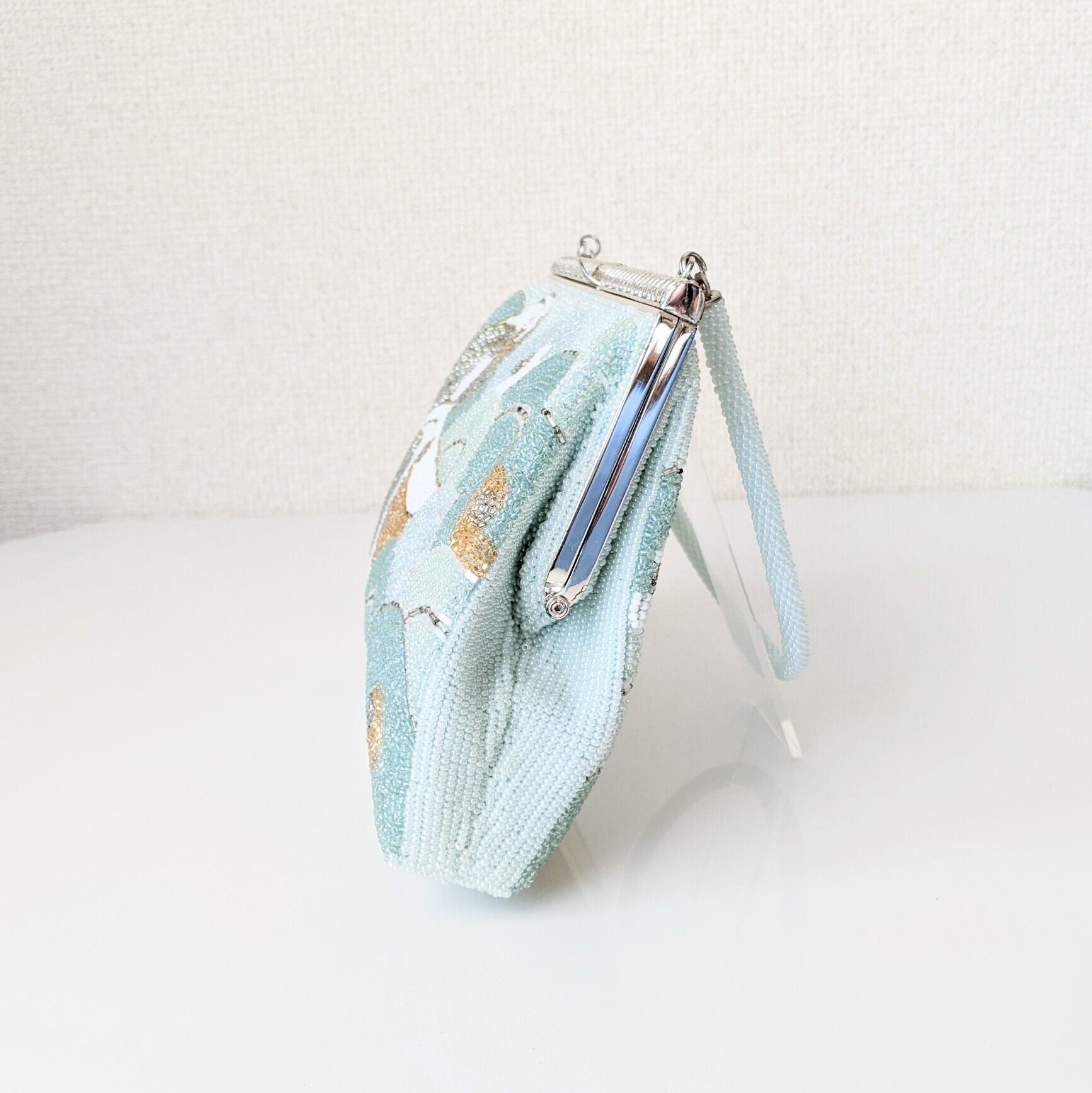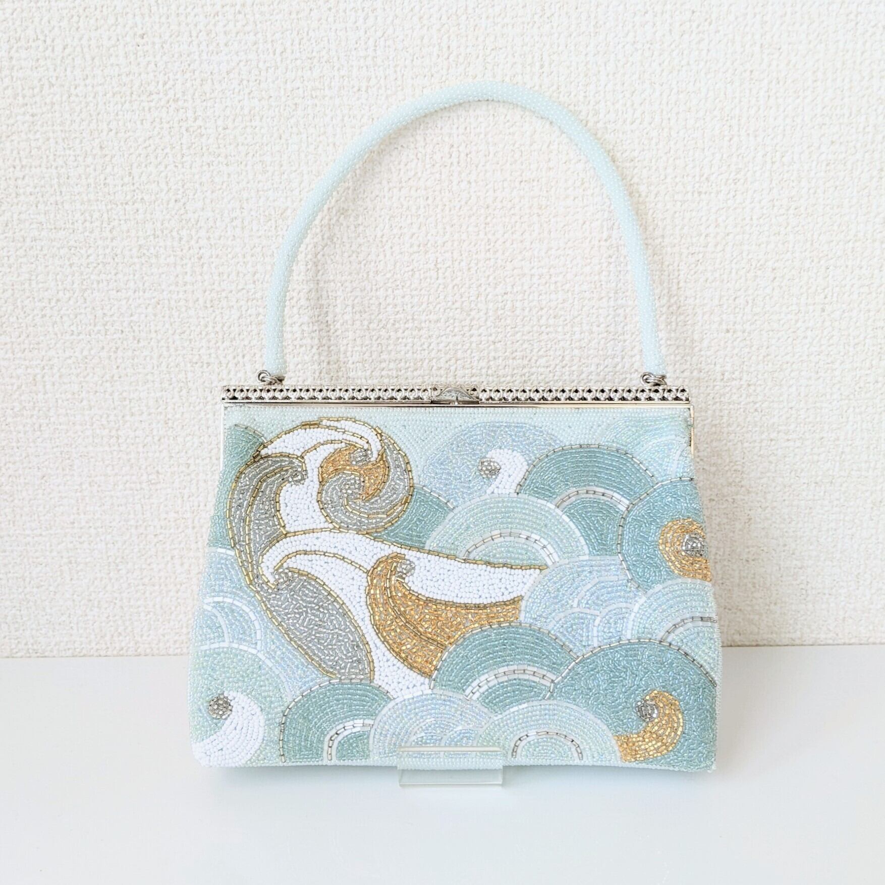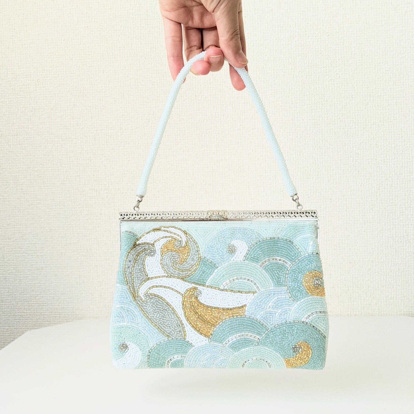 【Vintage】「はしもと」 ビーズ刺繍バッグ パーティーバッグ 浴衣 お祭り 花火大会 波丸×青海波文様 夏 海 水色 鏡付き 昭和レトロ 大正浪漫 フォーマルバッグ 結婚式 パーティ