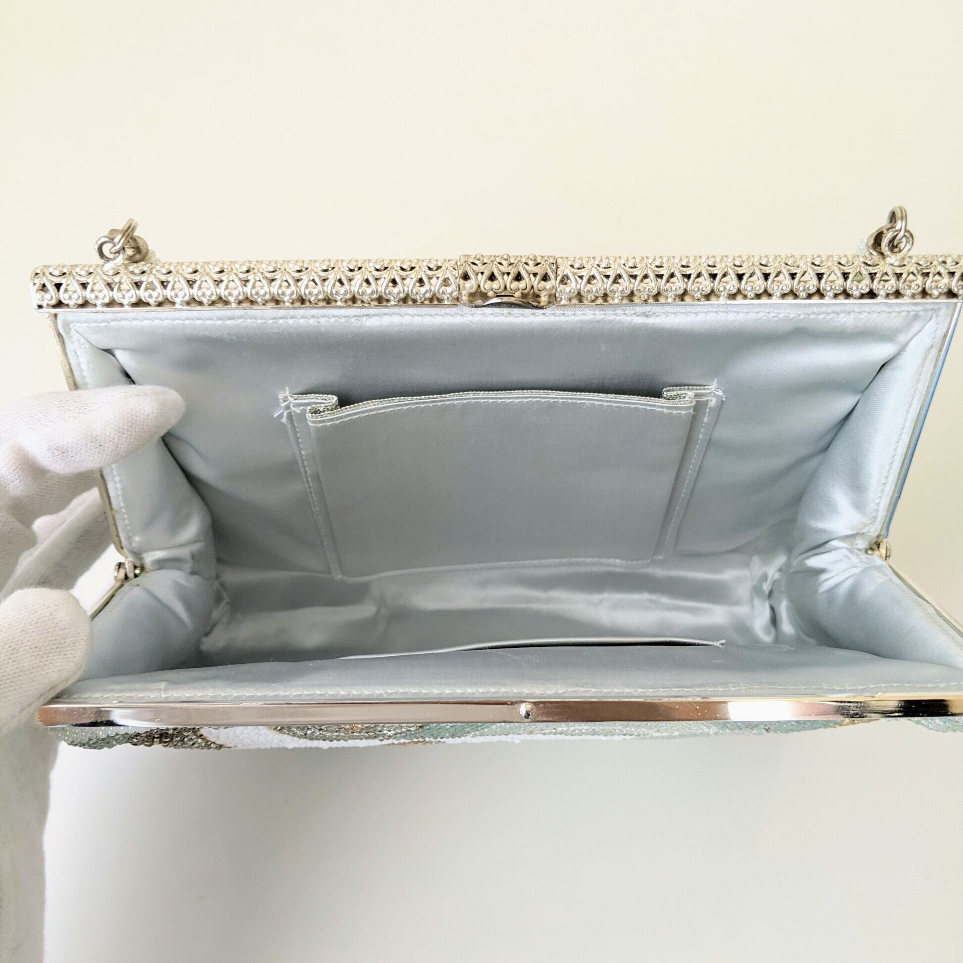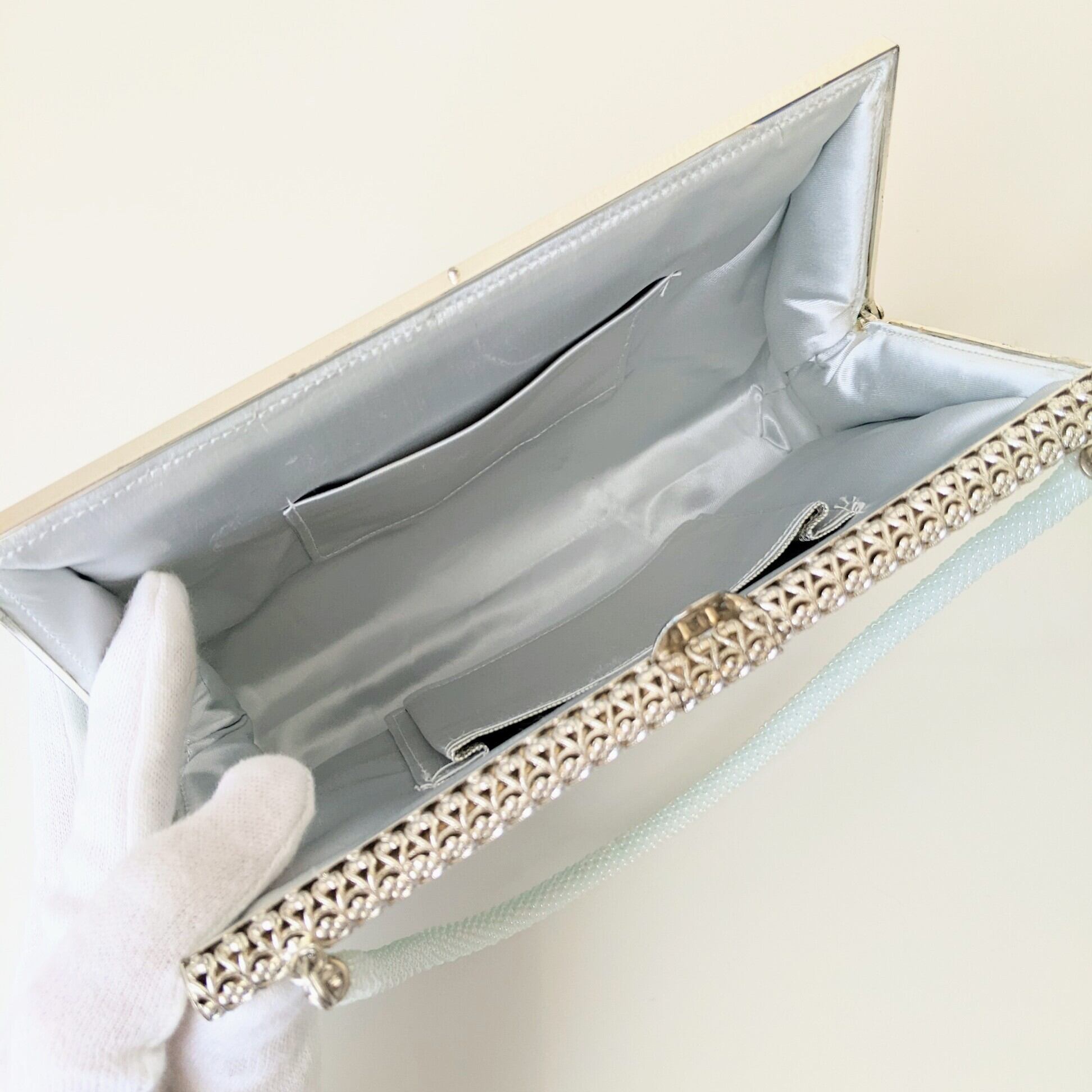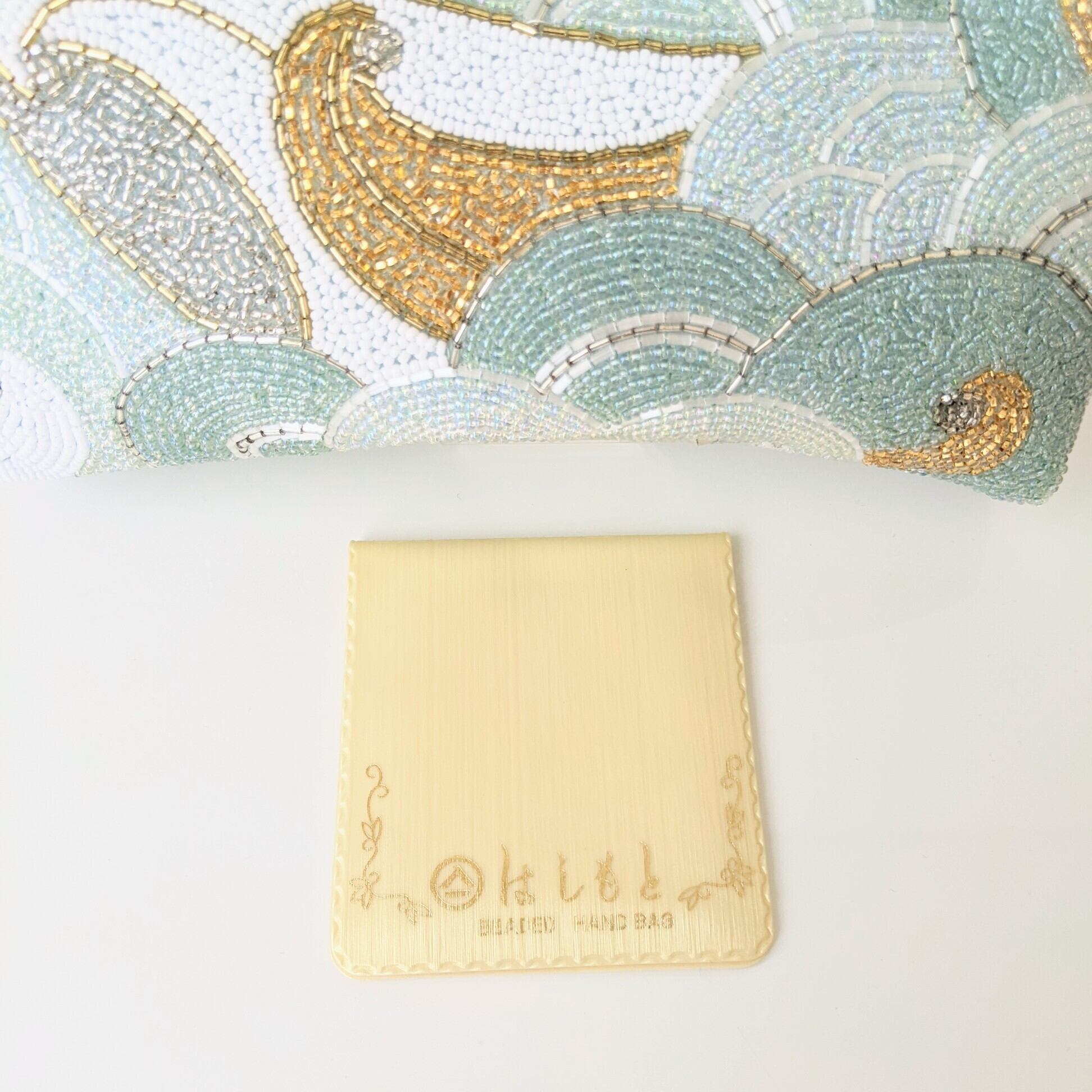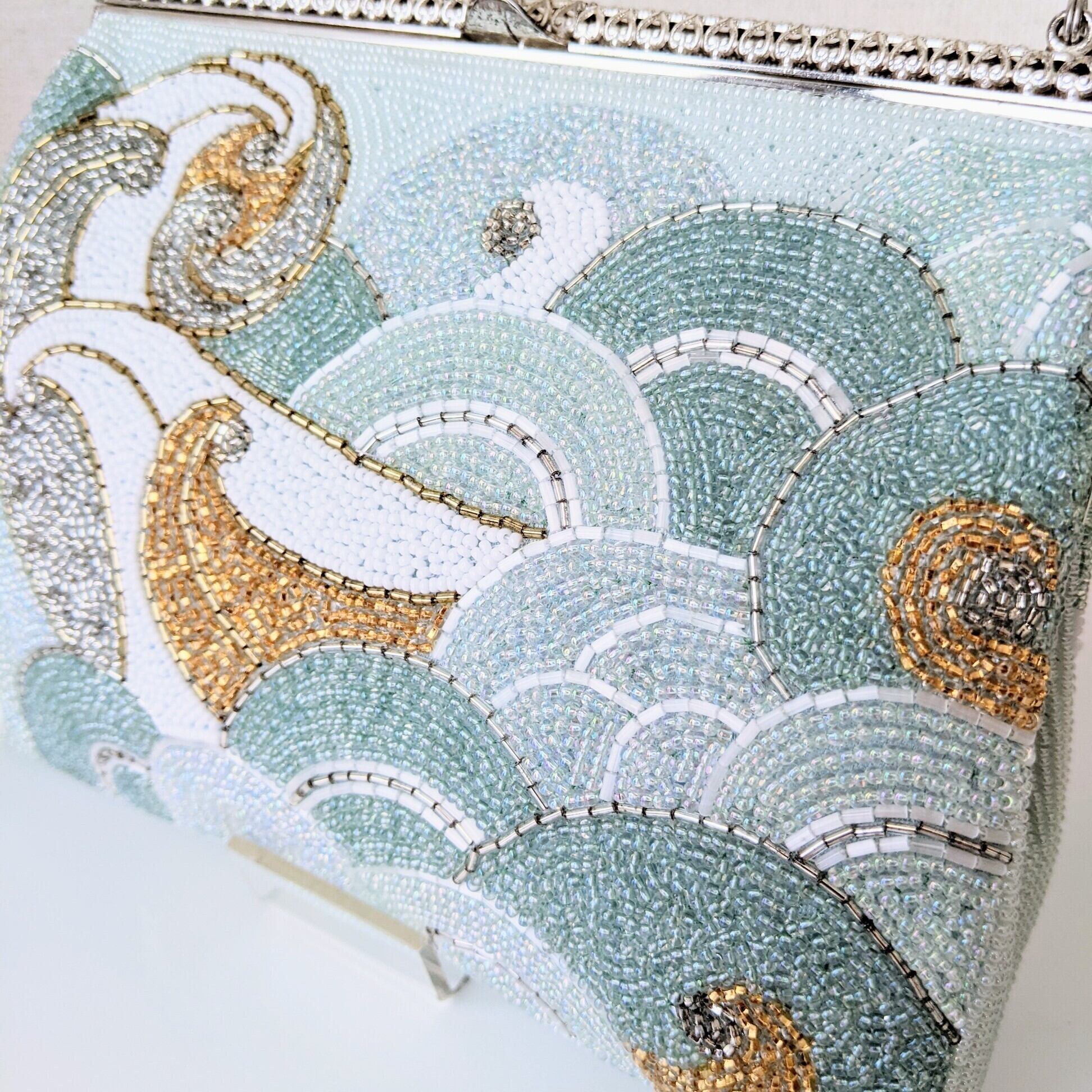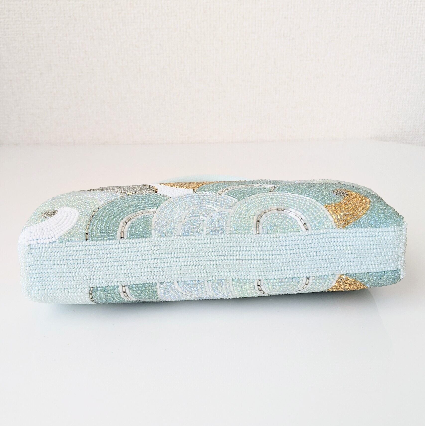 【Vintage】「はしもと」 ビーズ刺繍バッグ パーティーバッグ 浴衣 お祭り 花火大会 波丸×青海波文様 夏 海 水色 鏡付き 昭和レトロ 大正浪漫 フォーマルバッグ 結婚式 パーティ