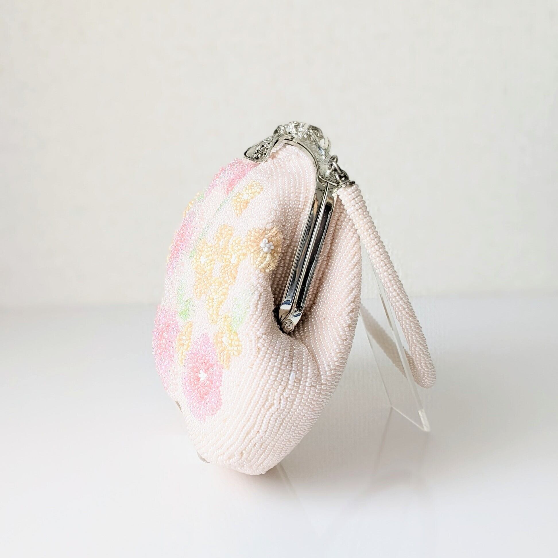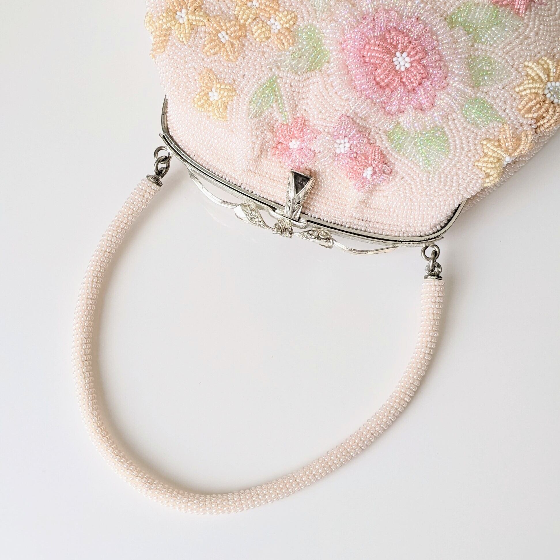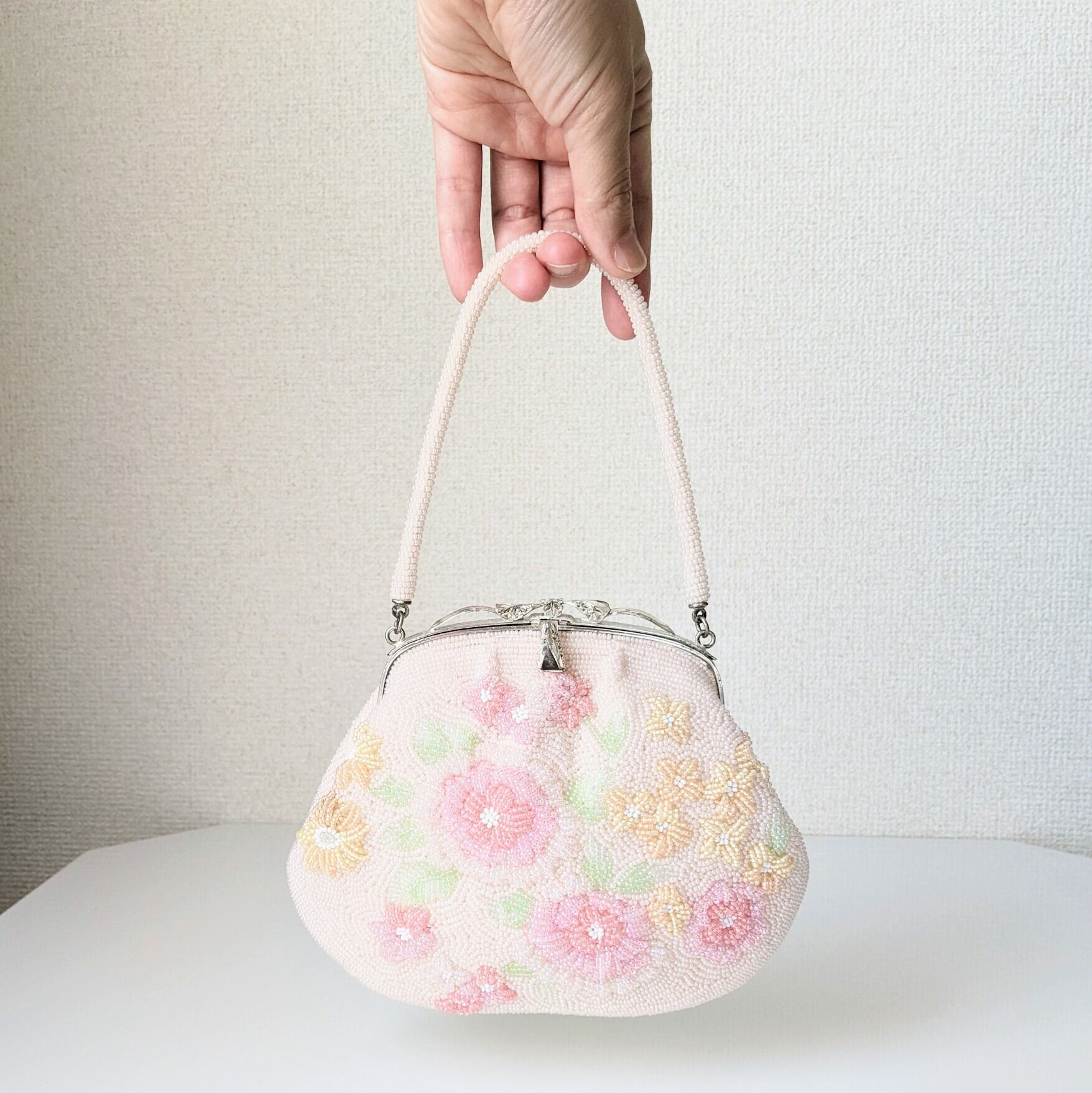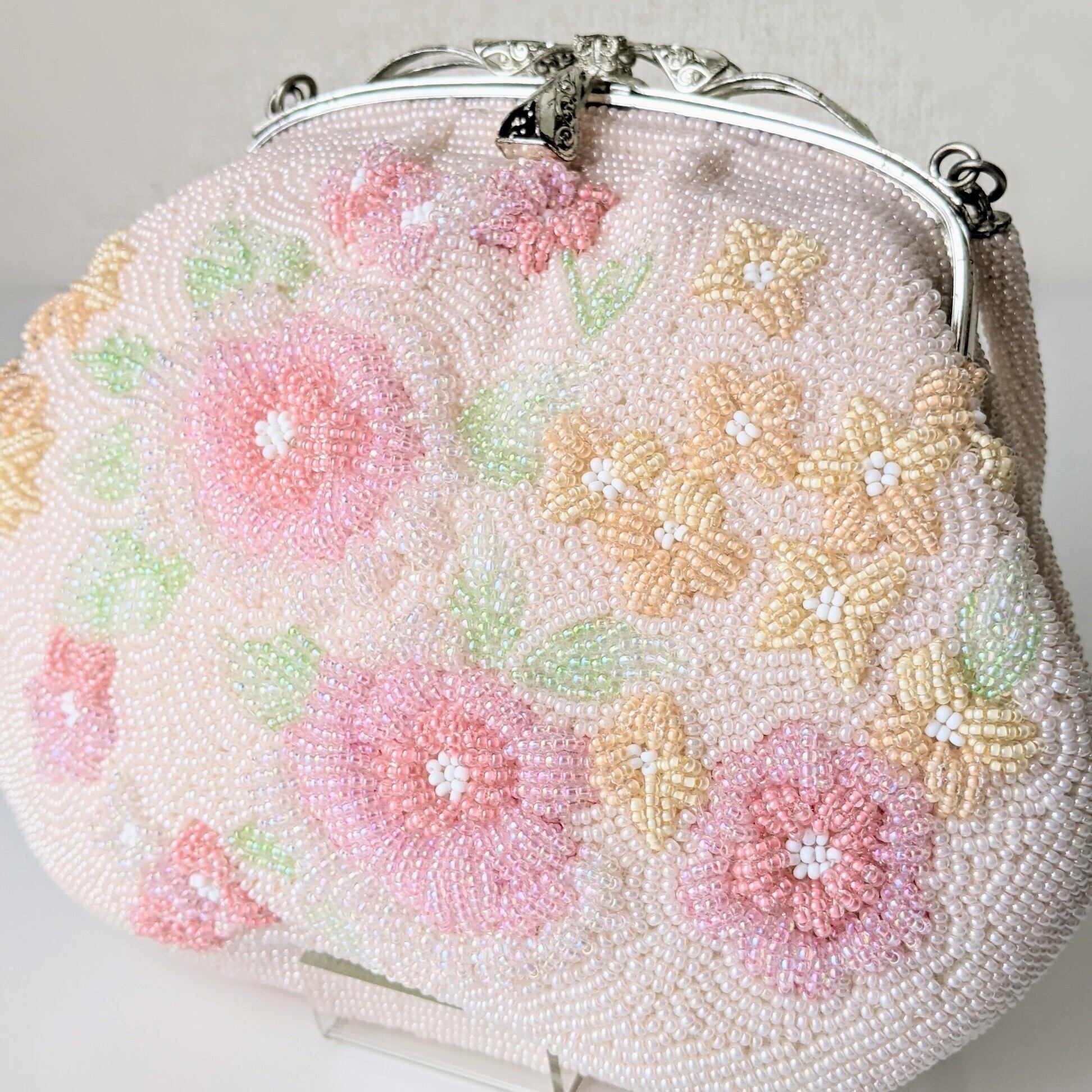 【Vintage】ビーズ刺繍バッグ パーティーバッグ ベビーピンク 花柄 七五三 パステルカラー 昭和レトロ 大正浪漫 フォーマルバッグ 結婚式