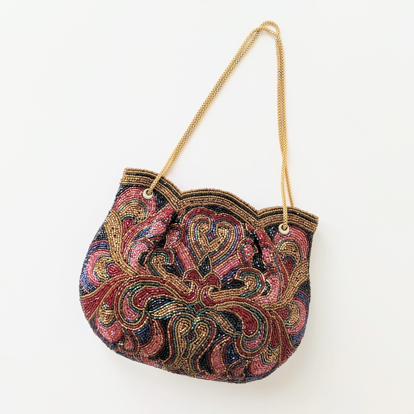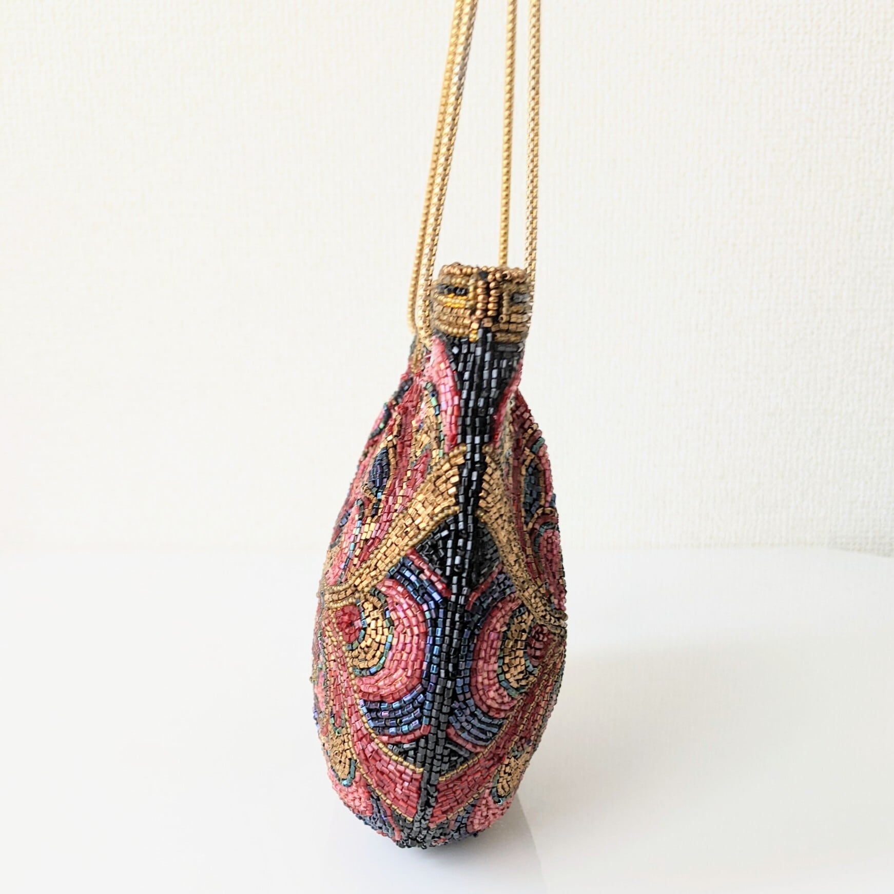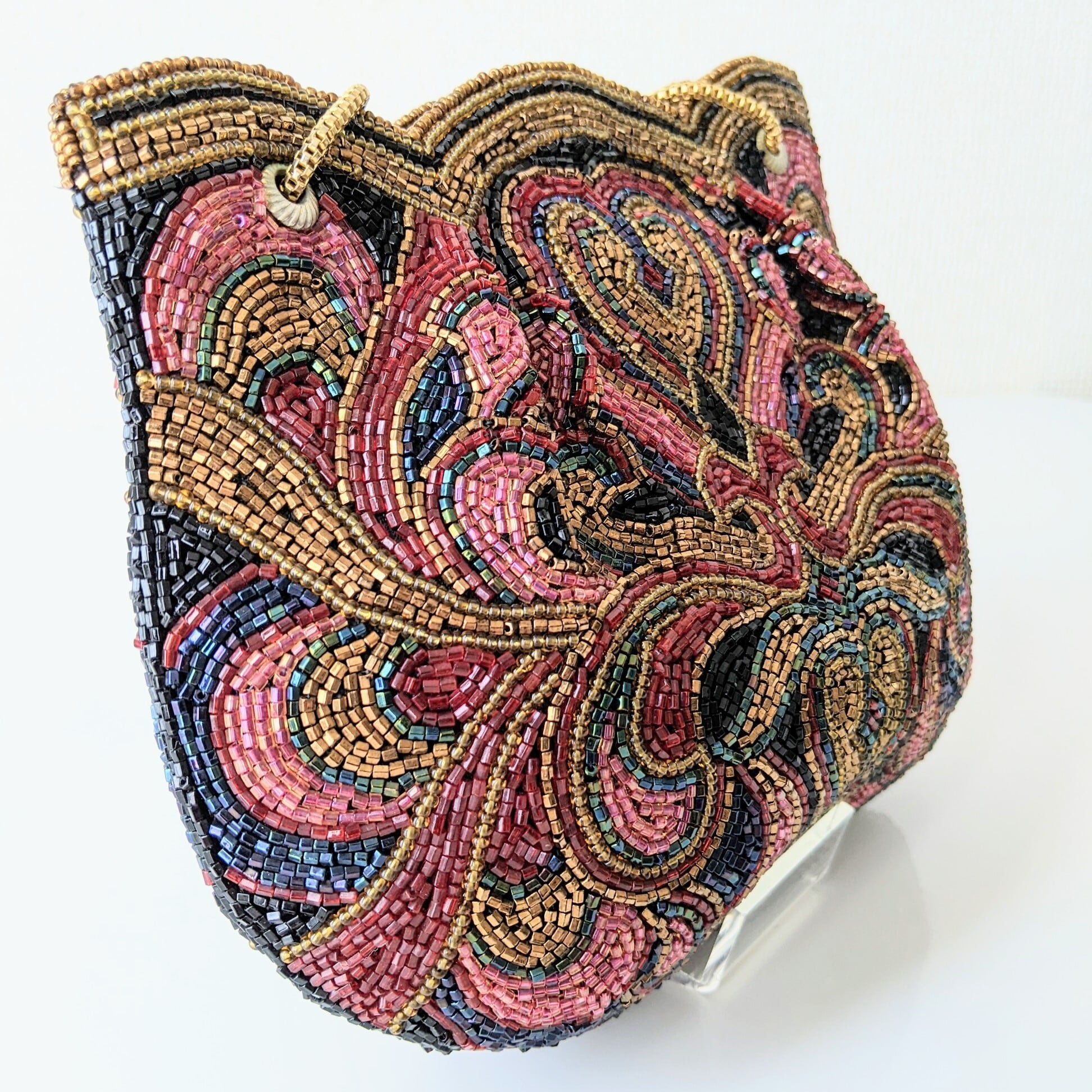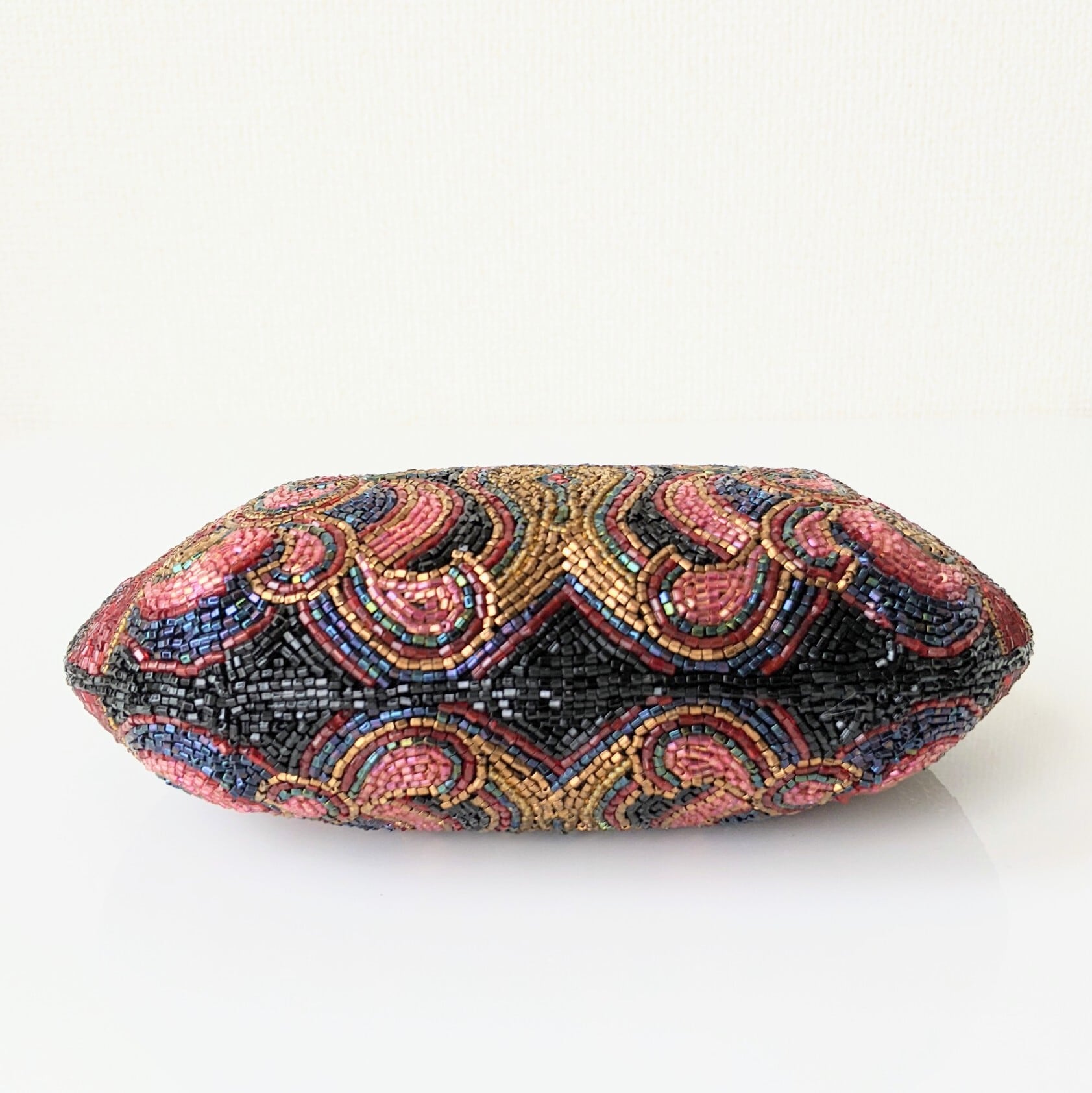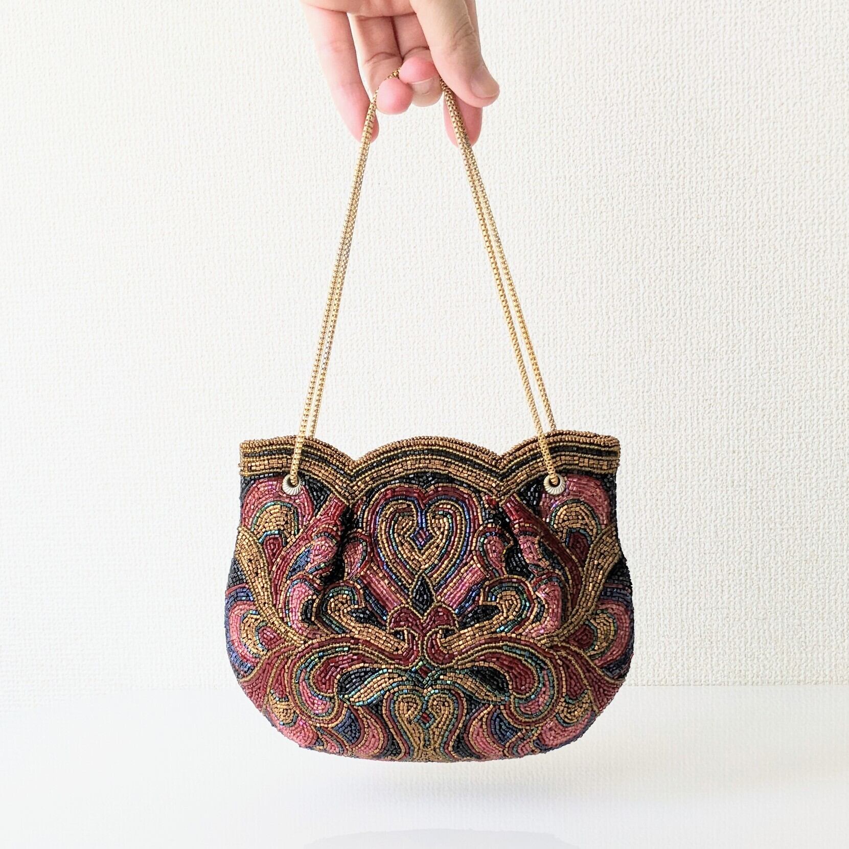 【Vintage】ビーズ刺繍バッグ LUMY 「はしもと」 パーティーバッグ アラベスク模様 マルチカラー 昭和レトロ 大正浪漫 フォーマルバッグ 結婚式