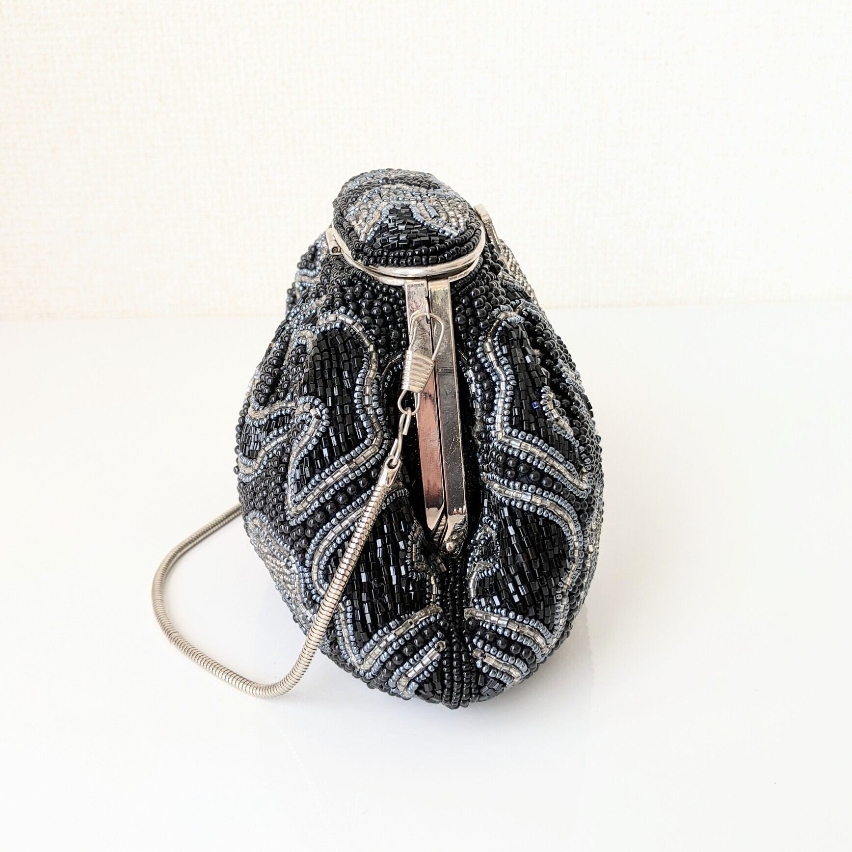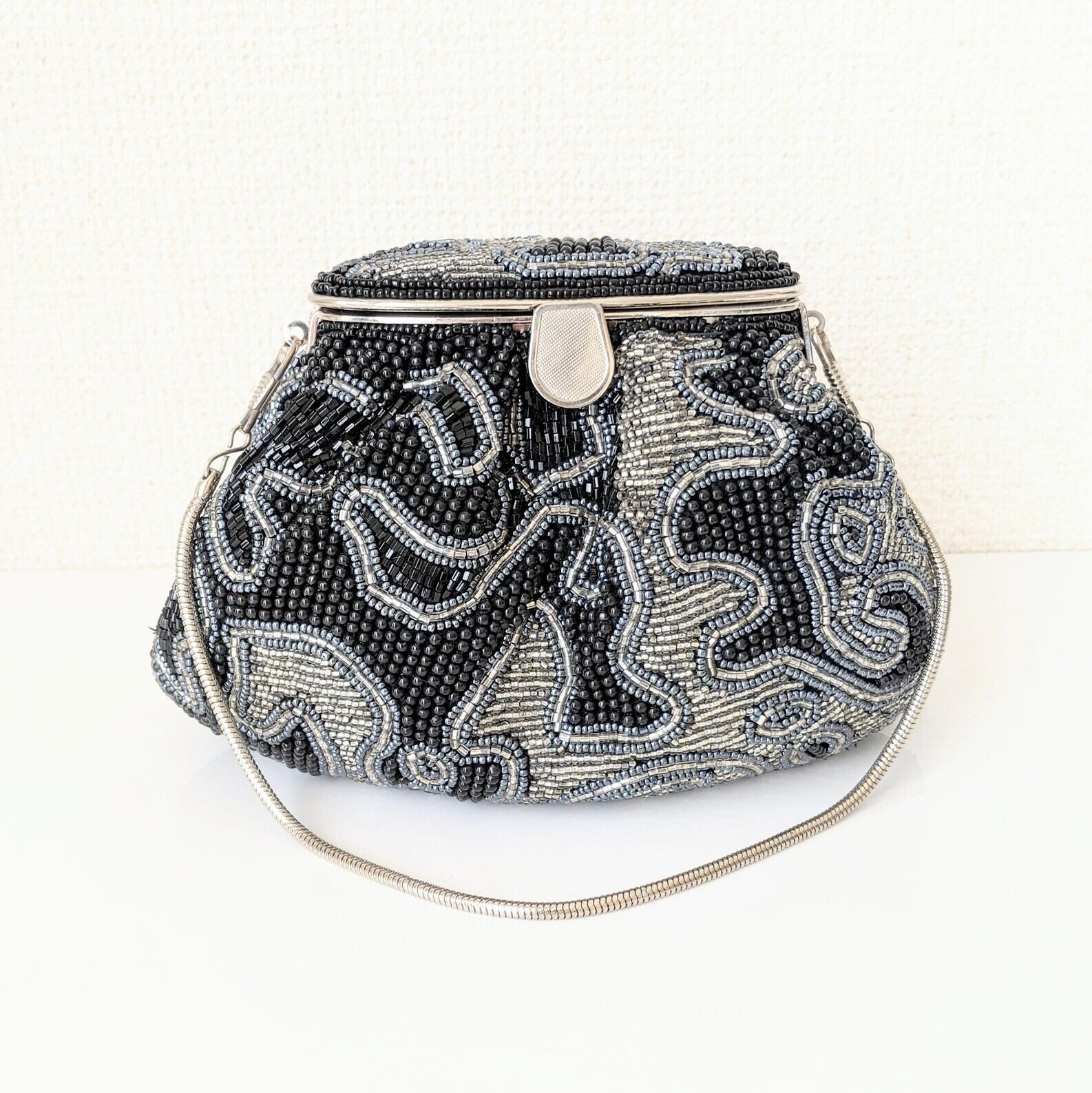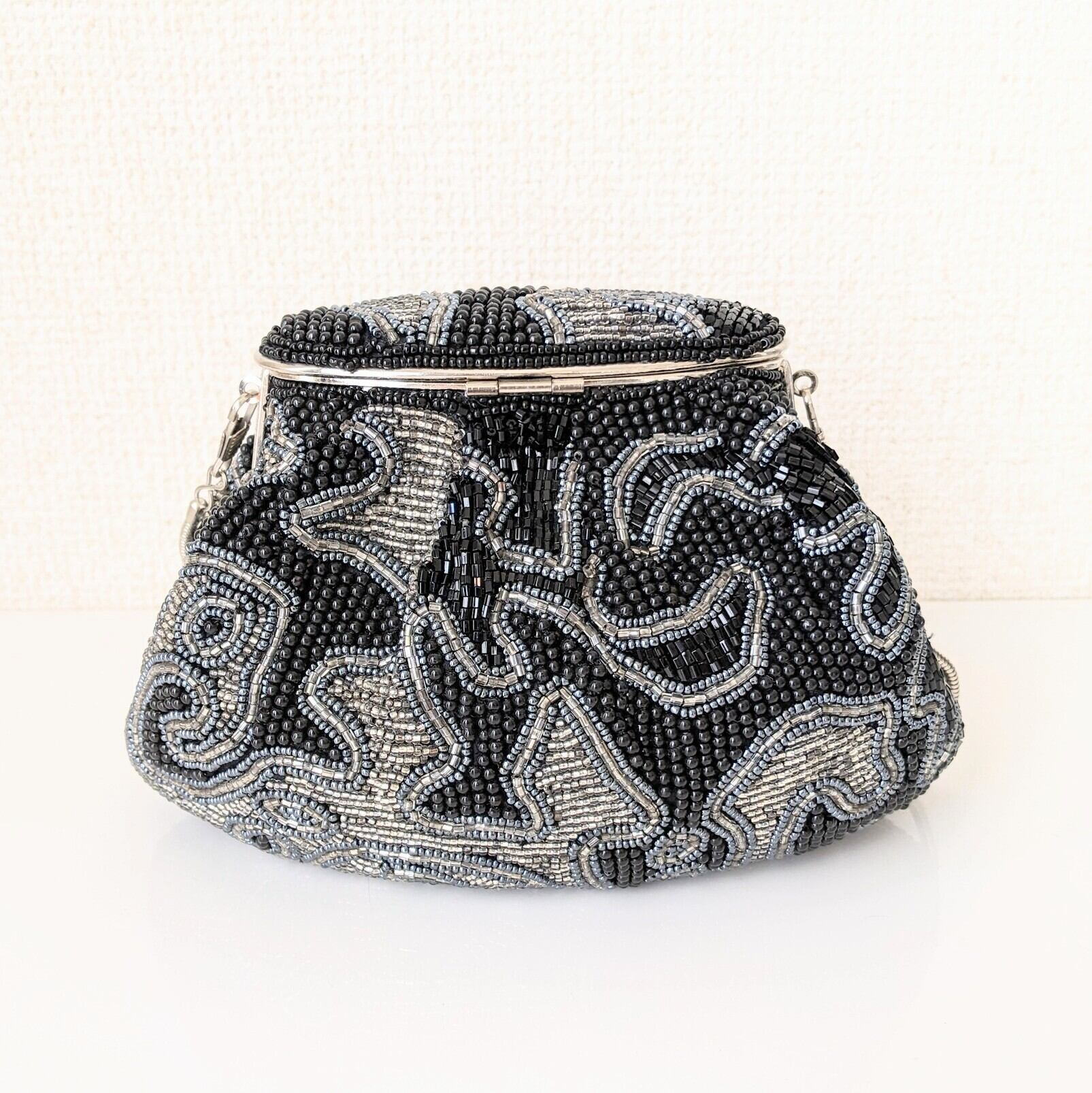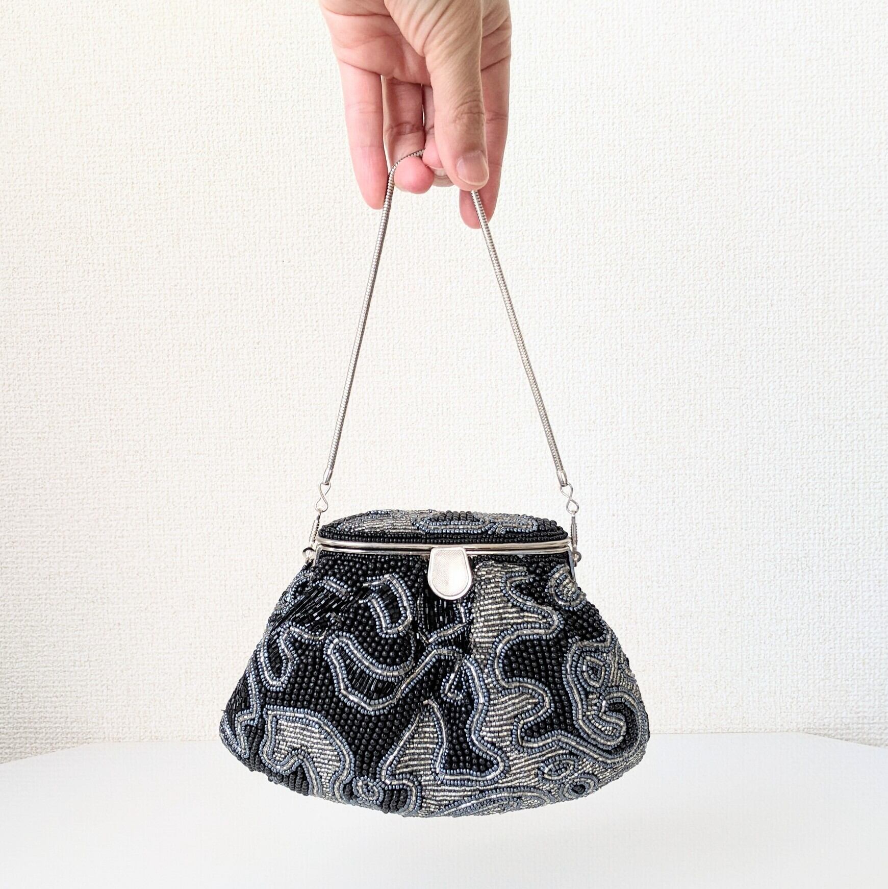 カラフルな色使いが多くみられる蓋つきビーズバッグですが、こちらは黒とシルバーのとてもシックなデザイン。ショルダータイプは、立食パーティといった動きまわる場では両手が塞がらずとても便利です。