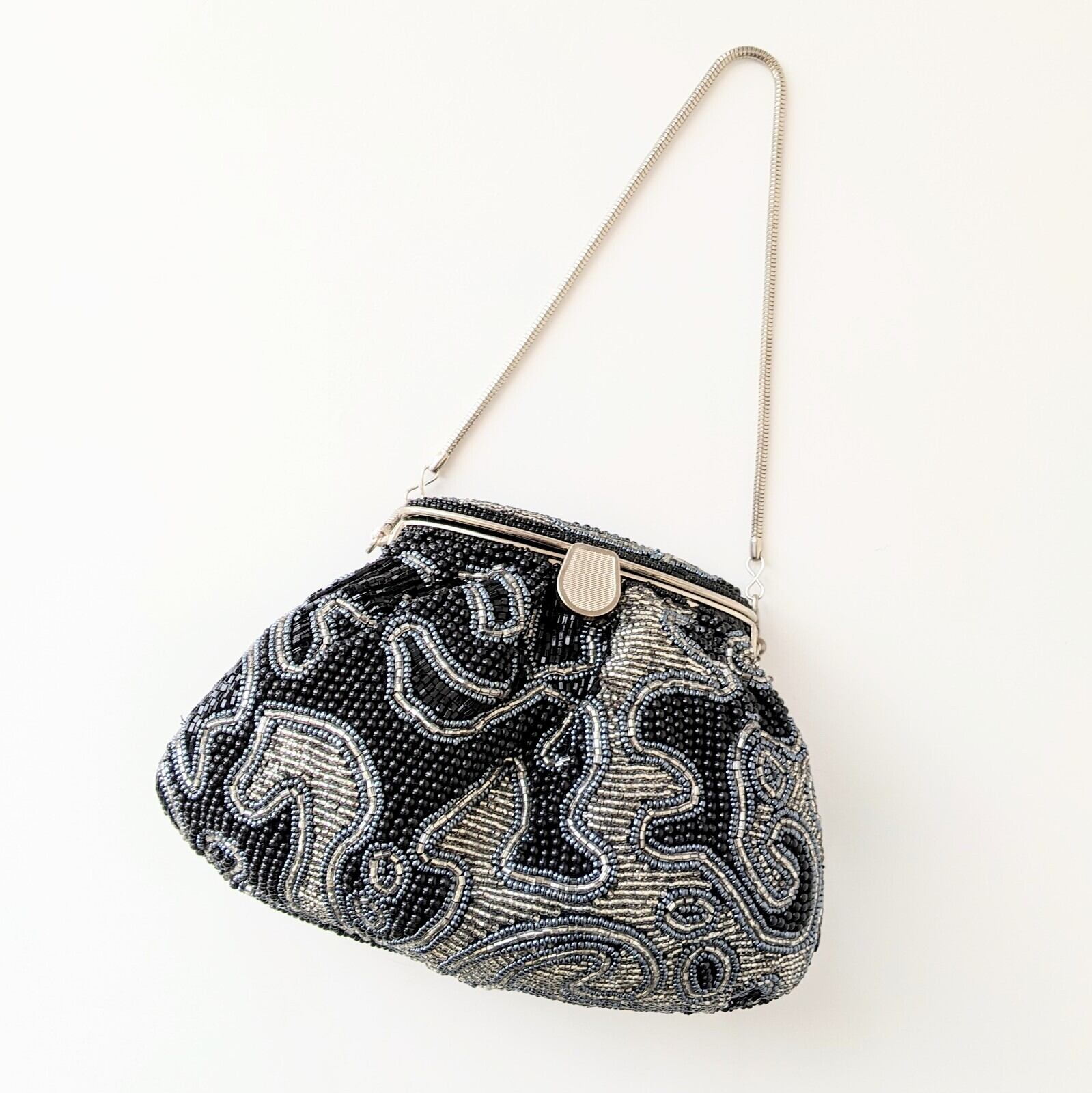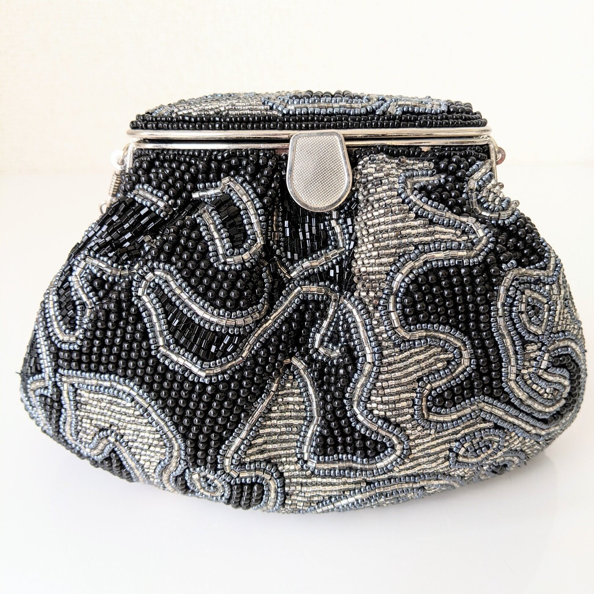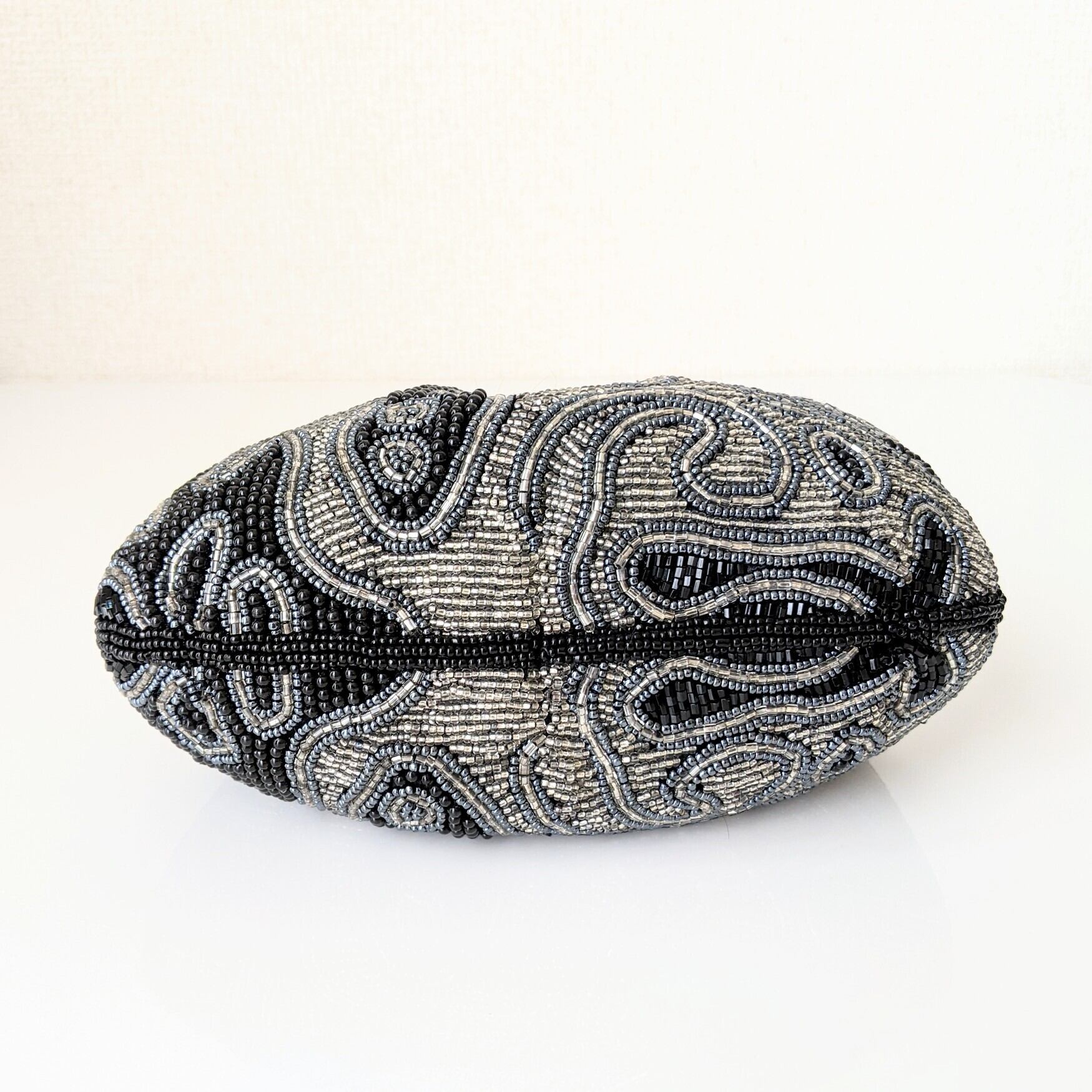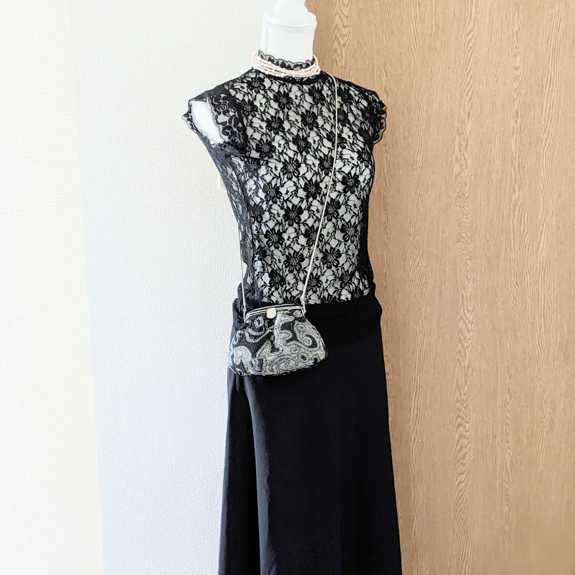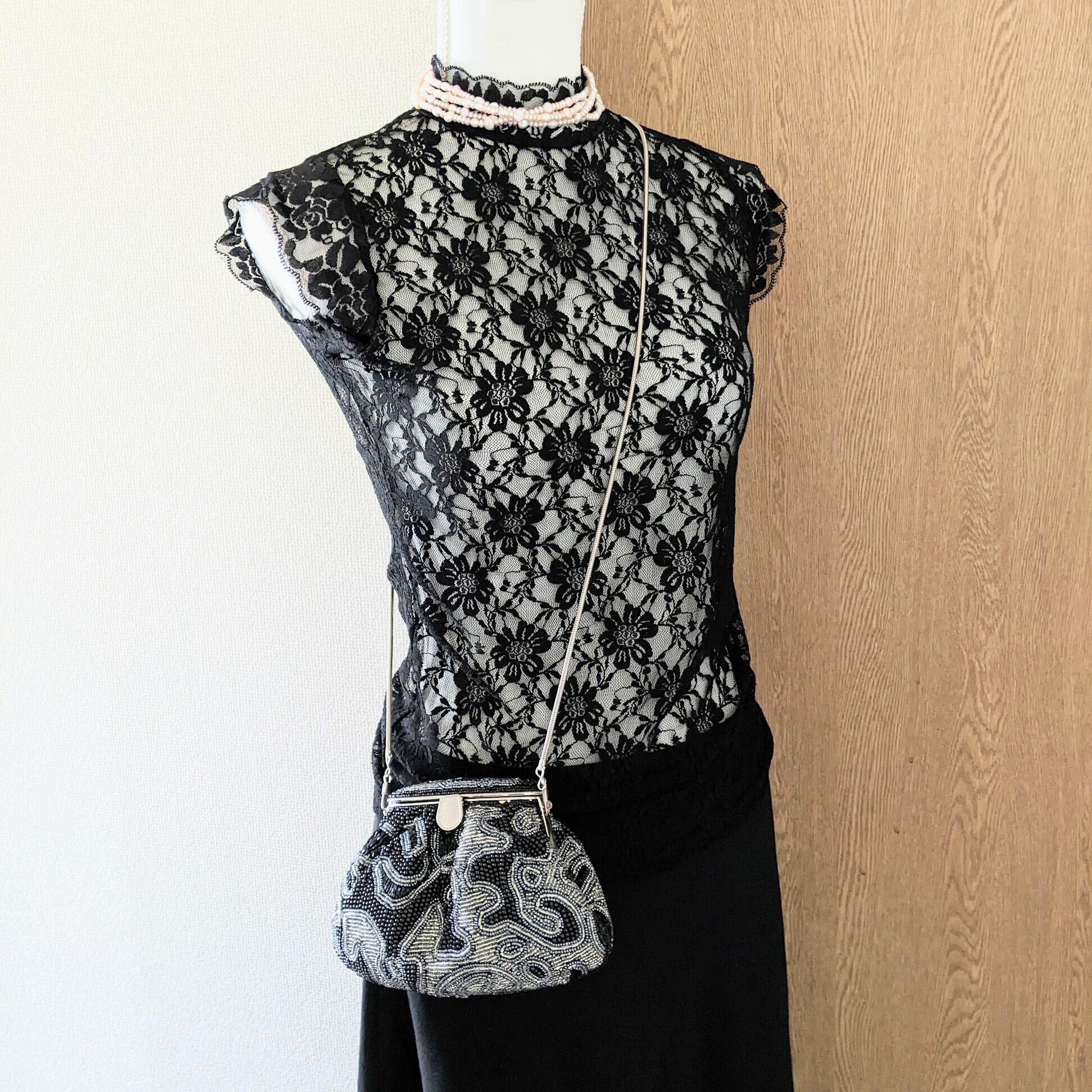 カラフルな色使いが多くみられる蓋つきビーズバッグですが、こちらは黒とシルバーのとてもシックなデザイン。ショルダータイプは、立食パーティといった動きまわる場では両手が塞がらずとても便利です。