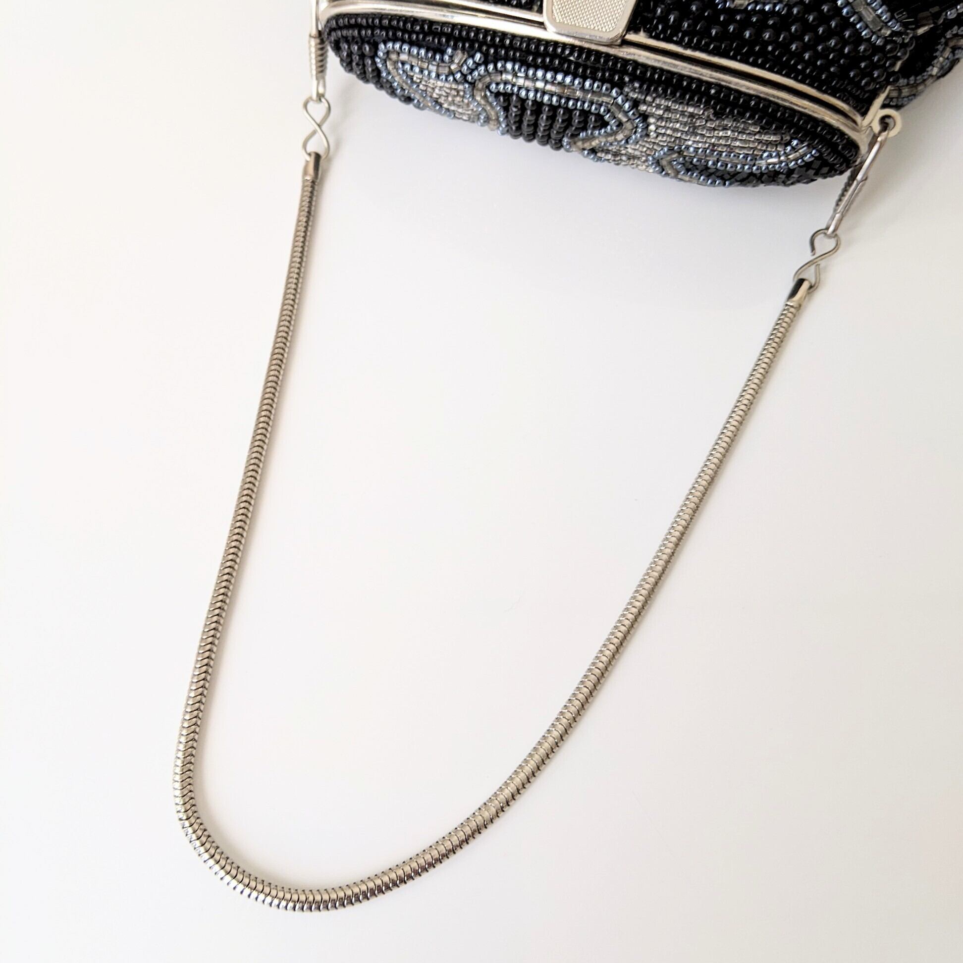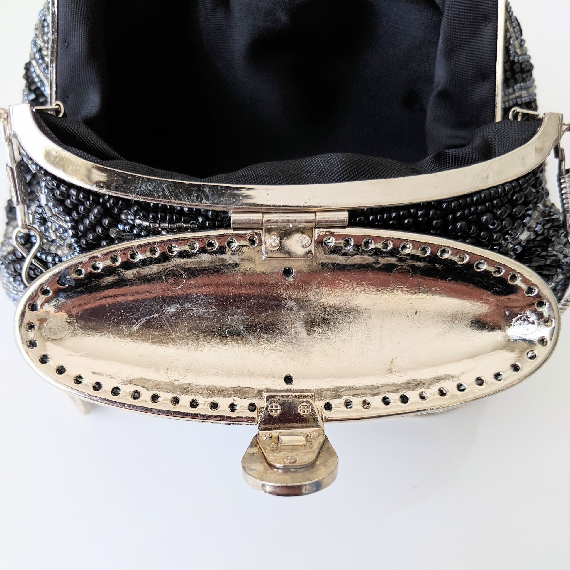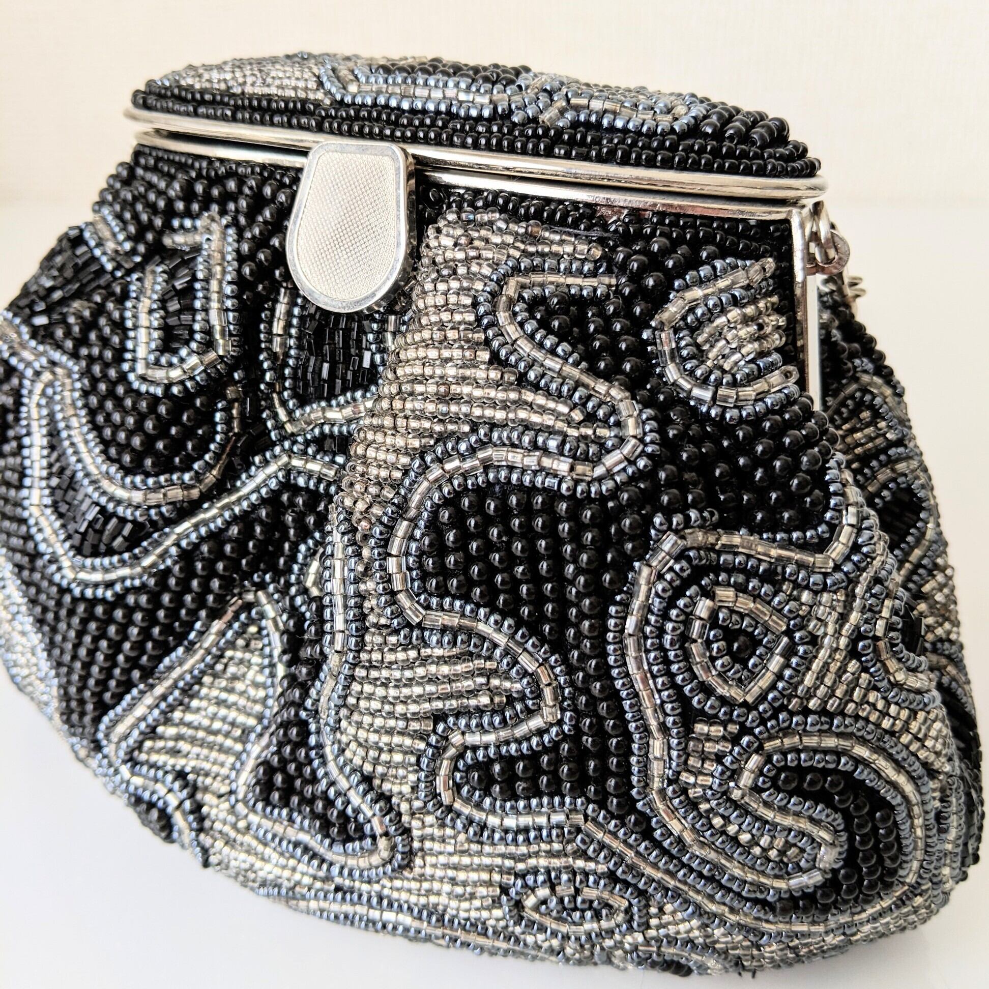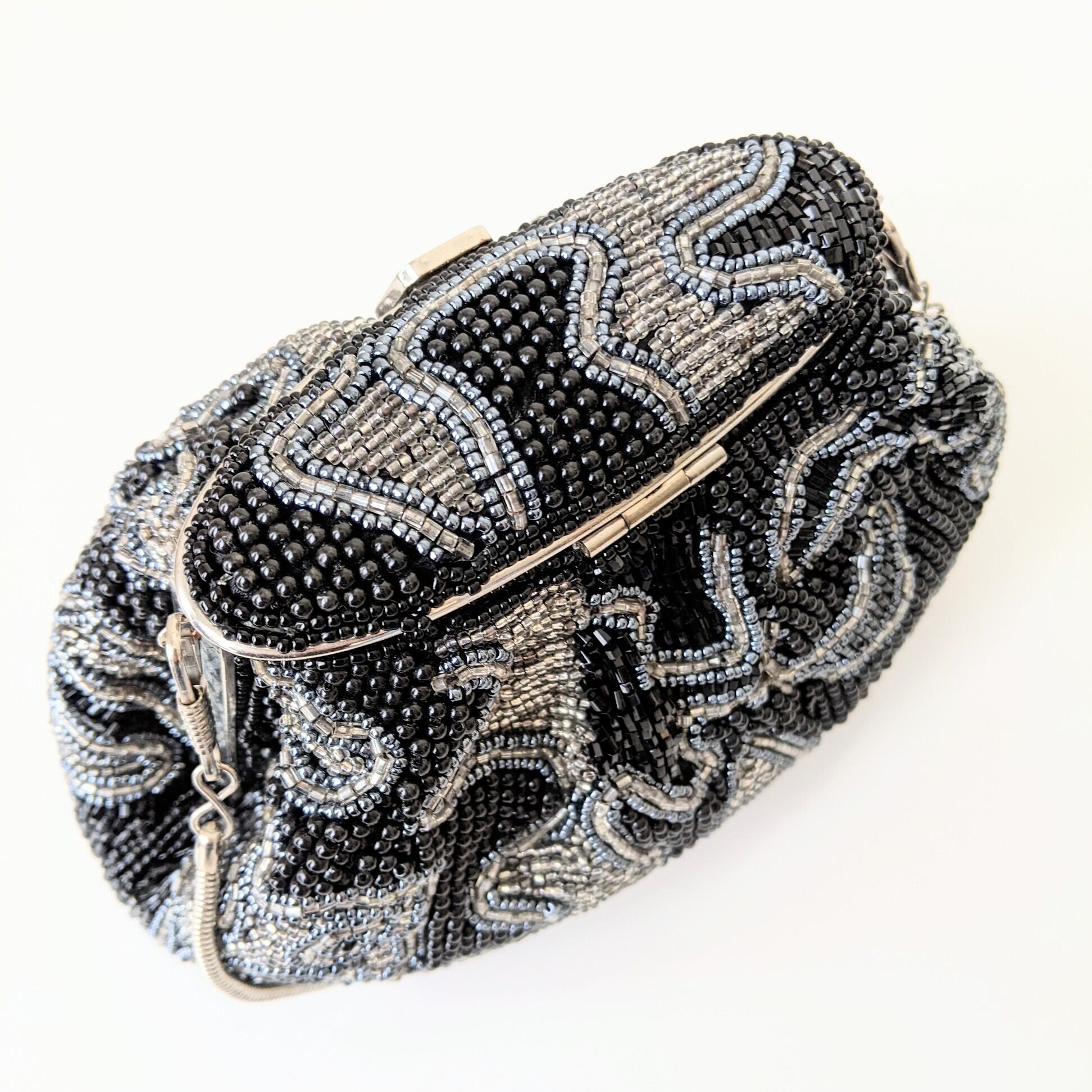カラフルな色使いが多くみられる蓋つきビーズバッグですが、こちらは黒とシルバーのとてもシックなデザイン。ショルダータイプは、立食パーティといった動きまわる場では両手が塞がらずとても便利です。