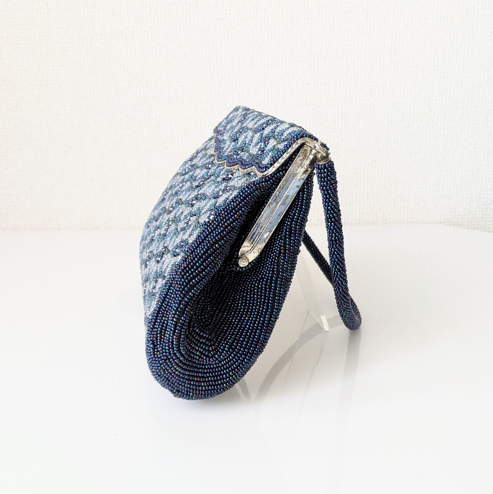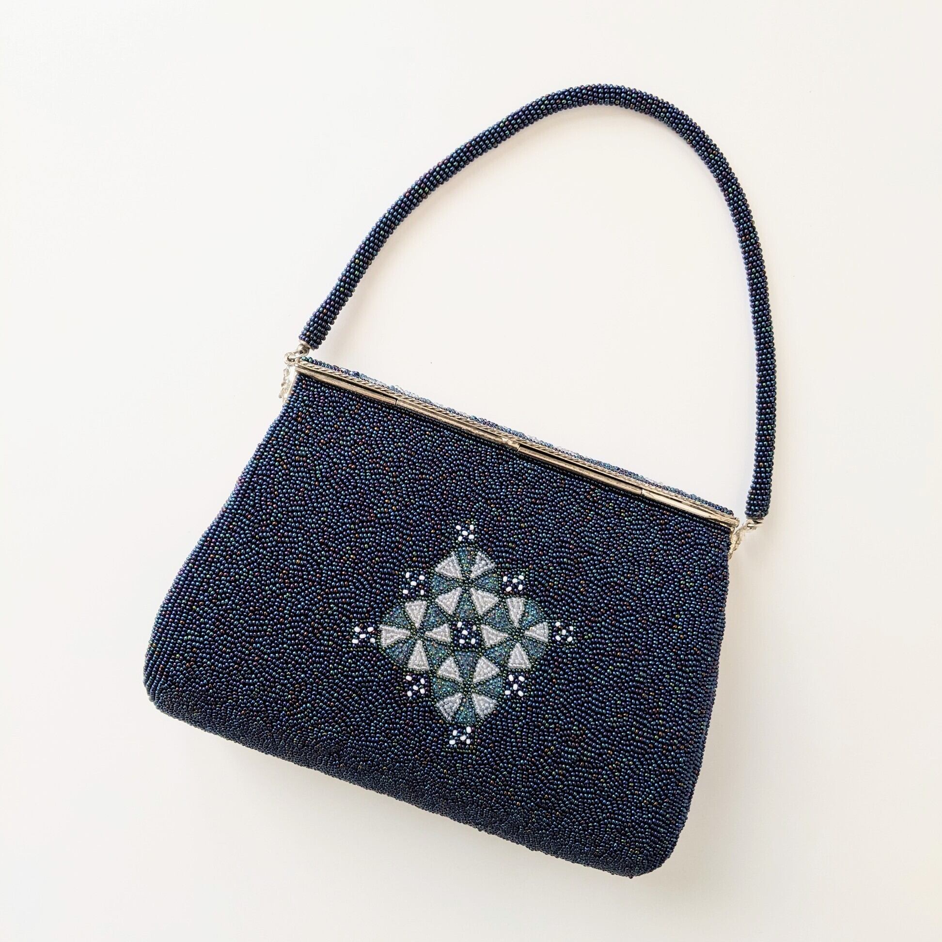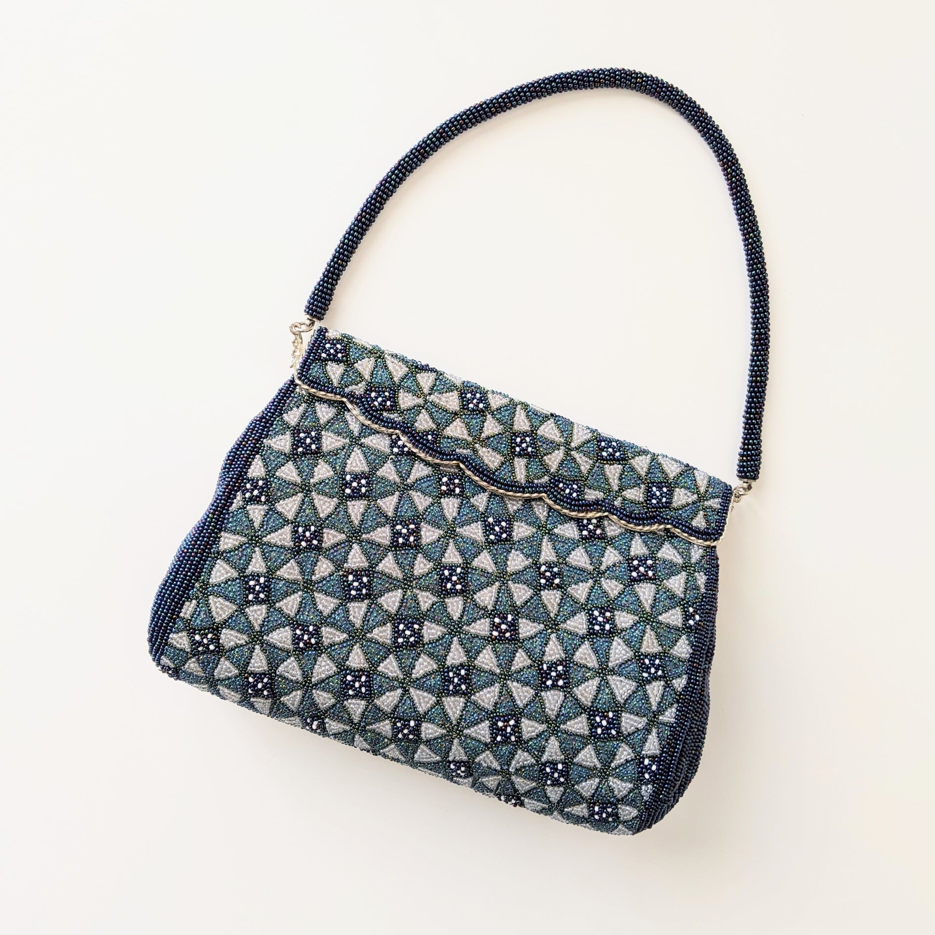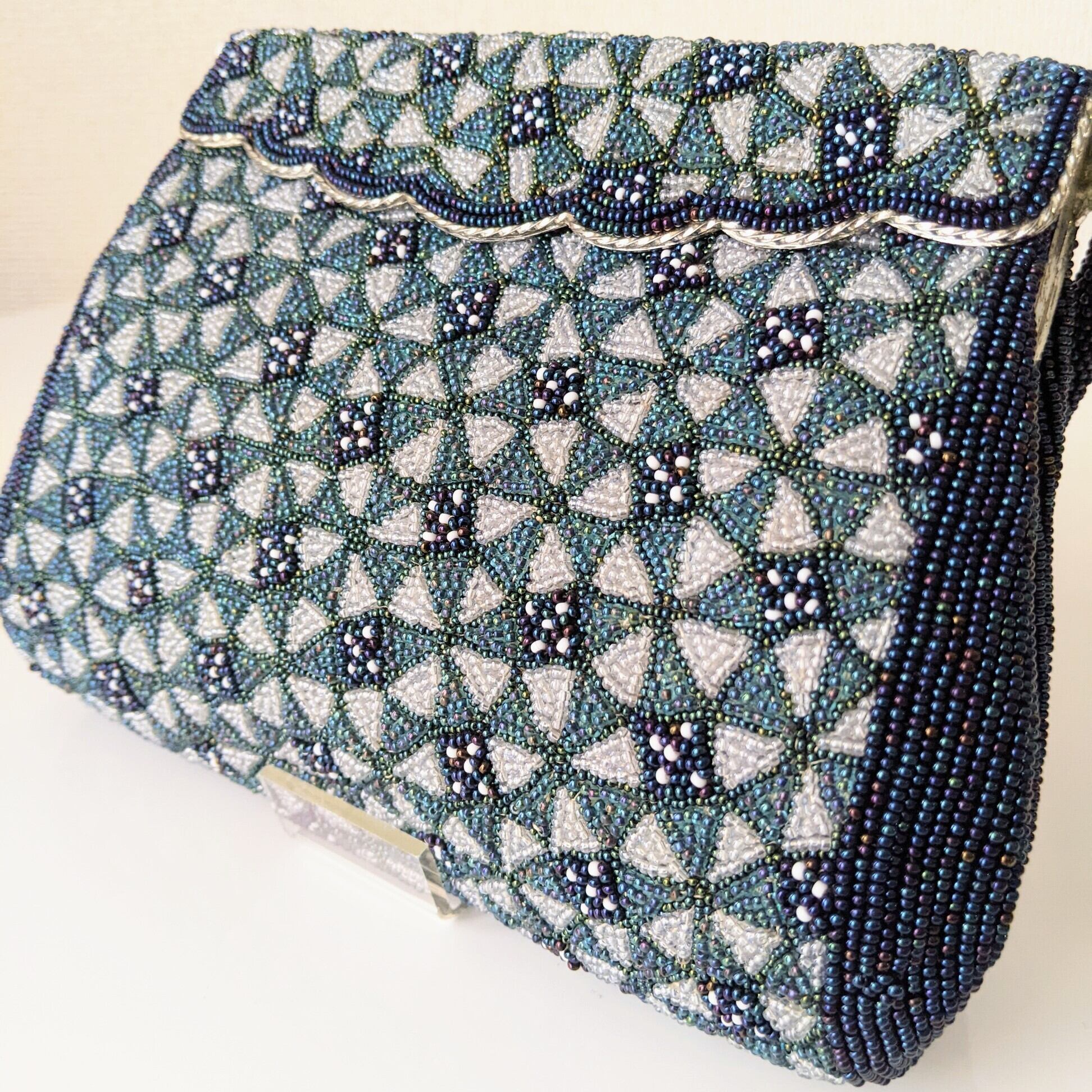 【Vintage】ビーズ刺繍バッグ Vintage Beaded Evening Bag パーティーバッグ フラップスタイル 青 Blue 七宝文様 幾何学模様 スカラップ 昭和レトロ 大正浪漫 フォーマルバッグ