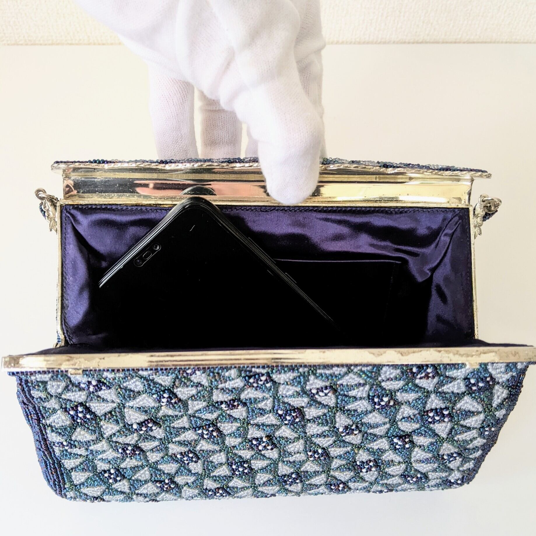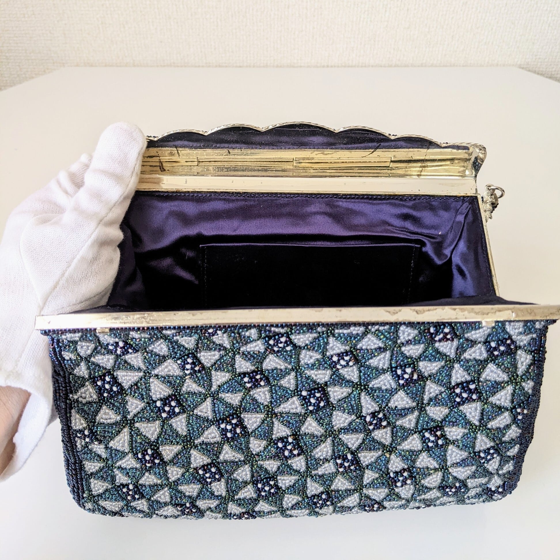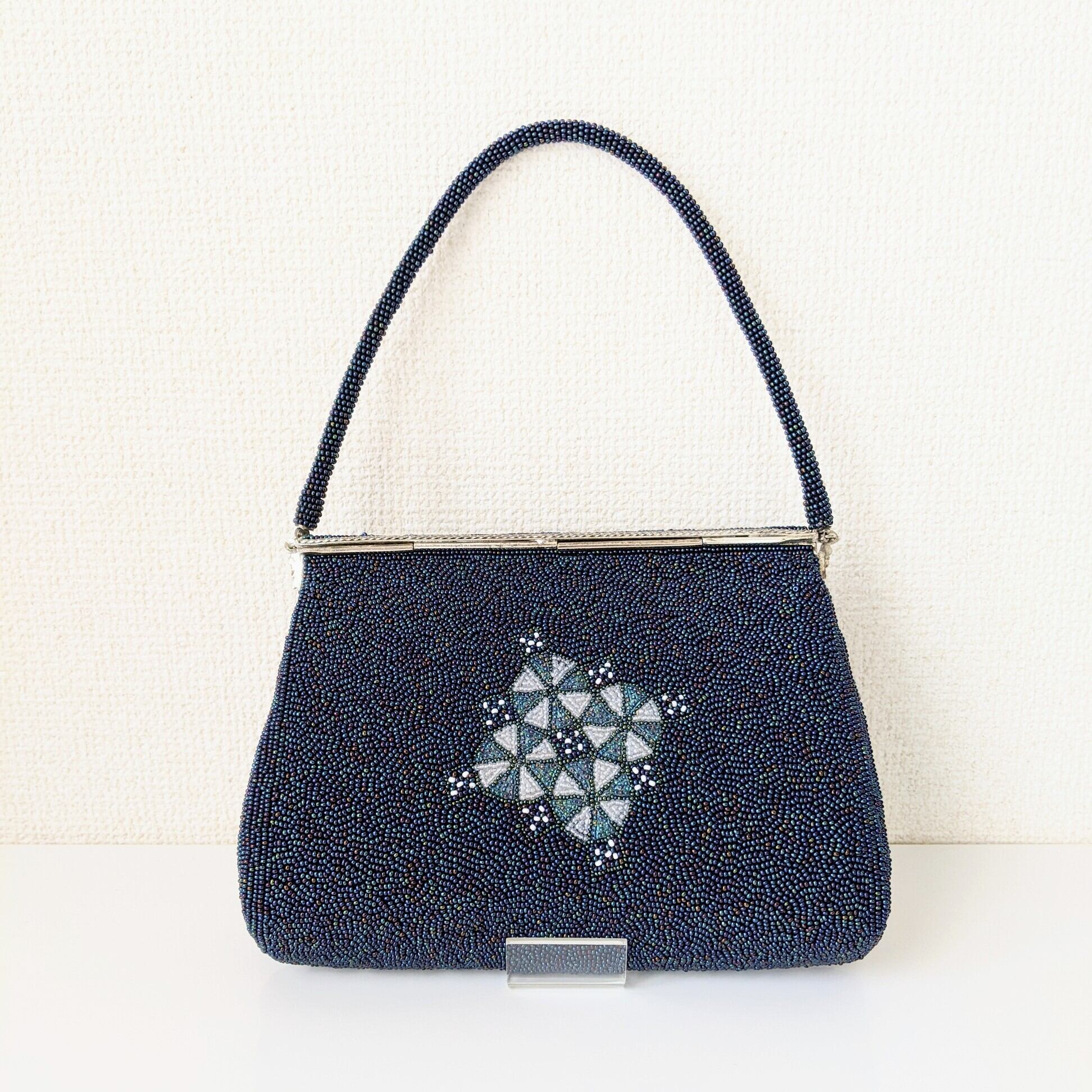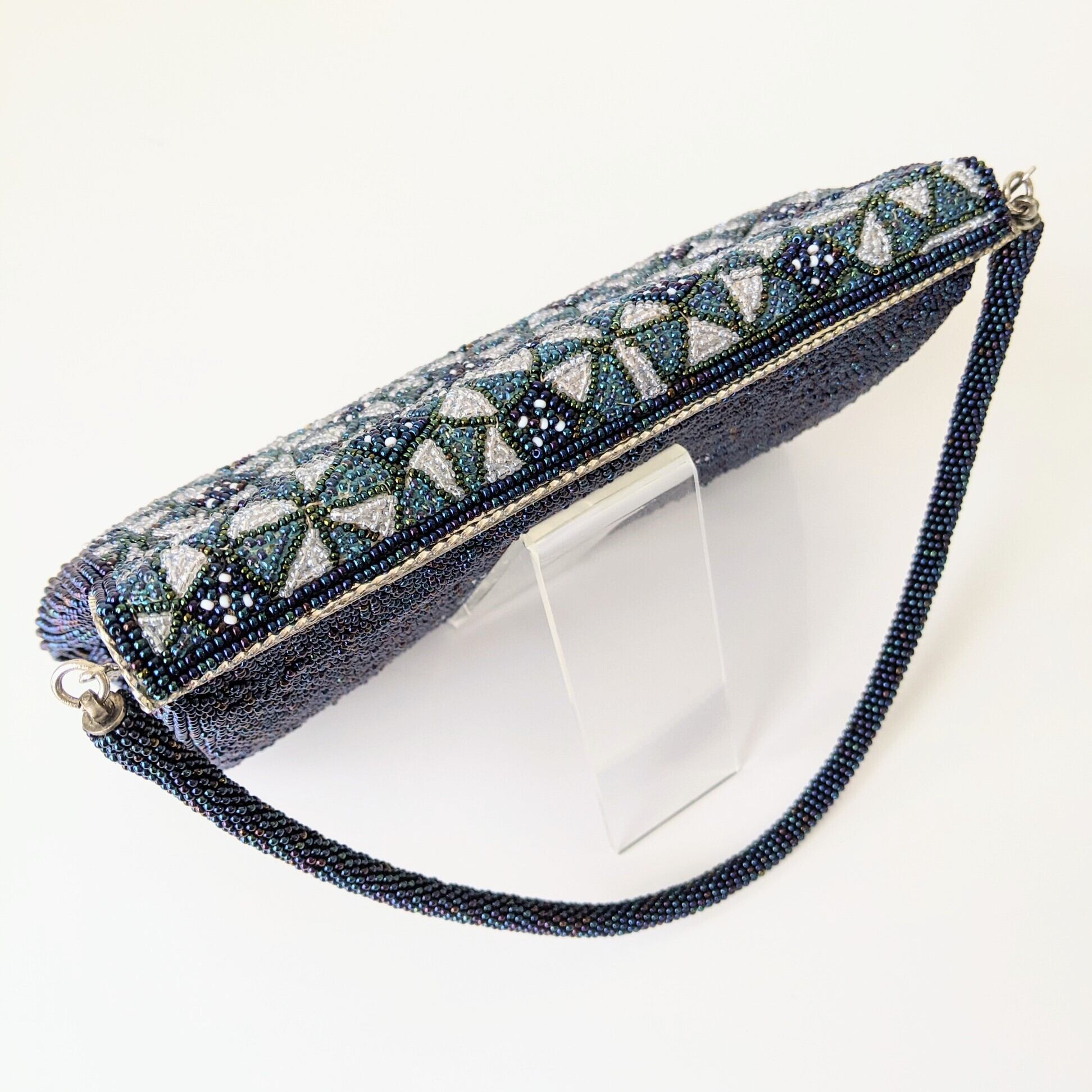 【Vintage】ビーズ刺繍バッグ Vintage Beaded Evening Bag パーティーバッグ フラップスタイル 青 Blue 七宝文様 幾何学模様 スカラップ 昭和レトロ 大正浪漫 フォーマルバッグ