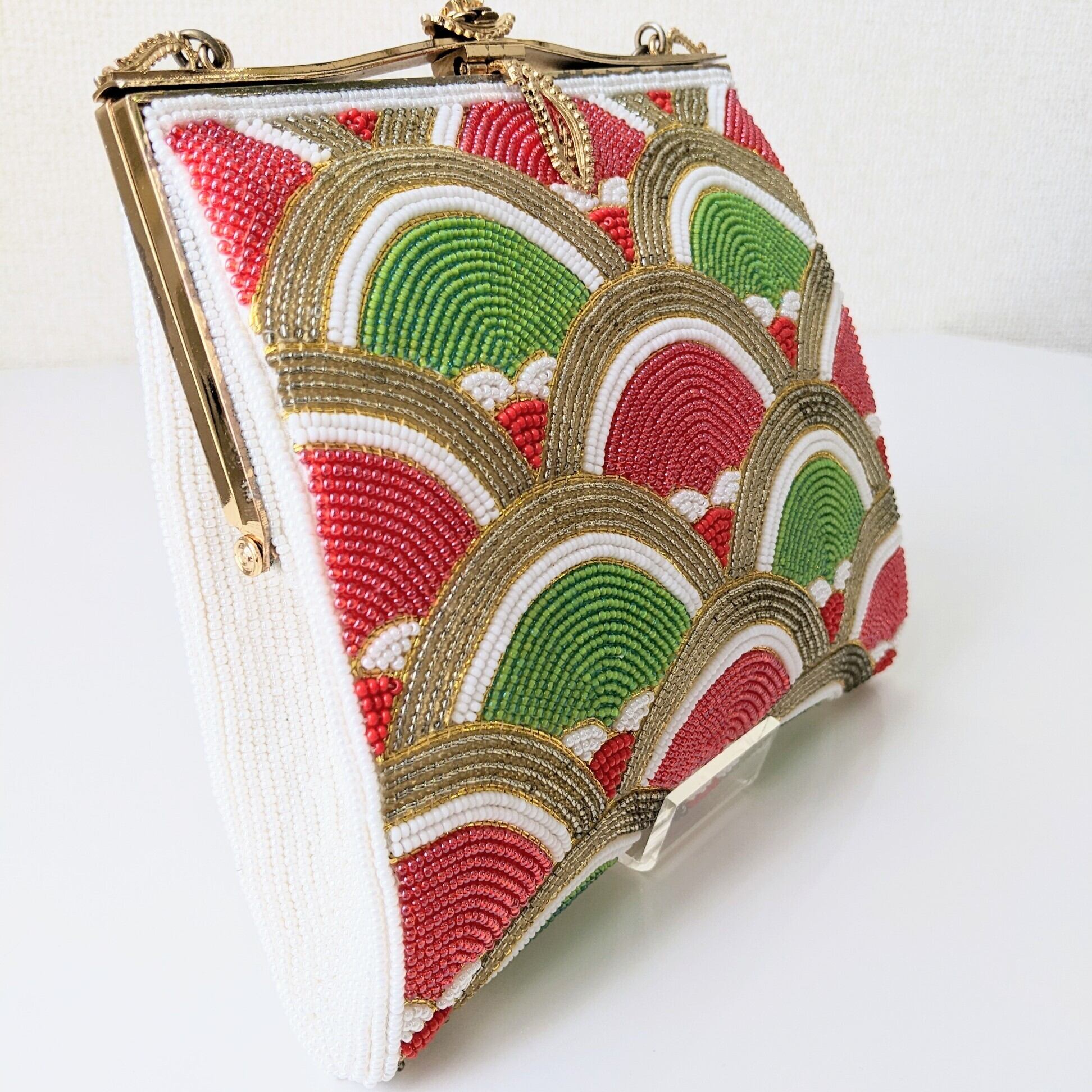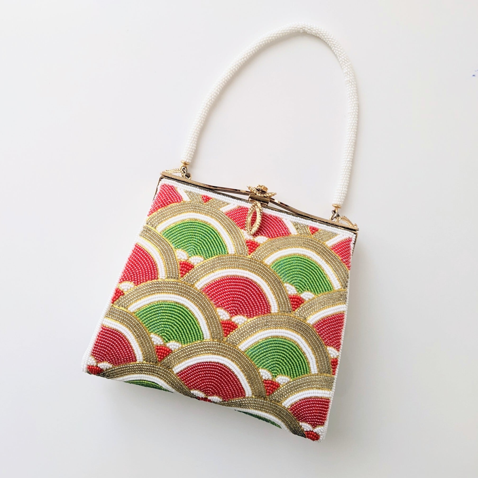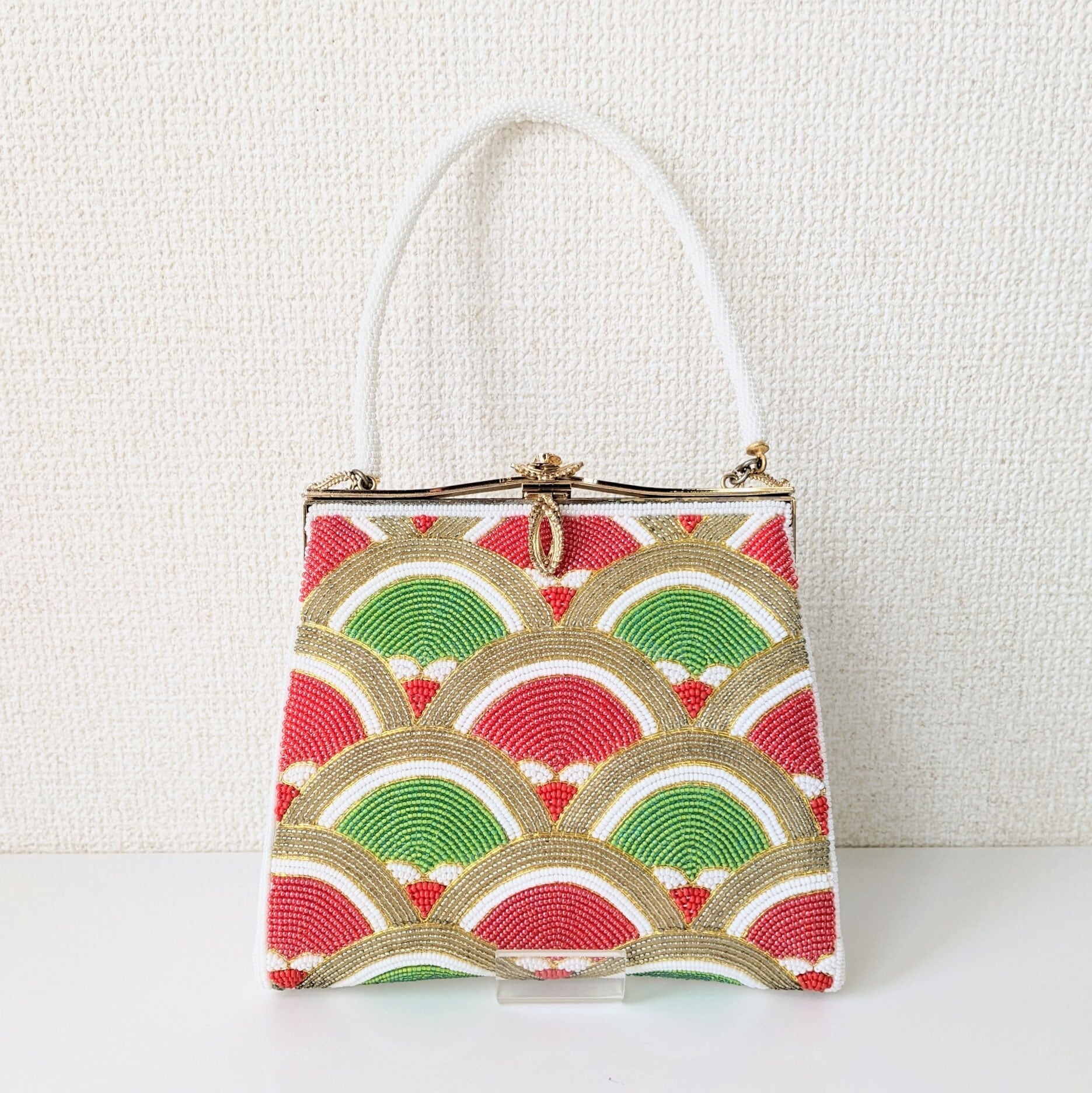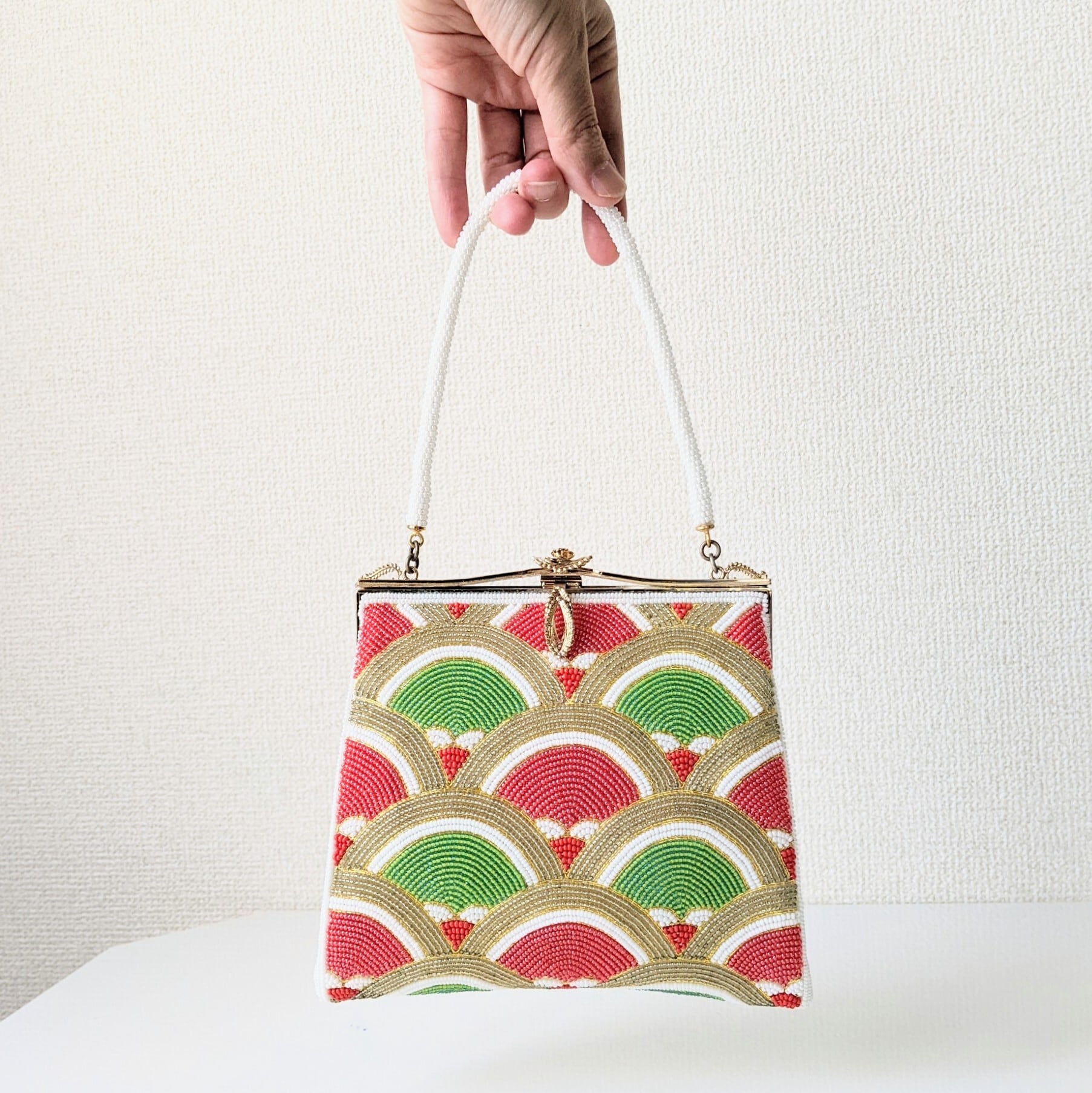 赤、緑、金色に、青海波文様といったとてもゴージャスでお目出たい雰囲気が満載なビーズバッグです。
