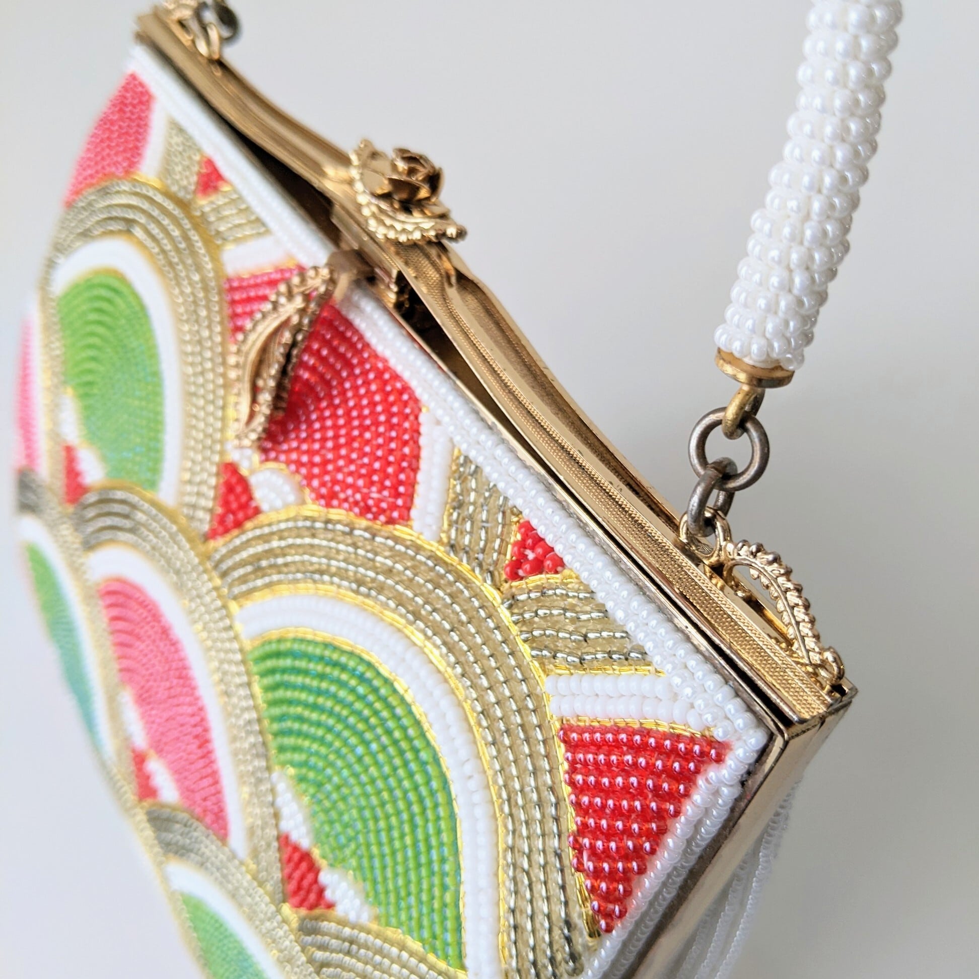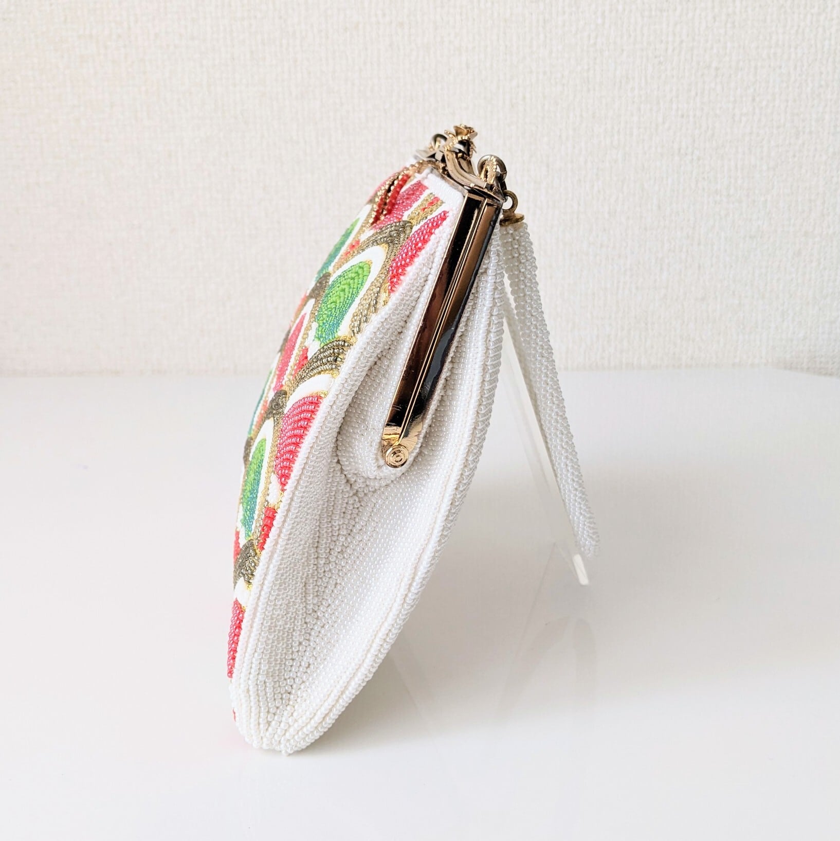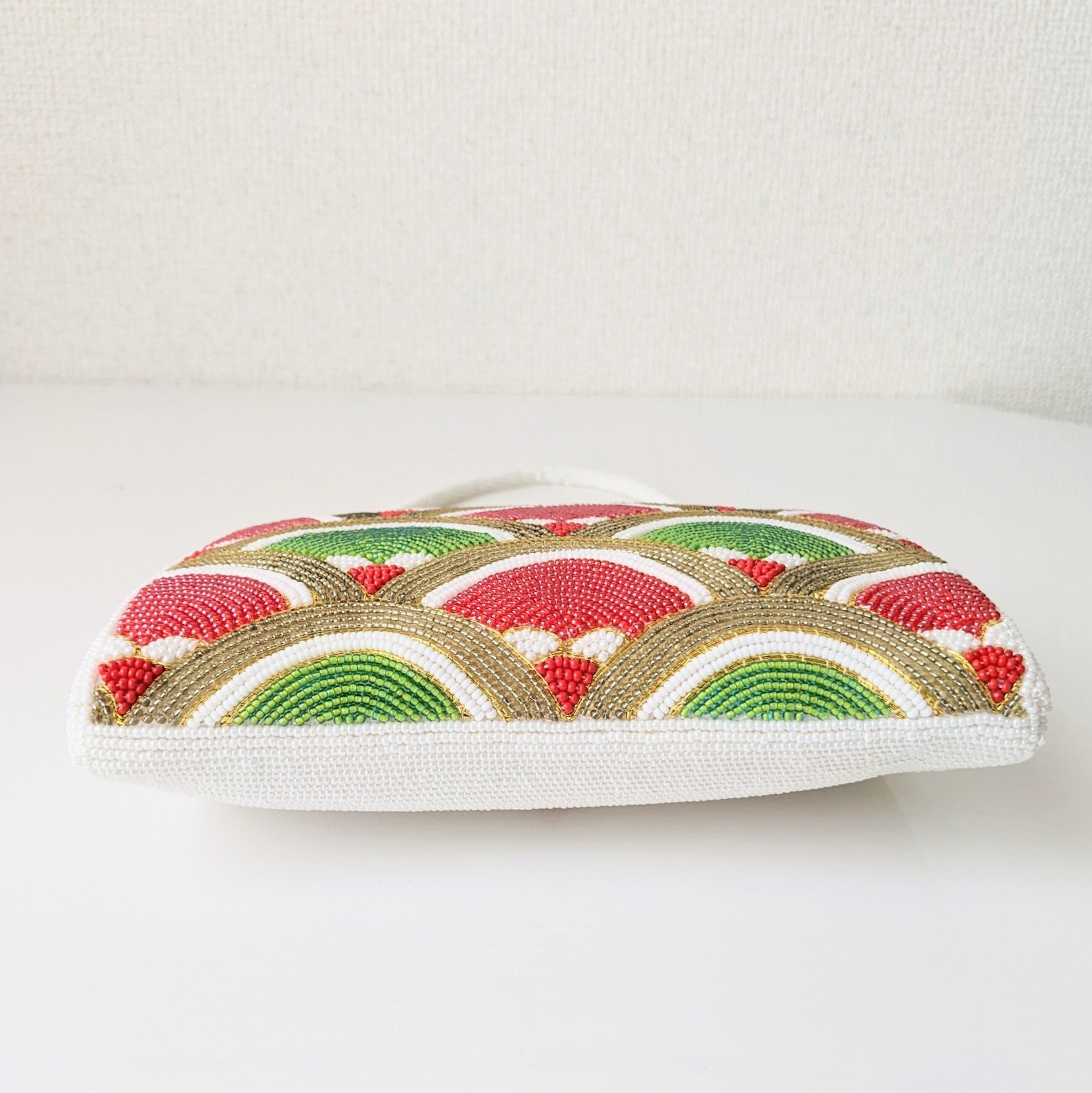 赤、緑、金色に、青海波文様といったとてもゴージャスでお目出たい雰囲気が満載なビーズバッグです。