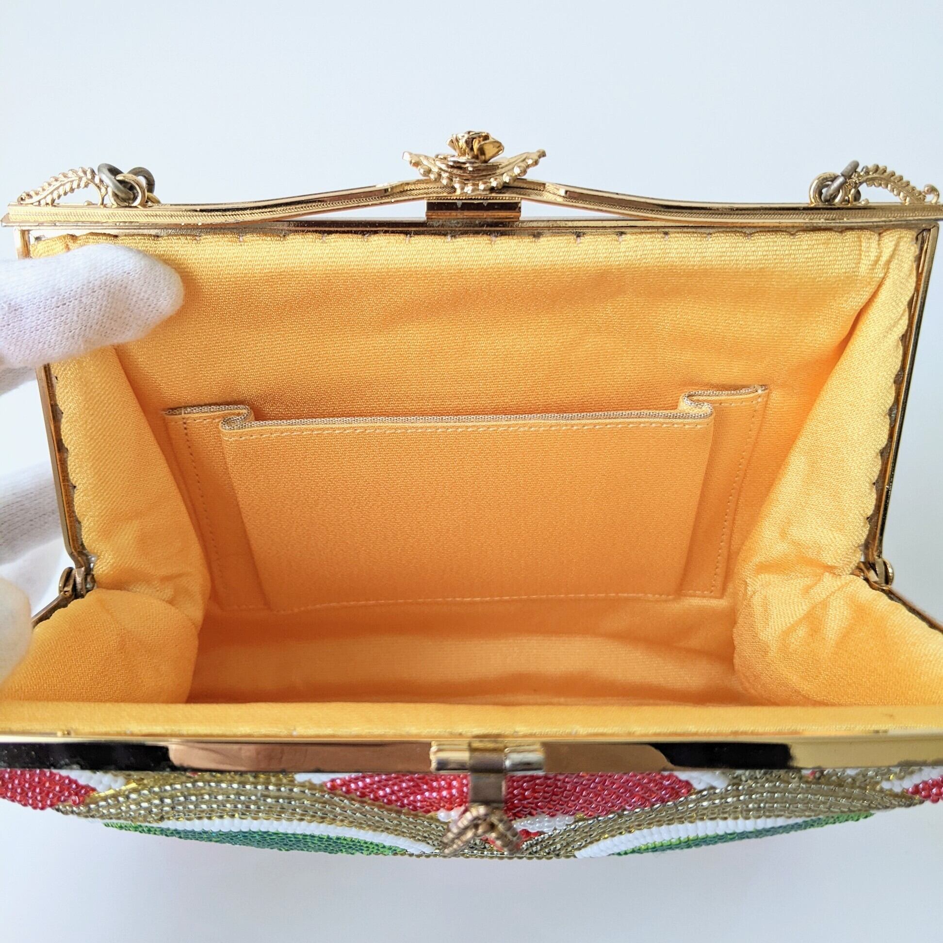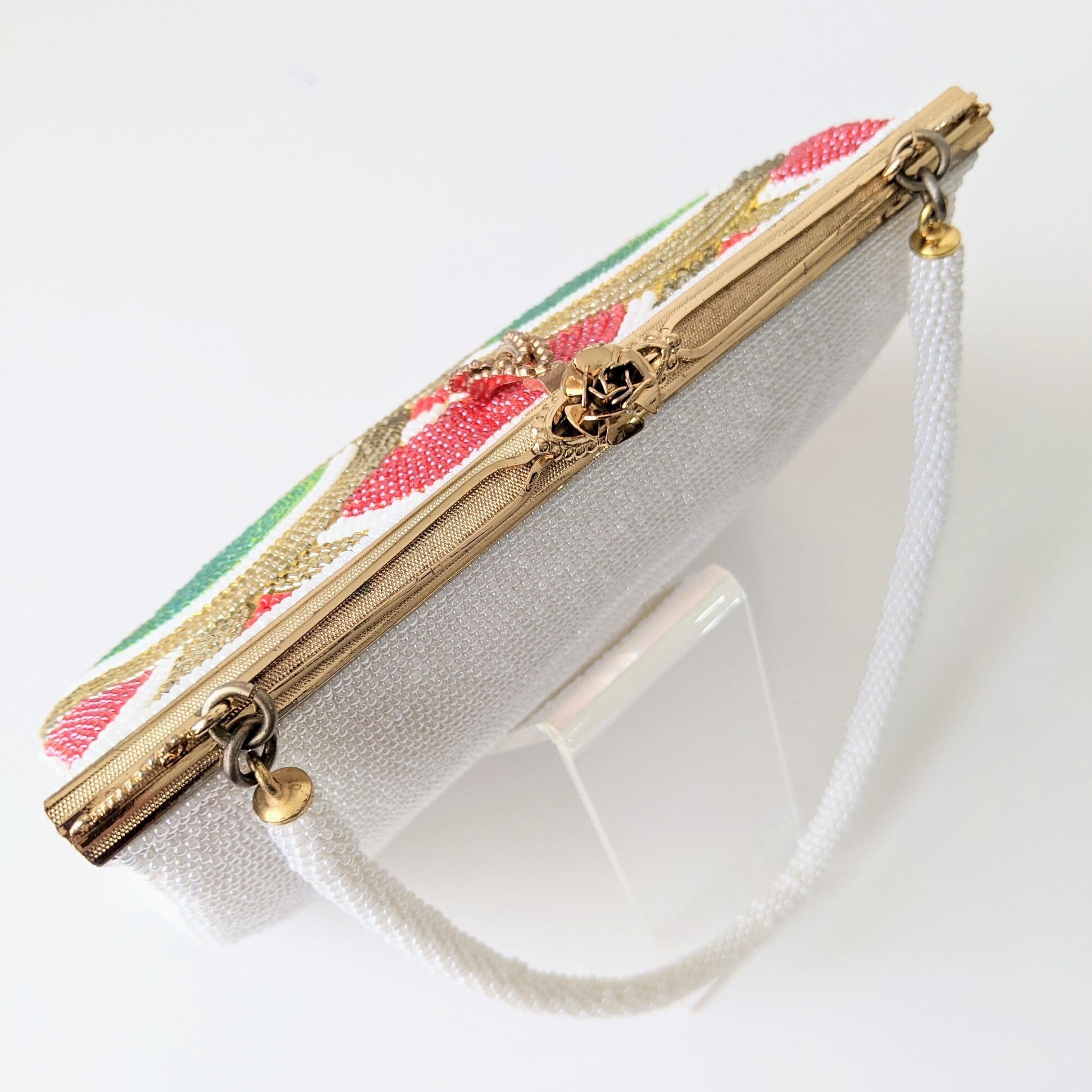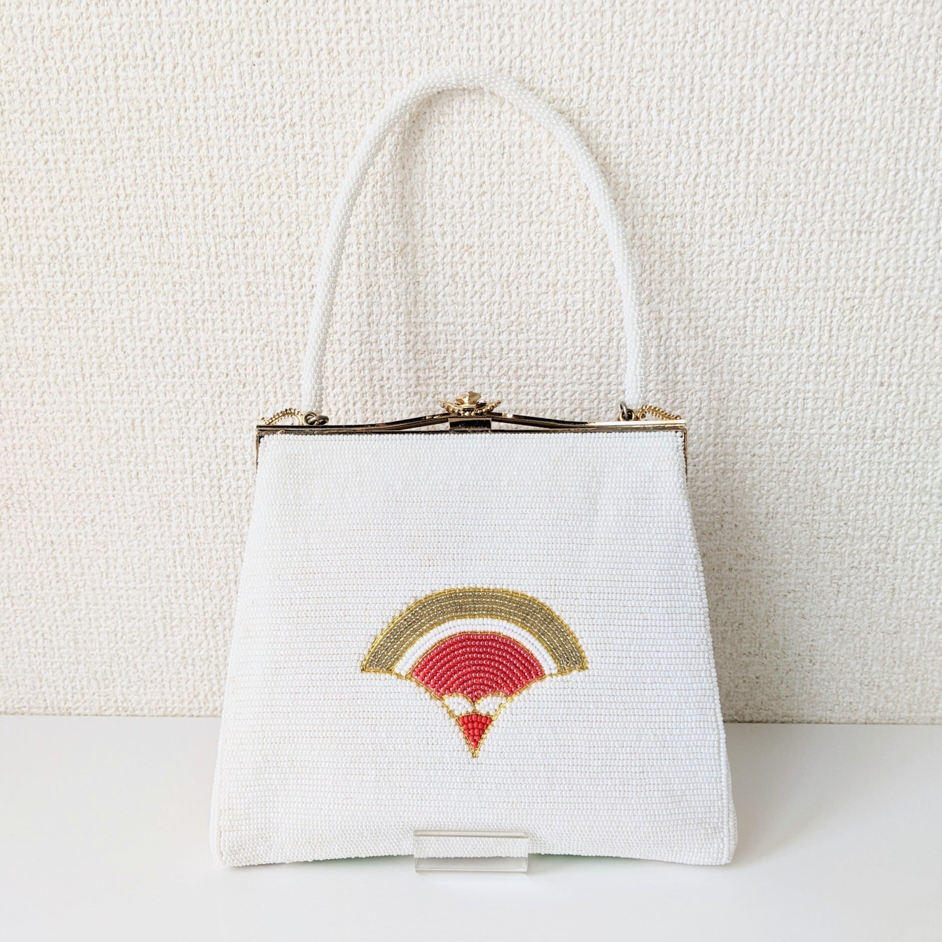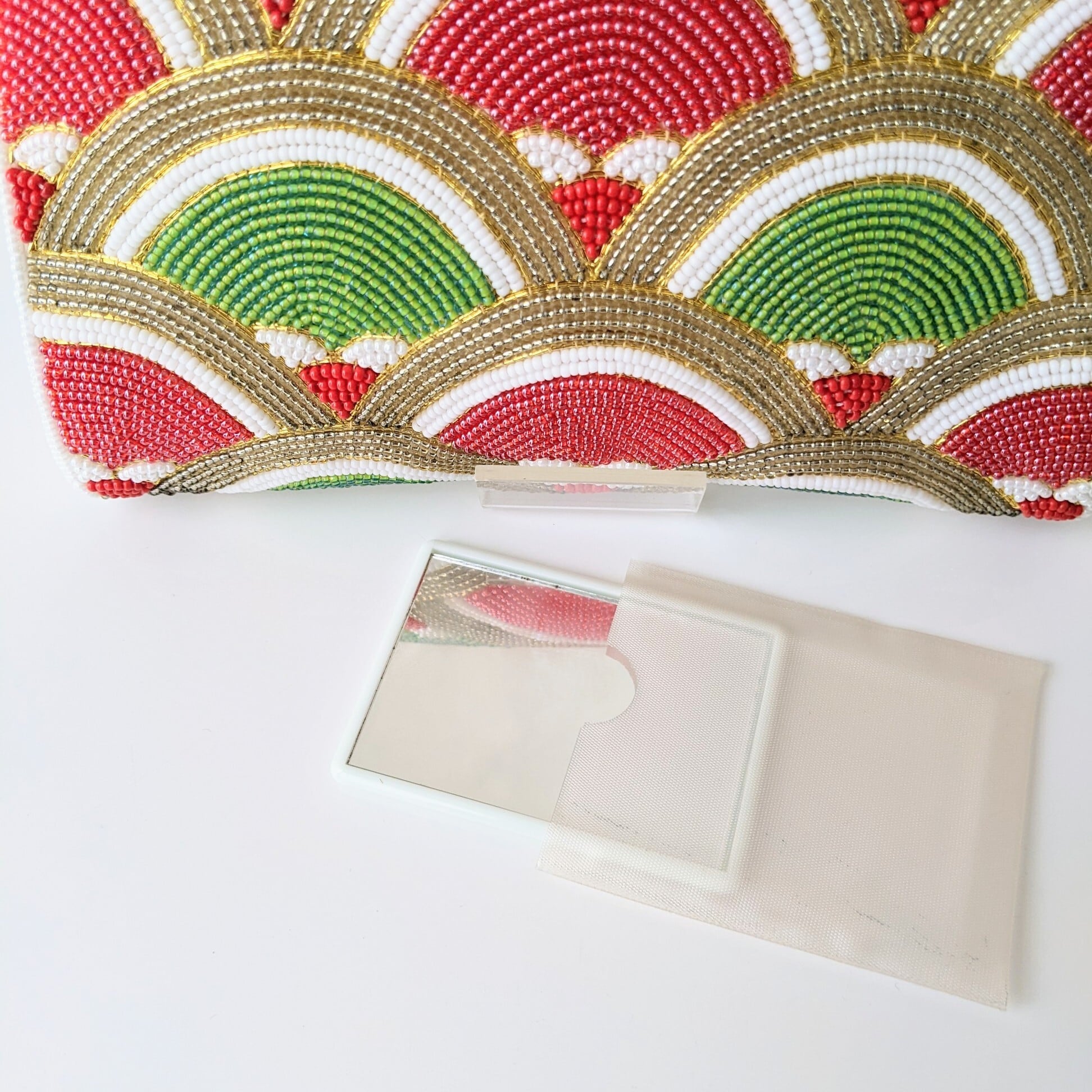 赤、緑、金色に、青海波文様といったとてもゴージャスでお目出たい雰囲気が満載なビーズバッグです。