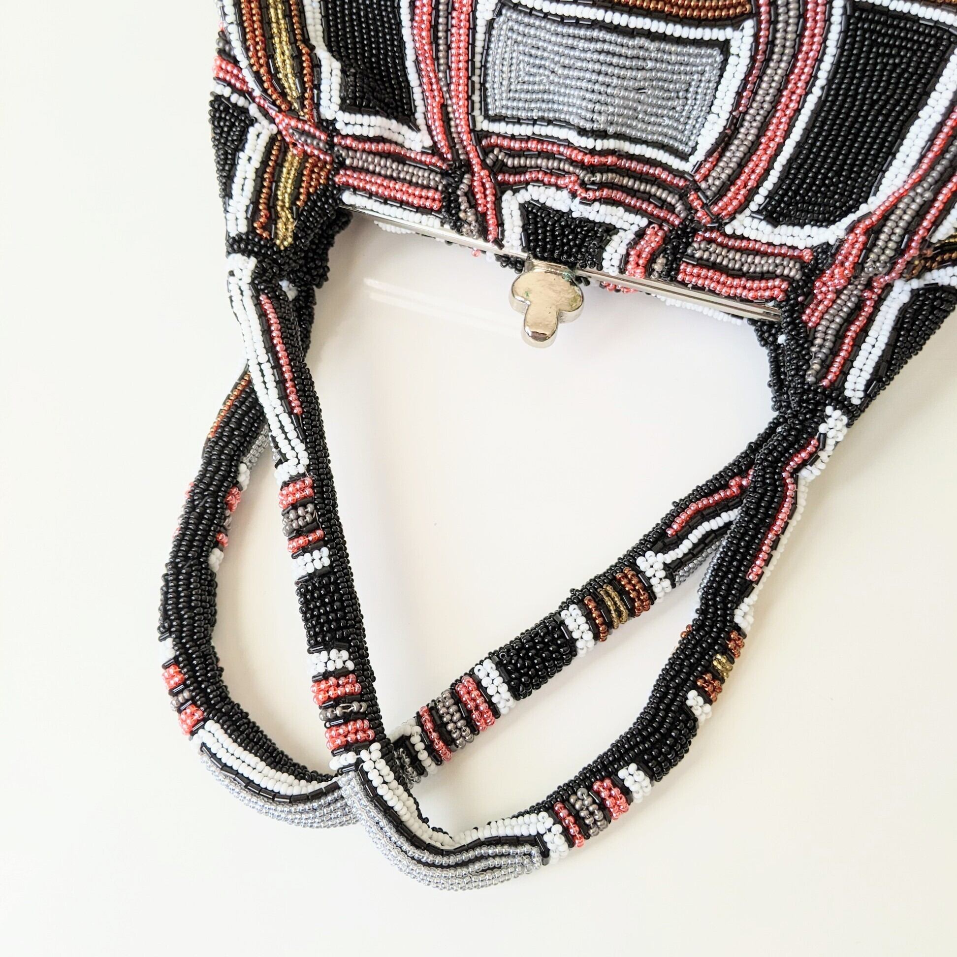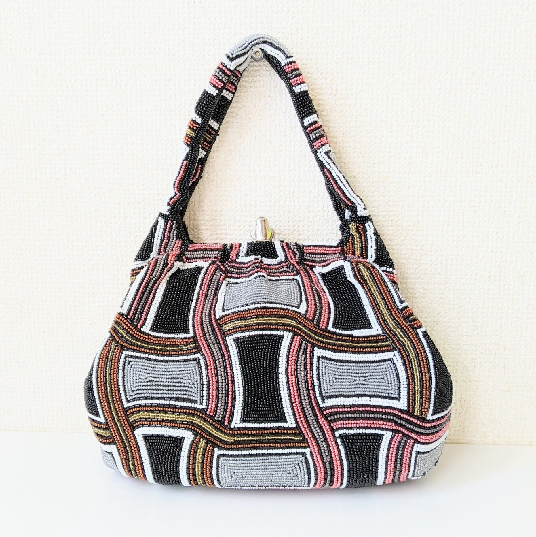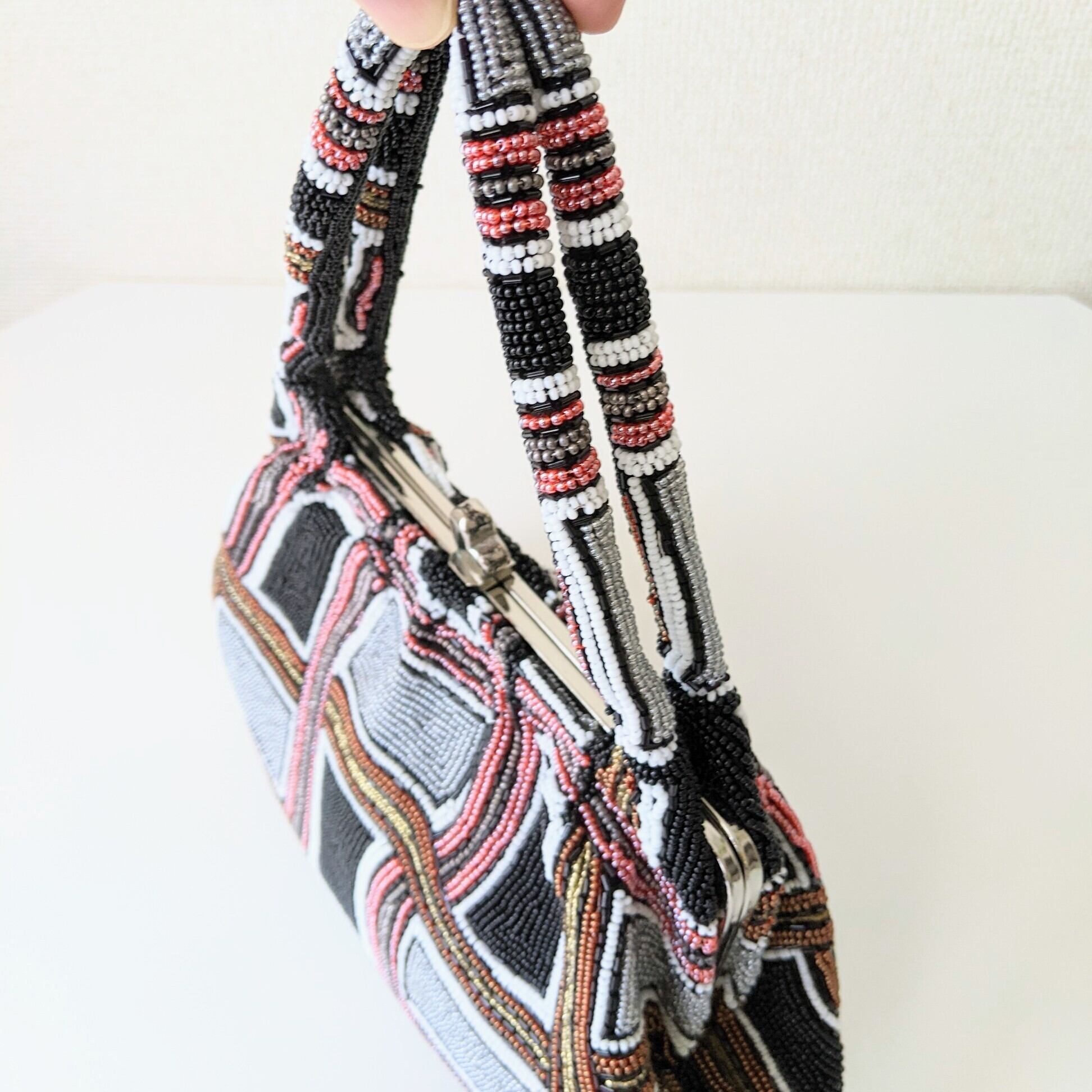 【Vintage】 ビーズ刺繍バッグ Vintage Beaded Evening Bag 赤×黒×グレー 分銅繋ぎ文様 昭和レトロ 大正浪漫 パーティーバッグ