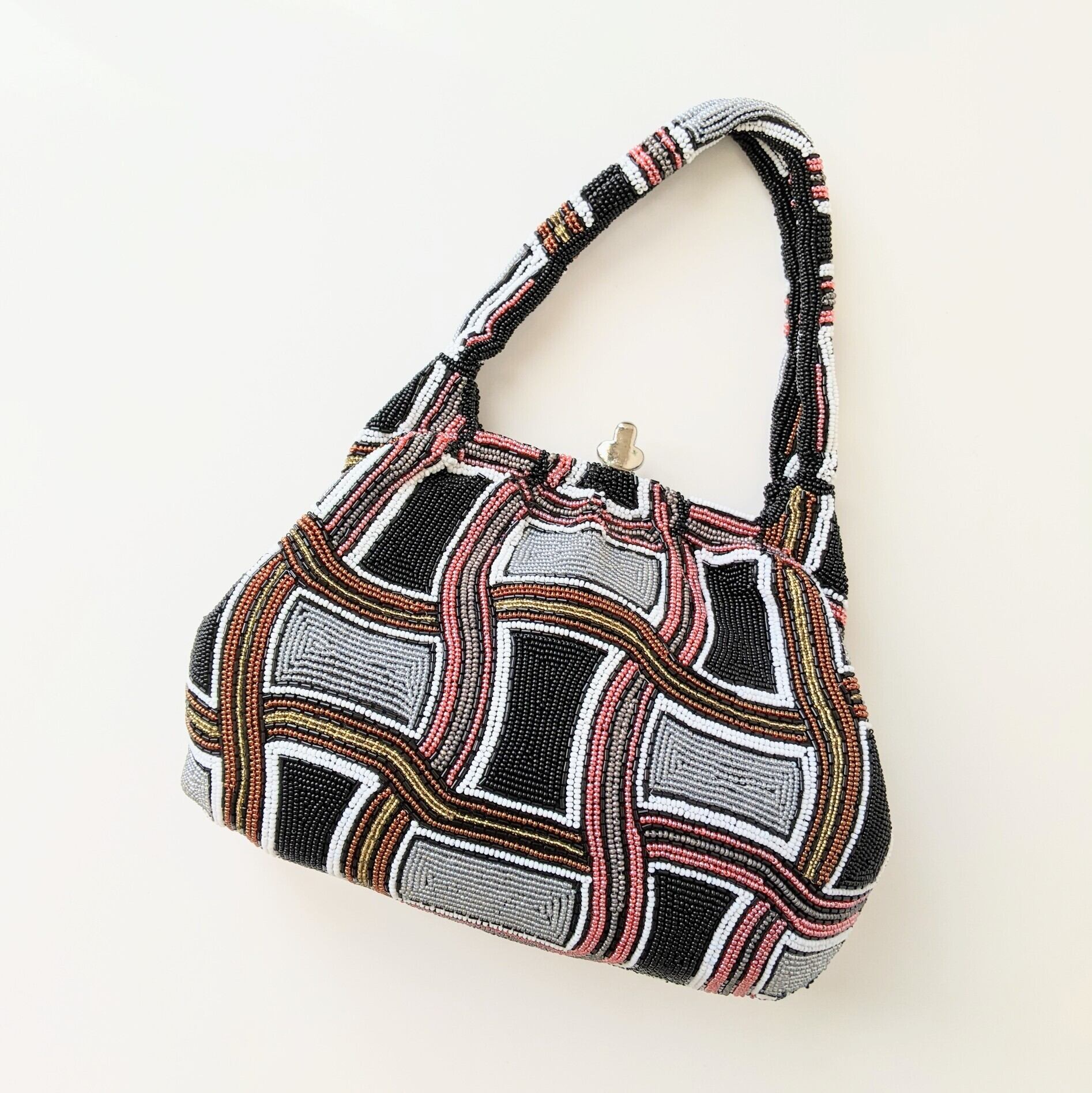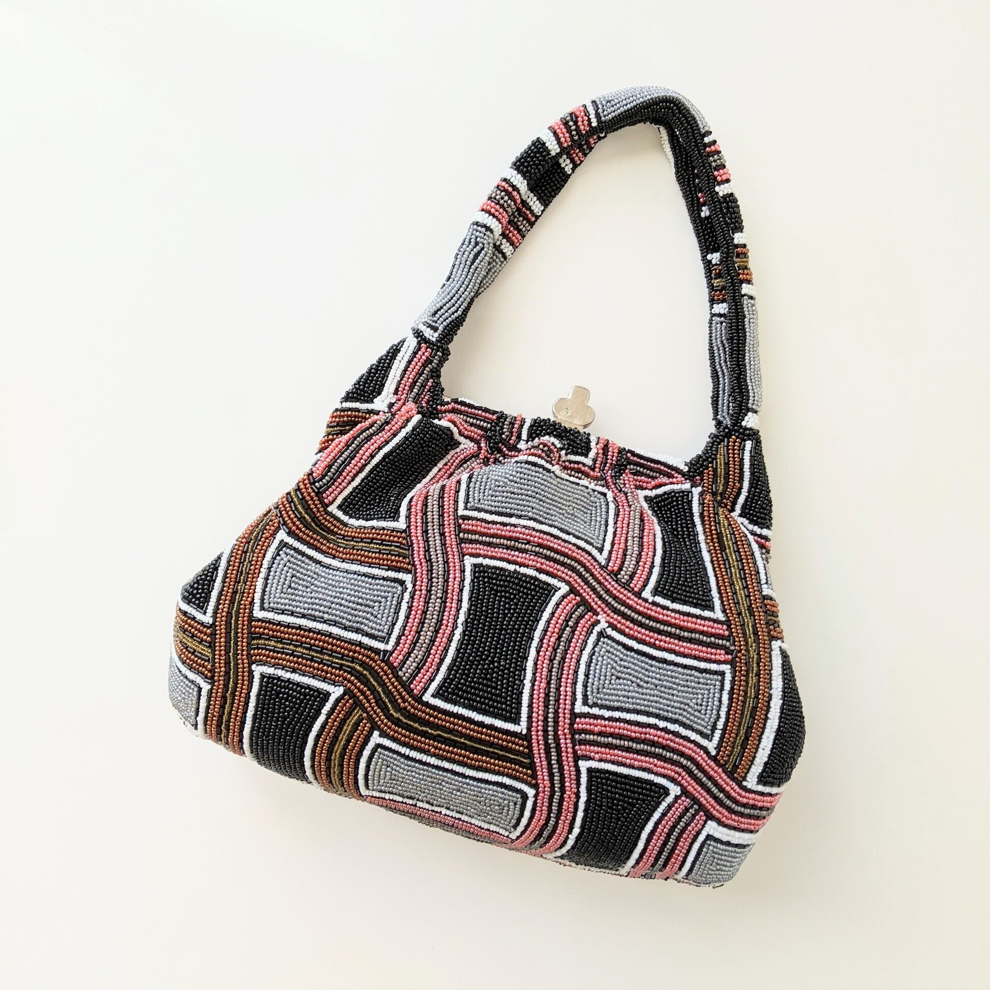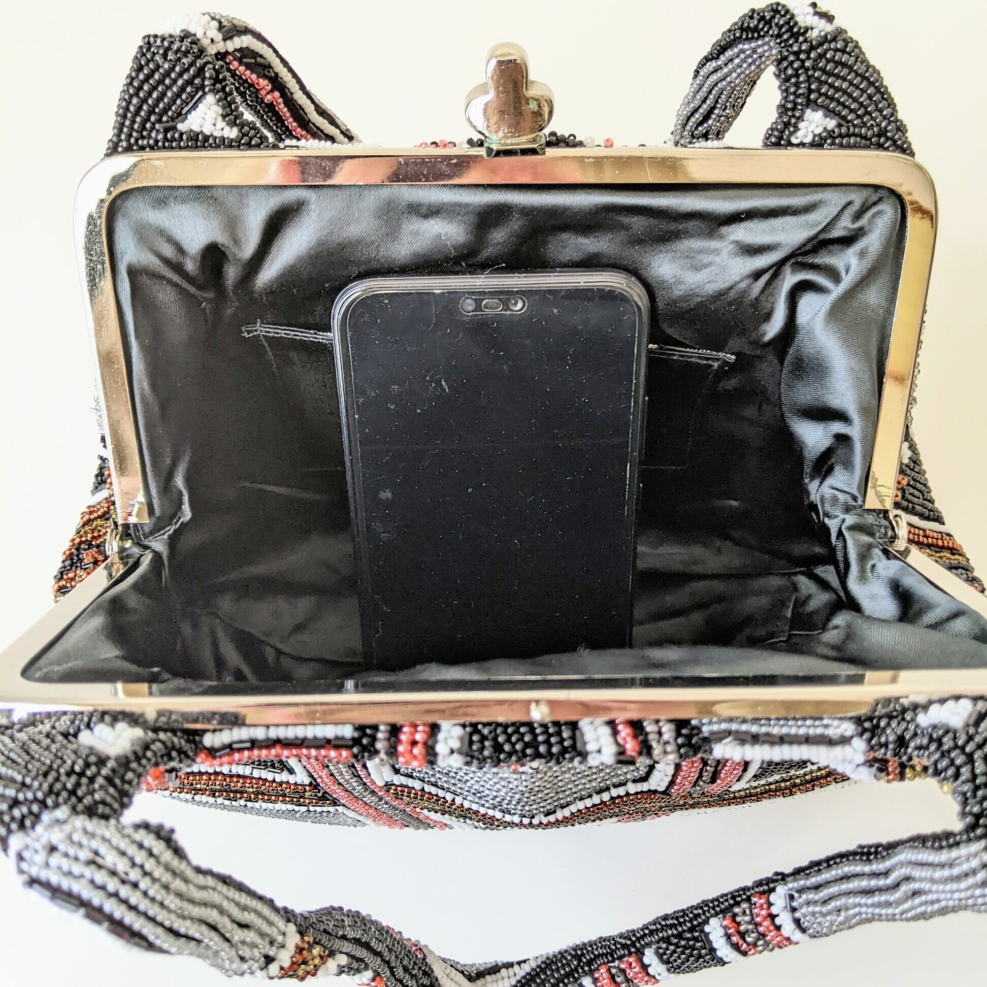 【Vintage】 ビーズ刺繍バッグ Vintage Beaded Evening Bag 赤×黒×グレー 分銅繋ぎ文様 昭和レトロ 大正浪漫 パーティーバッグ