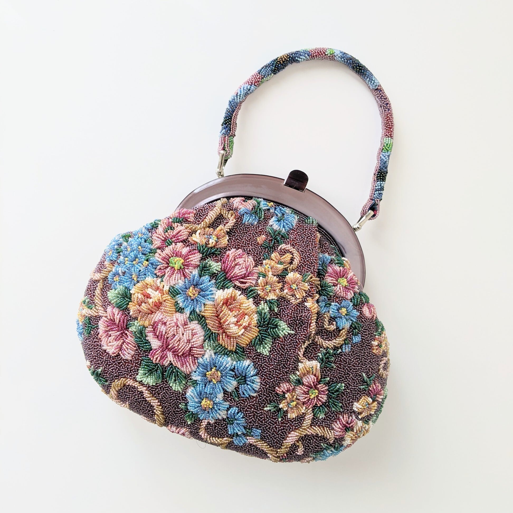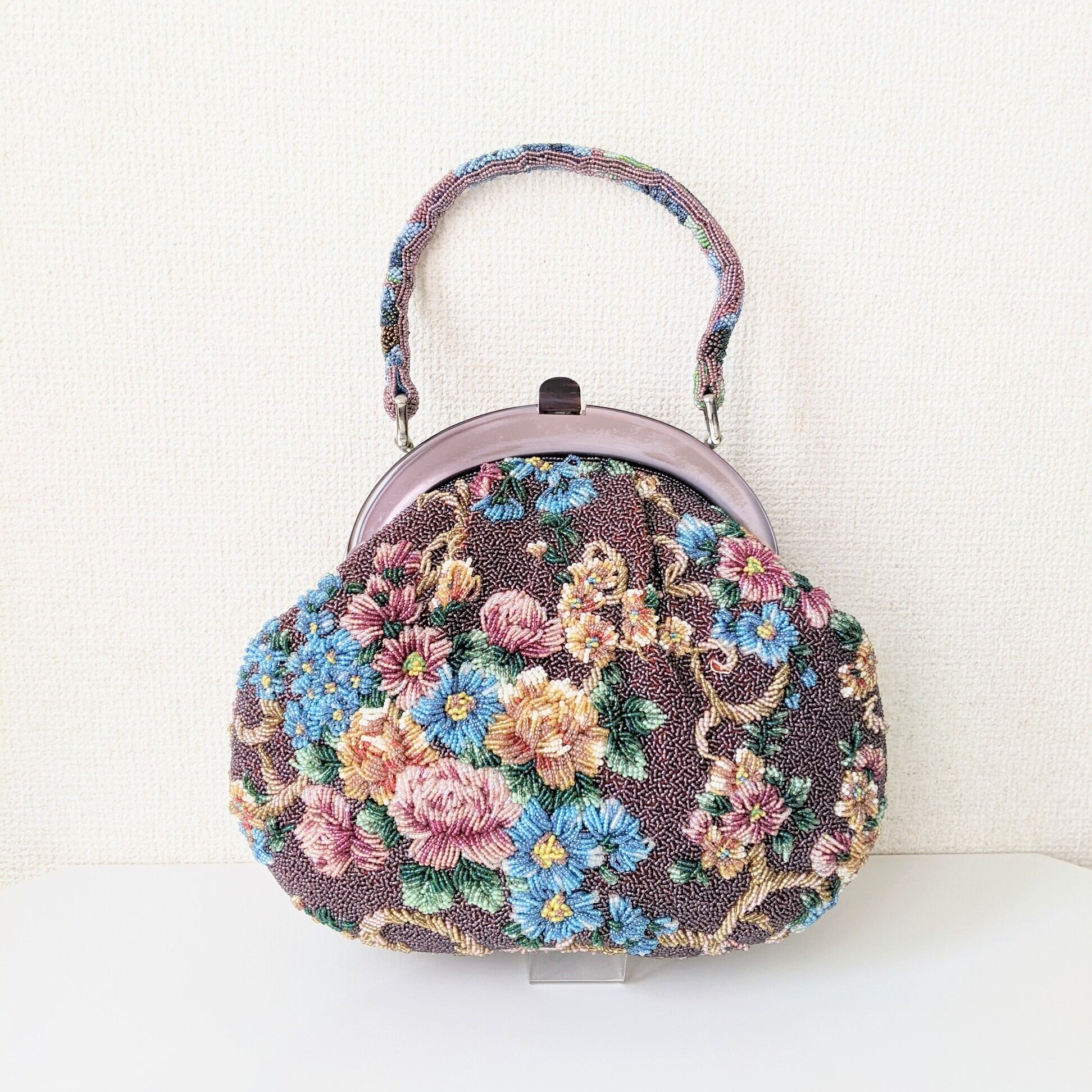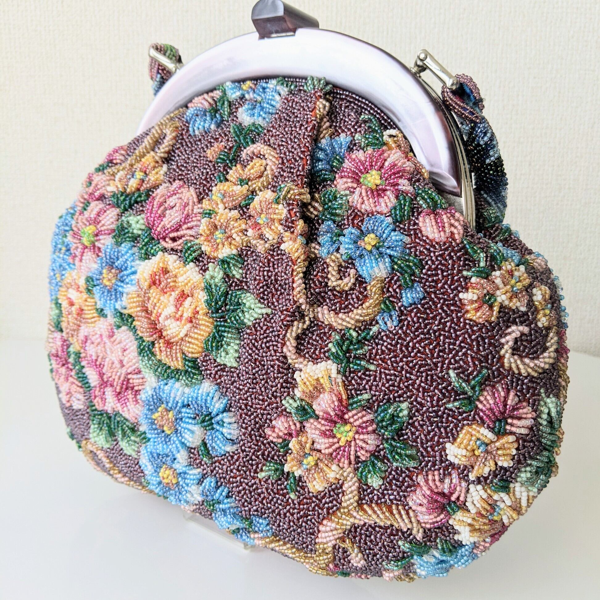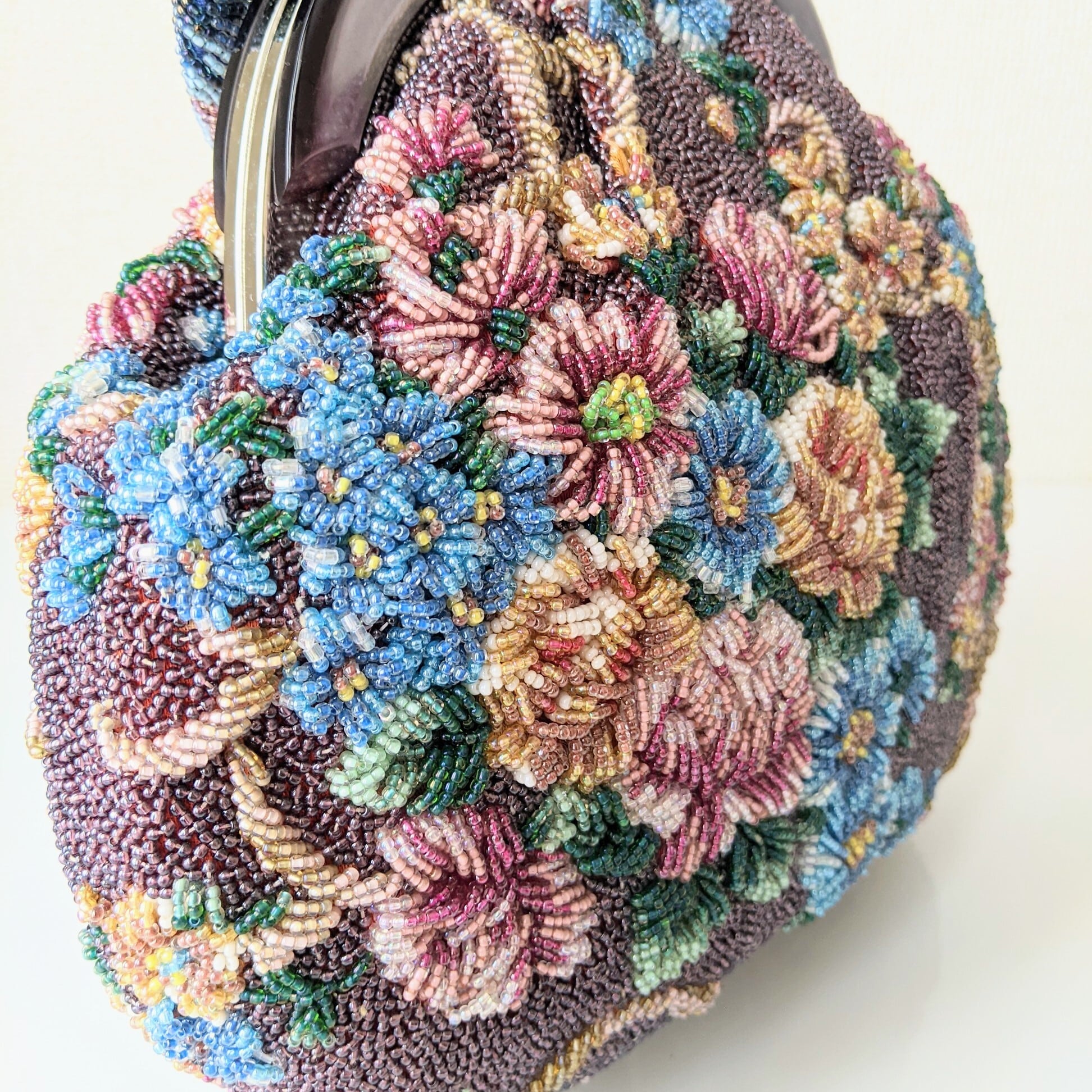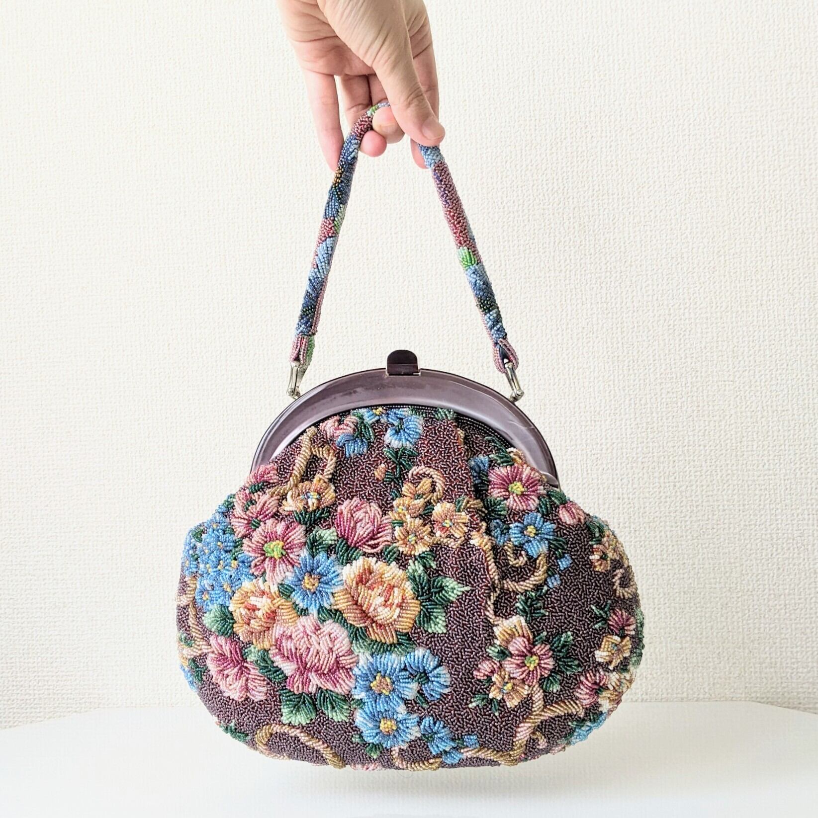 ビーズバッグの中でも花柄は人気のある柄です。こちらのバッグのようにバッグ全体に花模様があしらわれ、持ち手まで花でいっぱいのデザインは特に人気があります。