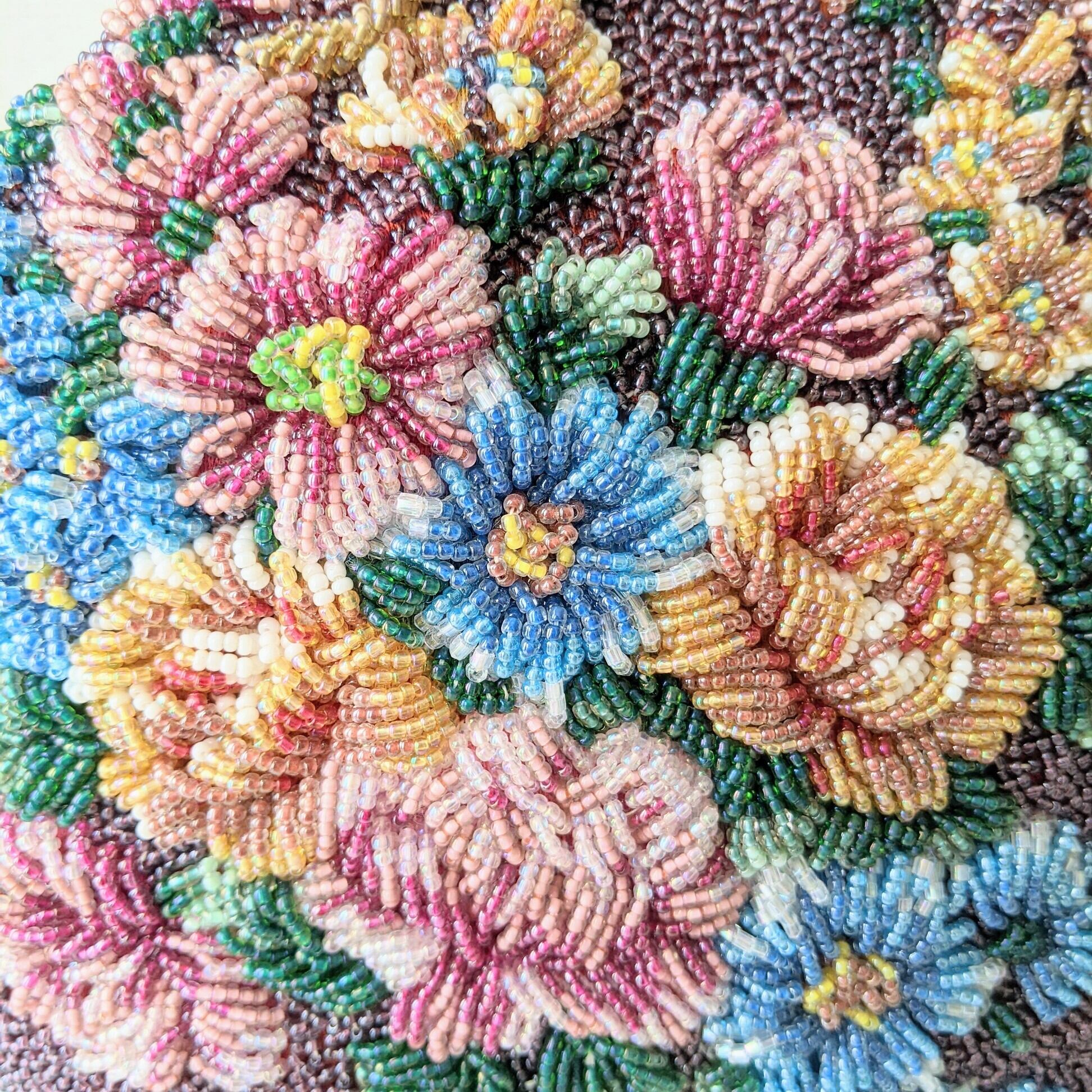 立体的に編まれた花部分と全体的に密に編まれたビーズ刺繍からは当時の技術の高さが伺え、見事な仕上がりとなっています。