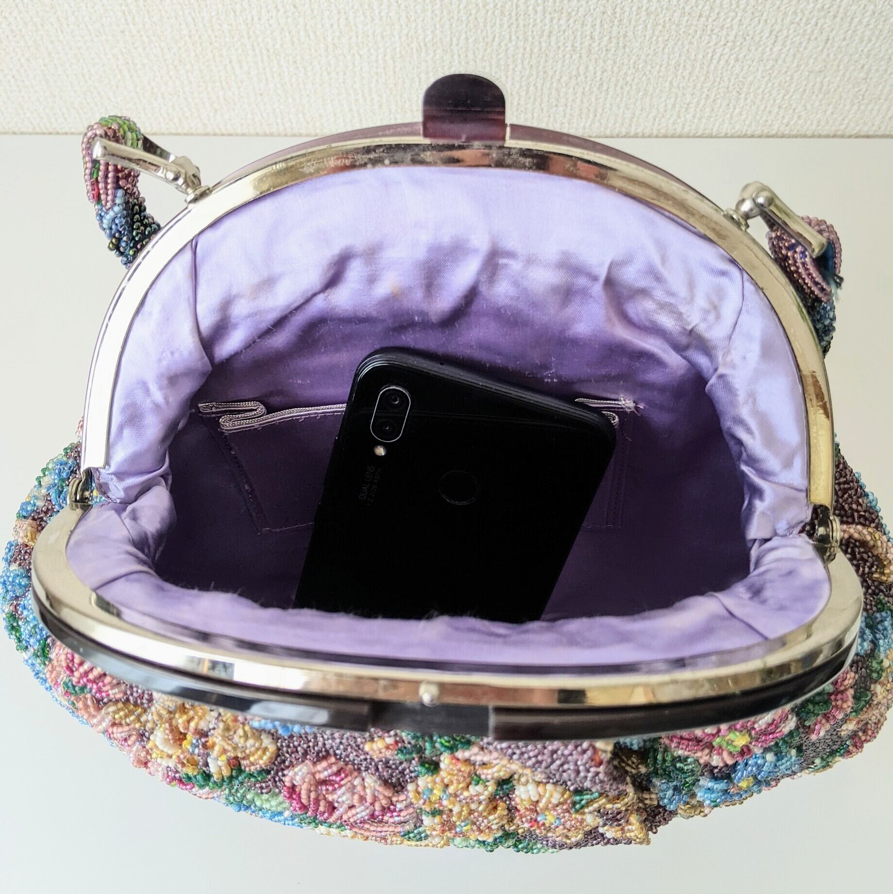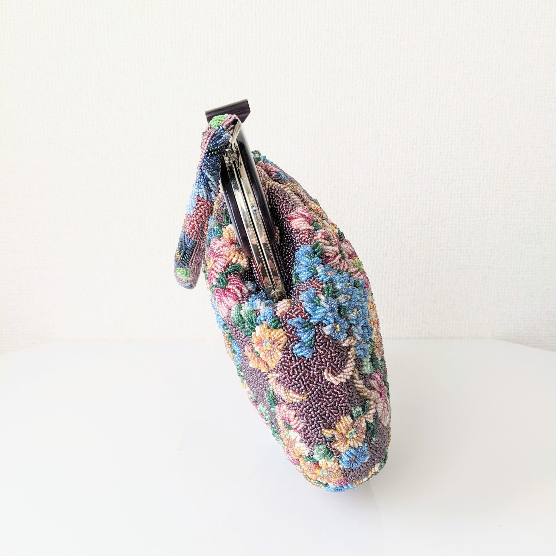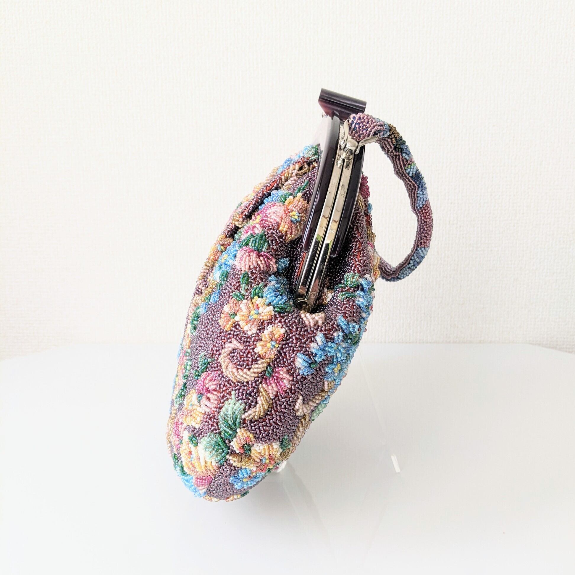 薄紫色の開口部と、バッグ部分のビーズ装飾の色の調和も美しく見ごたえのある逸品です。