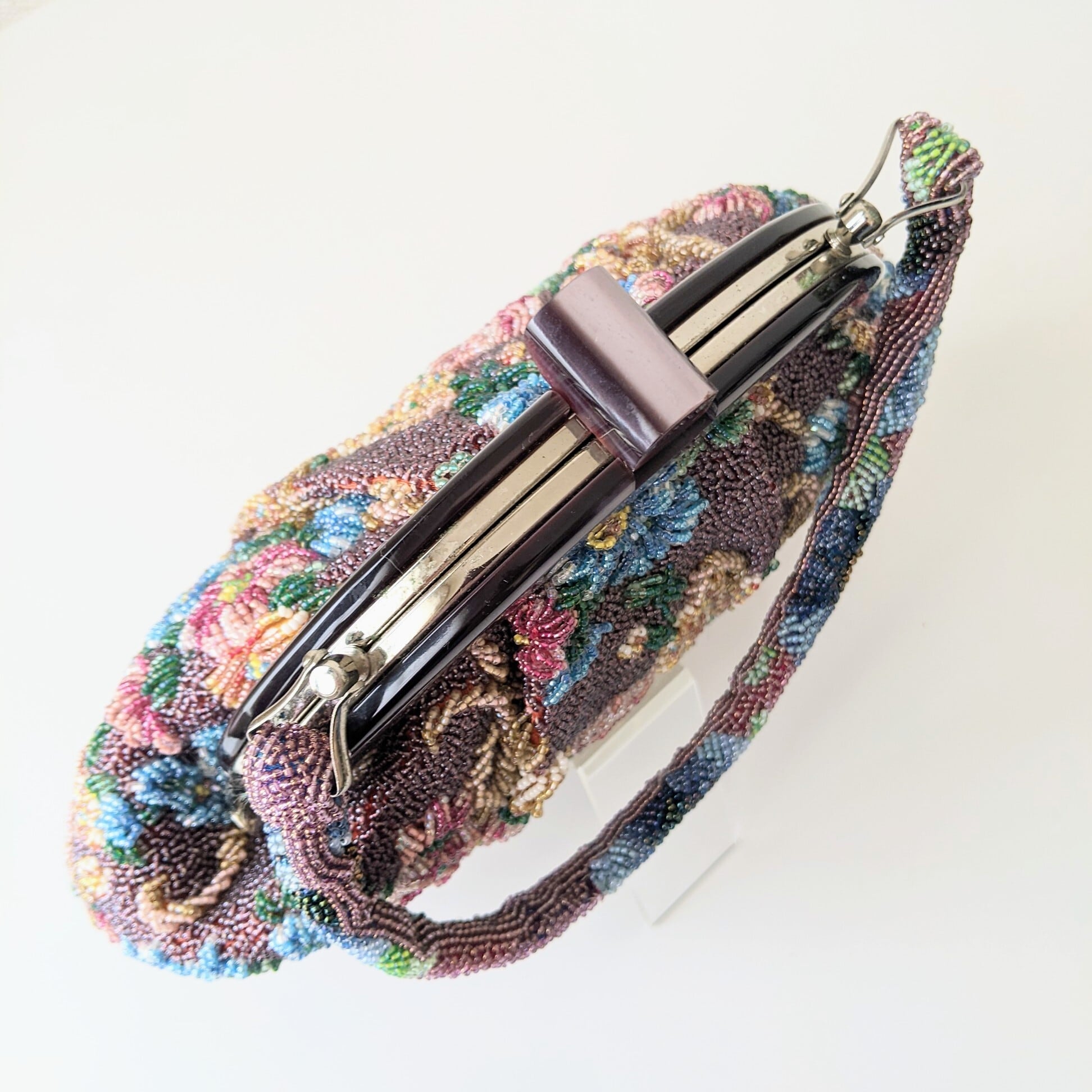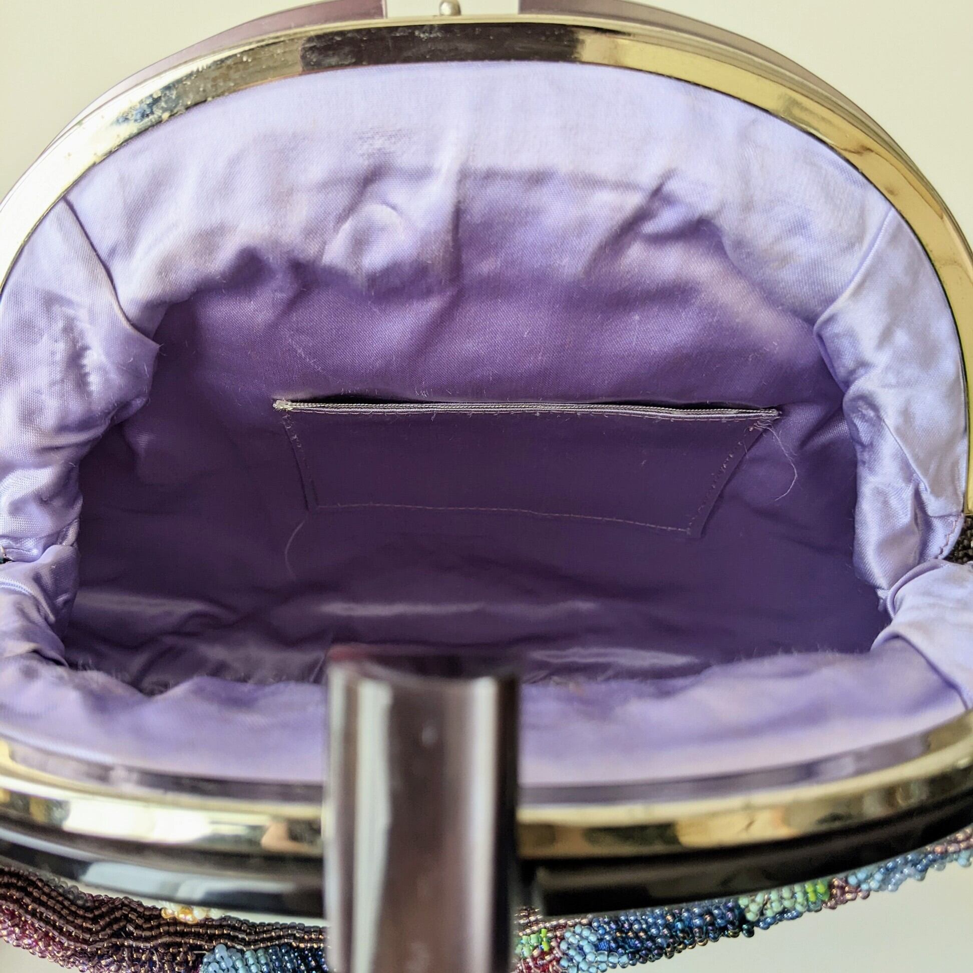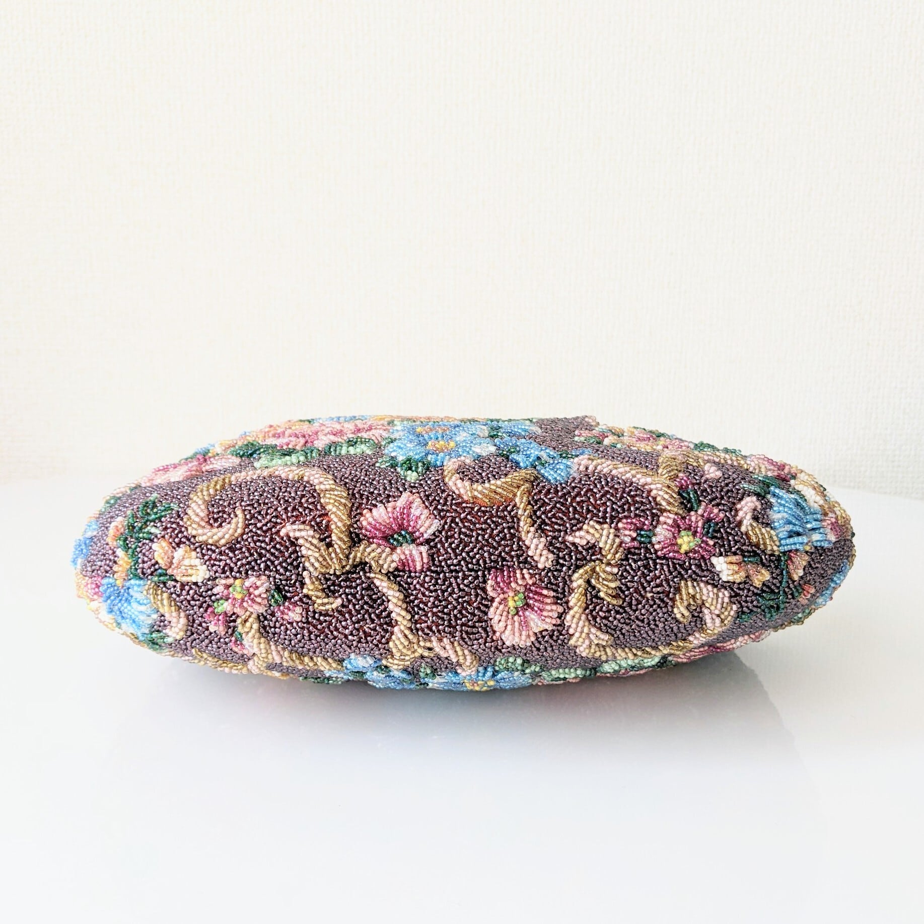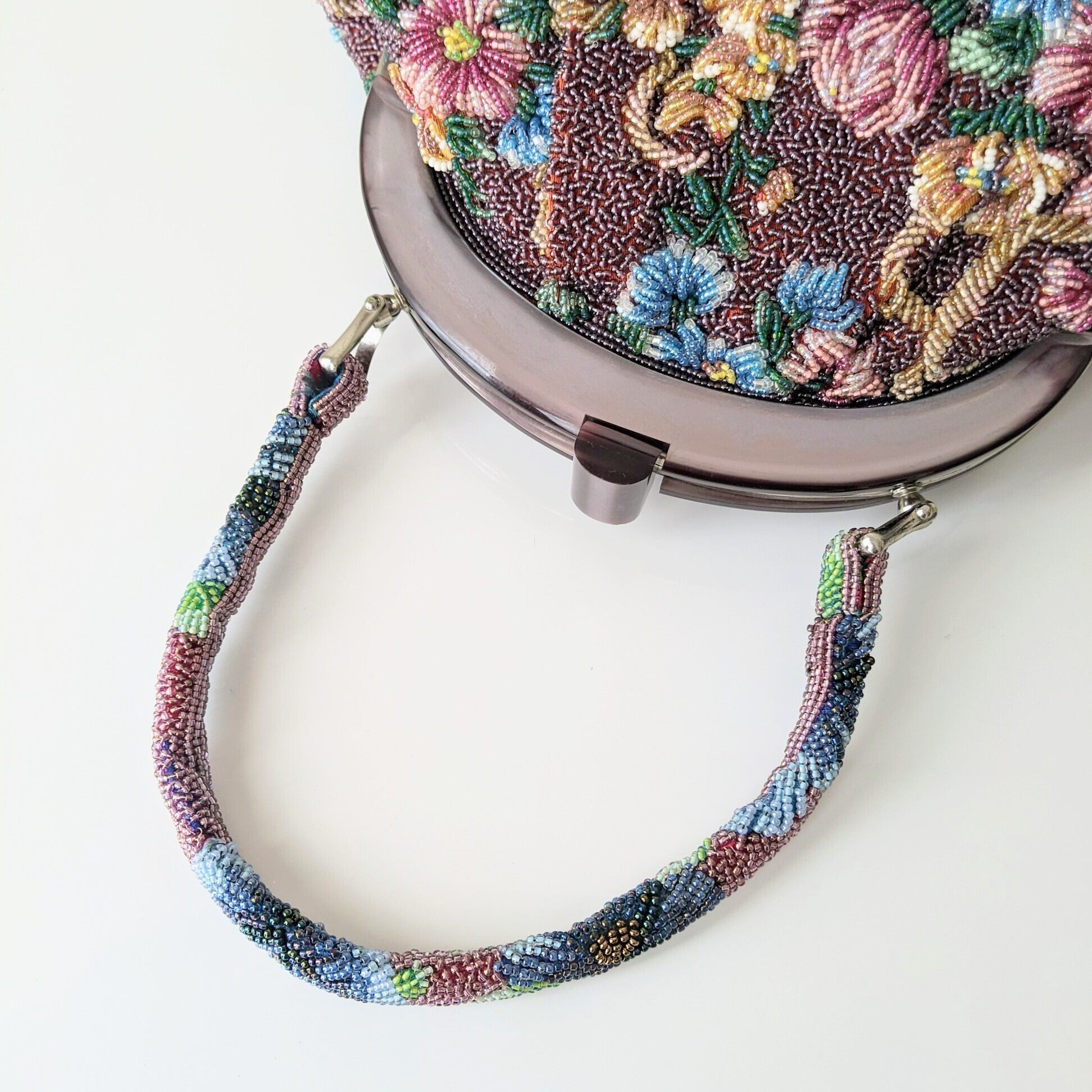 薄紫色の開口部と、バッグ部分のビーズ装飾の色の調和も美しく見ごたえのある逸品です。