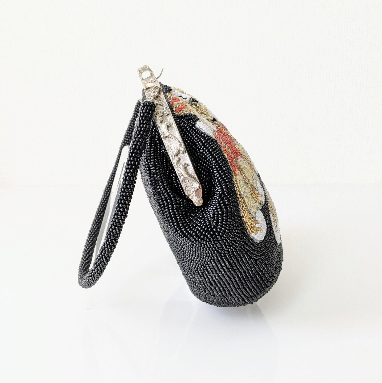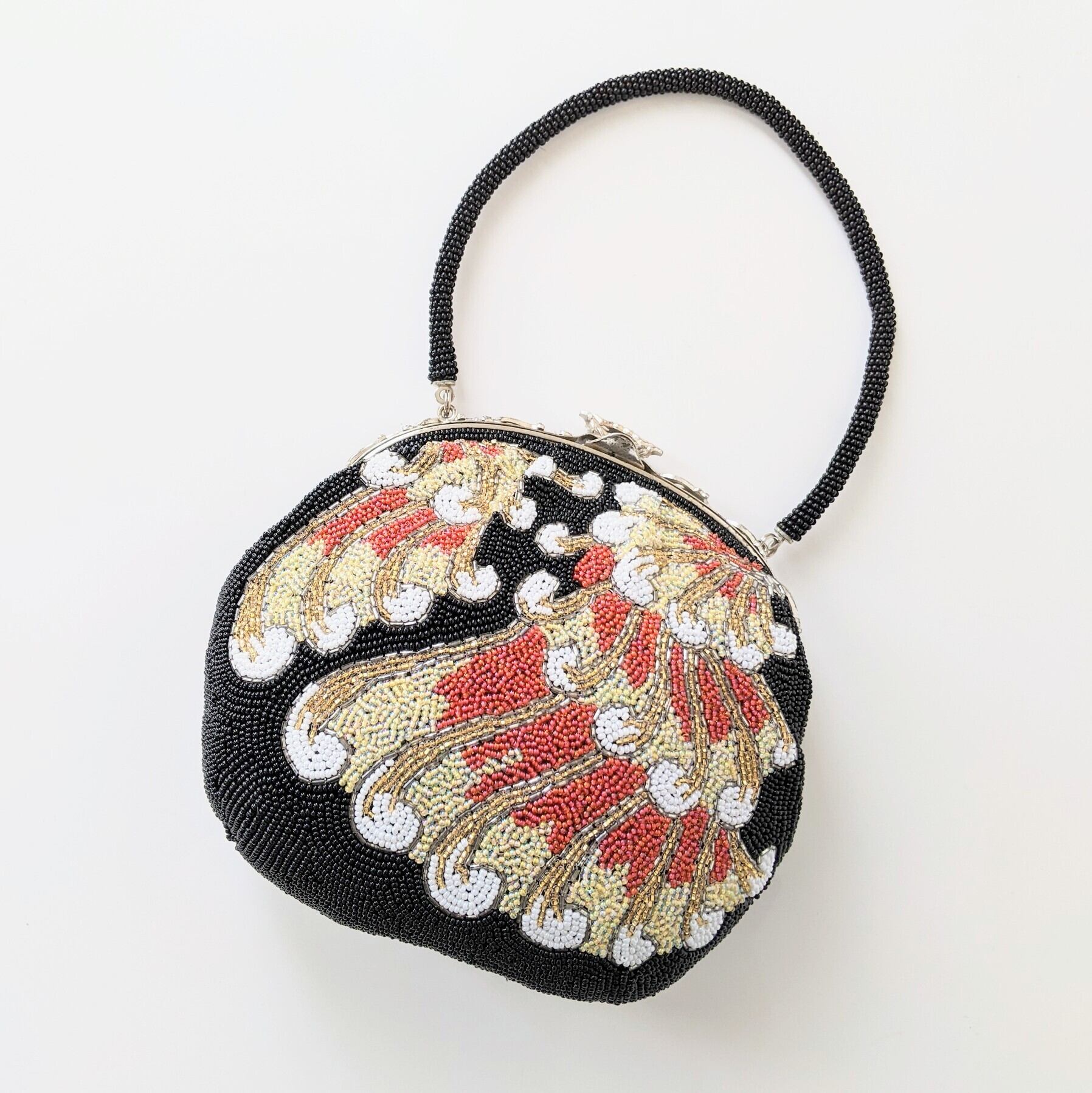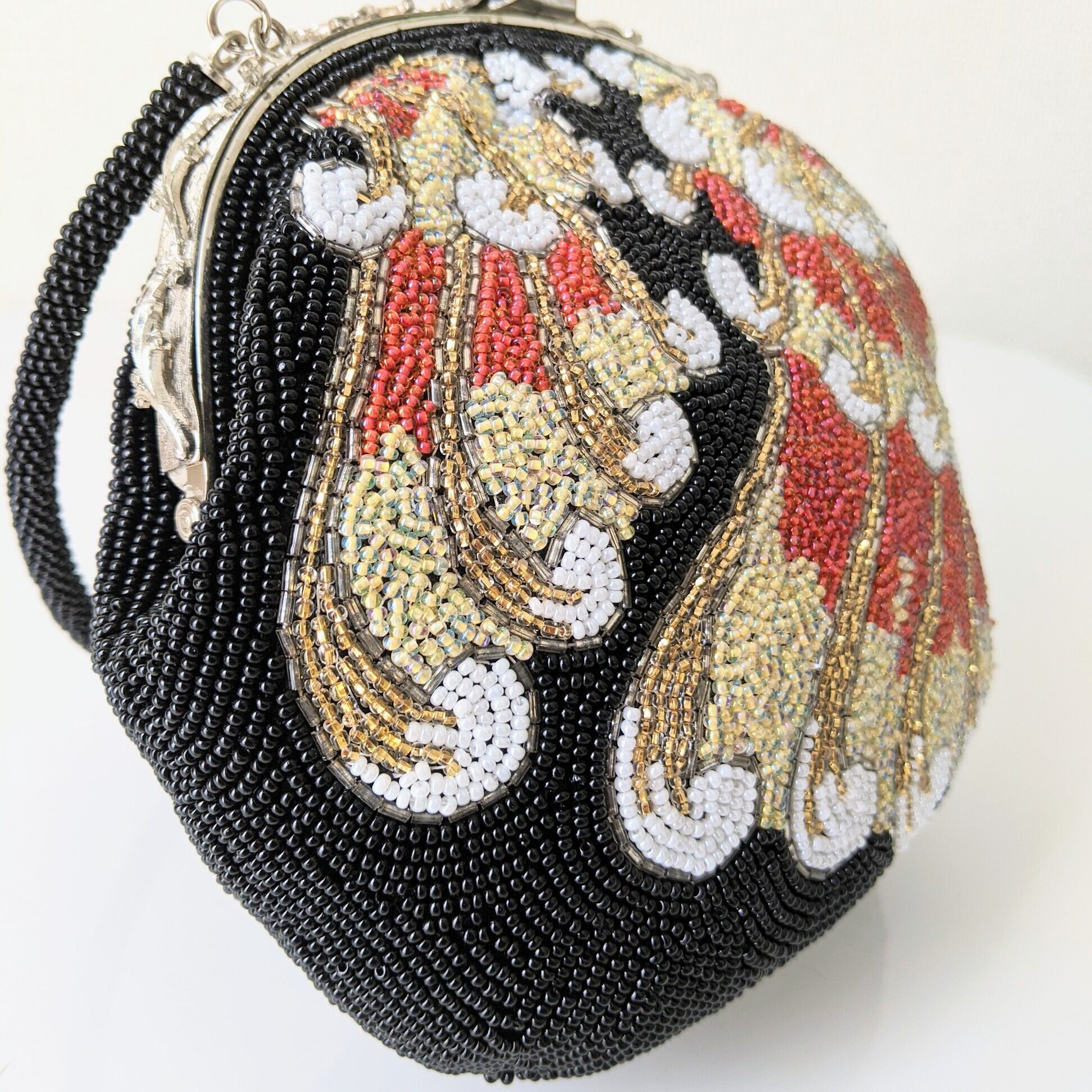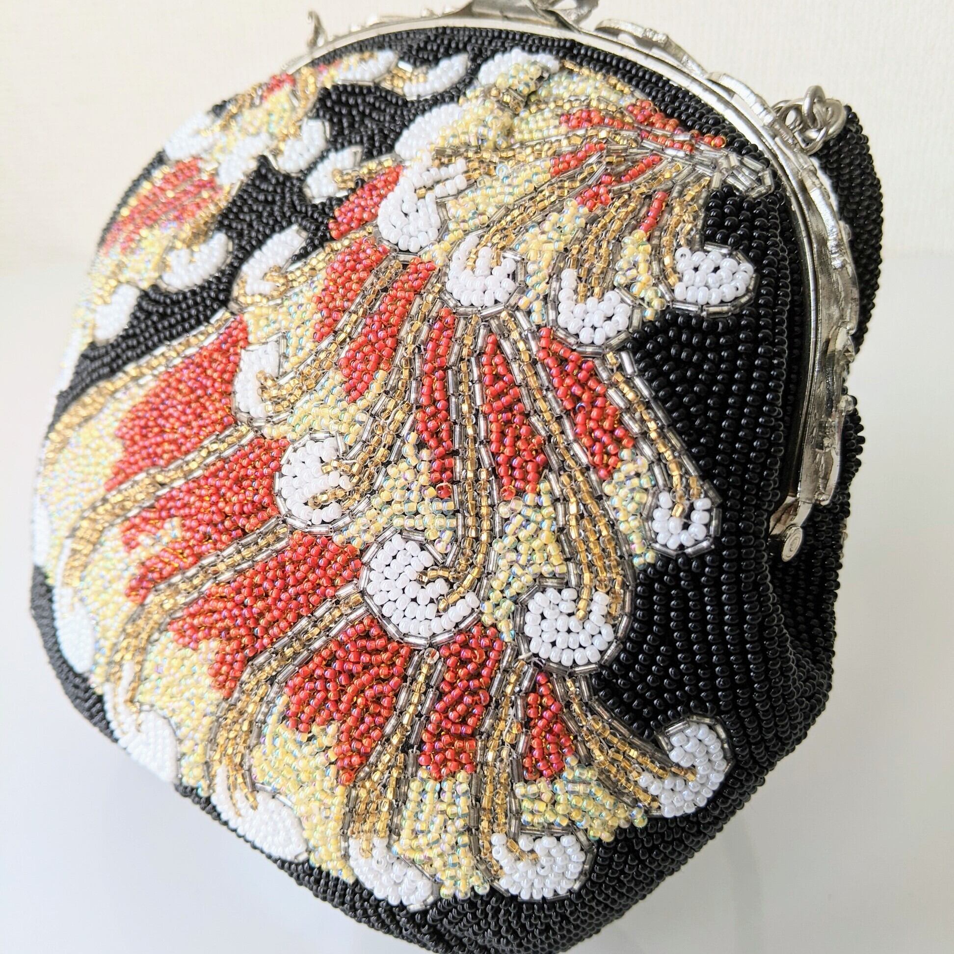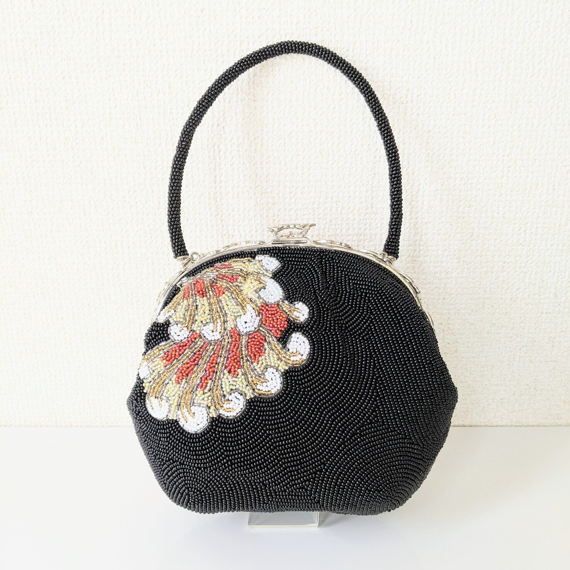 【Vintage】ビーズ刺繍バッグ Vintage Beaded Bag 波頭 黒×赤×金 Kintetsu印 パーティーバッグ 昭和レトロ 大正浪漫 フォーマルバッグ