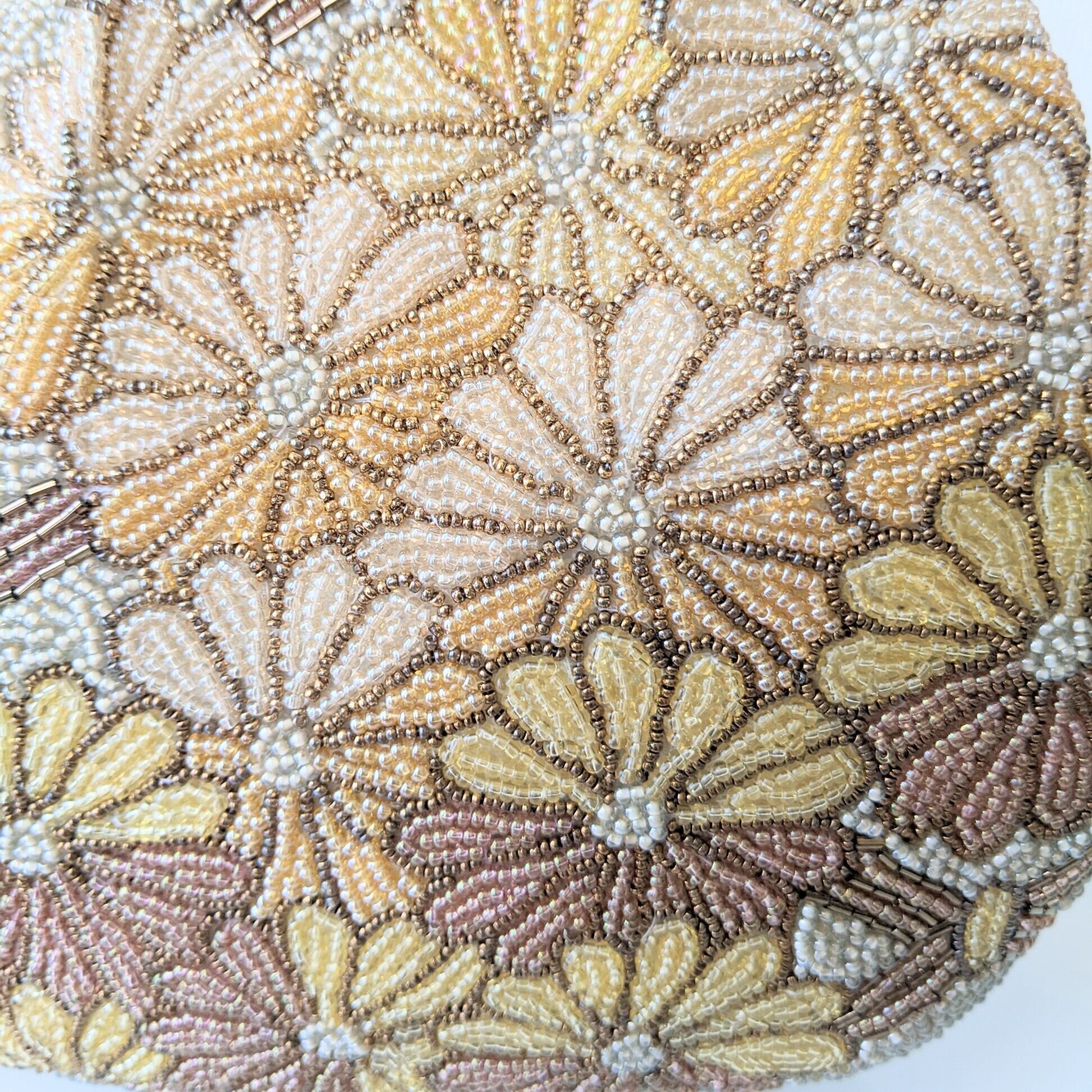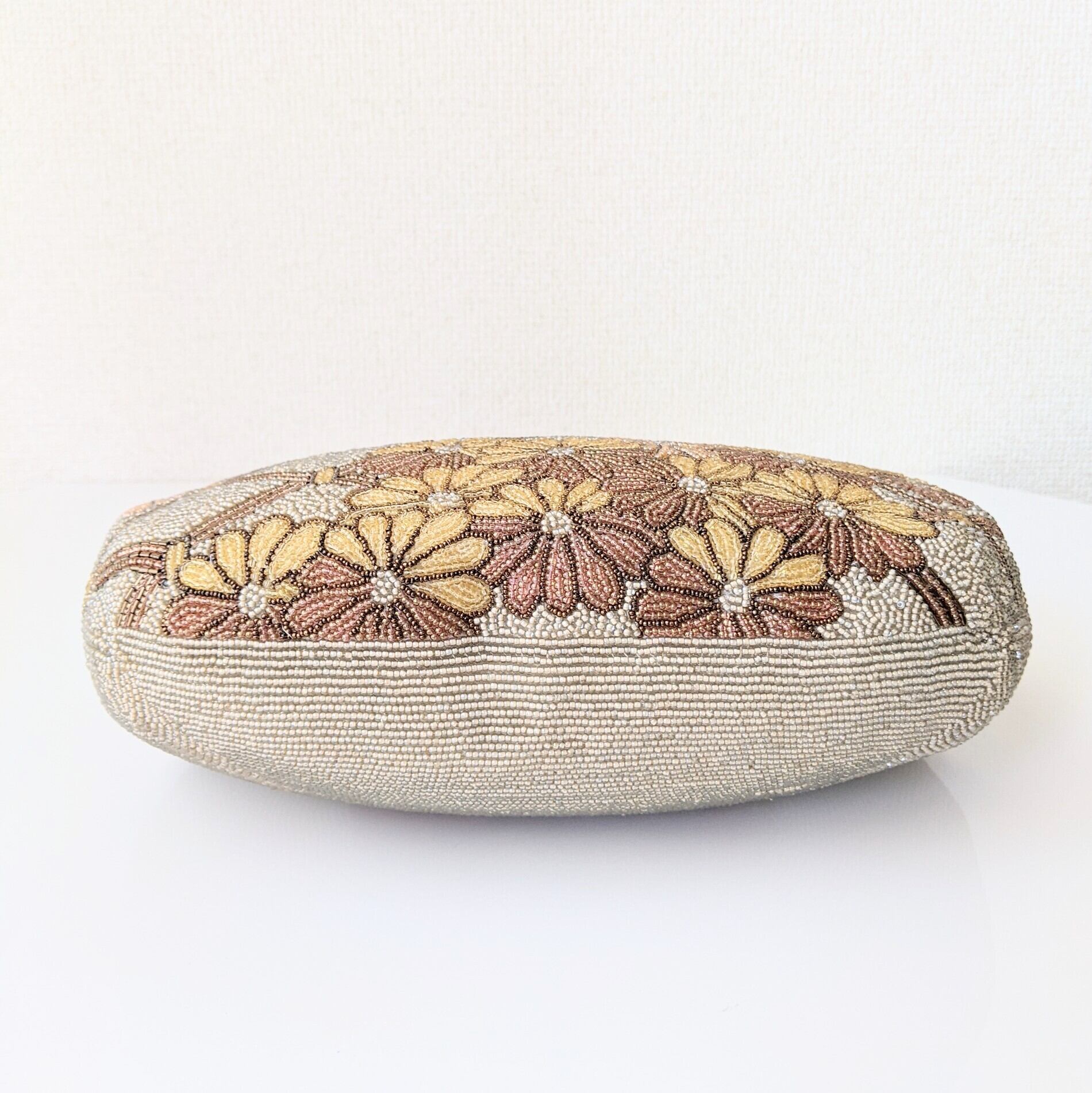 ベージュの地色に茶、黄色といった同系色のグラデーションでまとめられた大きめのビーズバッグです。
