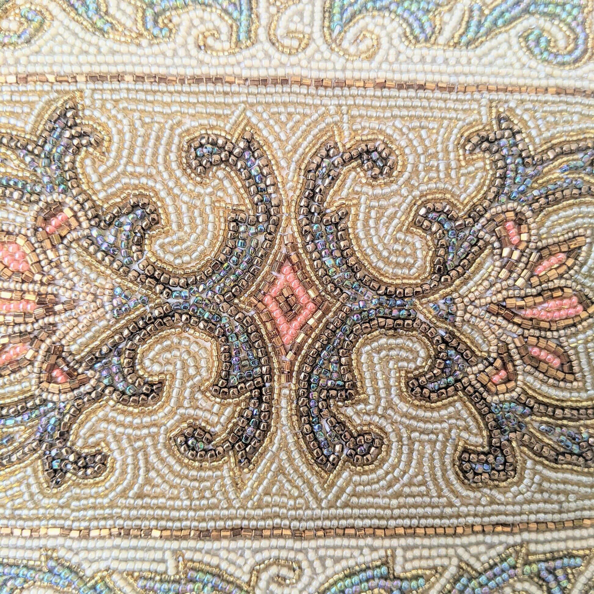 シンメトリカルなアラベスク模様は、まるでモスクのタイル装飾のような整然とした美しさがあります。光が当たると金色に輝くビーズに見とれてしまいます。