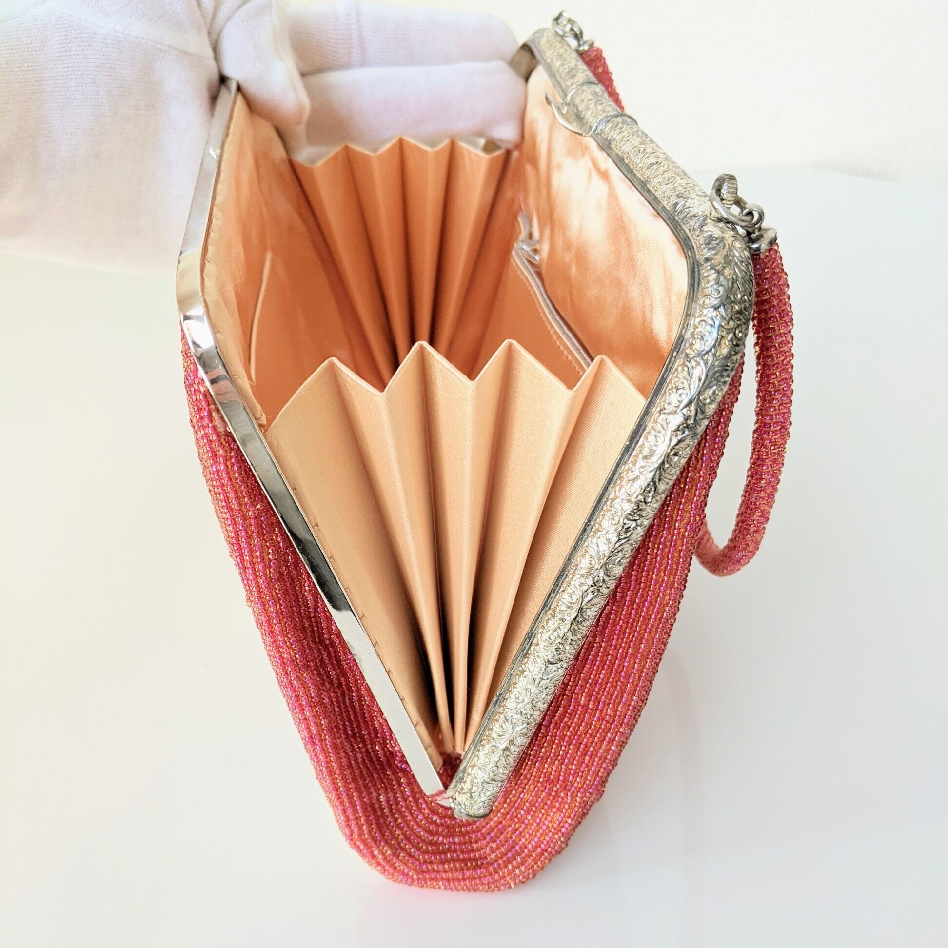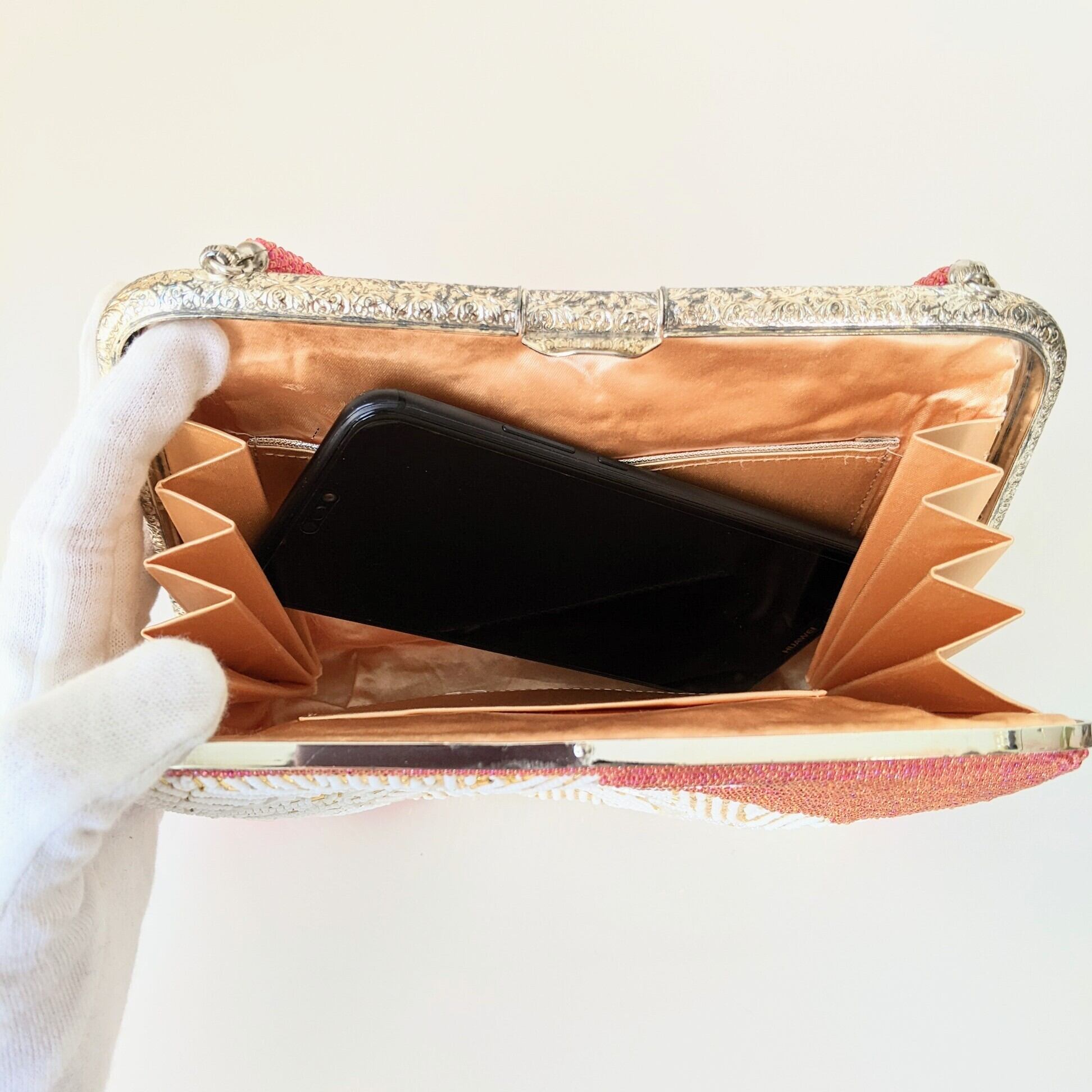 朱赤と金色の大変ゴージャスで見ごたえのある、パーティーシーンに相応しいビーズバッグです。