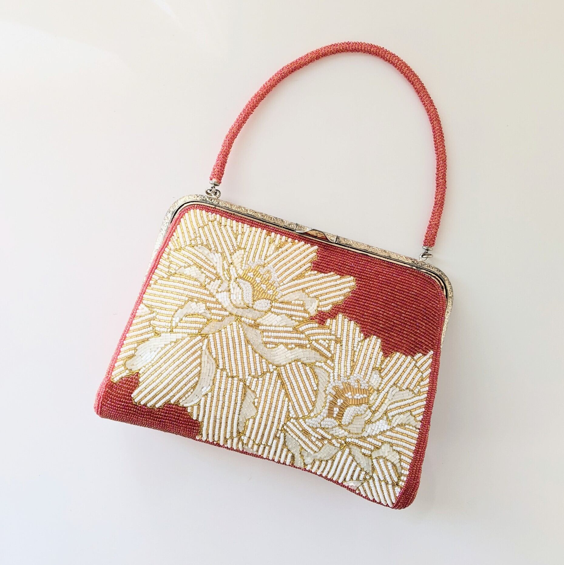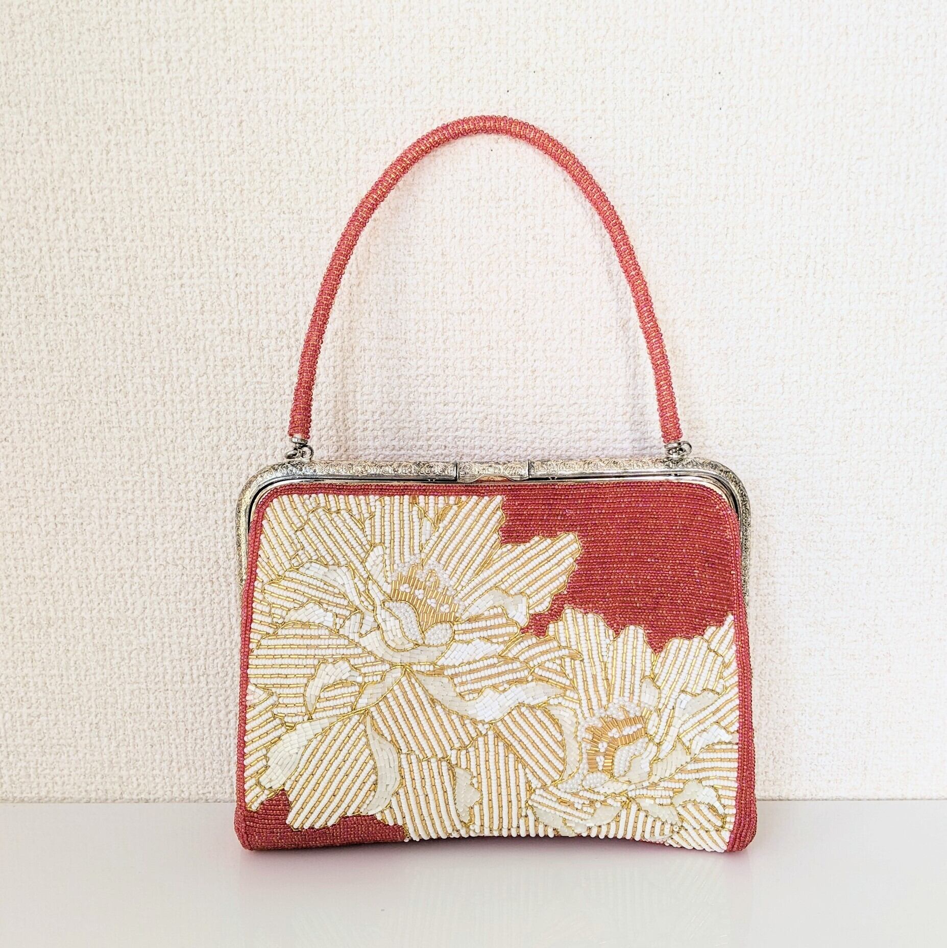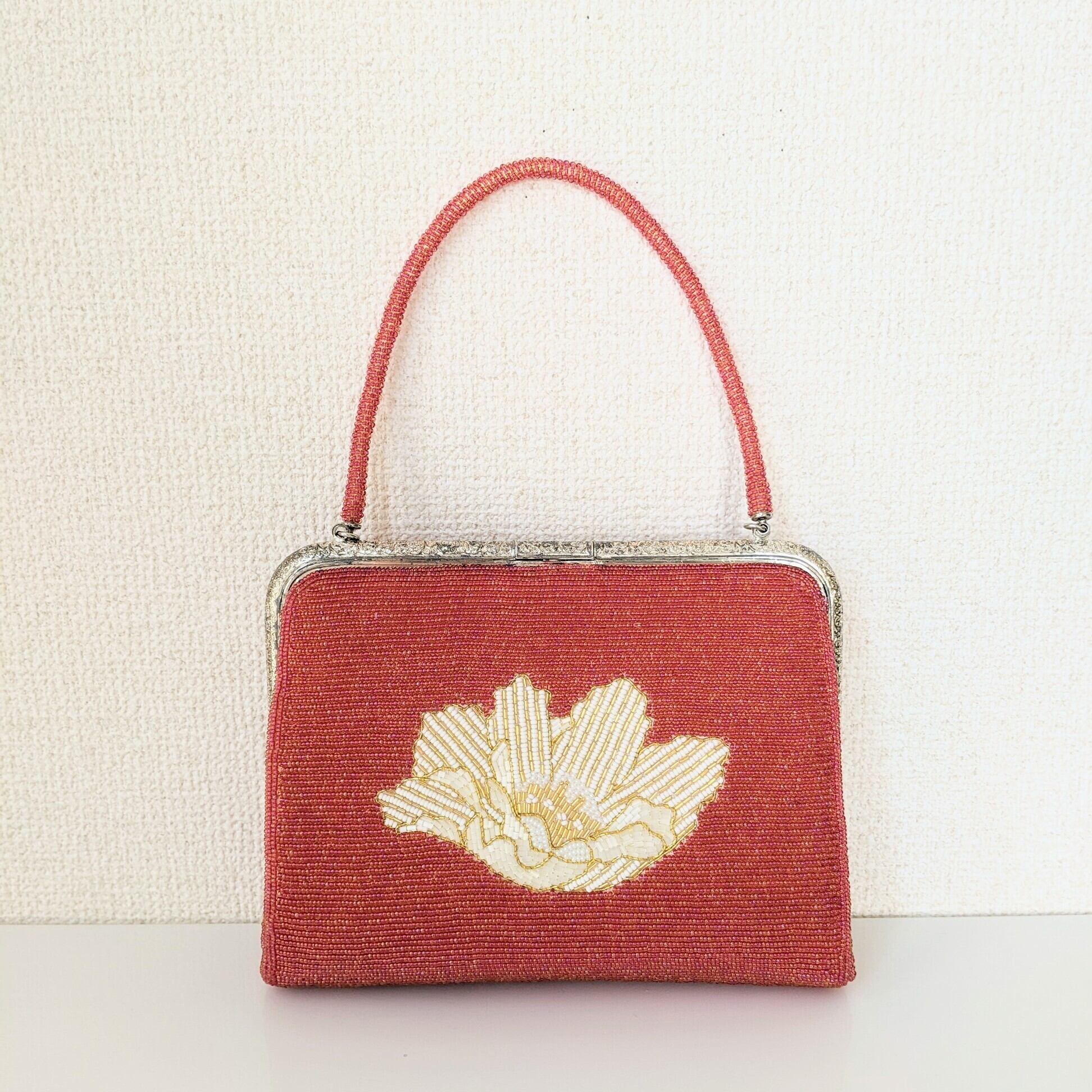 【Vintage】ビーズ刺繍バッグ Vintage Beaded Bag 牡丹 朱赤×ゴールド パーティーバッグ 昭和レトロ 大正浪漫 フォーマルバッグ