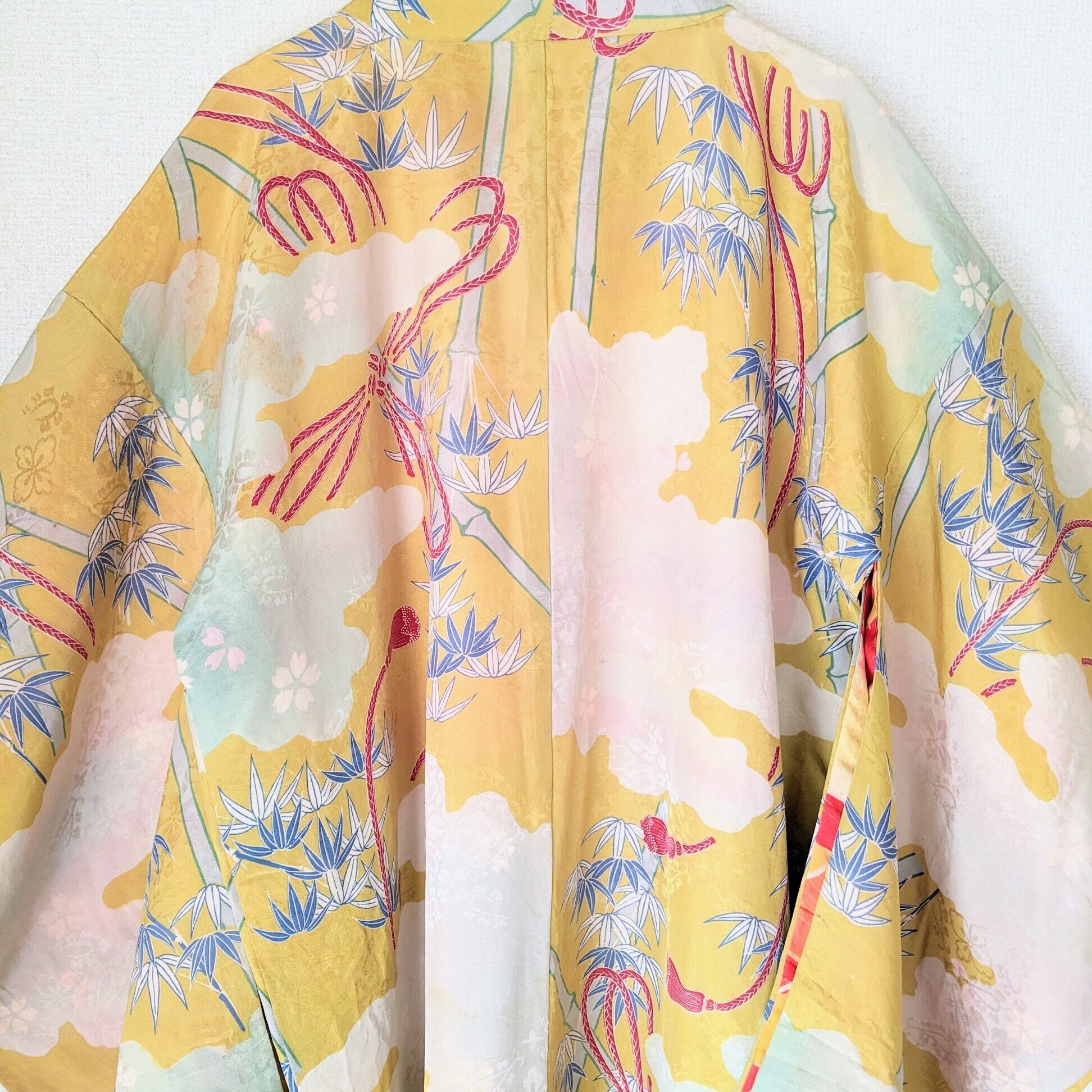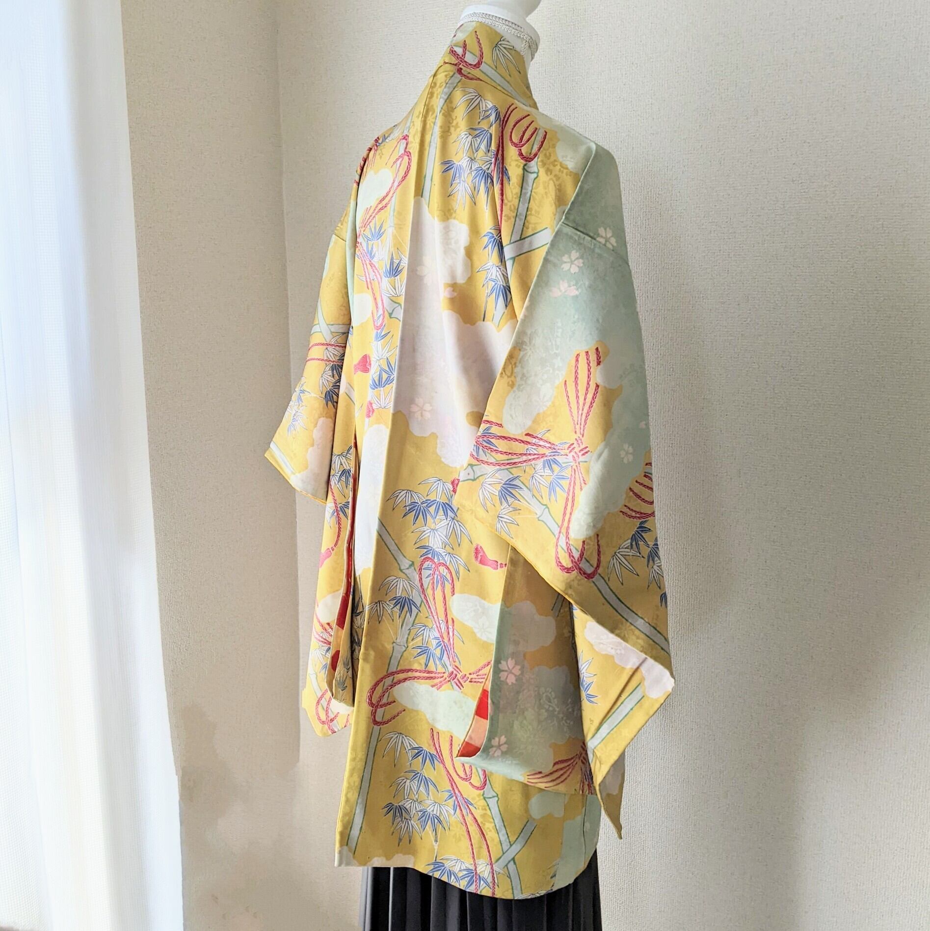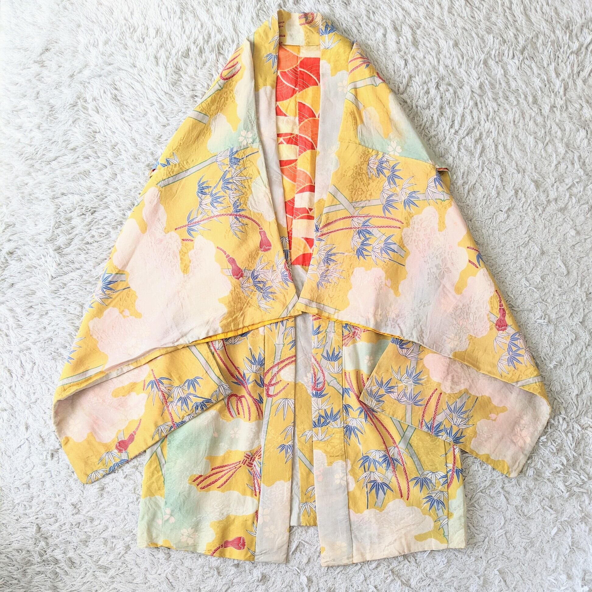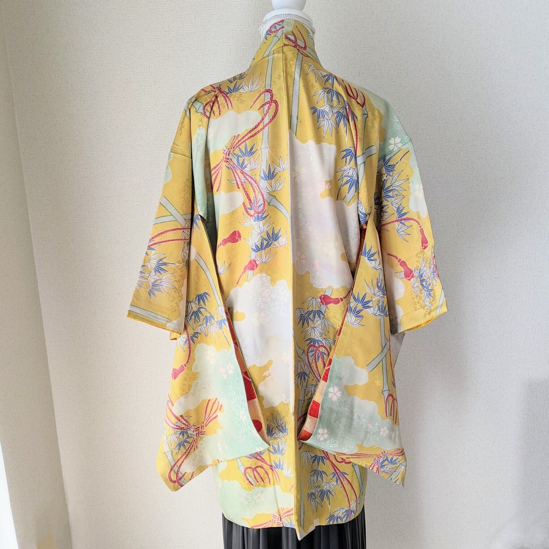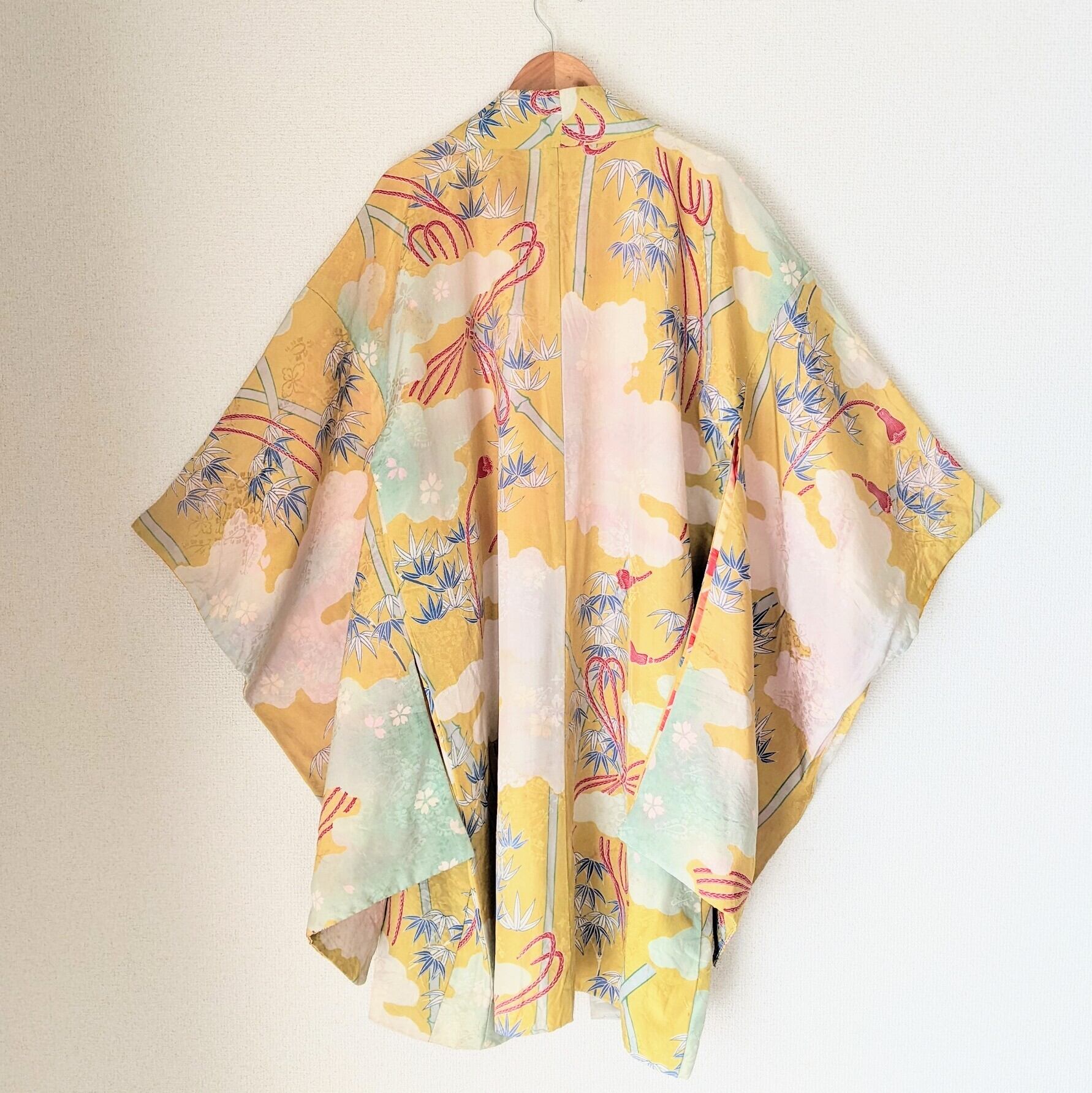 【Vintage】羽織り 縮緬 正絹 シルク 桜と竹 芥子色 薄緑