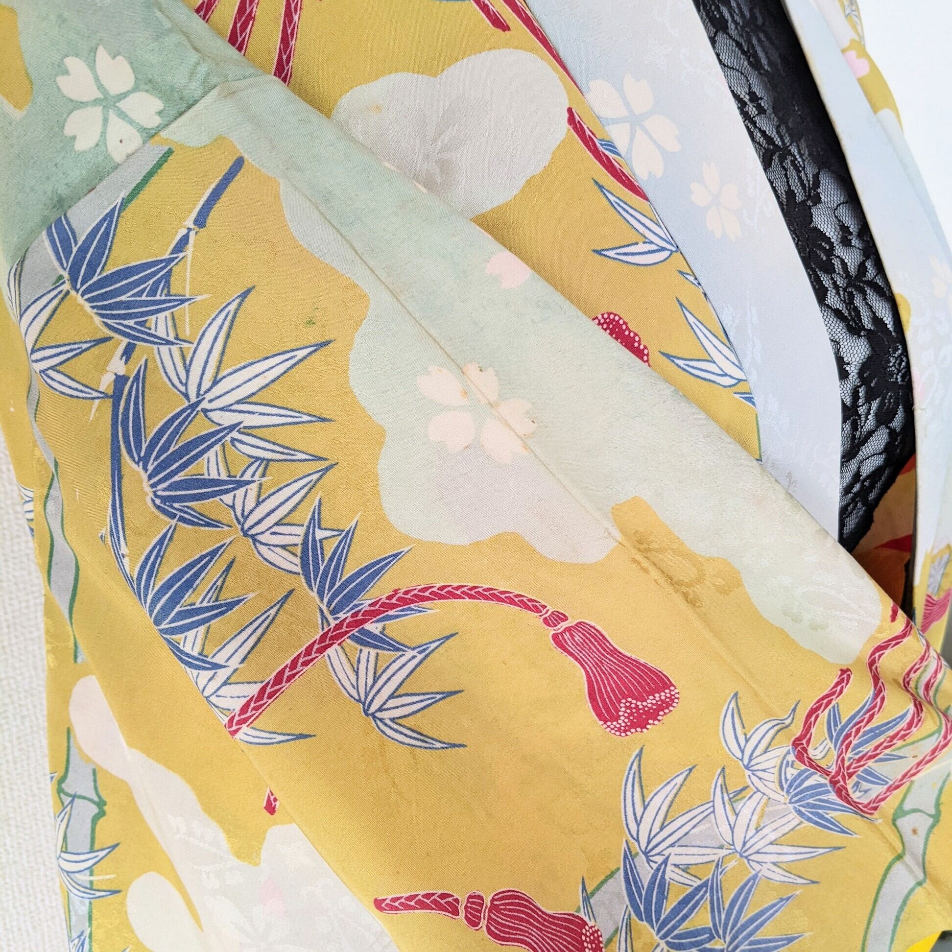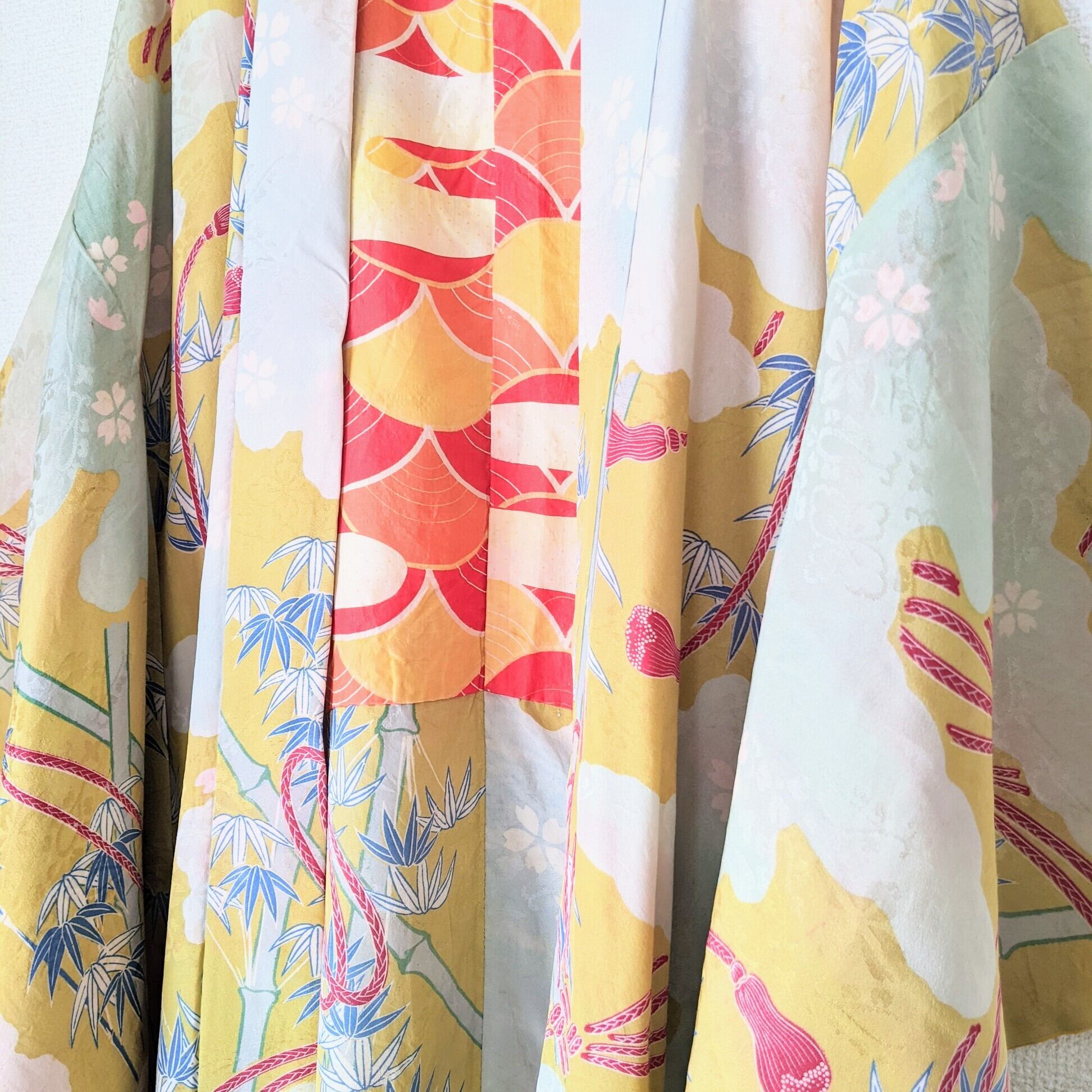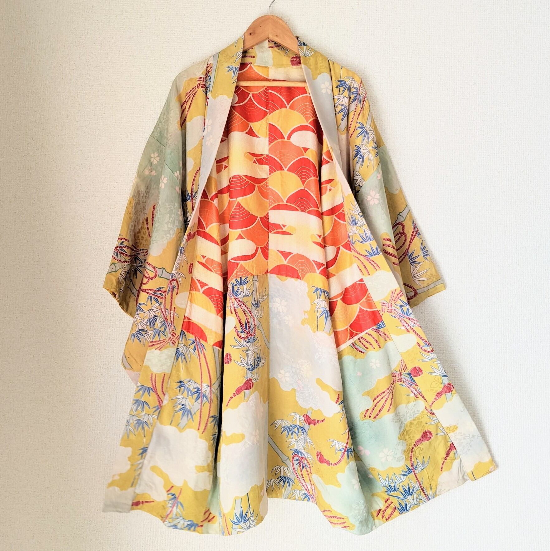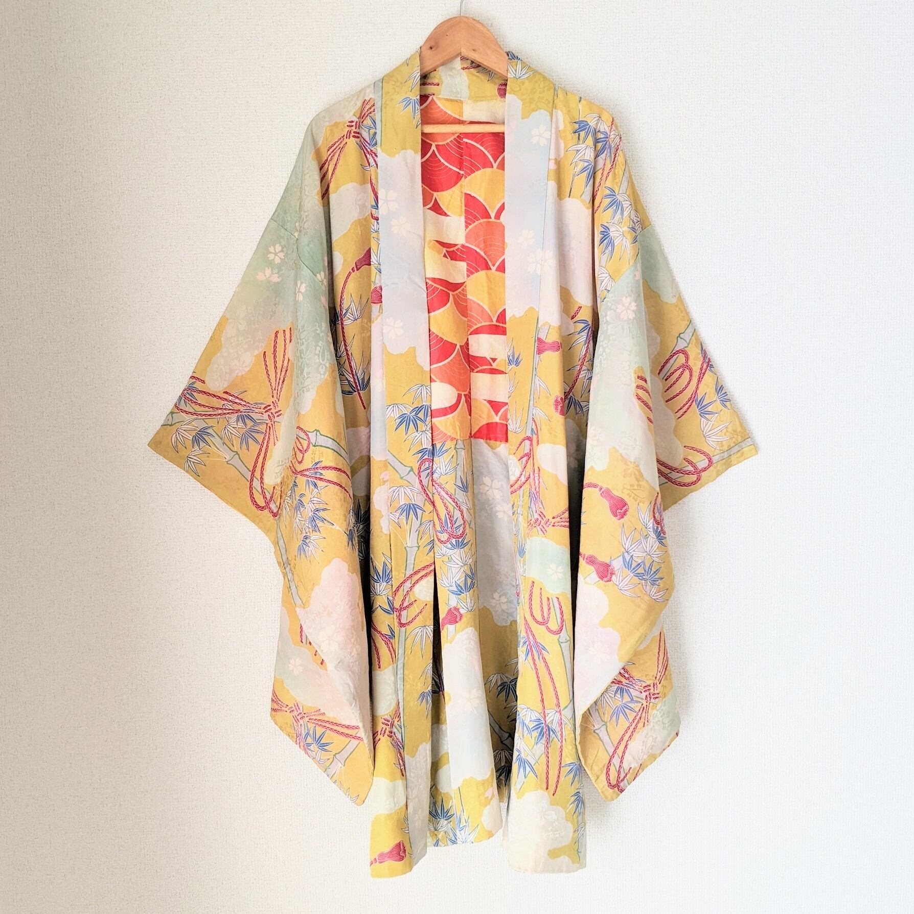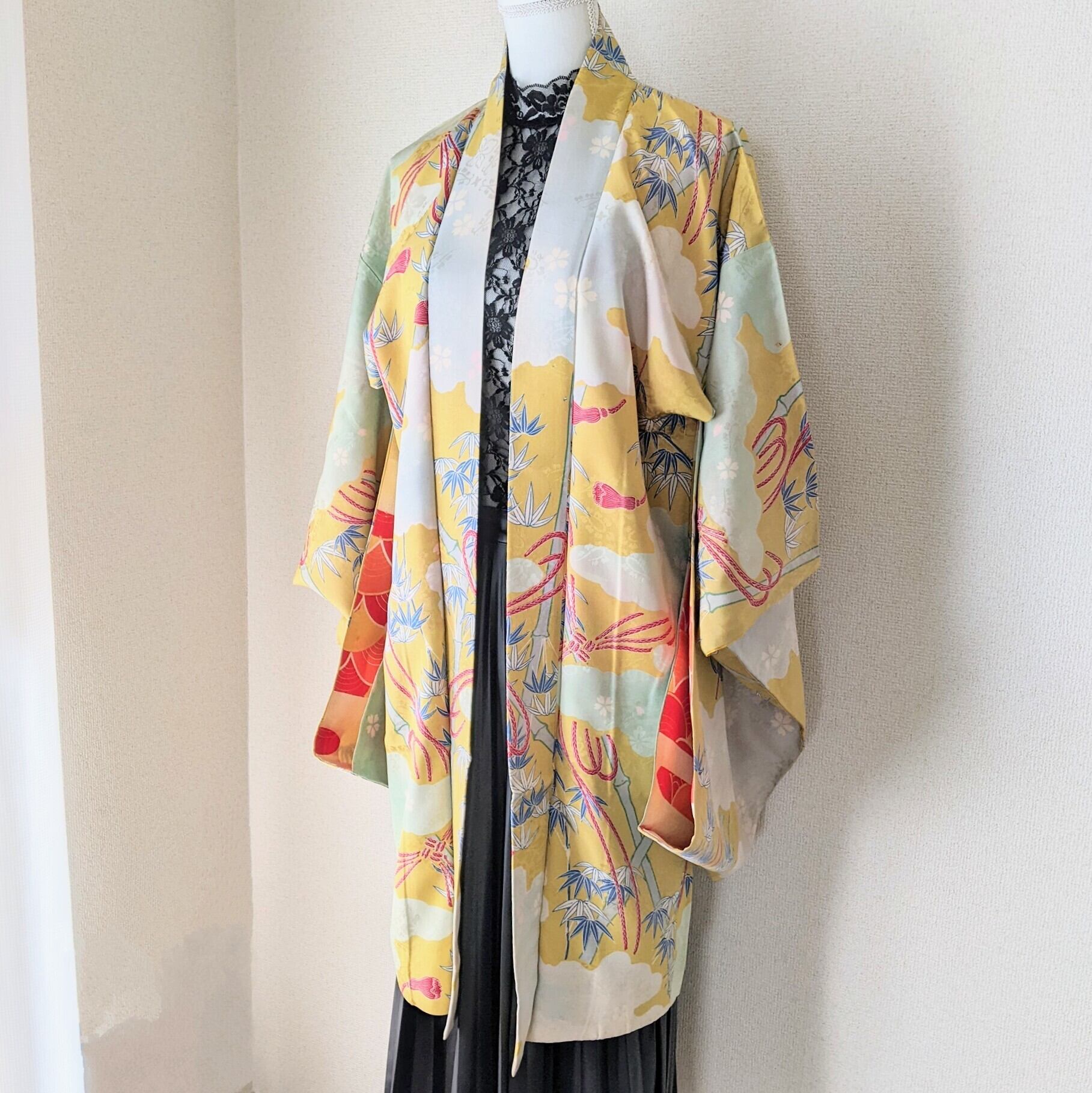 【Vintage】羽織り 縮緬 正絹 シルク 桜と竹 芥子色 薄緑