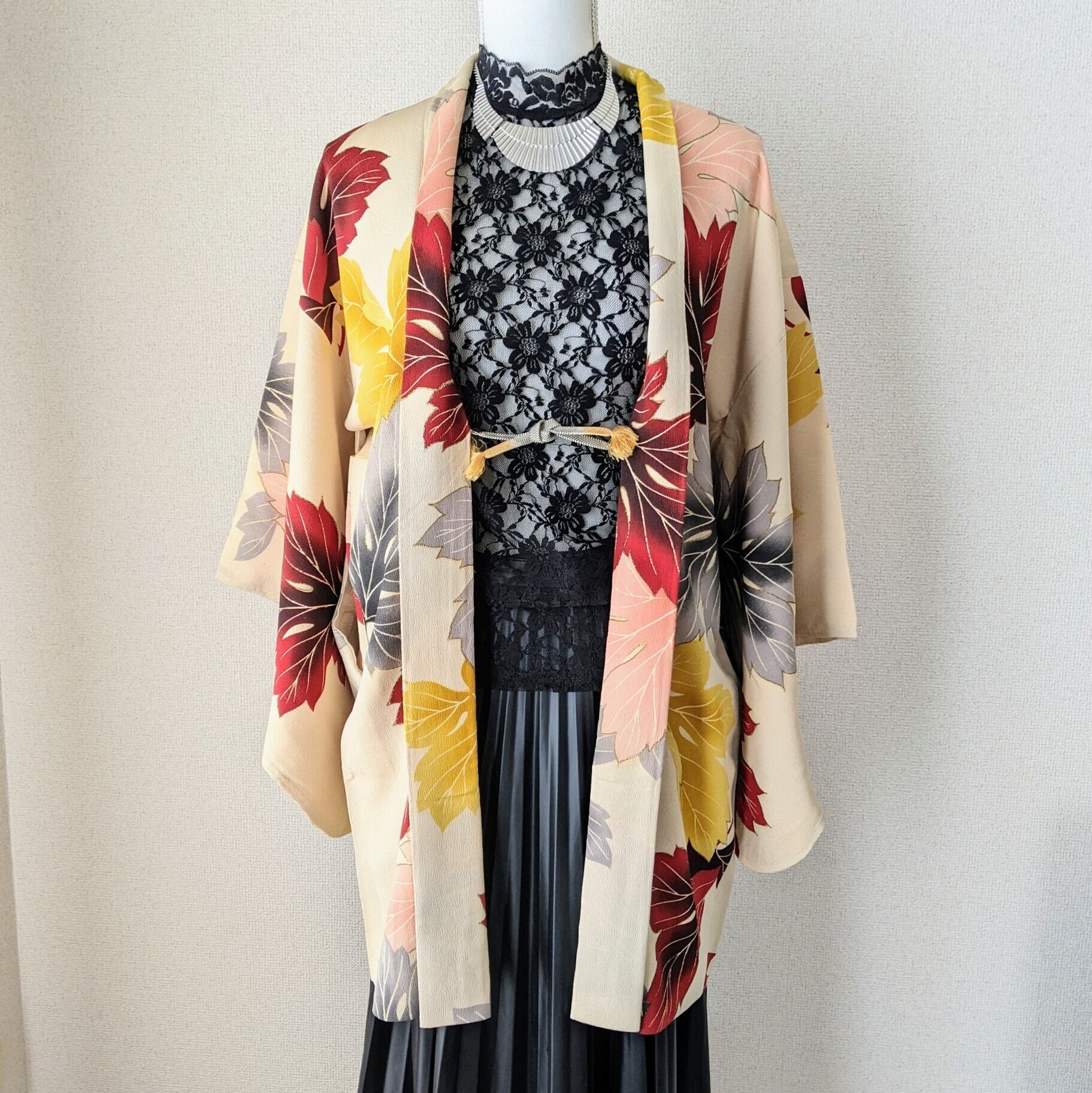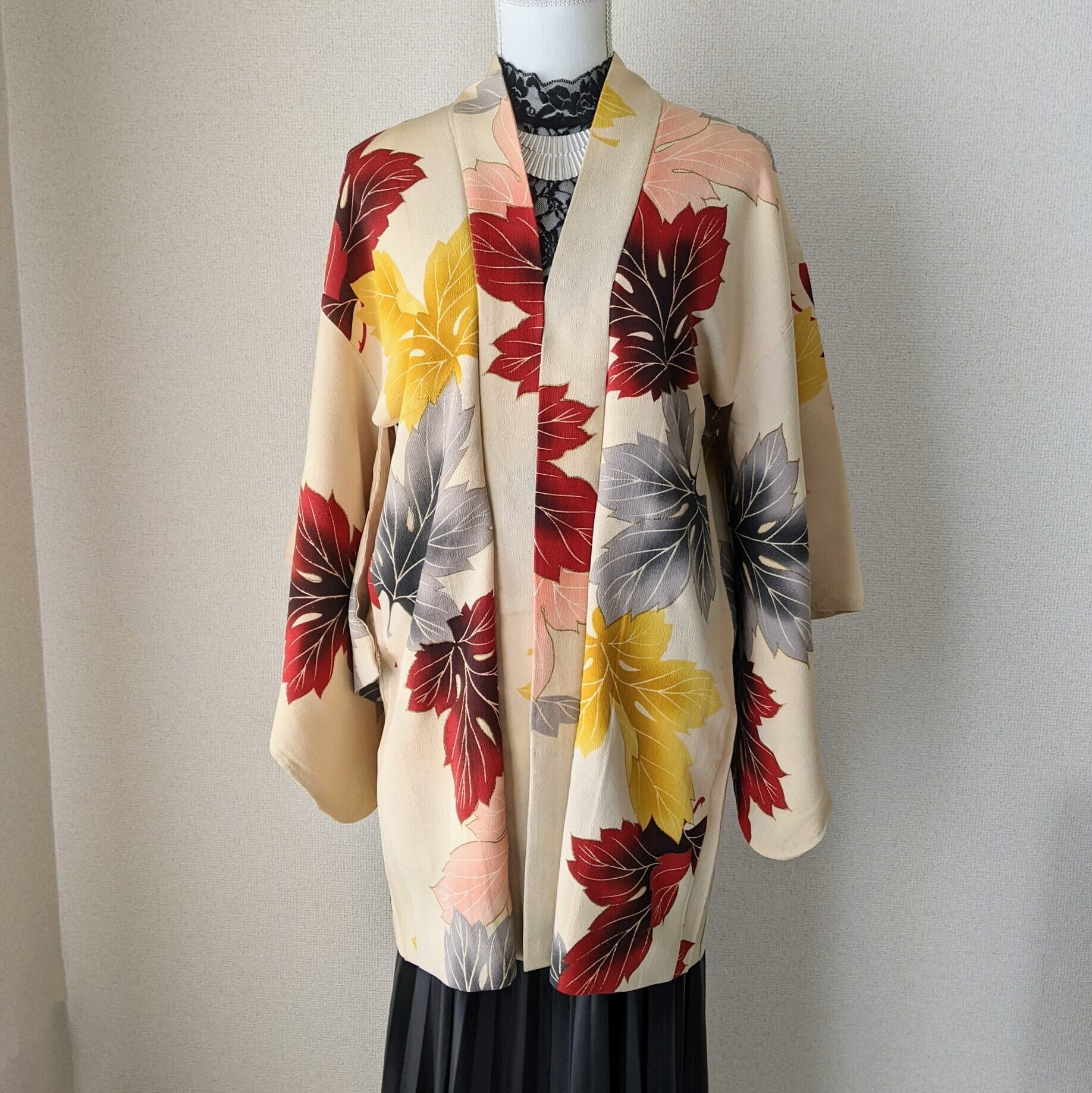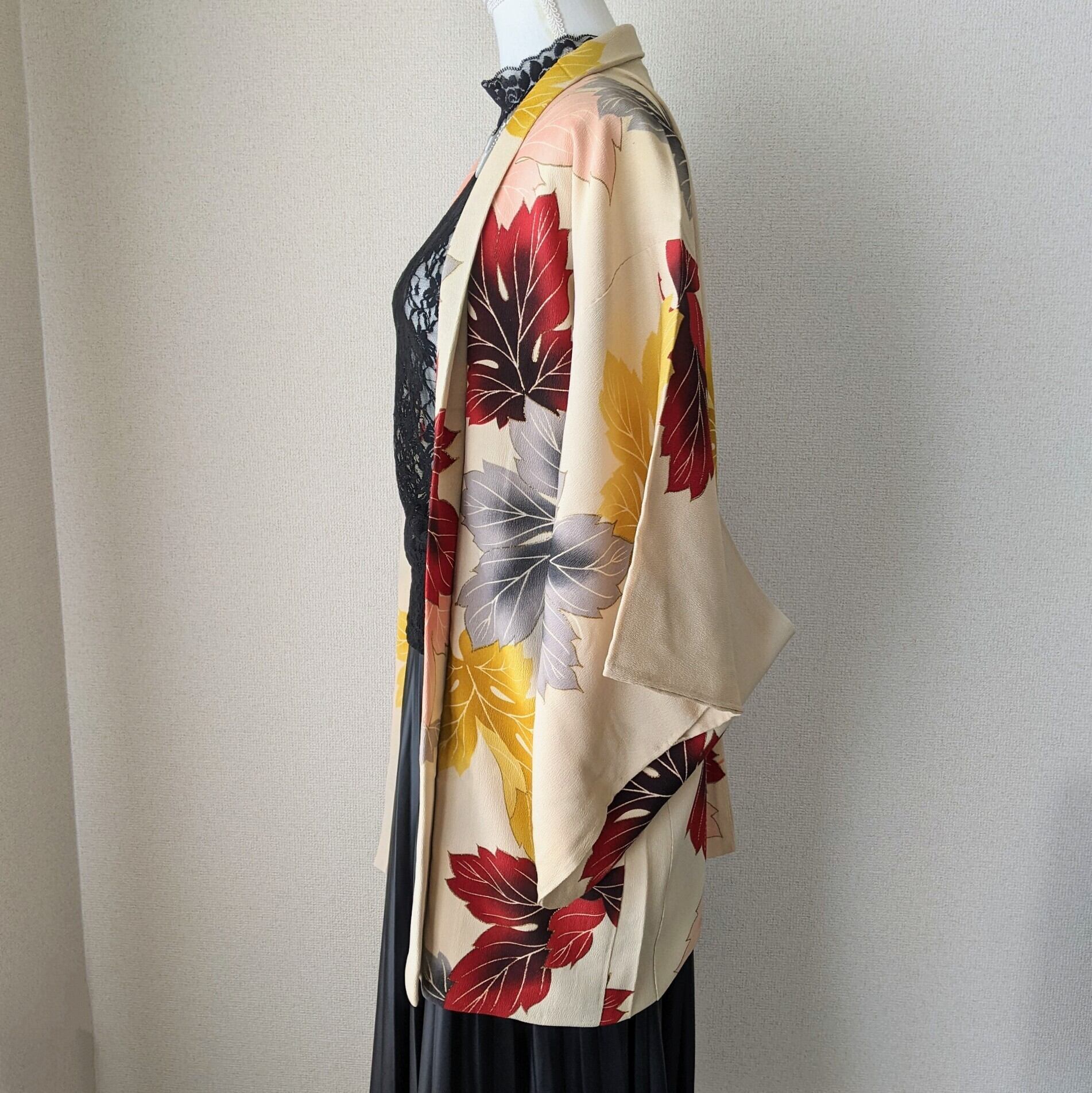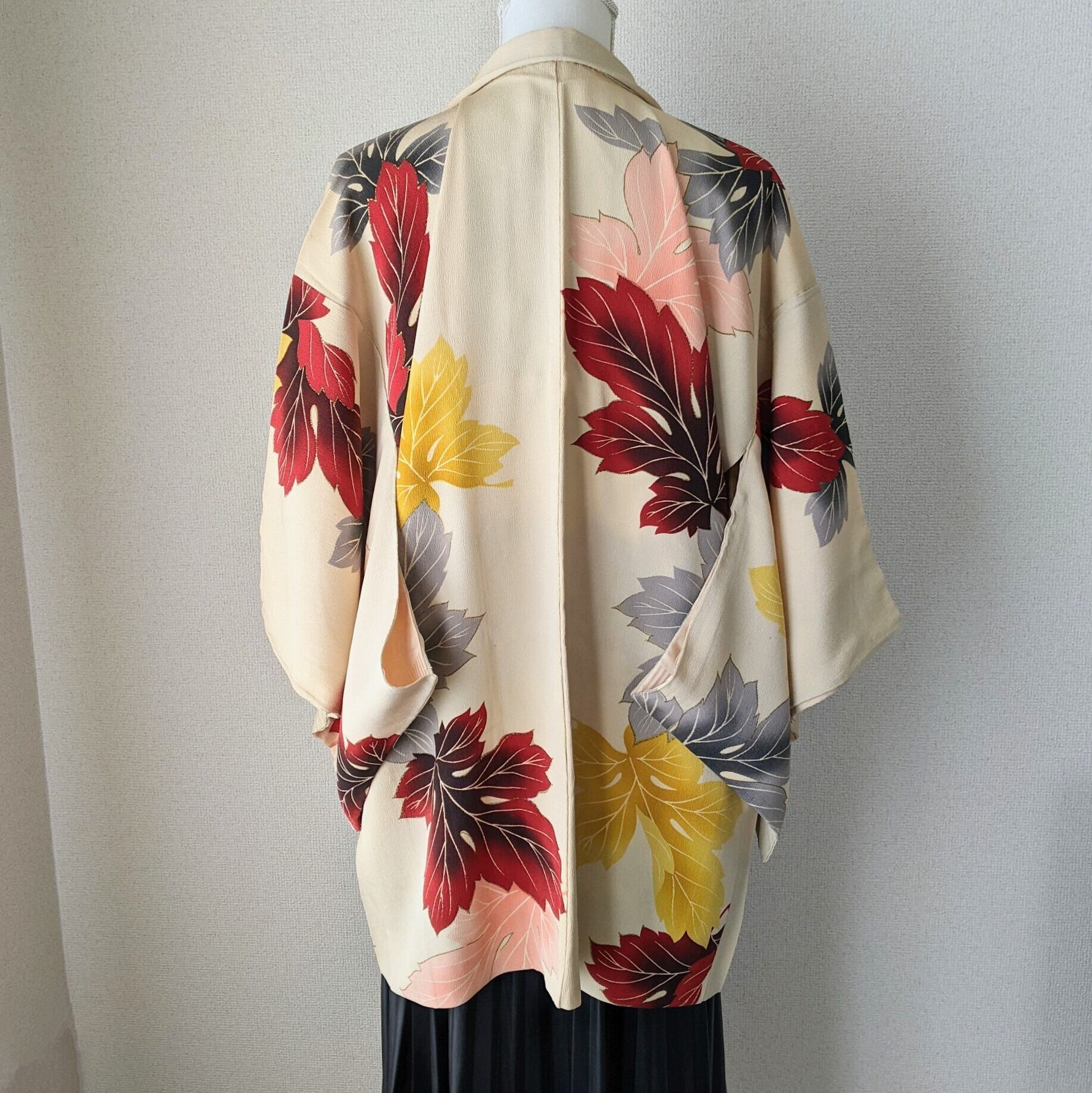【Vintage】HAORI 羽織 正絹 紅葉柄 ベージュ 縮緬 シルク 大正浪漫 ガウン