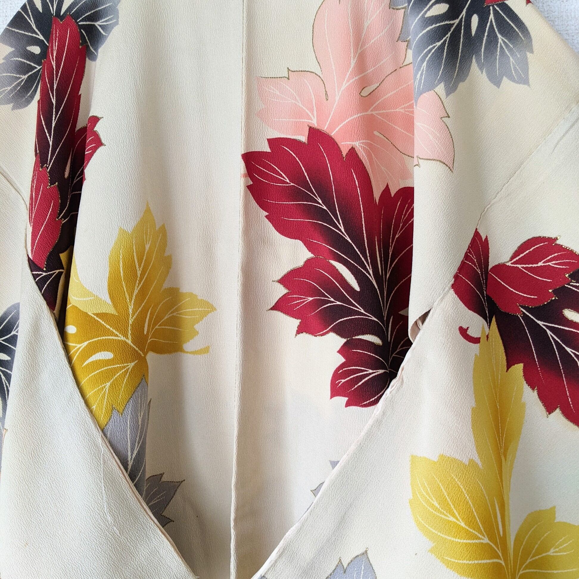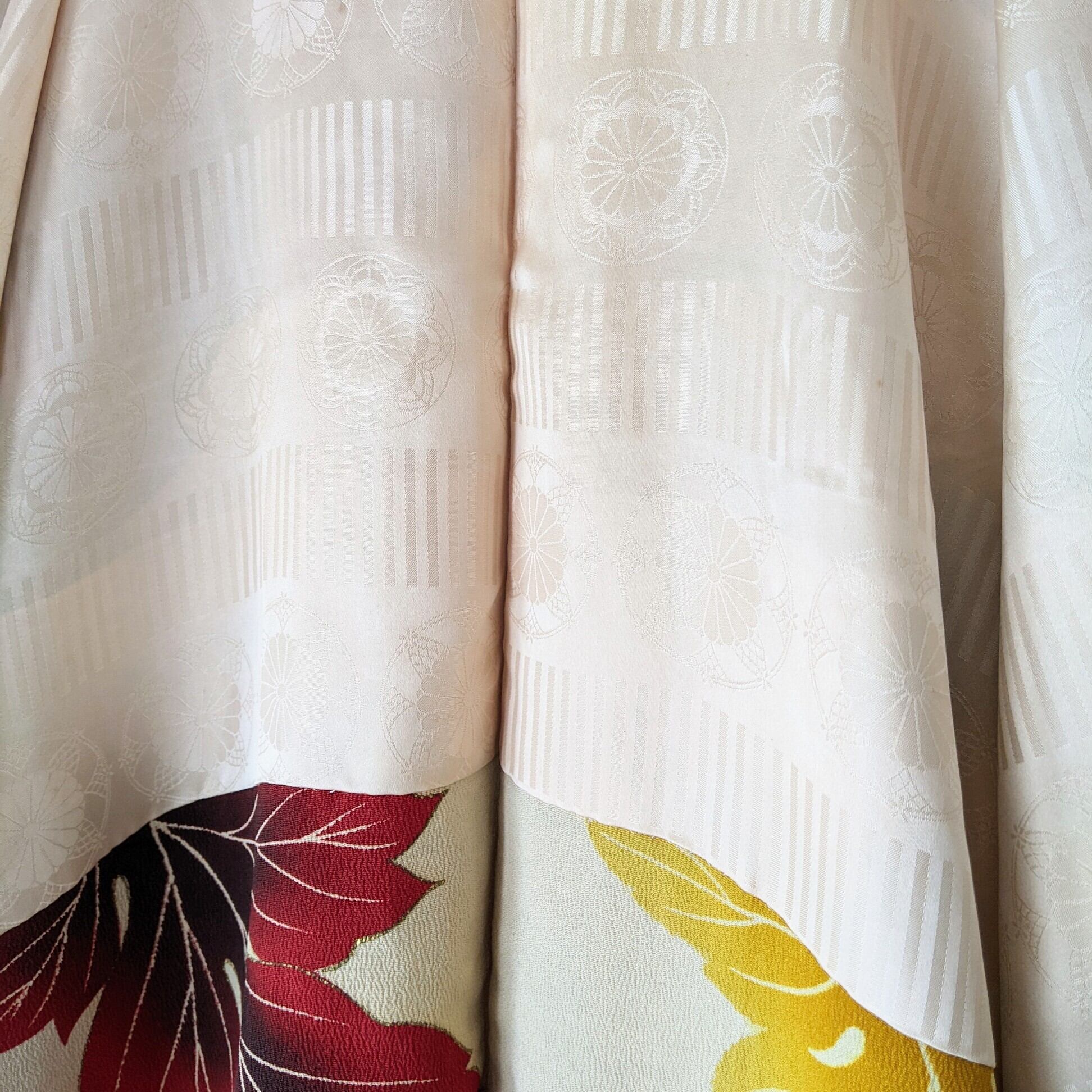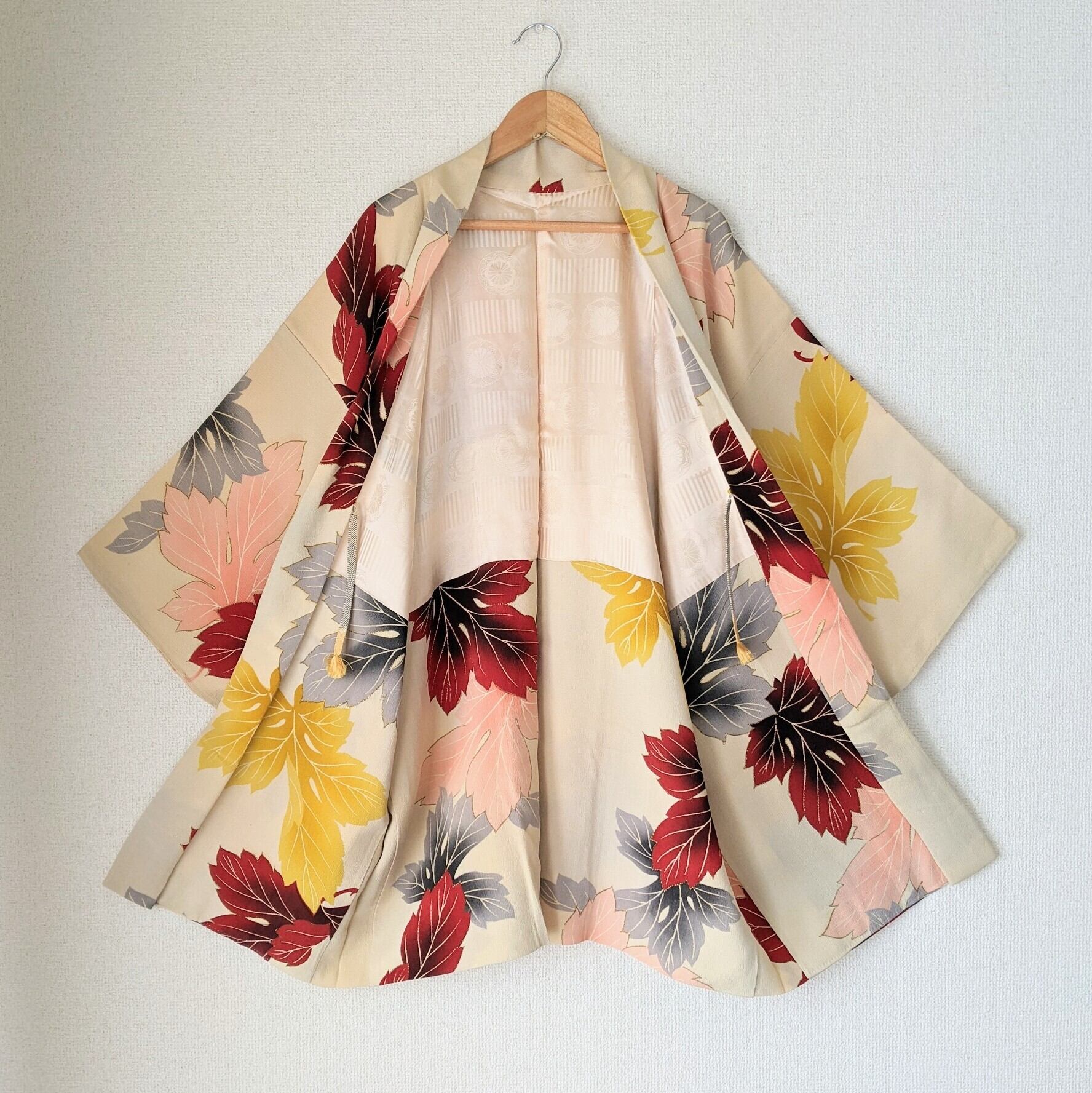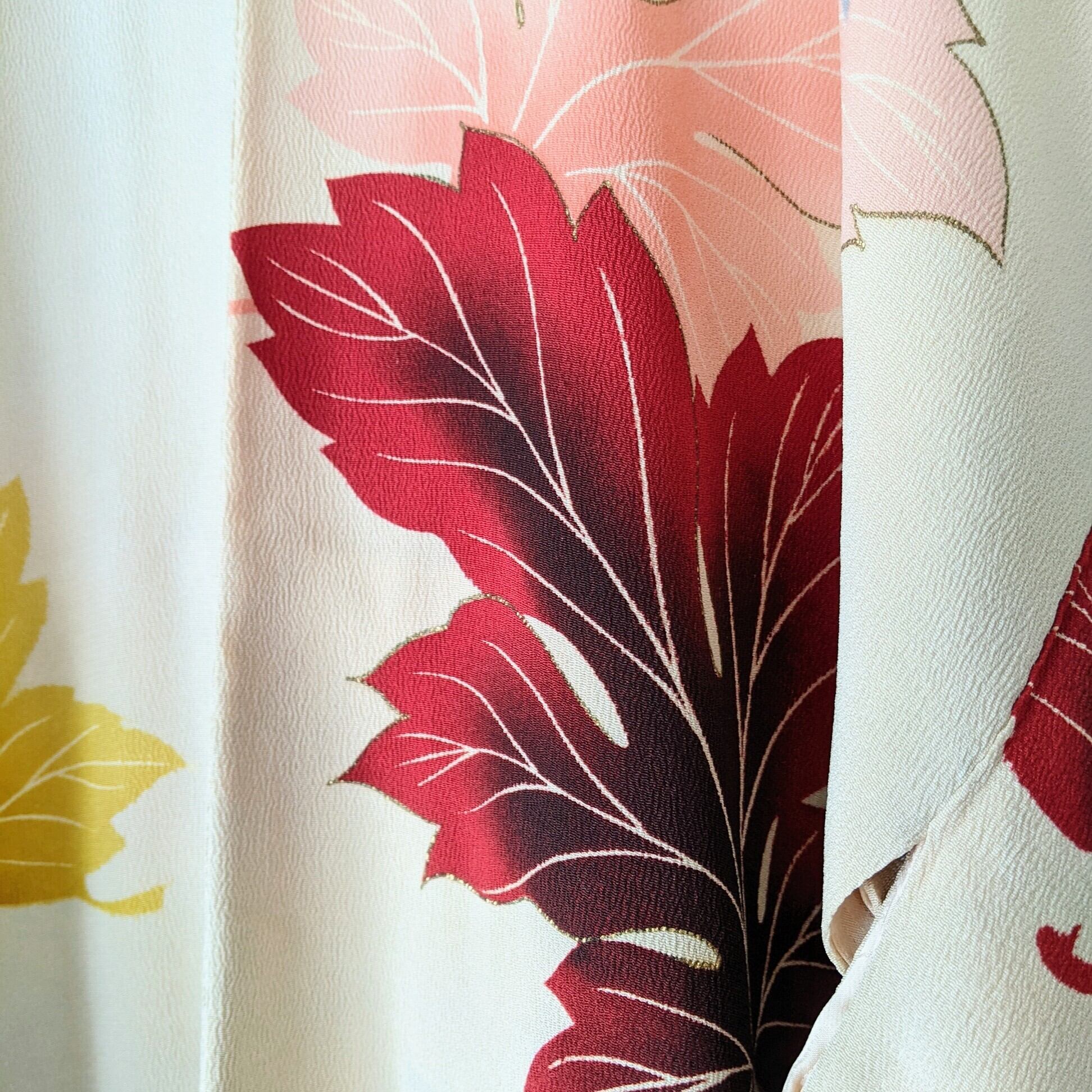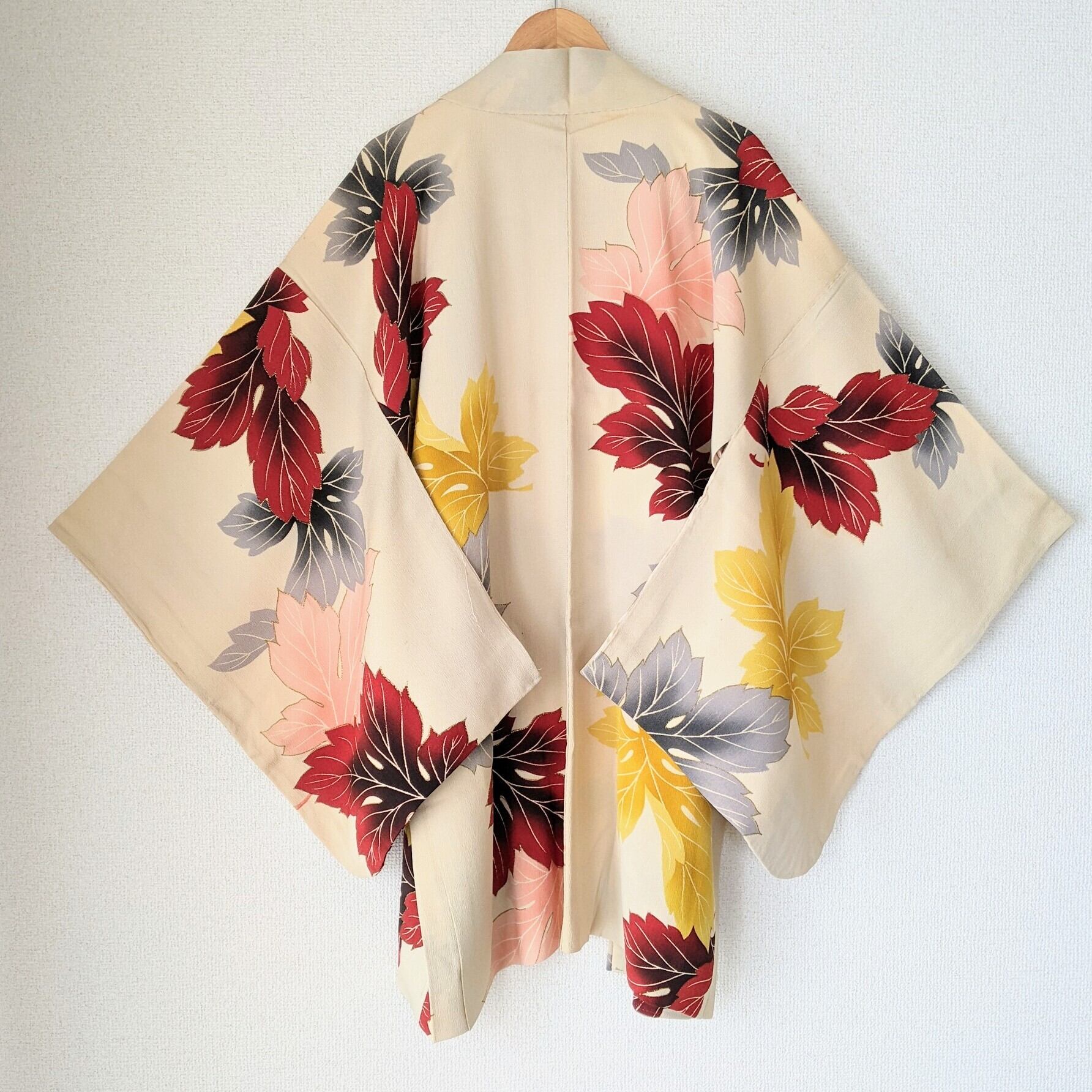 【Vintage】HAORI 羽織 正絹 紅葉柄 ベージュ 縮緬 シルク 大正浪漫 ガウン