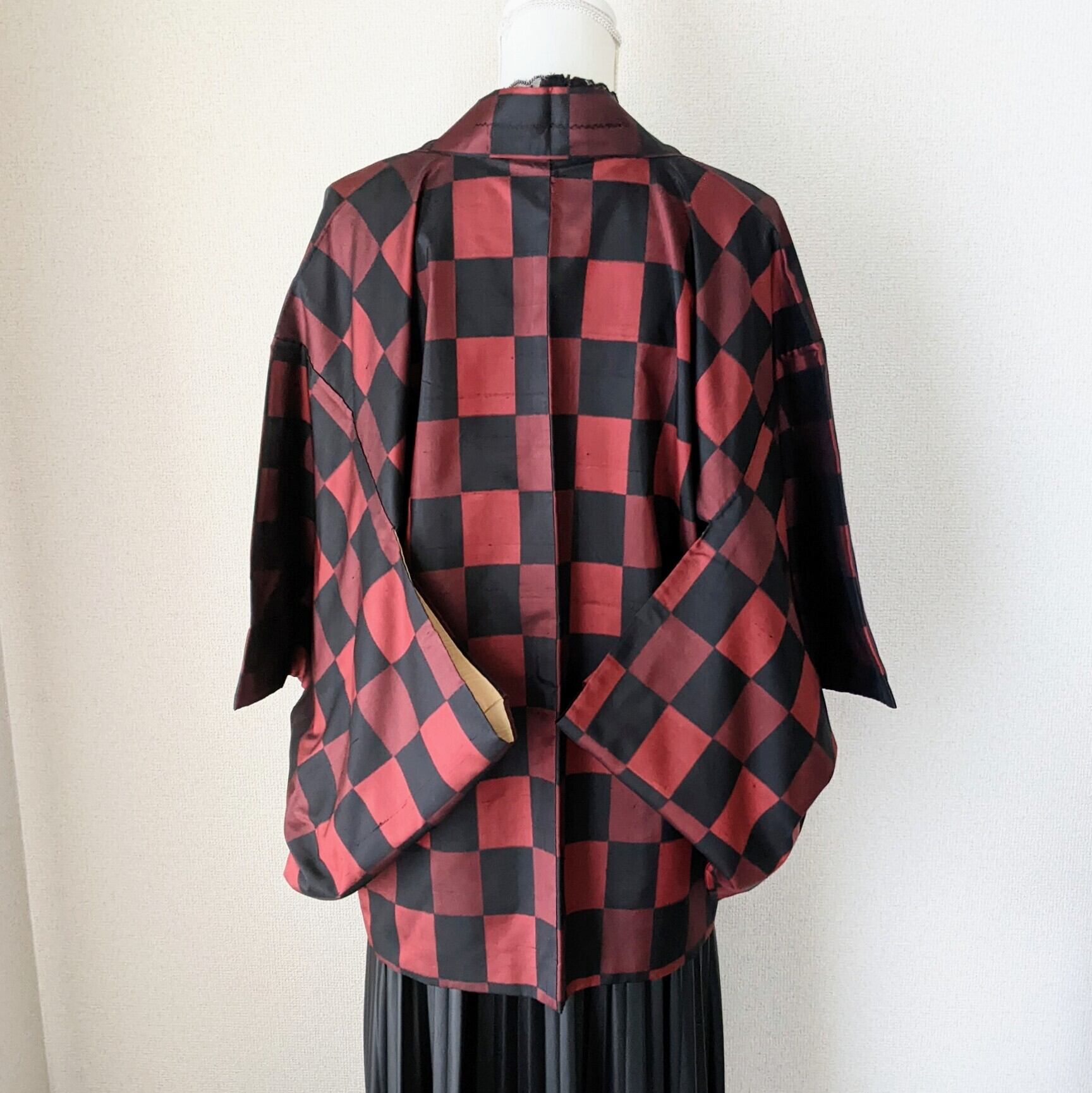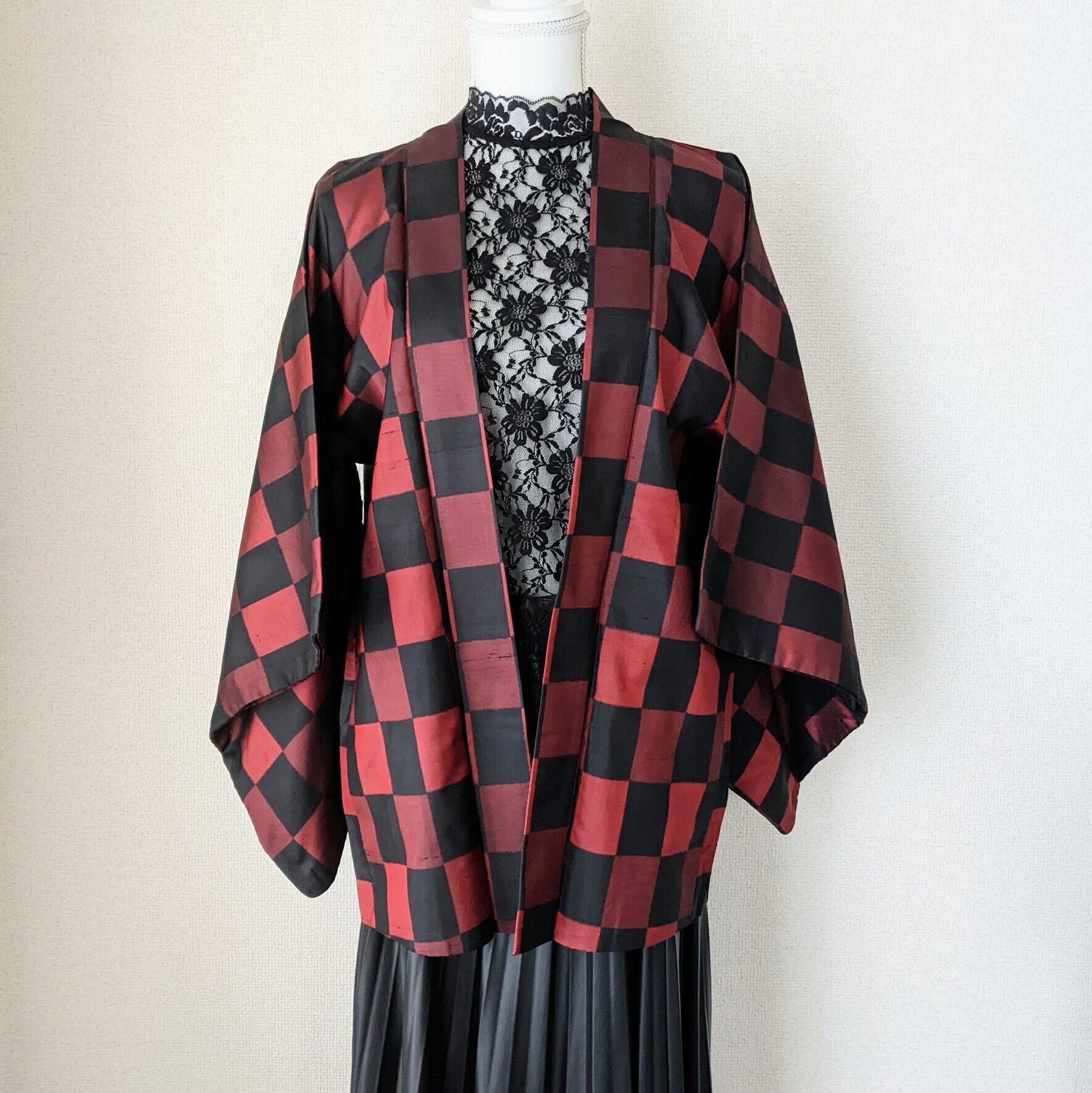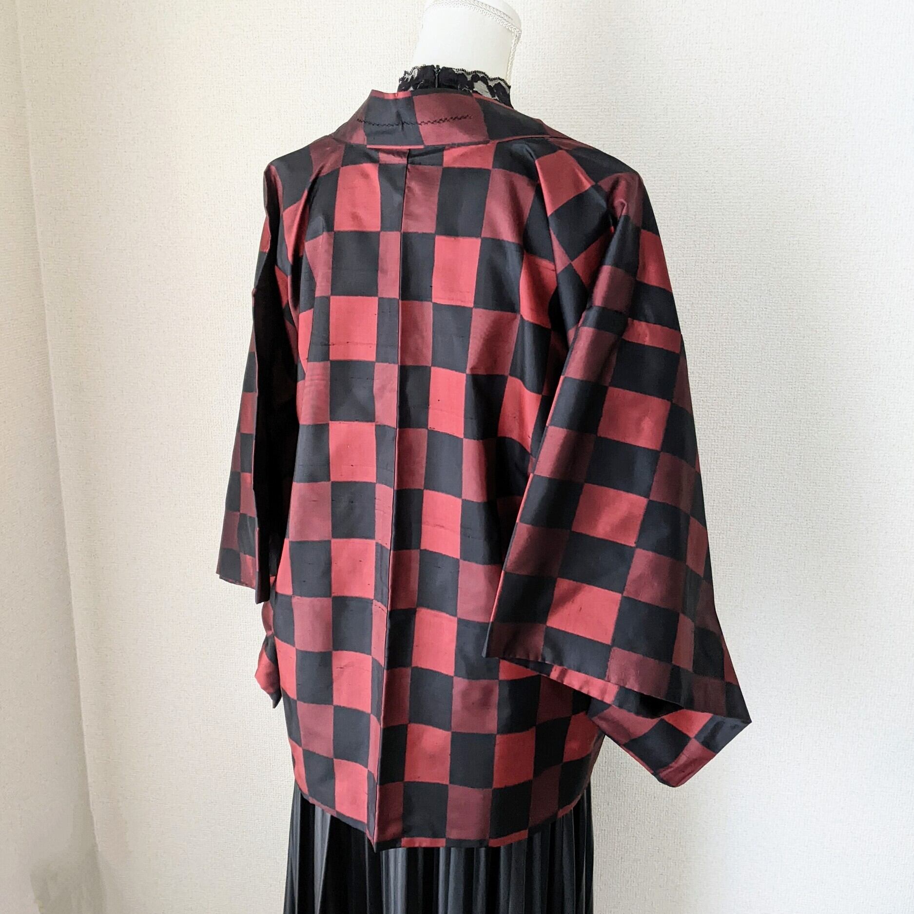 【Vintage】HAORI 羽織 正絹 赤と黒 ブロックチェック シルク 大正浪漫 和洋折衷