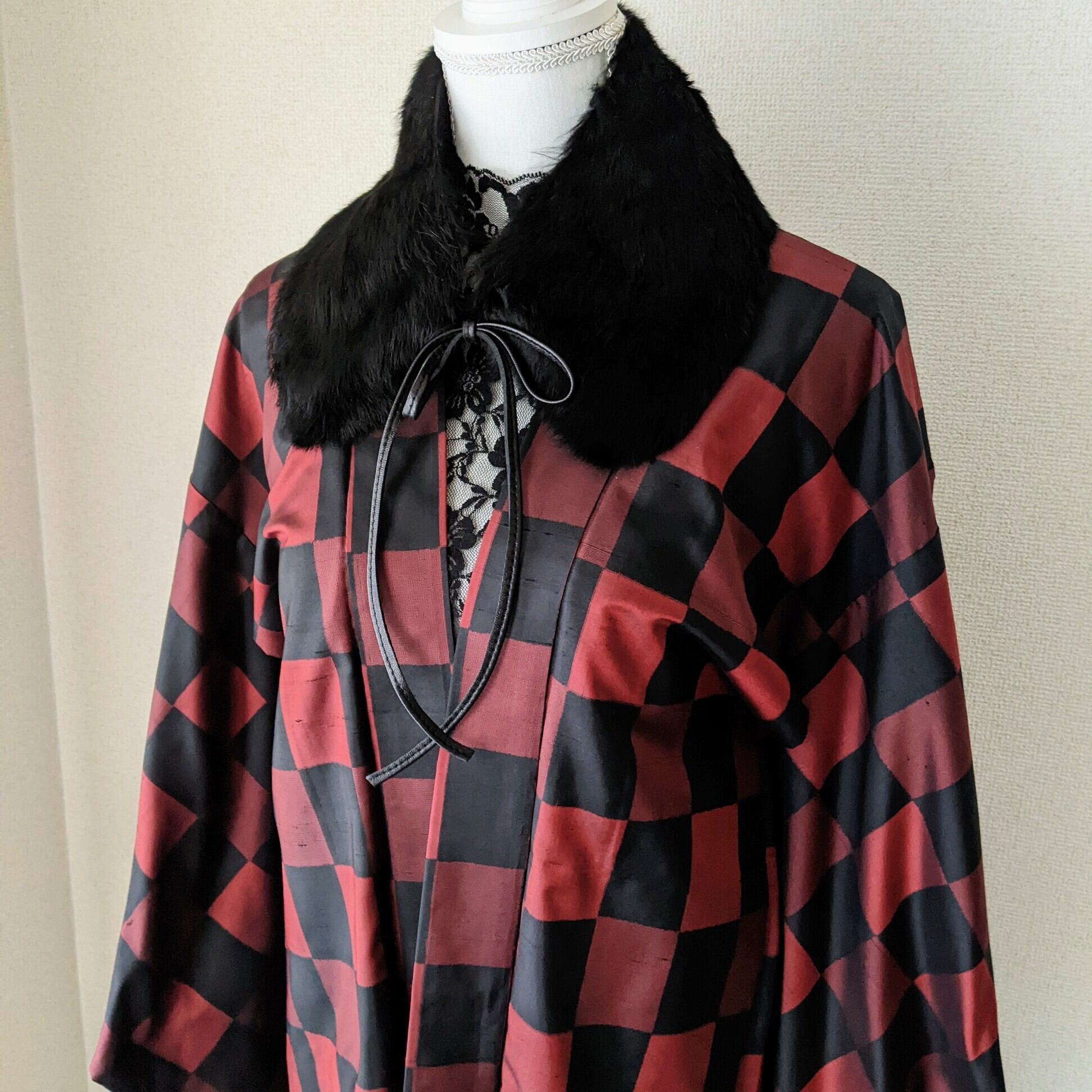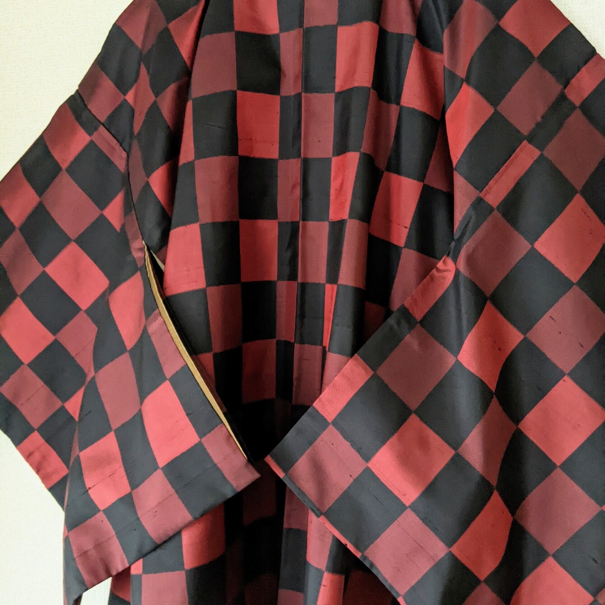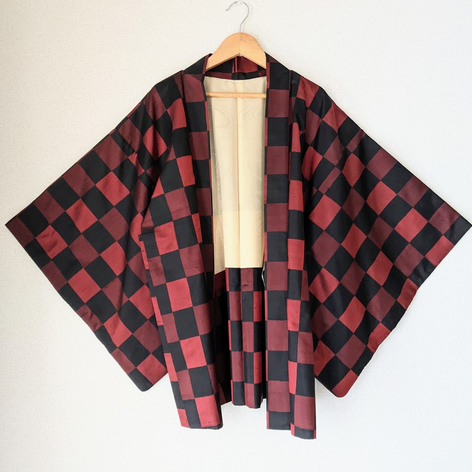 【Vintage】HAORI 羽織 正絹 赤と黒 ブロックチェック シルク 大正浪漫 和洋折衷