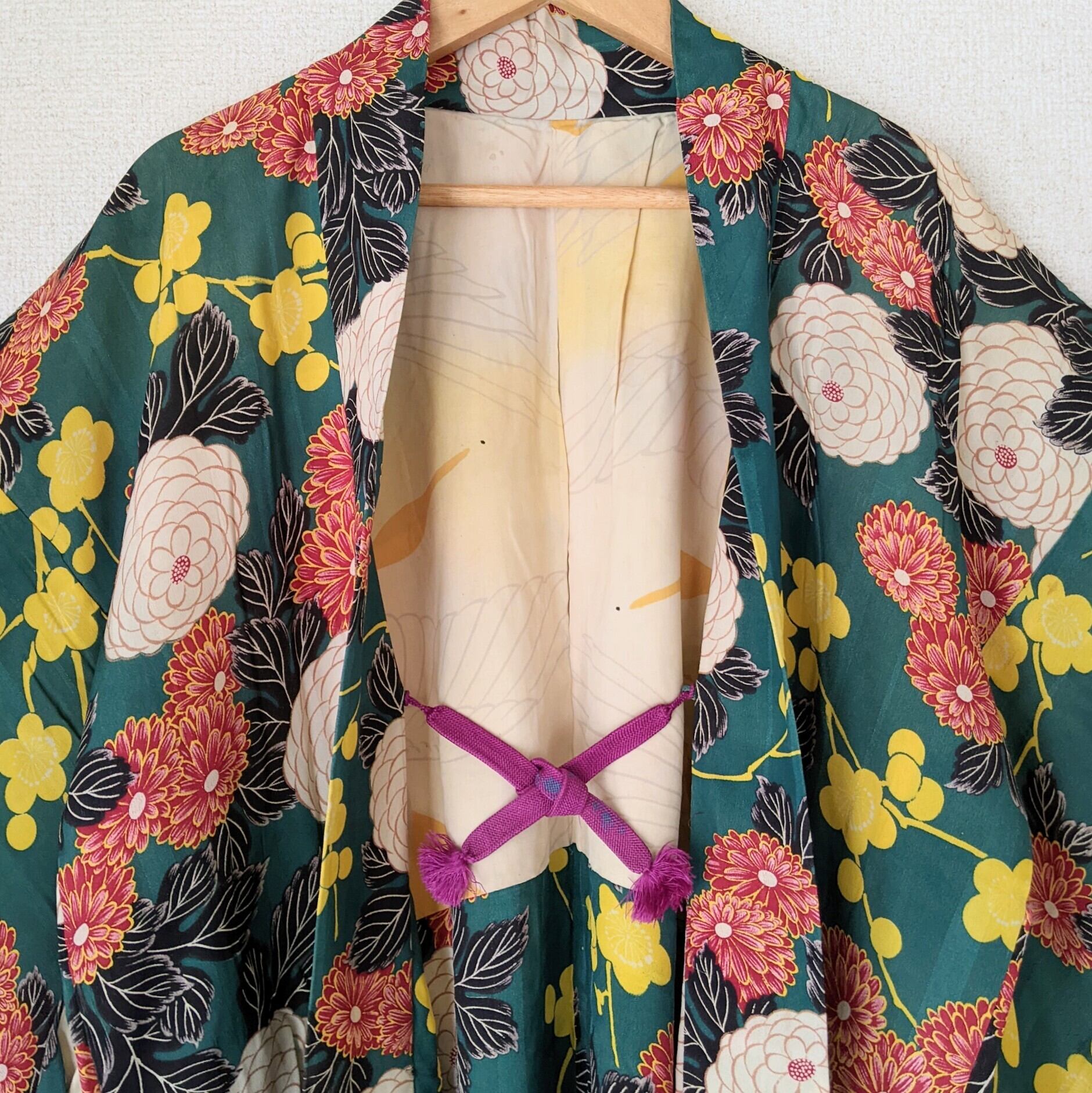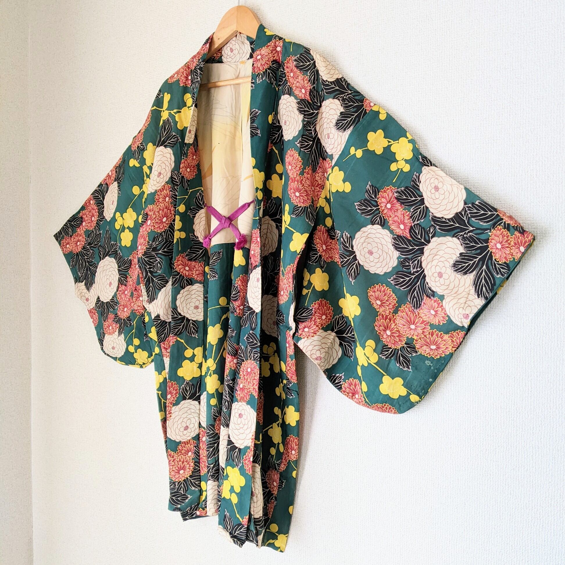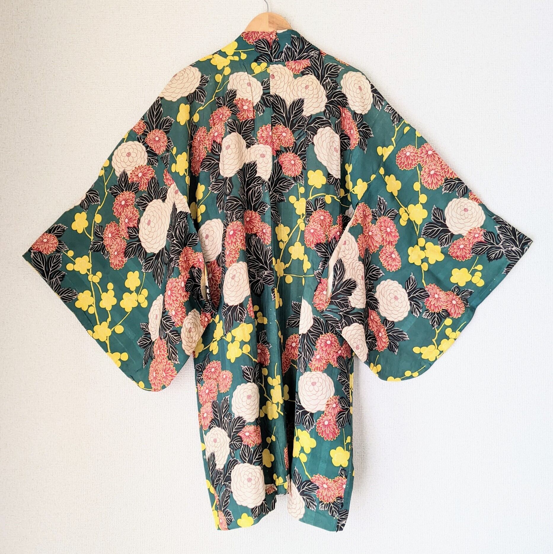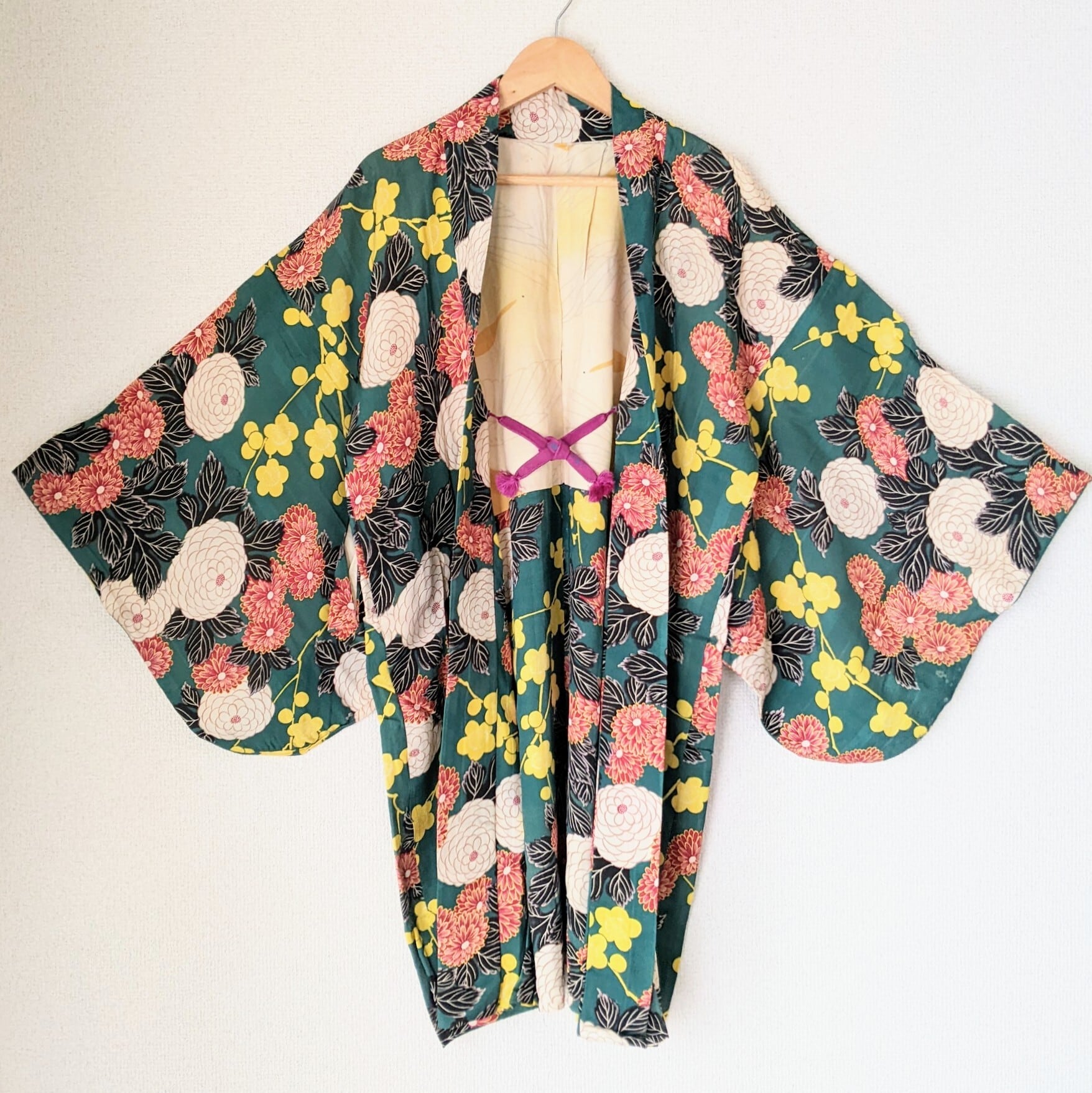 【Vintage】HAORI 羽織 正絹 深緑 紅白菊 裏地が可愛い 縮緬 シルク 大正浪漫 和洋折衷 和柄