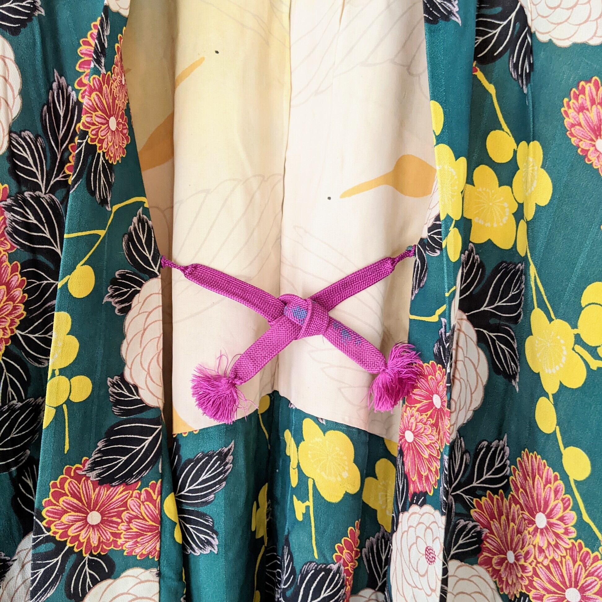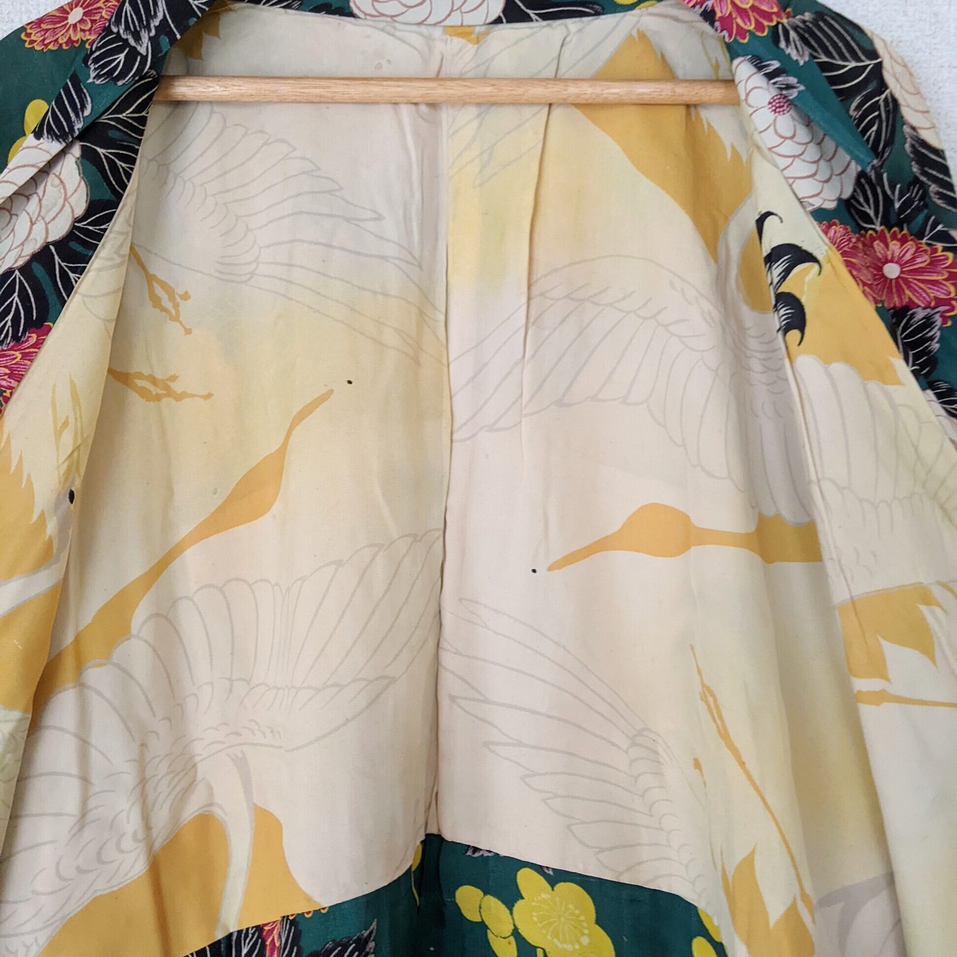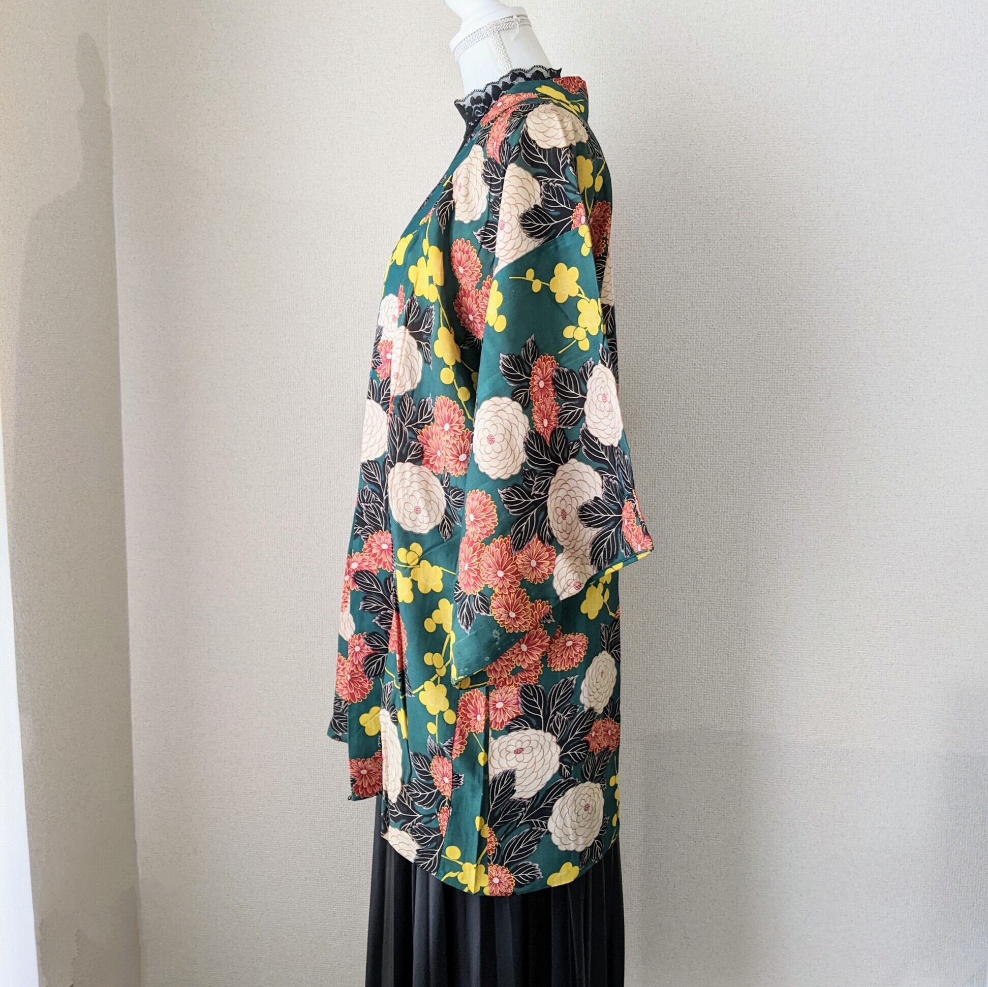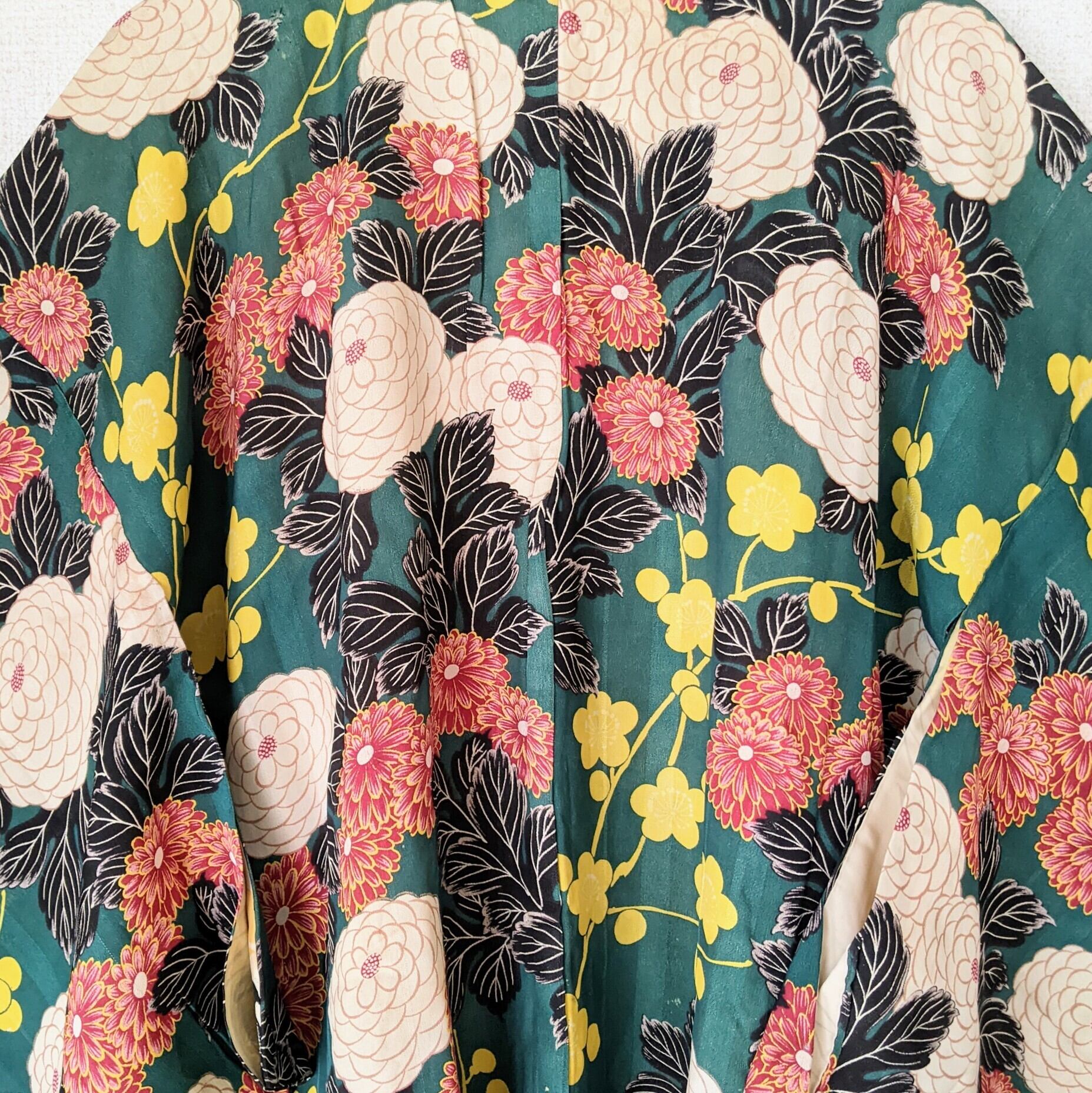 【Vintage】HAORI 羽織 正絹 深緑 紅白菊 裏地が可愛い 縮緬 シルク 大正浪漫 和洋折衷 和柄