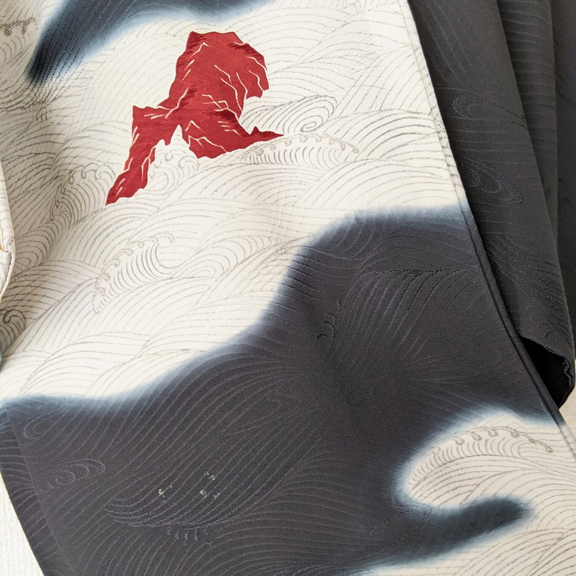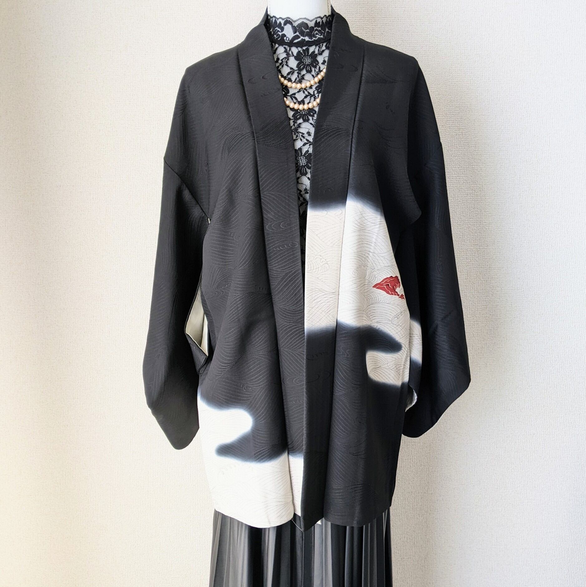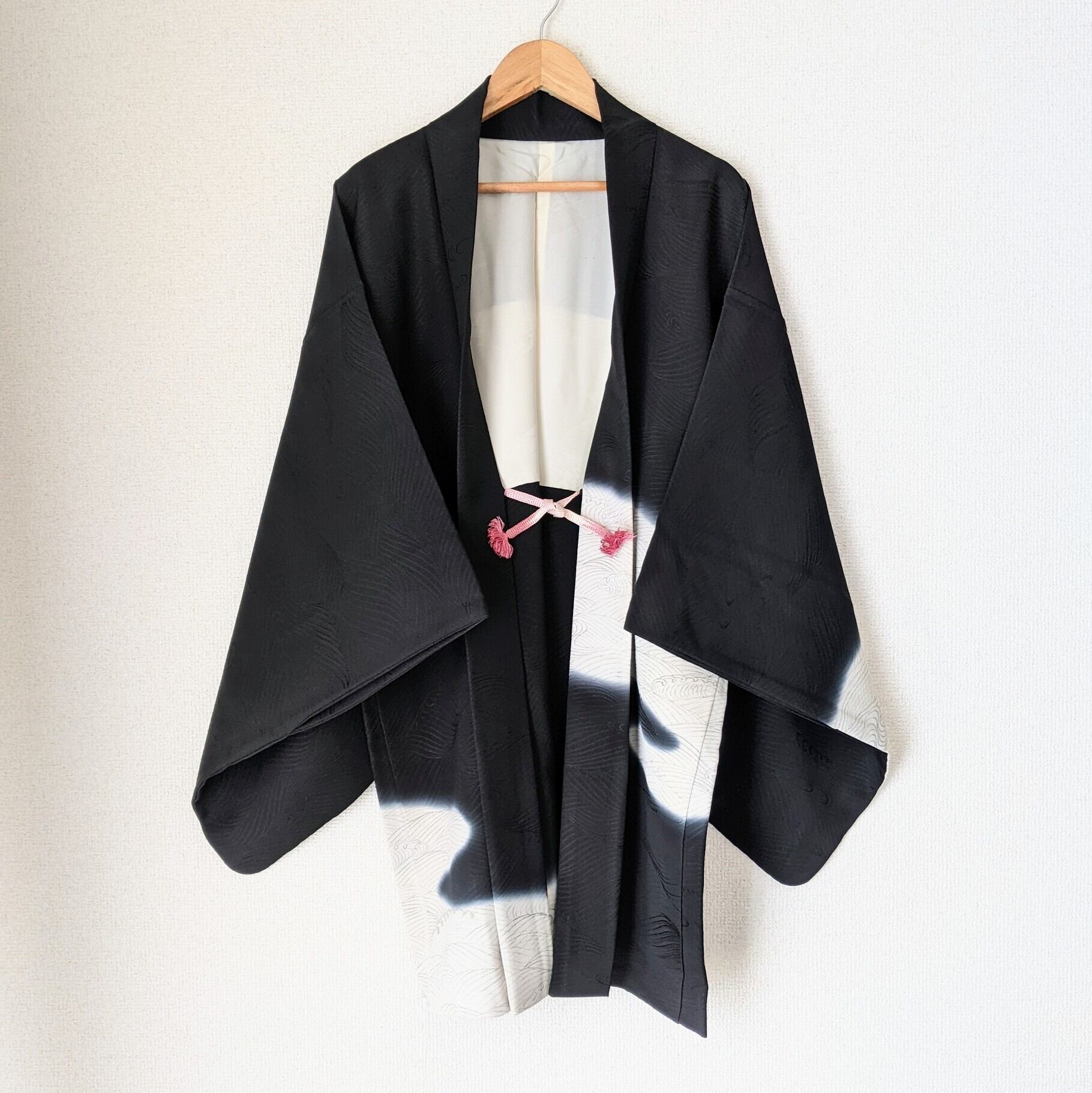 【Vintage】HAORI 羽織 正絹 黒羽織 暈し 荒波に岩 波紋 地紋 シルク 大正浪漫 和洋折衷