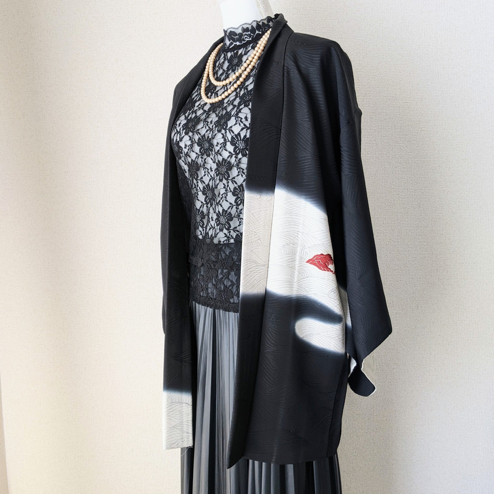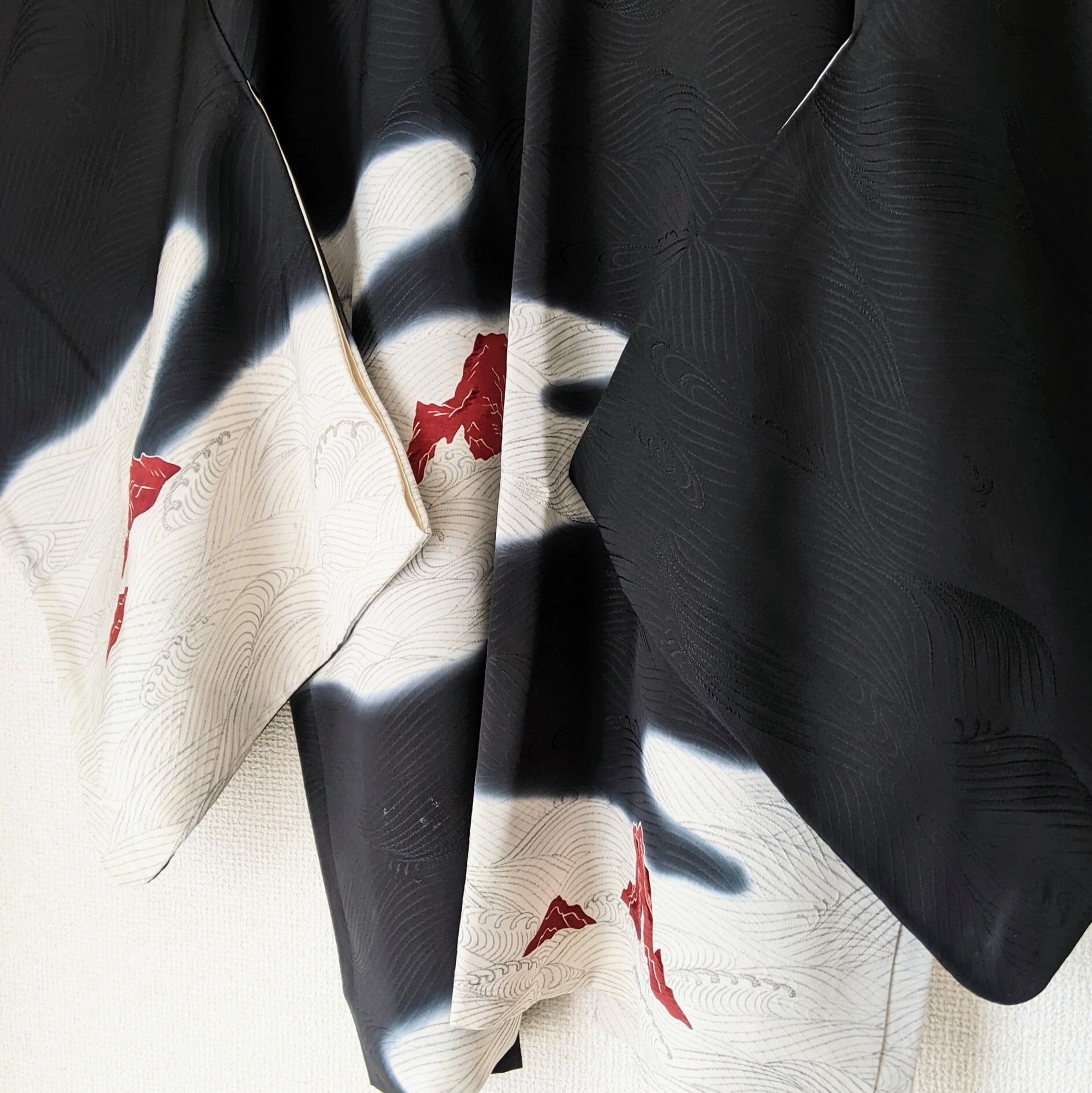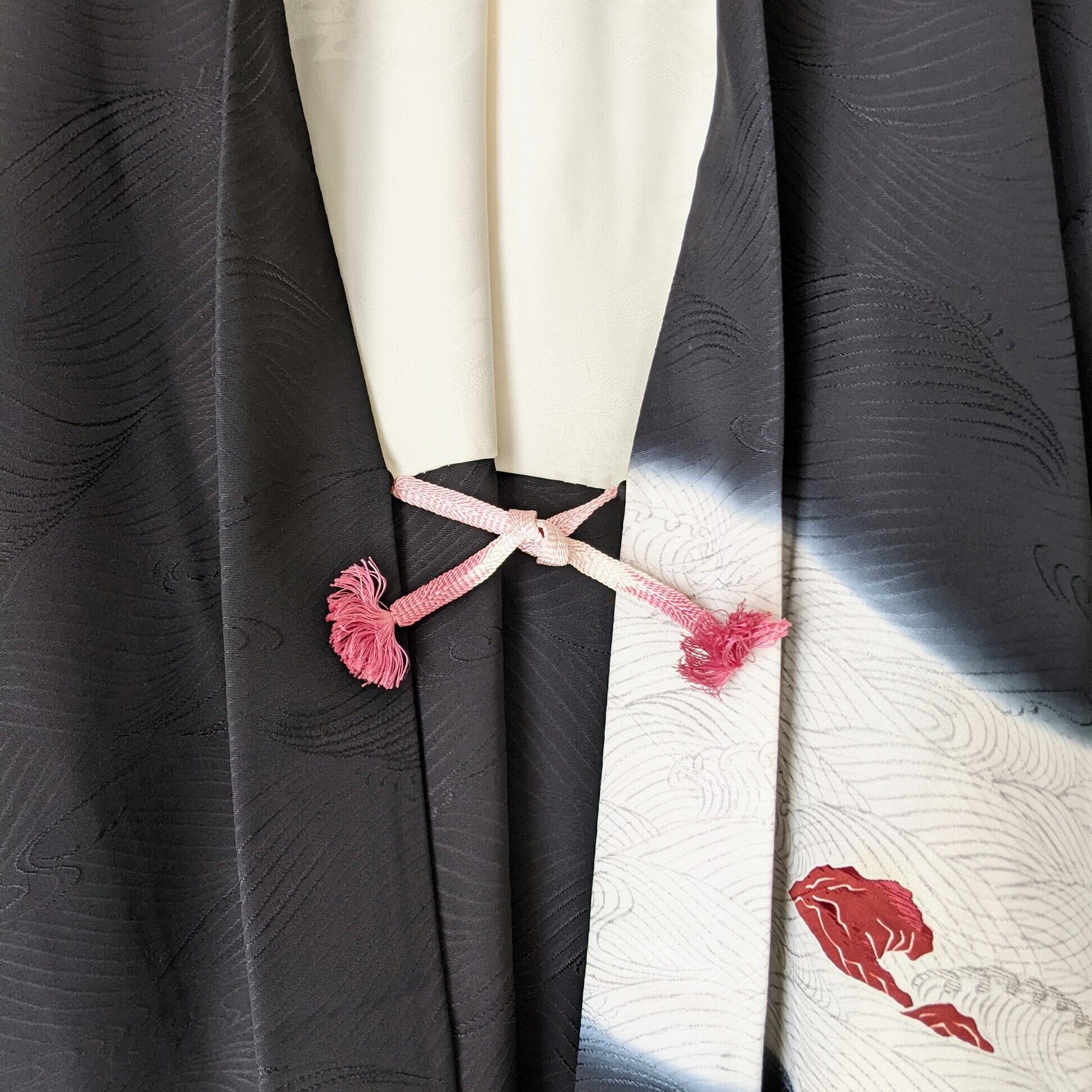 岩に波が打ちつけられて波飛沫を上げている様子を現した羽織。波飛沫は暈し染めで表現されています。
