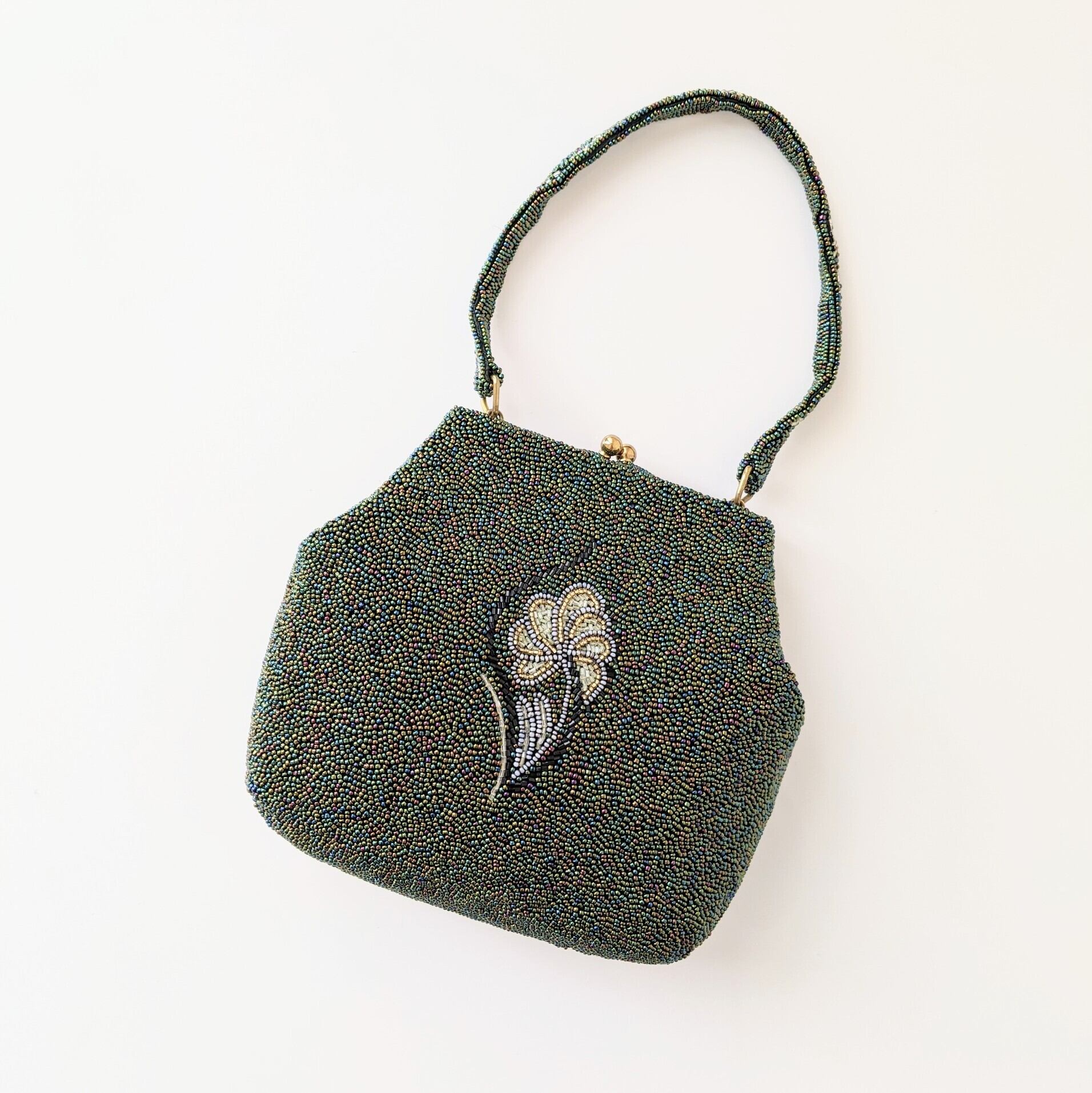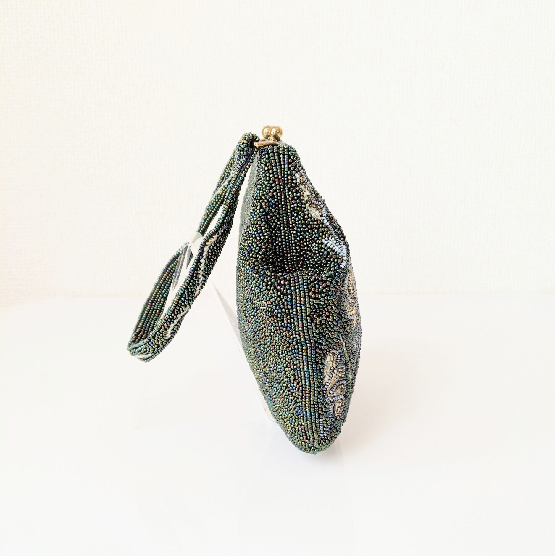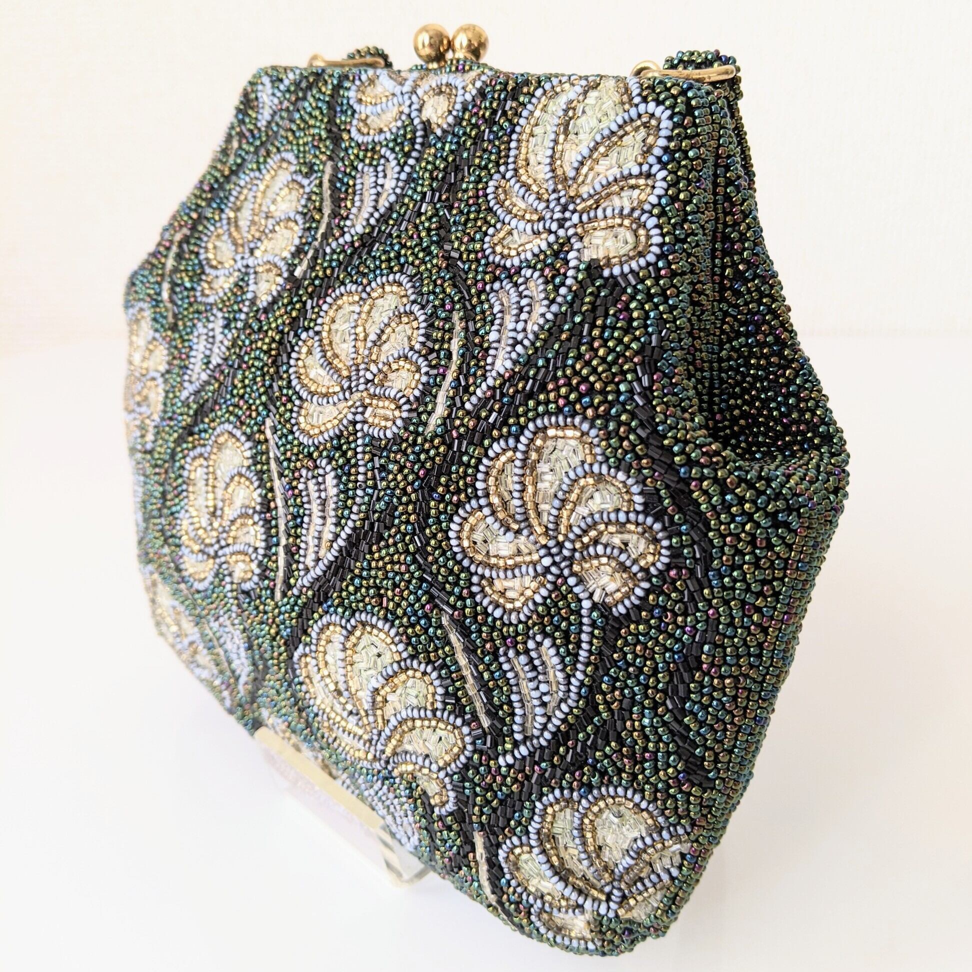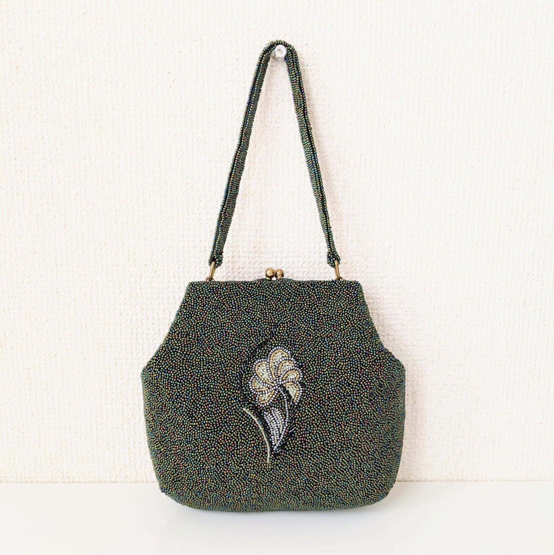 【Vintage】ビーズ刺繍バッグ Vintage Beaded Bag 深緑 花模様 パーティーバッグ 昭和レトロ 大正浪漫 フォーマルバッグ