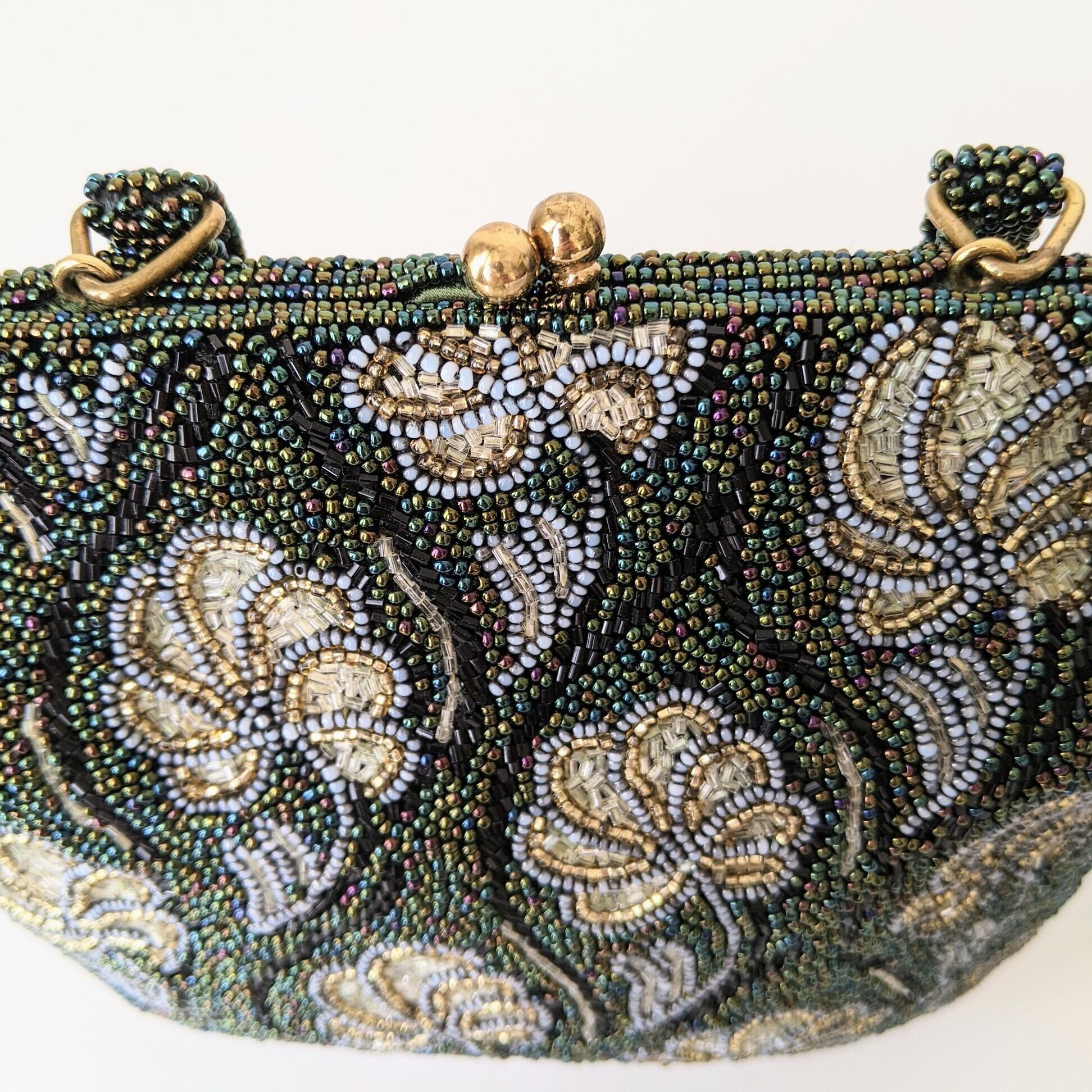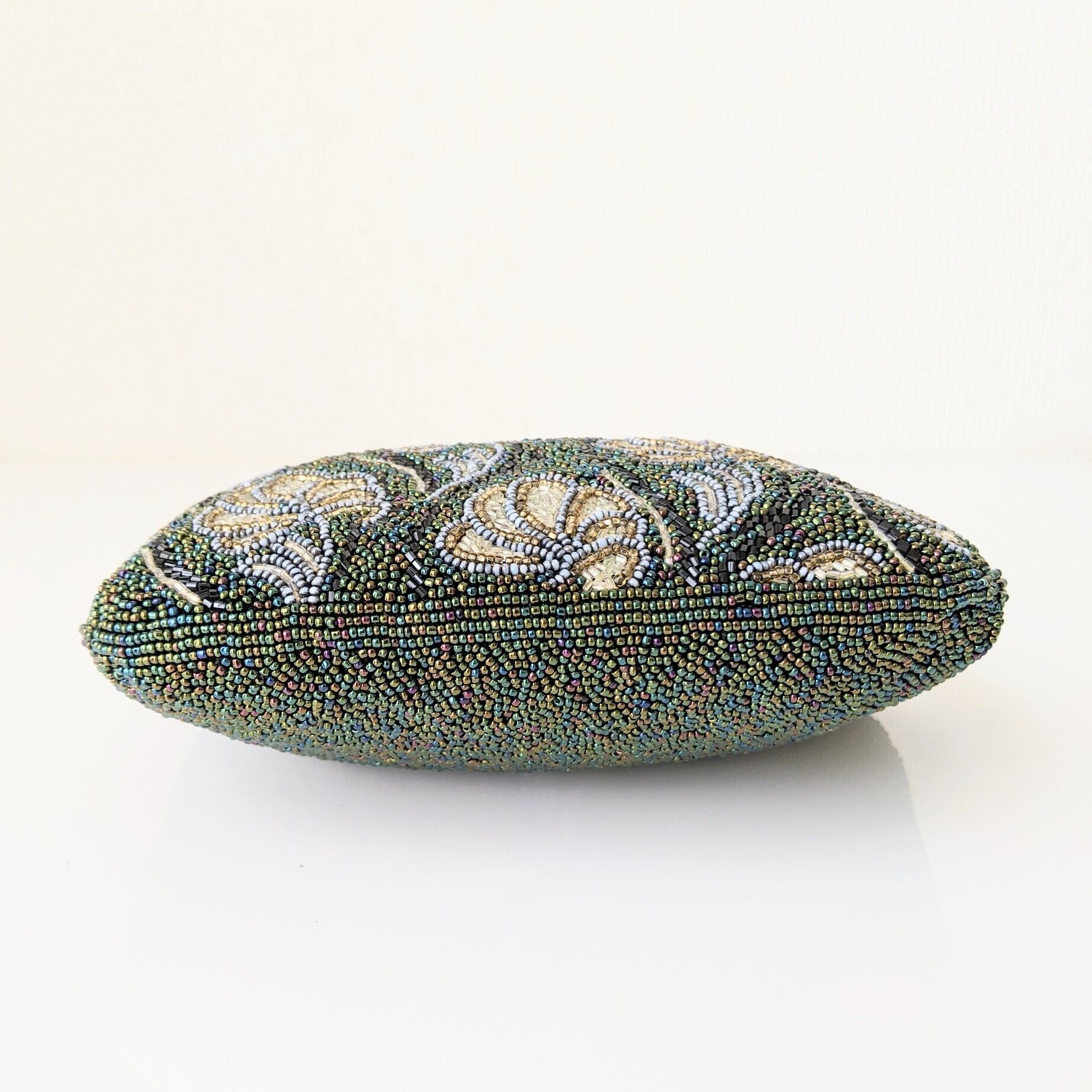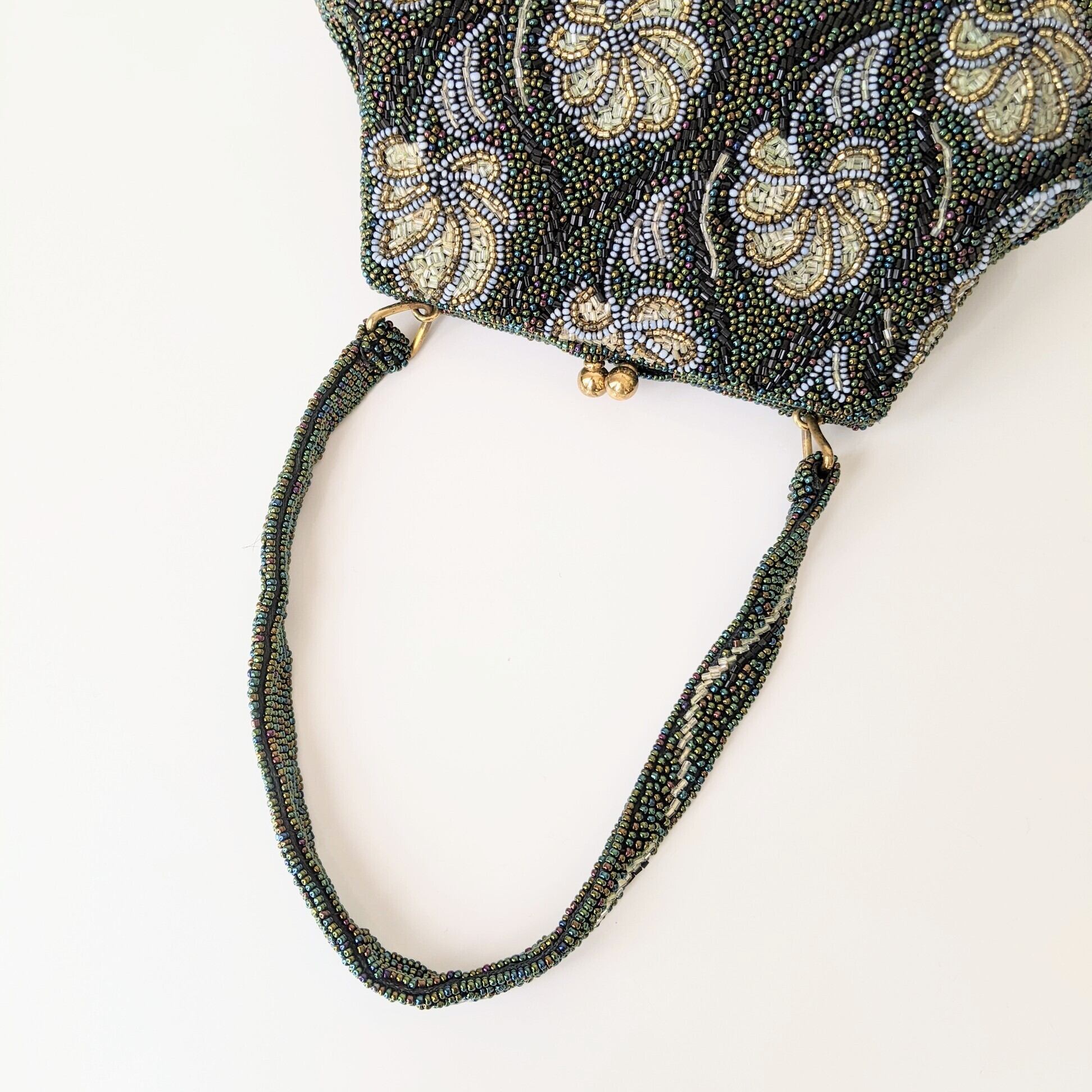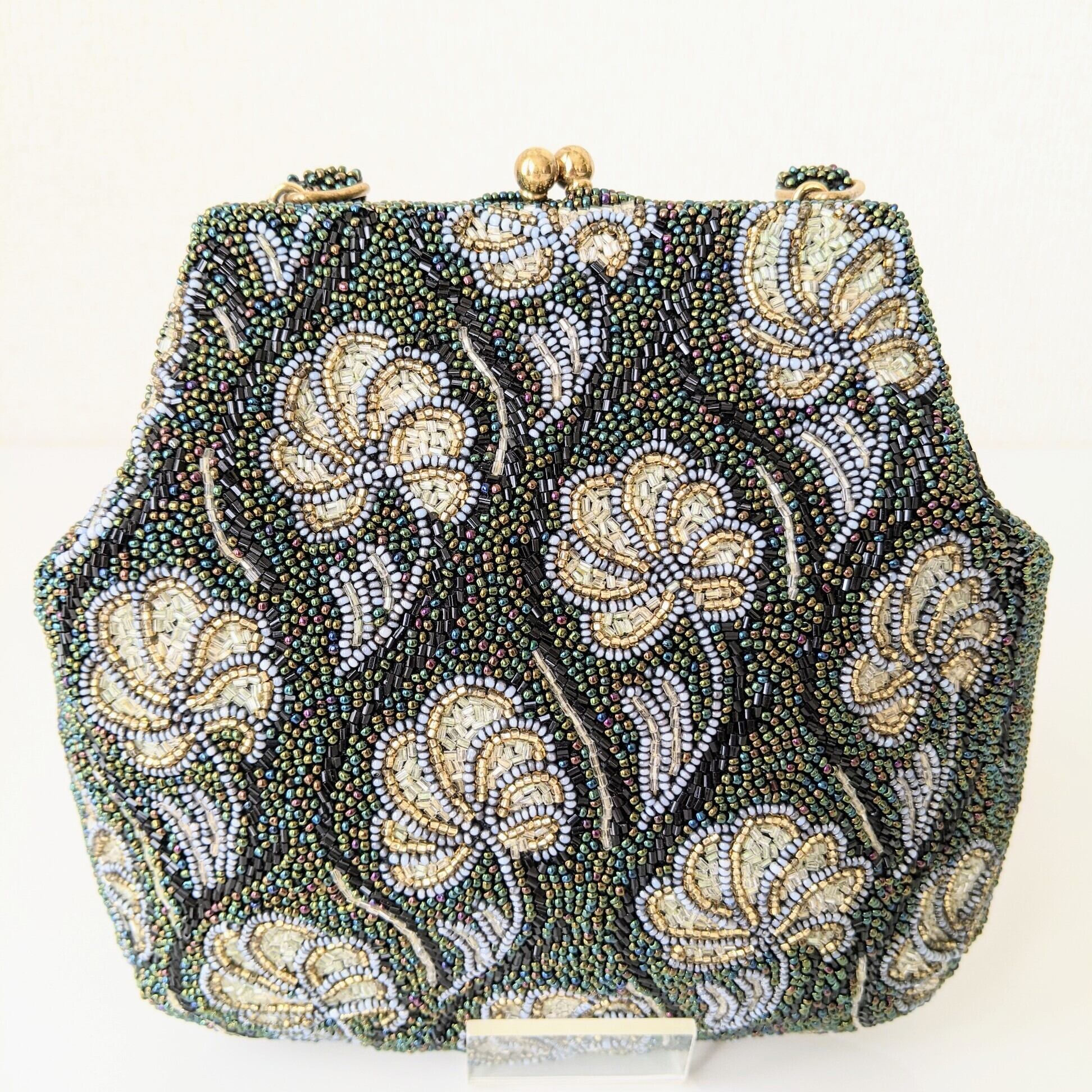 【Vintage】ビーズ刺繍バッグ Vintage Beaded Bag 深緑 花模様 パーティーバッグ 昭和レトロ 大正浪漫 フォーマルバッグ