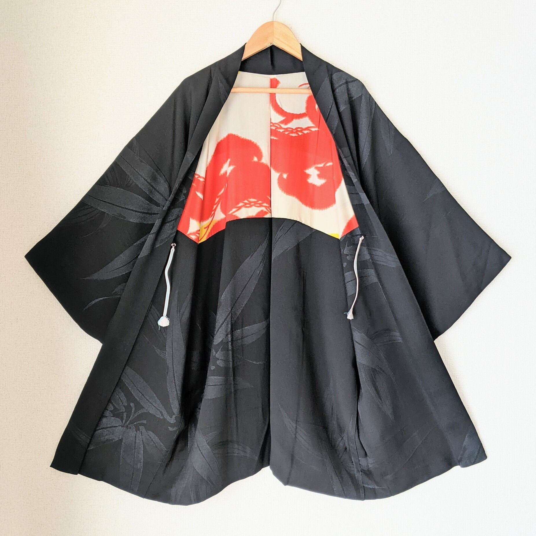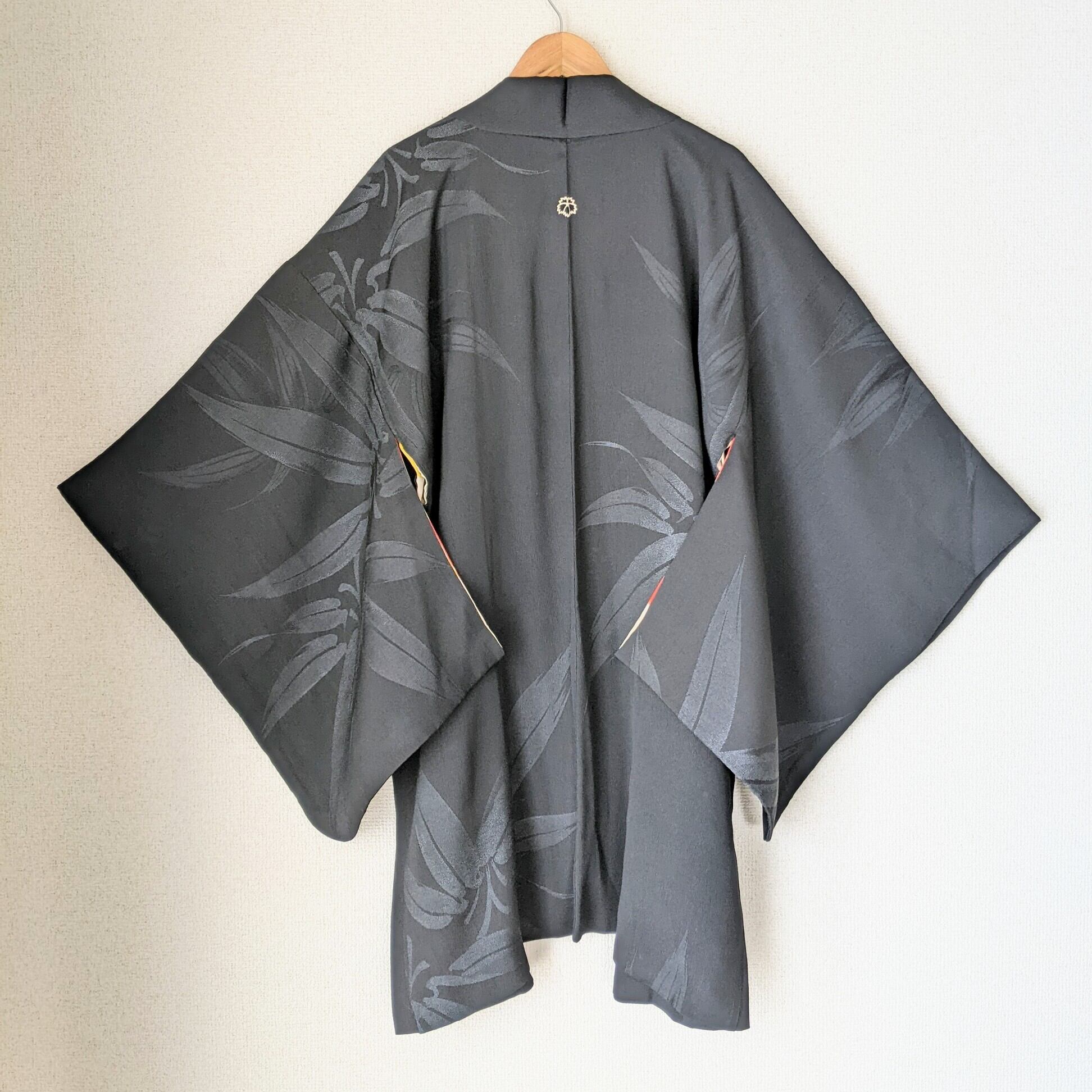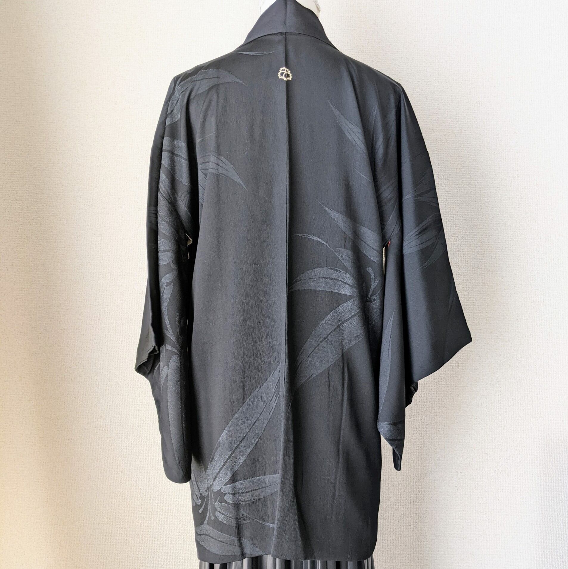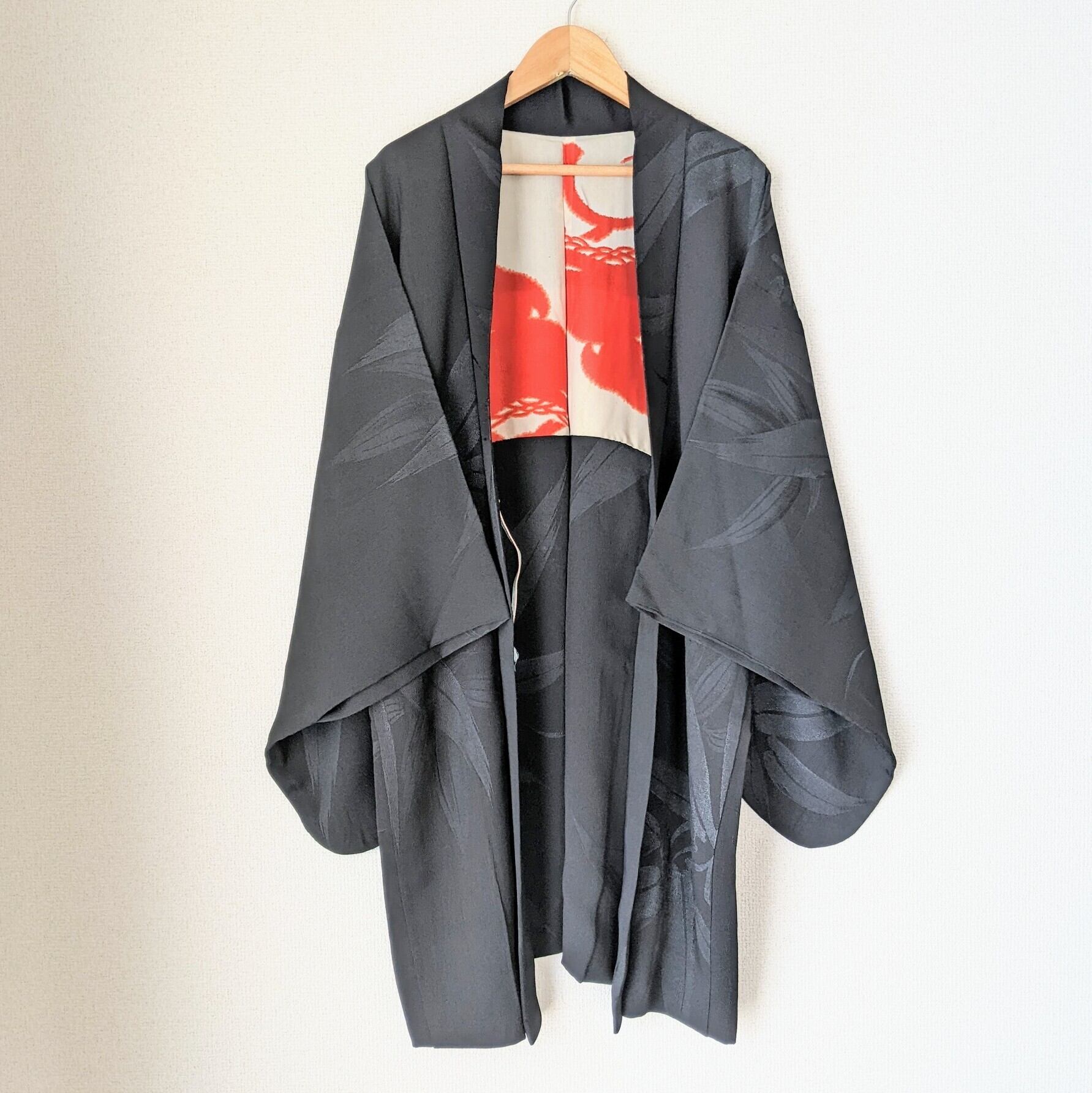 【Vintage】HAORI 長羽織 正絹 黒 笹の葉の地紋 一つ紋 裏地が赤松 シルク 大正浪漫 和洋折衷
