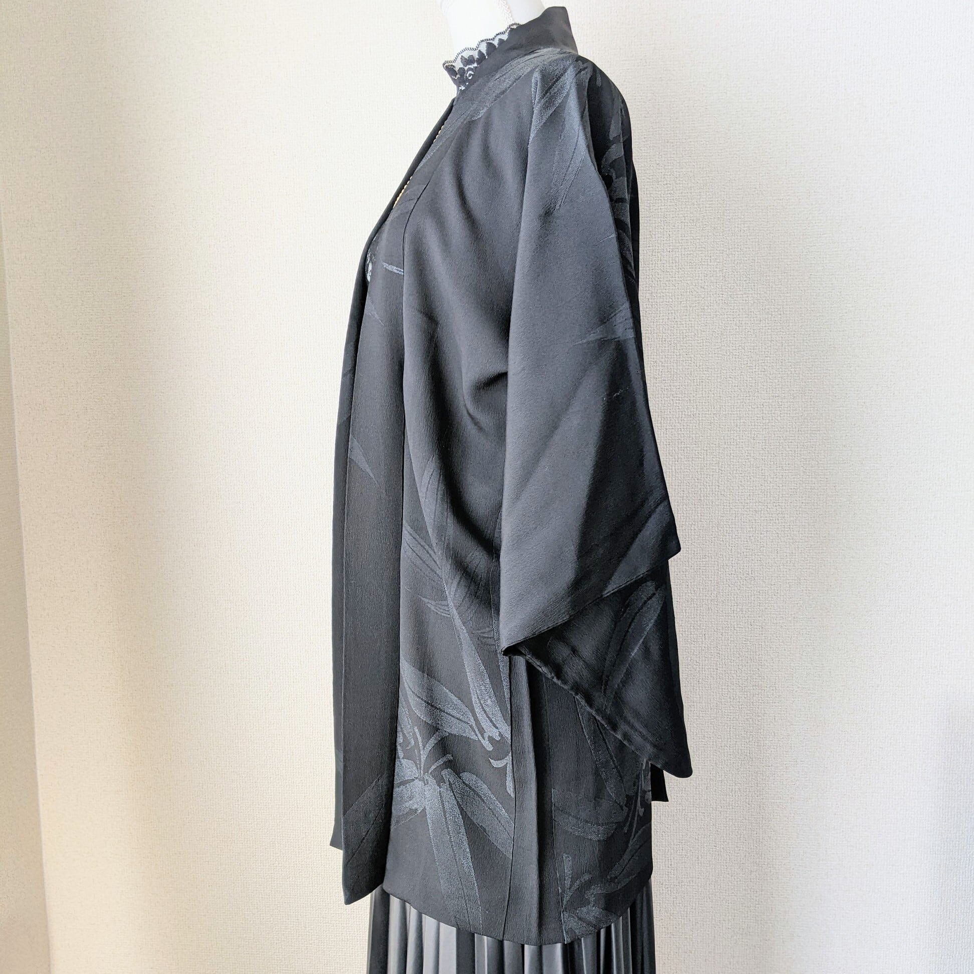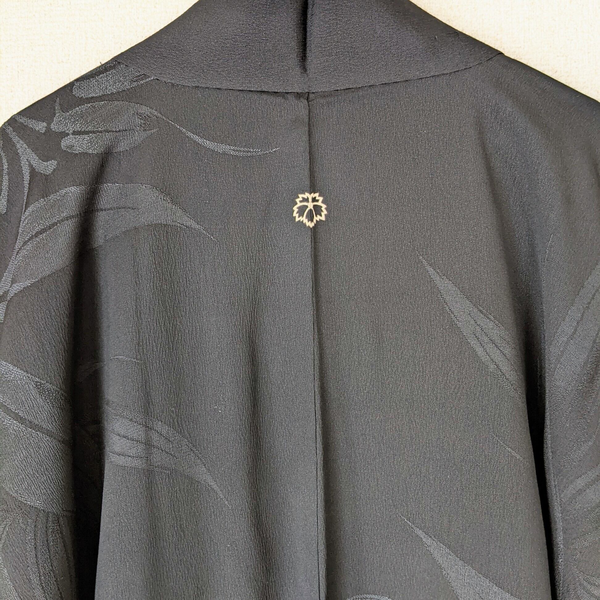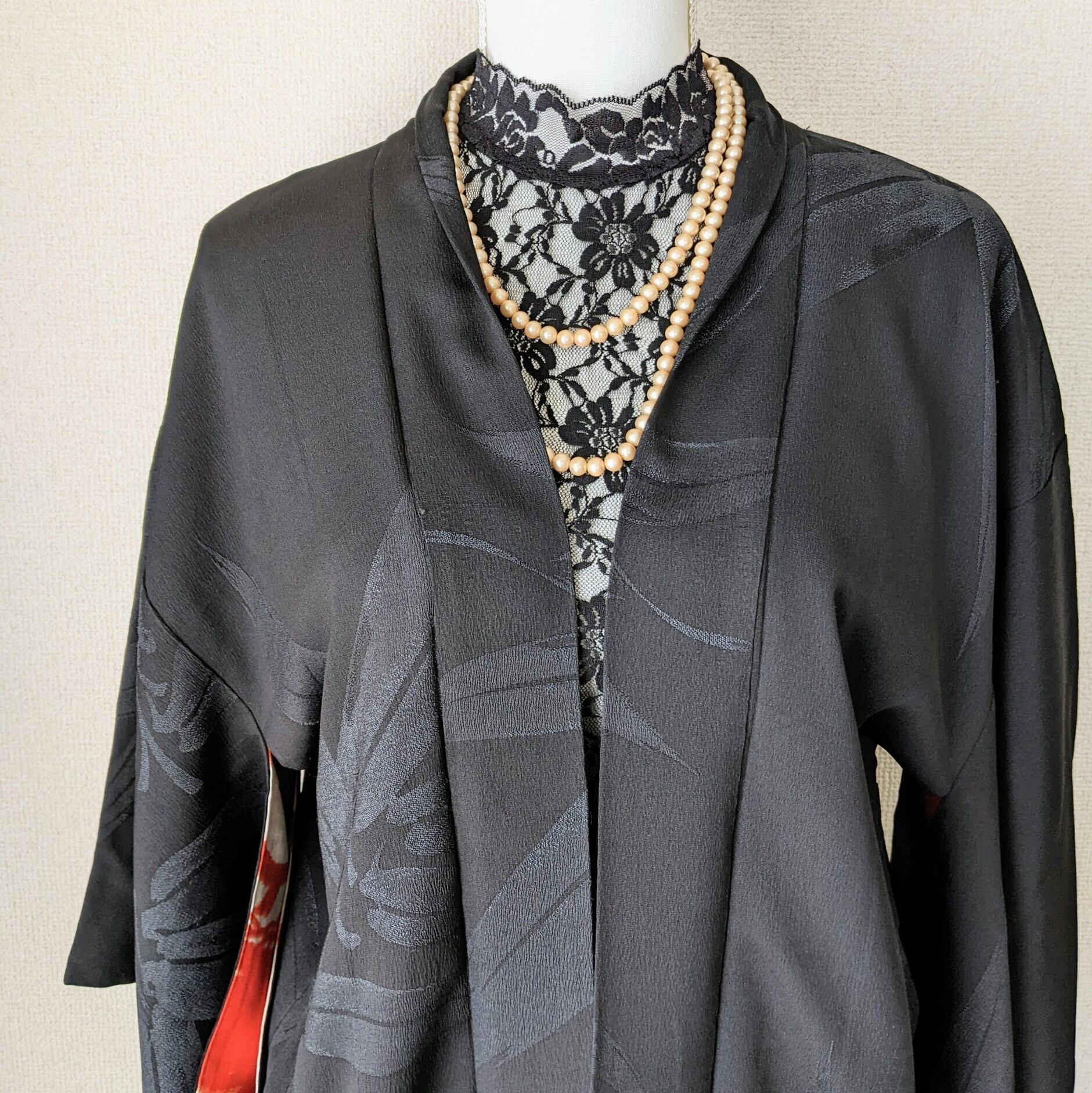 【Vintage】HAORI 長羽織 正絹 黒 笹の葉の地紋 一つ紋 裏地が赤松 シルク 大正浪漫 和洋折衷