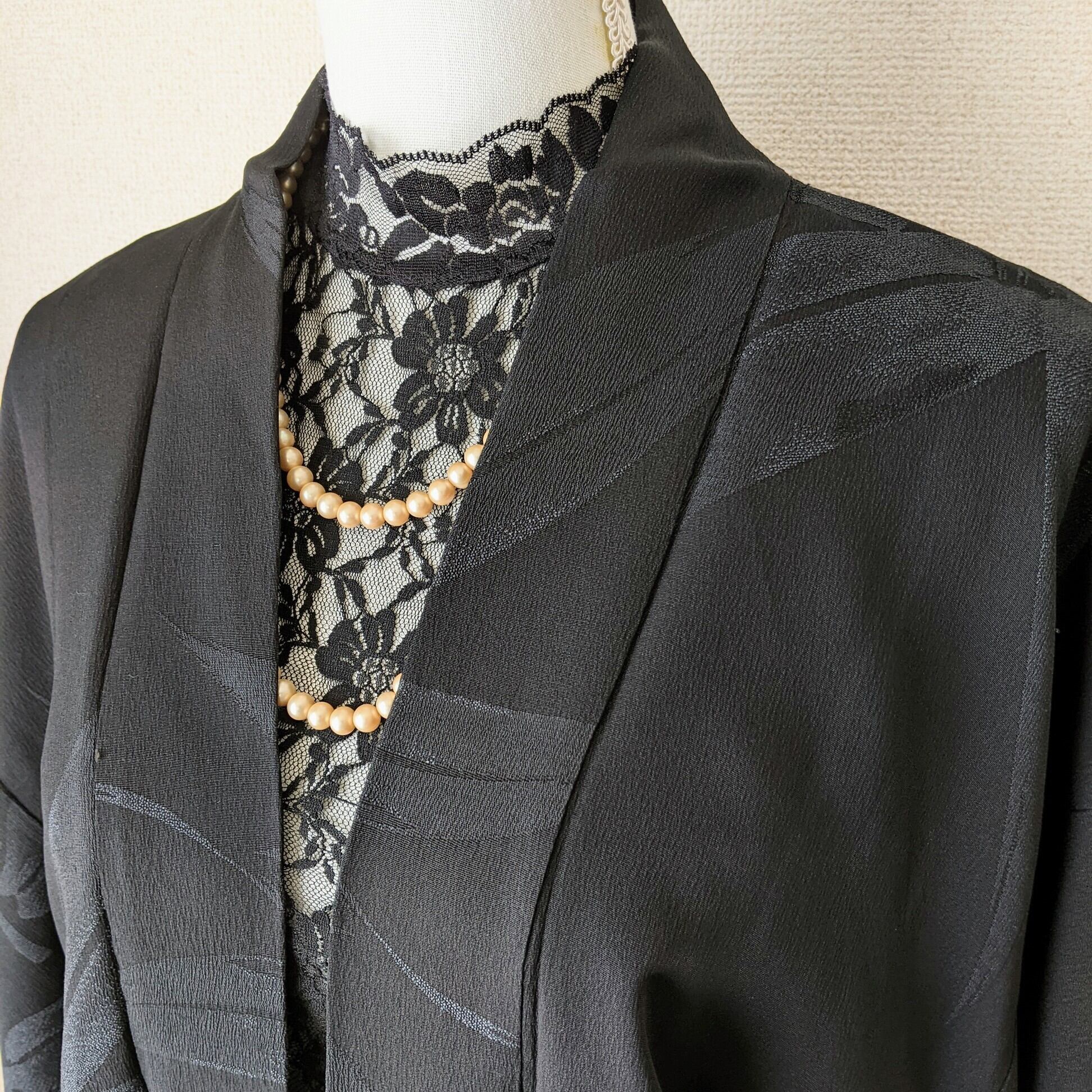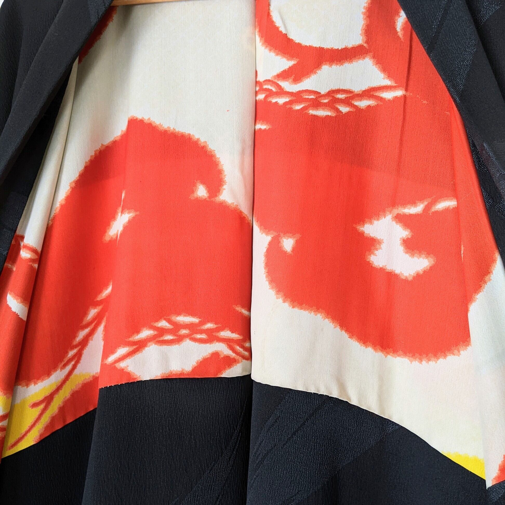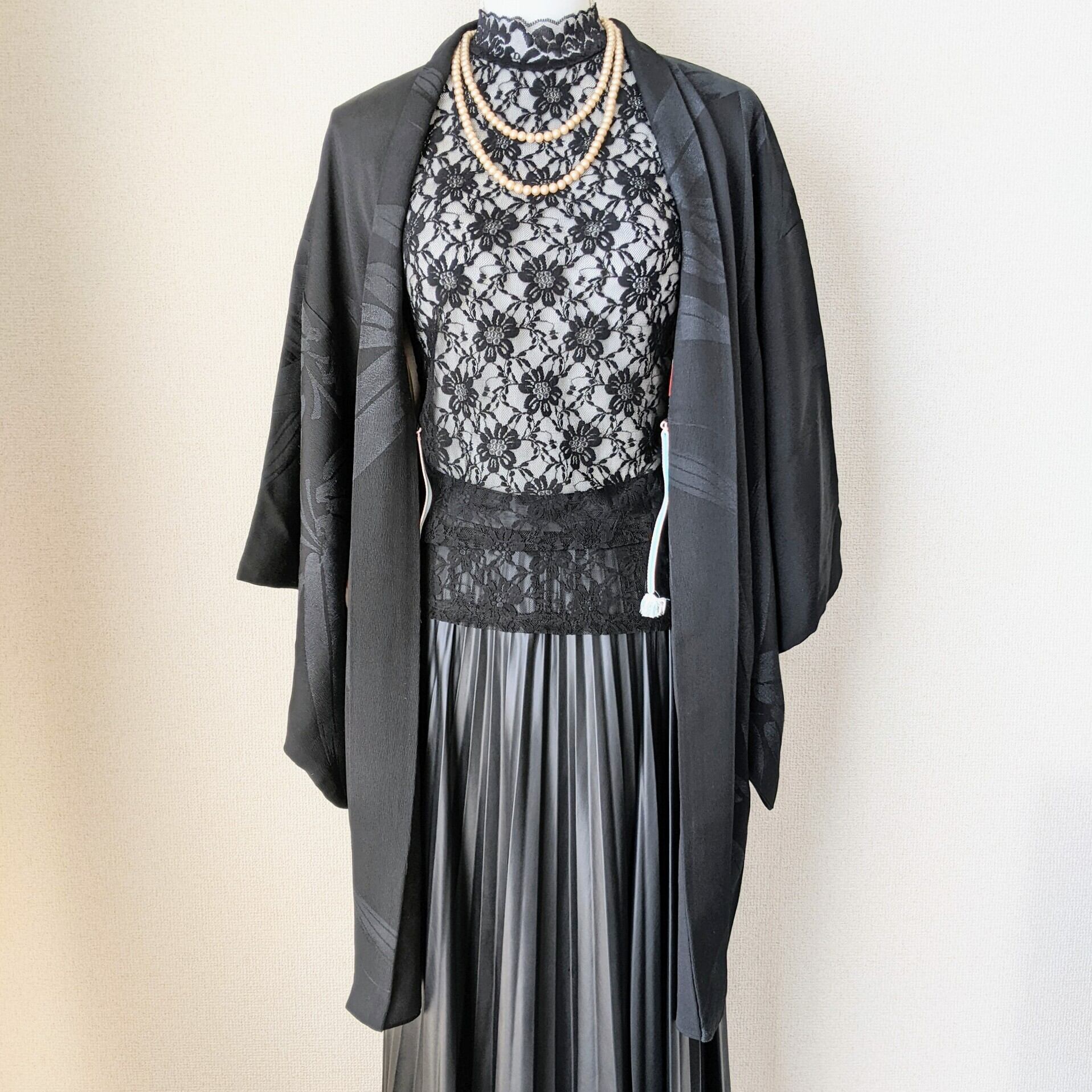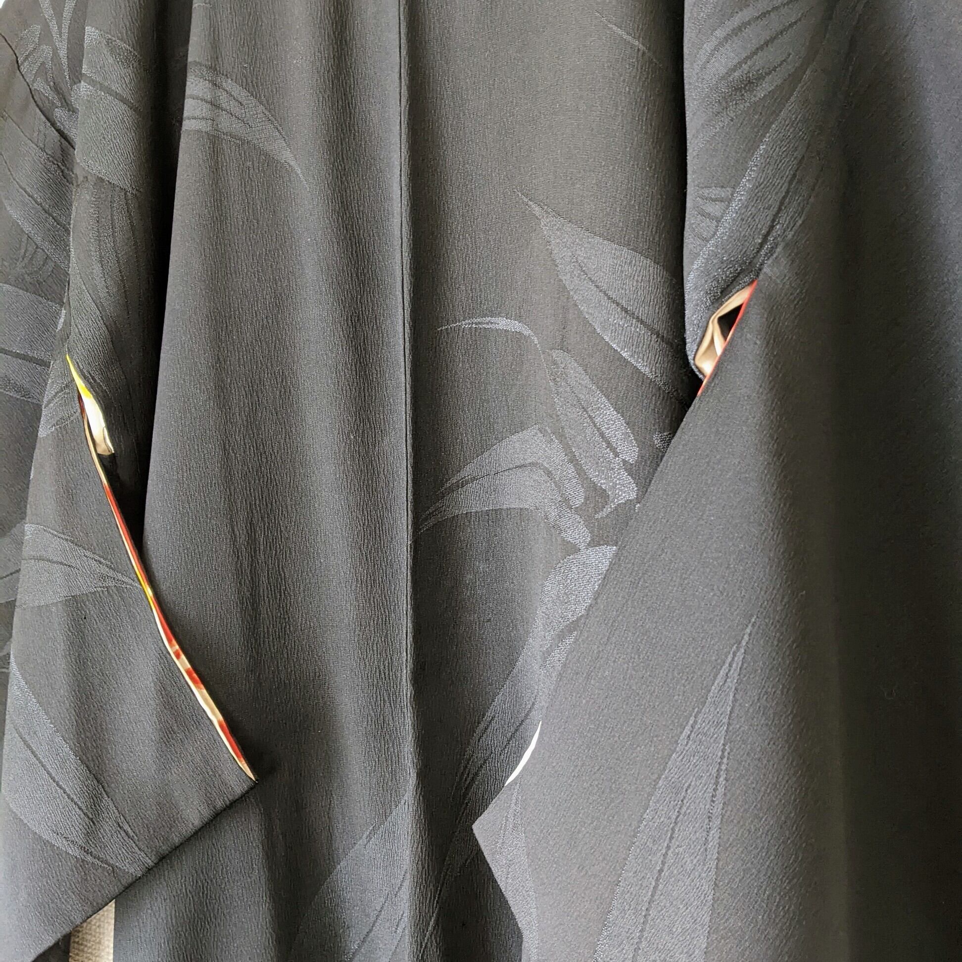 【Vintage】HAORI 長羽織 正絹 黒 笹の葉の地紋 一つ紋 裏地が赤松 シルク 大正浪漫 和洋折衷