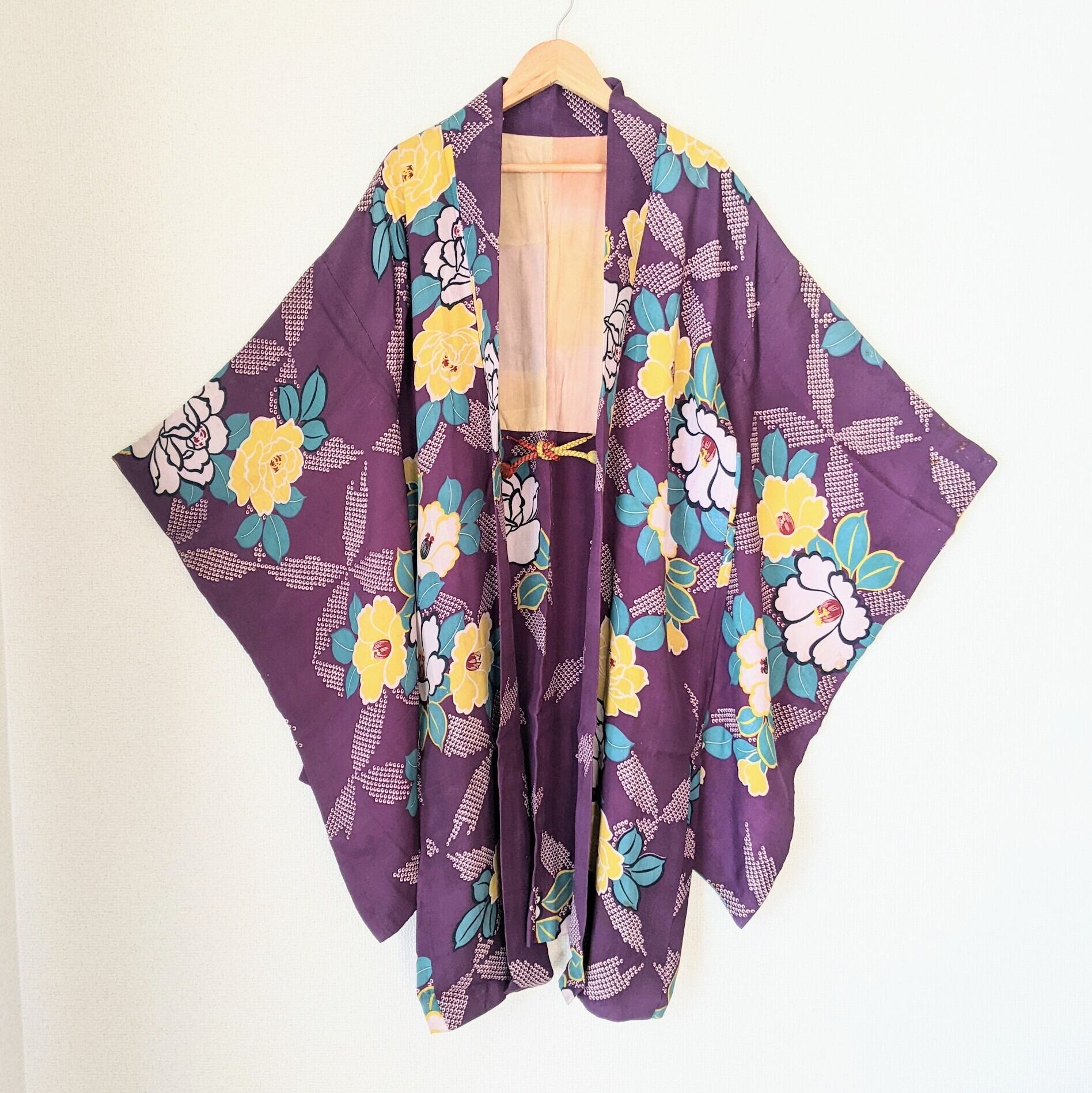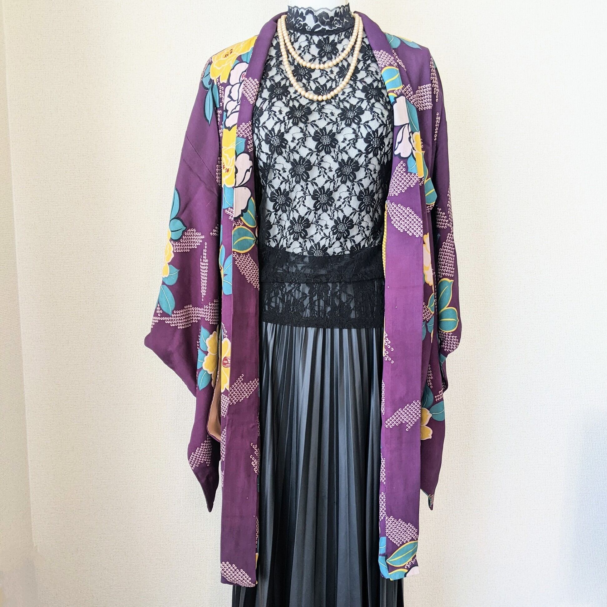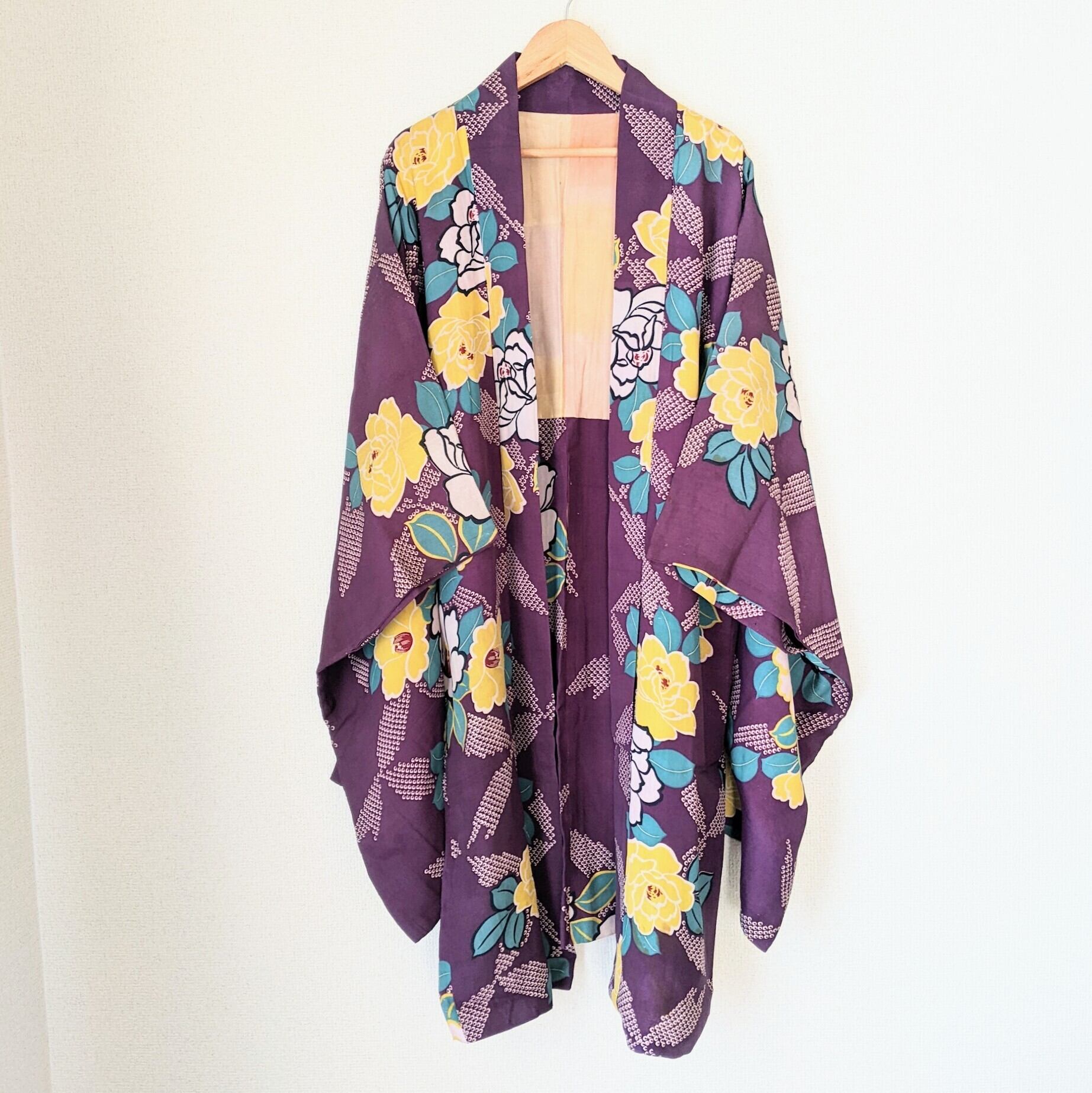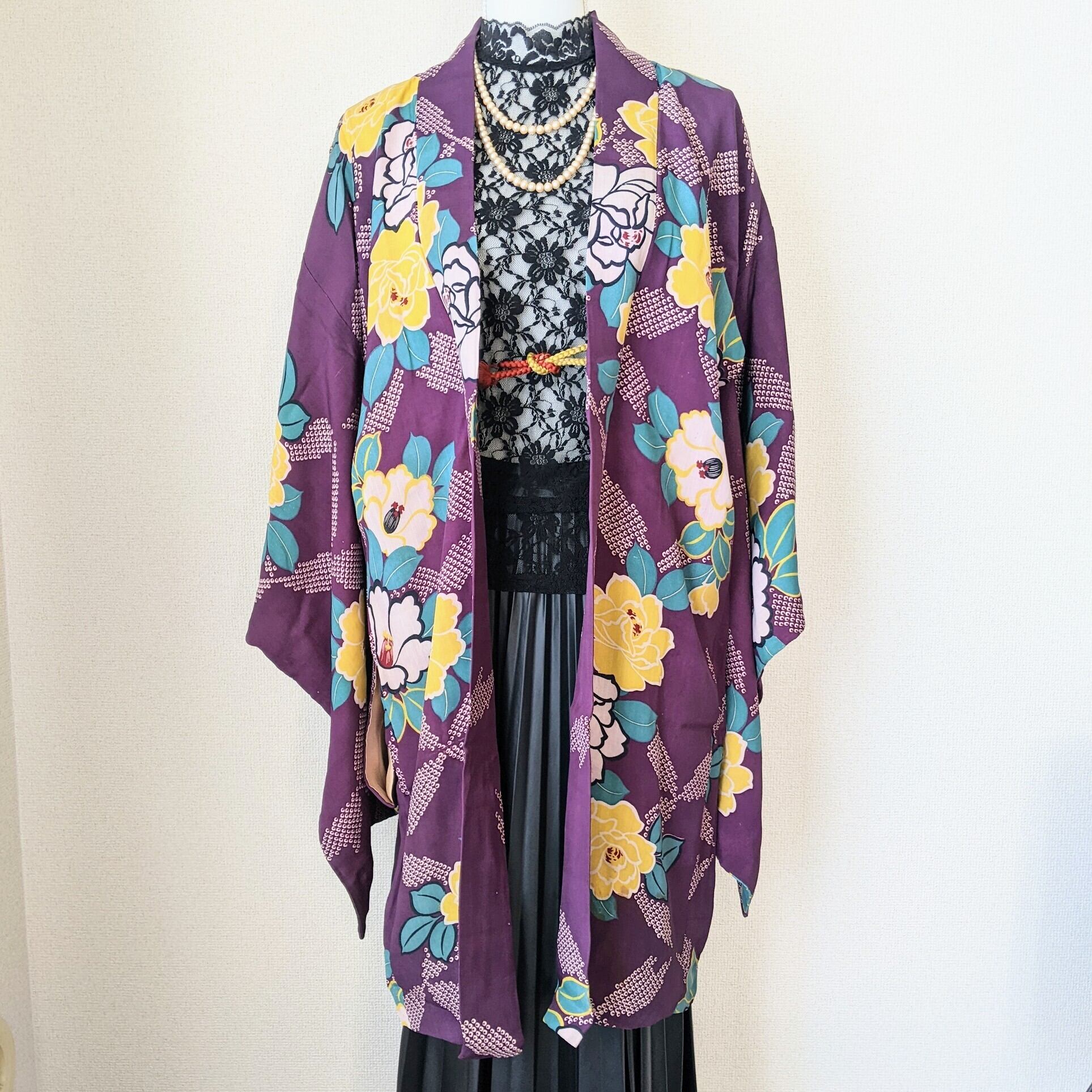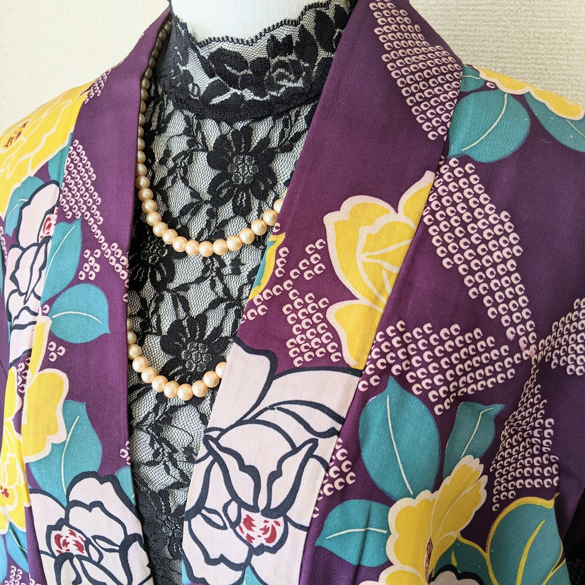 【Vintage】HAORI 長羽織 正絹 江戸紫 黄色と白の椿柄 シルク 大正浪漫 和洋折衷