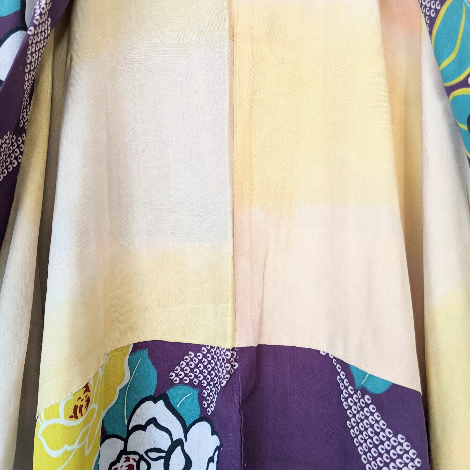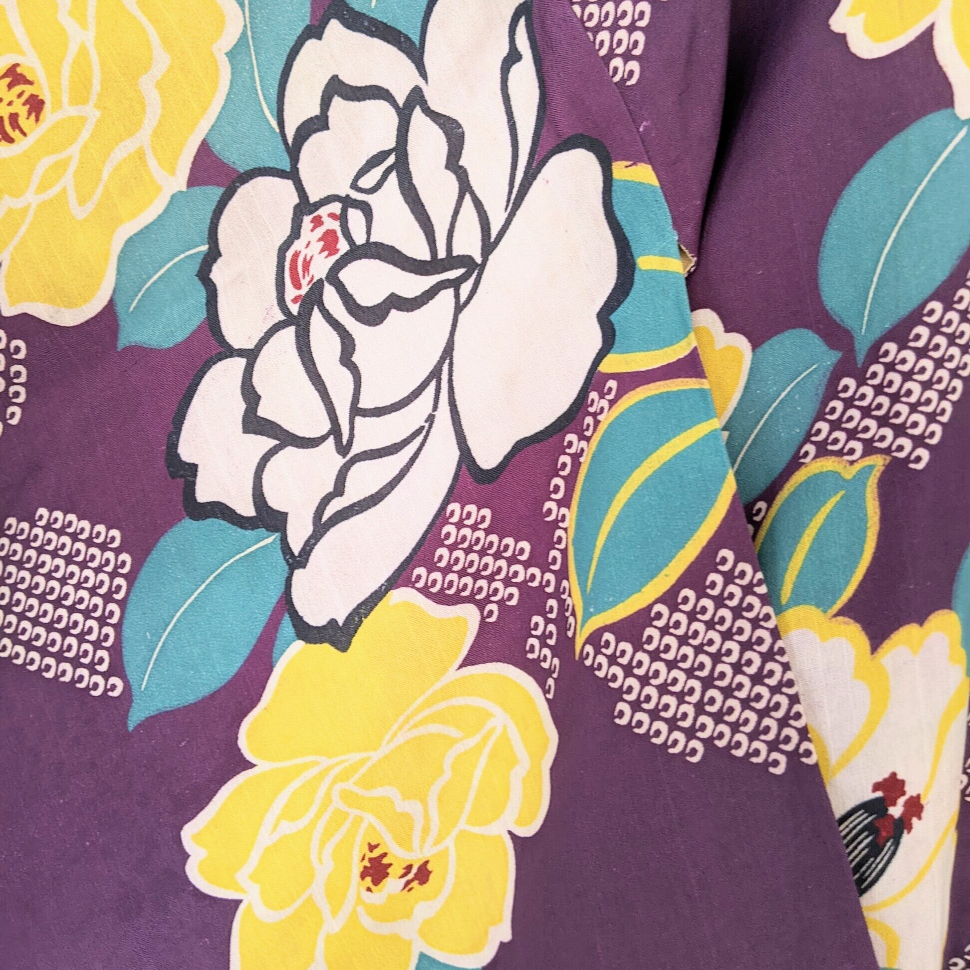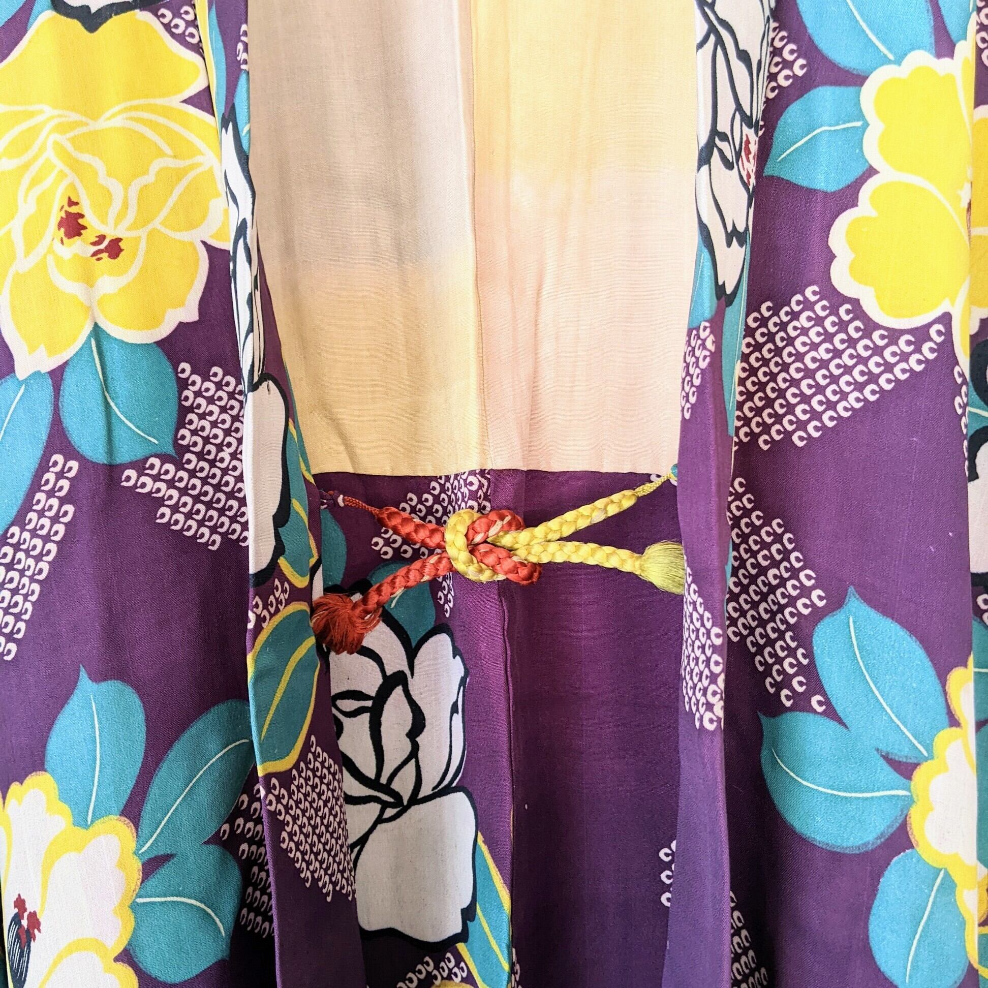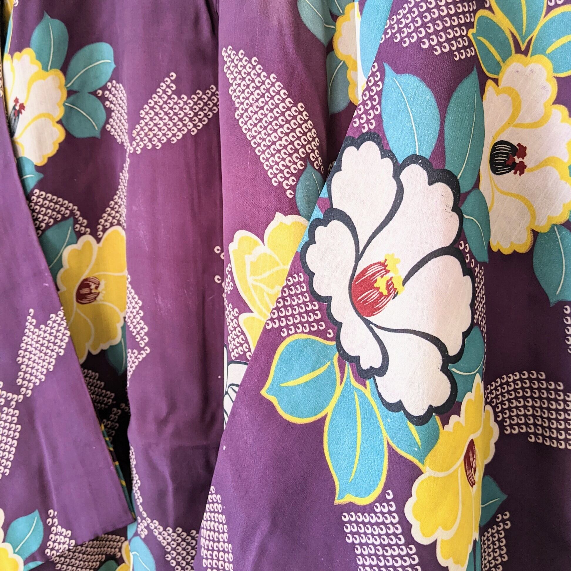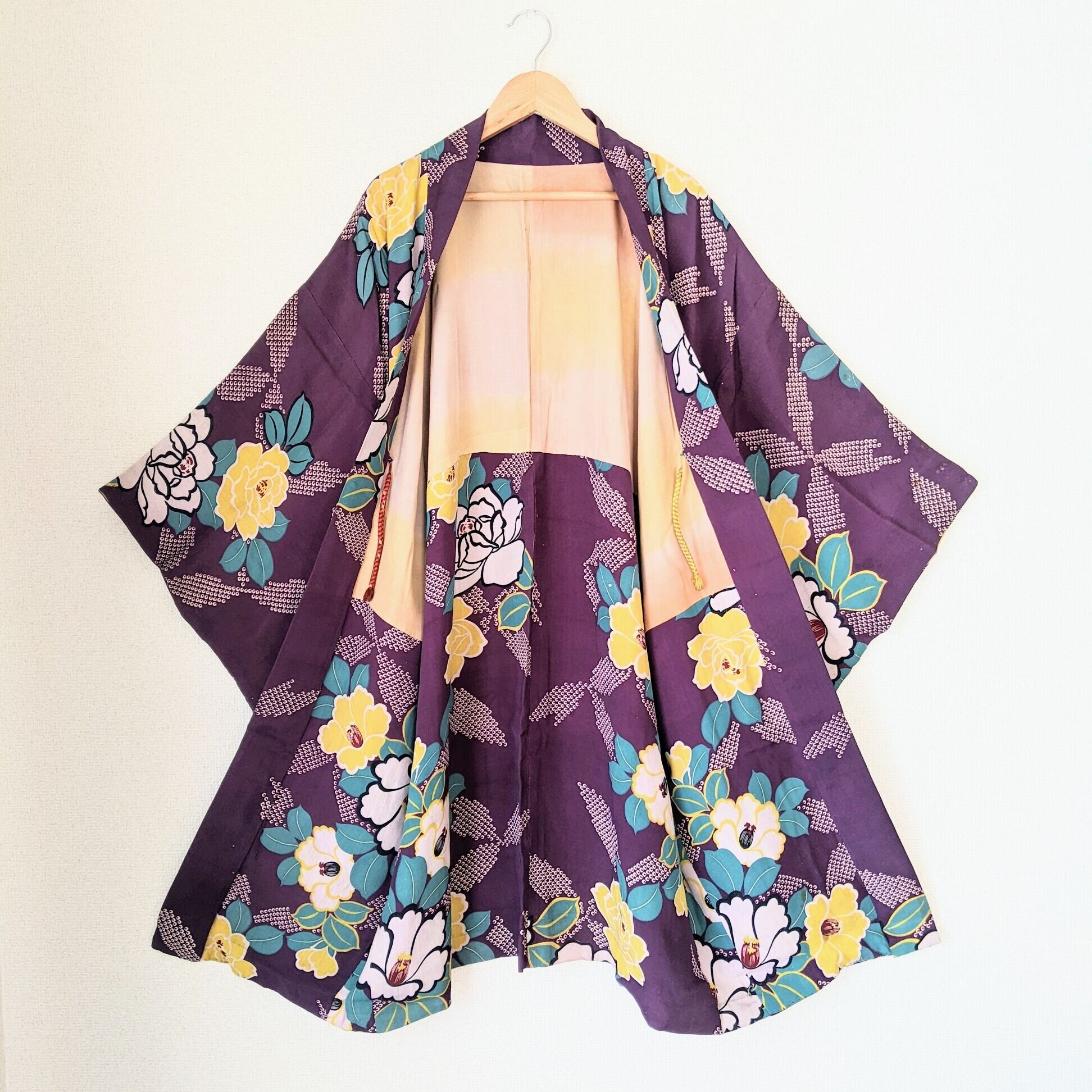 【Vintage】HAORI 長羽織 正絹 江戸紫 黄色と白の椿柄 シルク 大正浪漫 和洋折衷